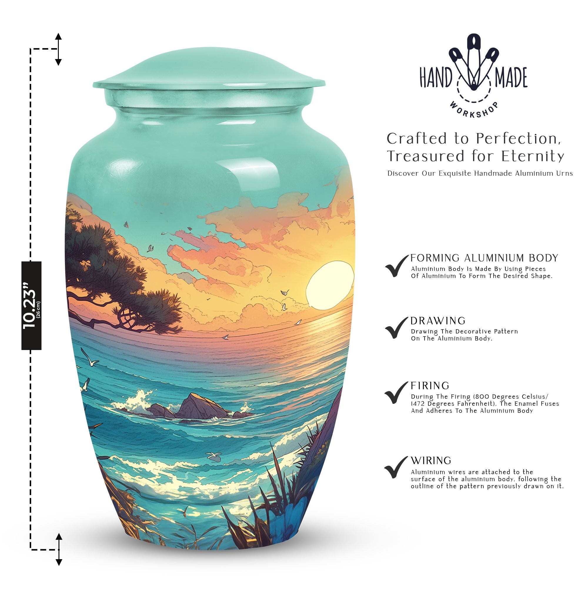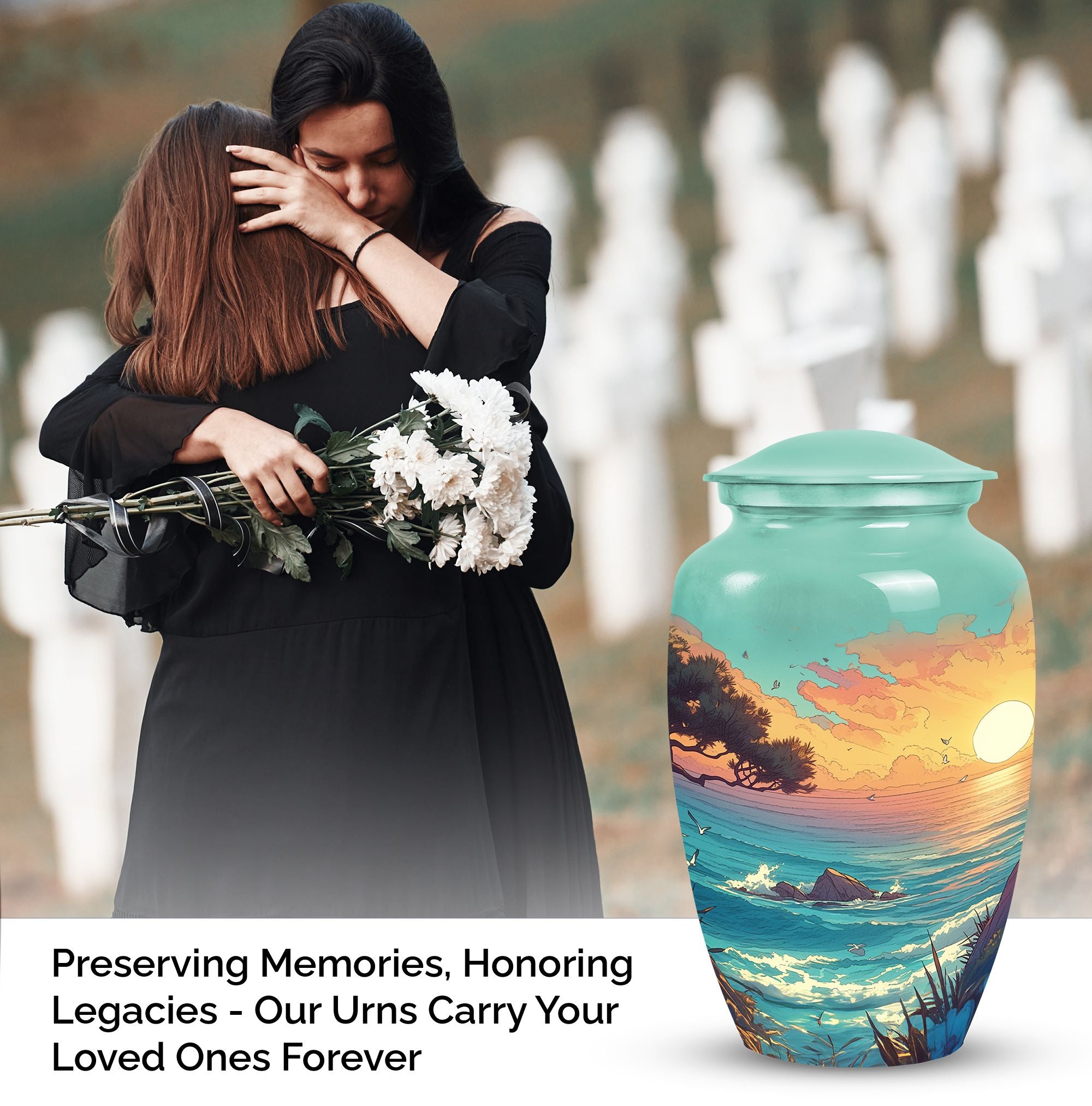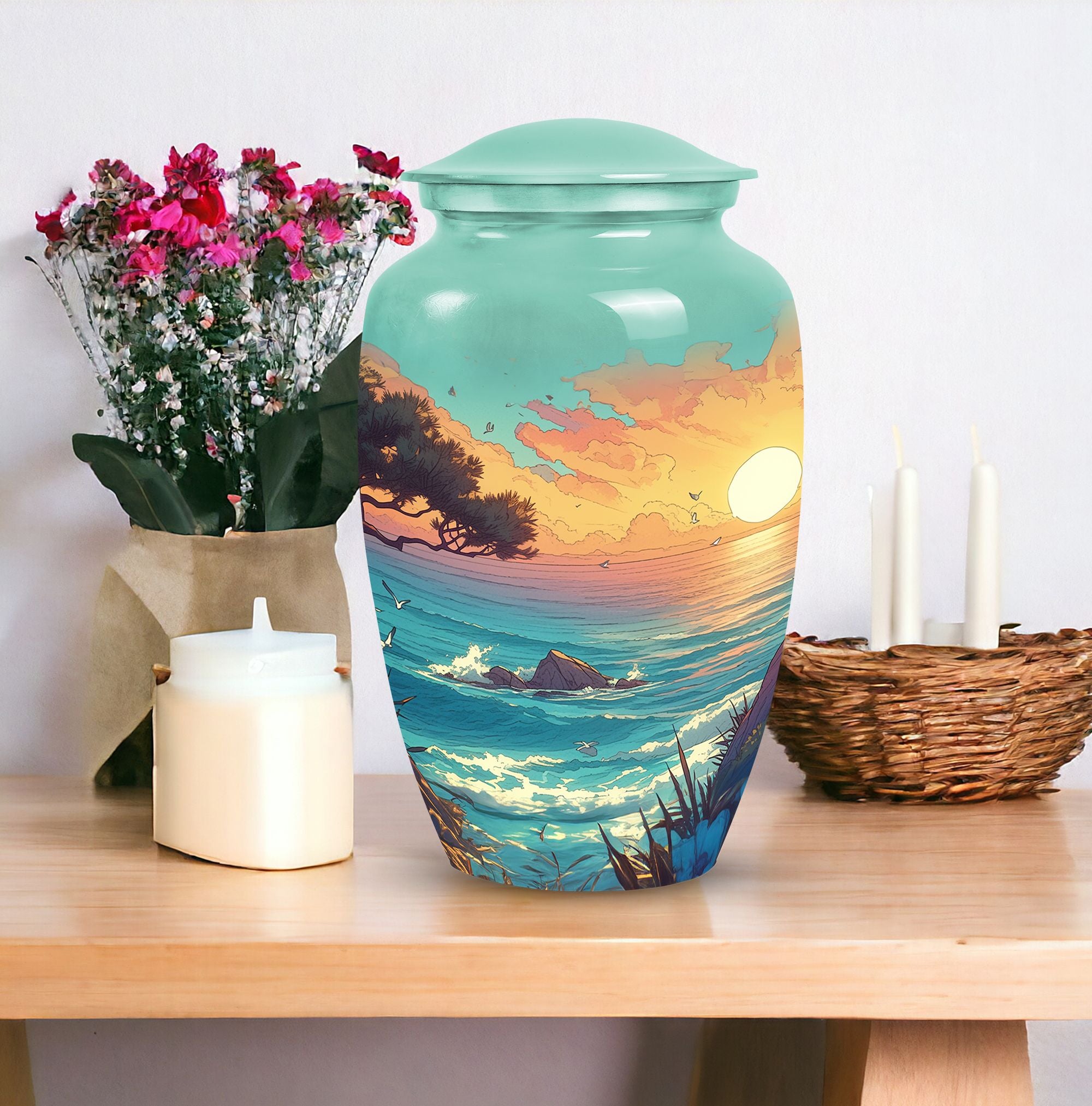 Experience tranquility and honor the memory of a loved one with our Sunset Urn. With a delightful navy hue that captures the serenity of a serene twilight, this Blue Urn sets an ambience of peace in any memorial ceremony. Carefully crafted, it's not just a funeral urn but a precious memento that seals cherished memories. Cremation urns don't need to be depressing and our product is proof: it's a reminder of an eternal sunset, depicting the transient yet beautiful journey of life. Our urns serve as an elegant decoration piece as well while delivering a subtle yet impactful message of remembrance. The product falls under a special breed of burial urns, uniquely blending functionality and aesthetics. With its appealing design, it will seamlessly capture the spirit of the departed, turning a somber occasion into a celebration of life.