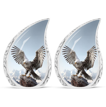Adorn your beloved's final resting place with one of our Traditional Eagle Urns for Ashes. Exclusively for cherished adults or seniors, this heirloom quality product falls under the Memorial Ceremony Supplies category. Standing 10 inches tall, this cremation urn weighs a sturdy 3.3 pounds, signifying its robust construction. Composed of high-grade Aluminium, this Large Urn comes with a touching feature of personalization; you can choose to honor your loved ones by engraving their names. The capacity of the urn is around 200 cubic inches, ensuring enough space for most human remains. It comes neatly packaged with a velvet pouch for containment and safekeeping of ashes.