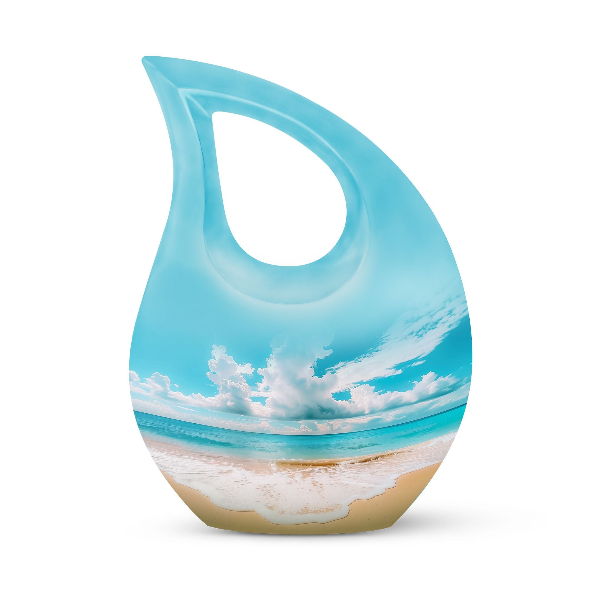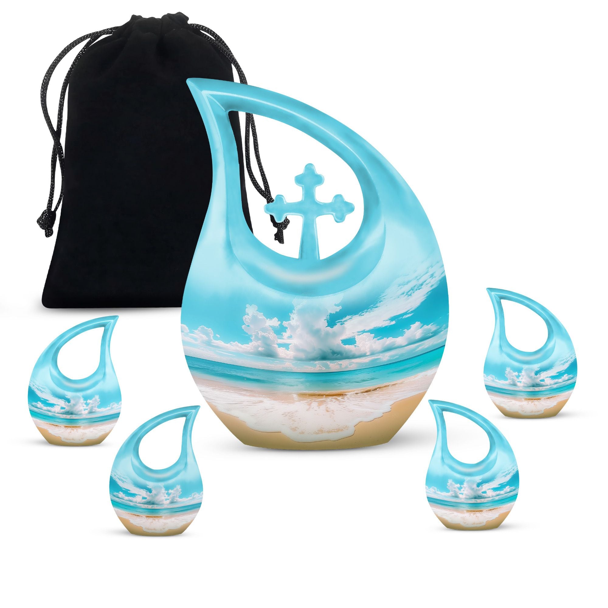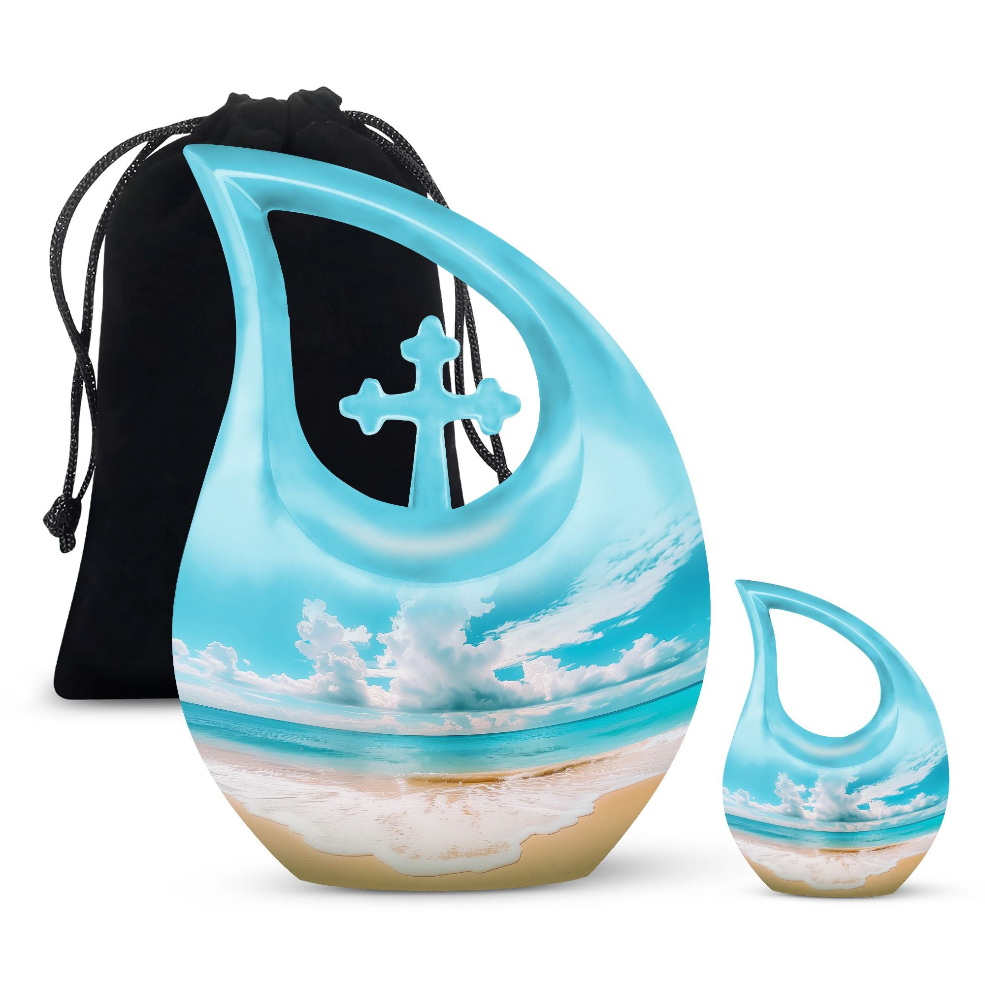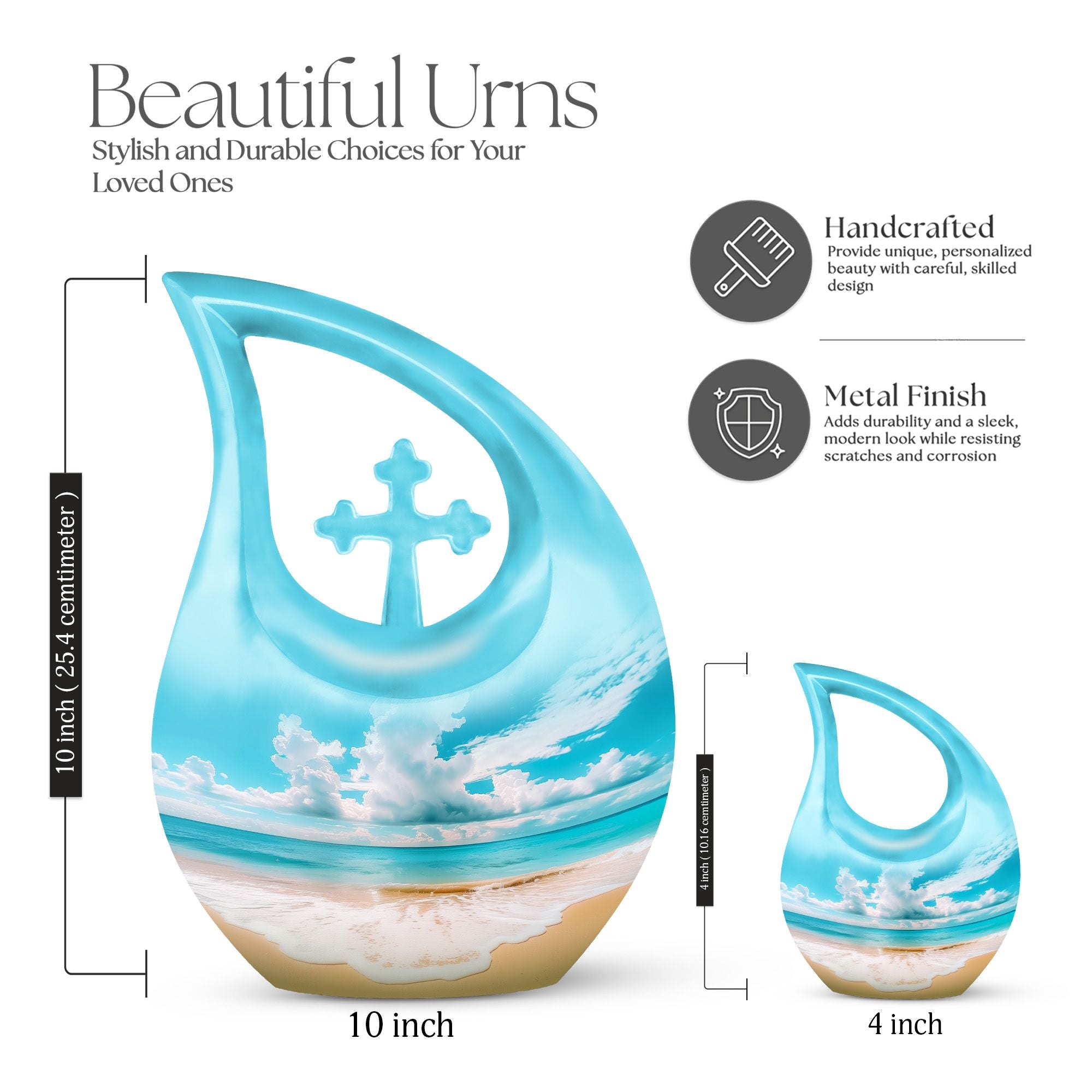 Immerse in the serenity of everlasting memories with our beach-inspired Memorial Urns. These 10-inch large aluminium urns play the perfect hosts, with a capacity of 200 cubic inches to lovingly contain the ashes of your dear ones. The urns don a Cross Drop theme, giving them an elegant and soothing aura. With a sturdy weight of 3.3 pounds and dimensions of 10 inches in height, the urns guarantee durability and trustworthy preservation. Personalize your tribute further by engraving names on the urns, making your remembrance truly unique. Safely nestled in a velvet pouch, the ashes stand a testament of time. Whether you are searching for the best cremation urn, companion urns for 2 adults or are exploring burial urns for sale, our modern urns ensure your quest ends right here. Celebrate life even in absence with our beach urn and transform your memories into a timeless keepsake.