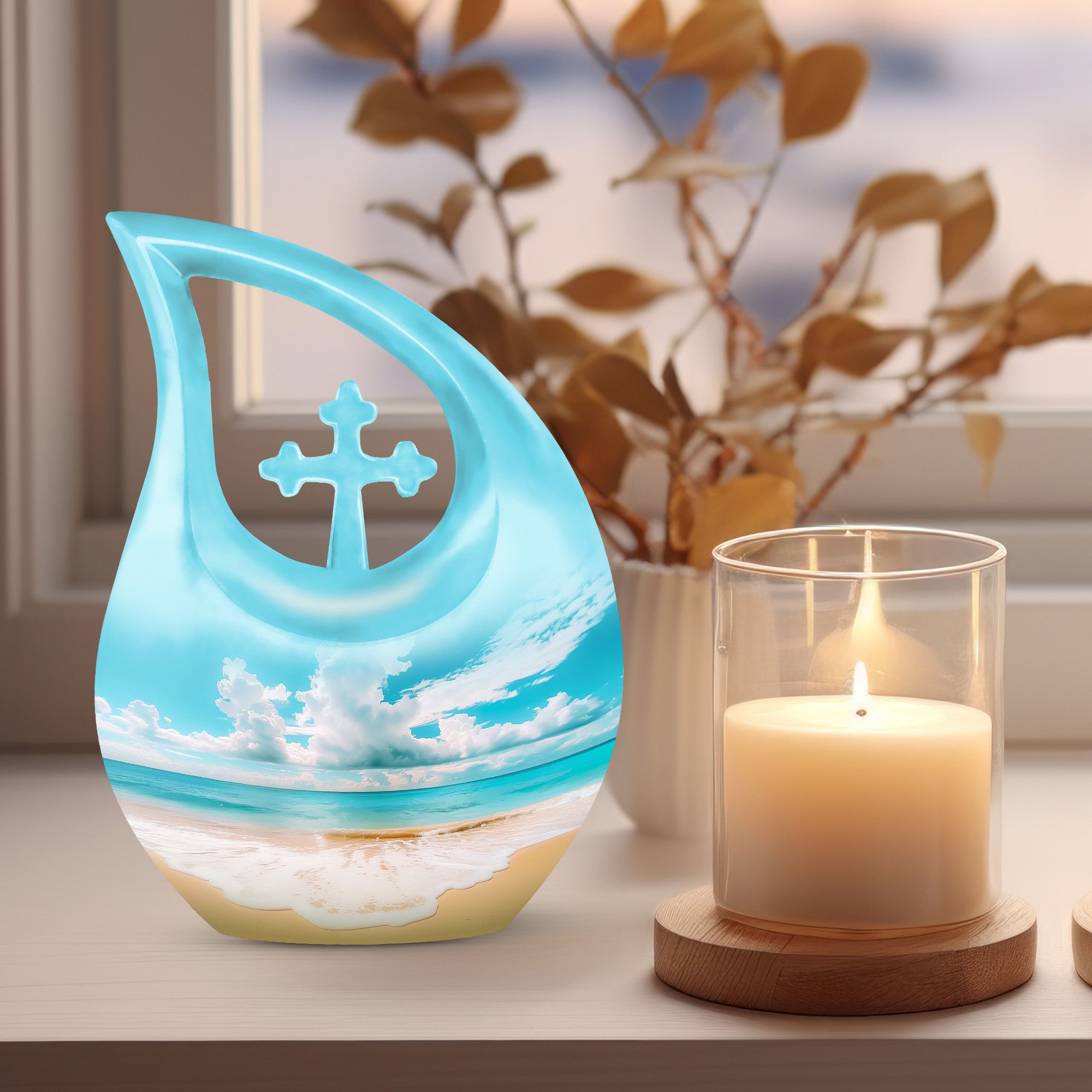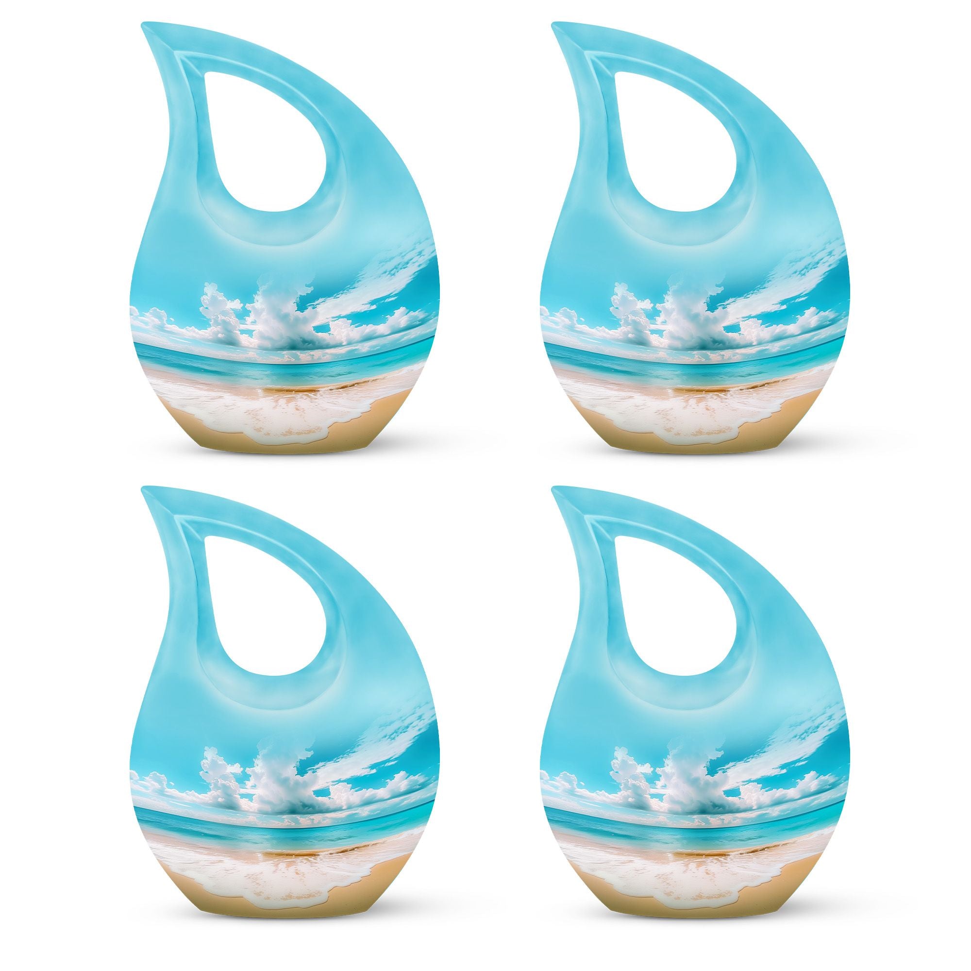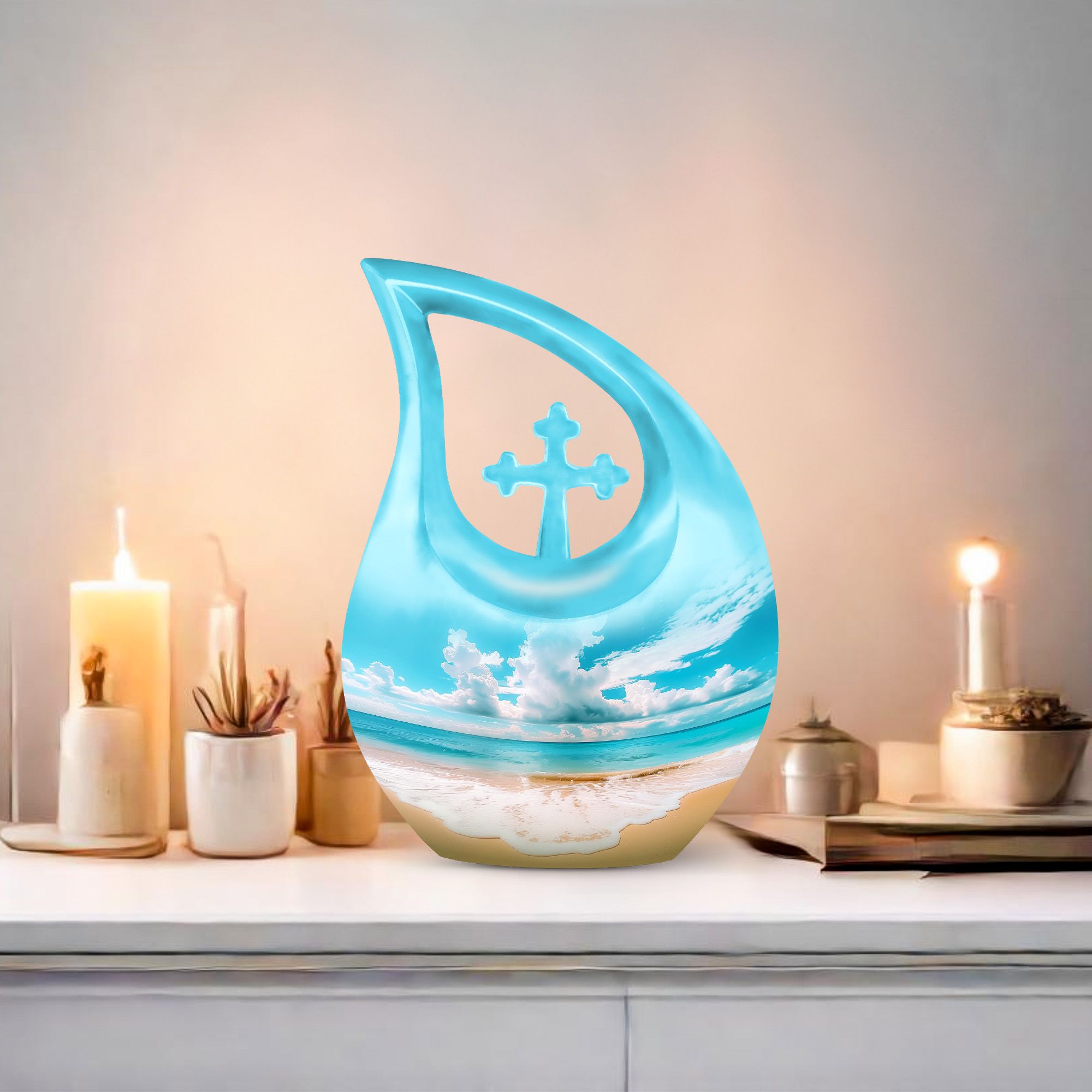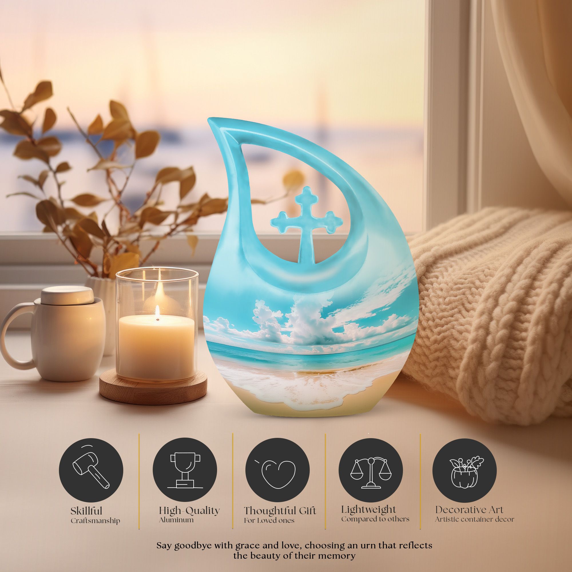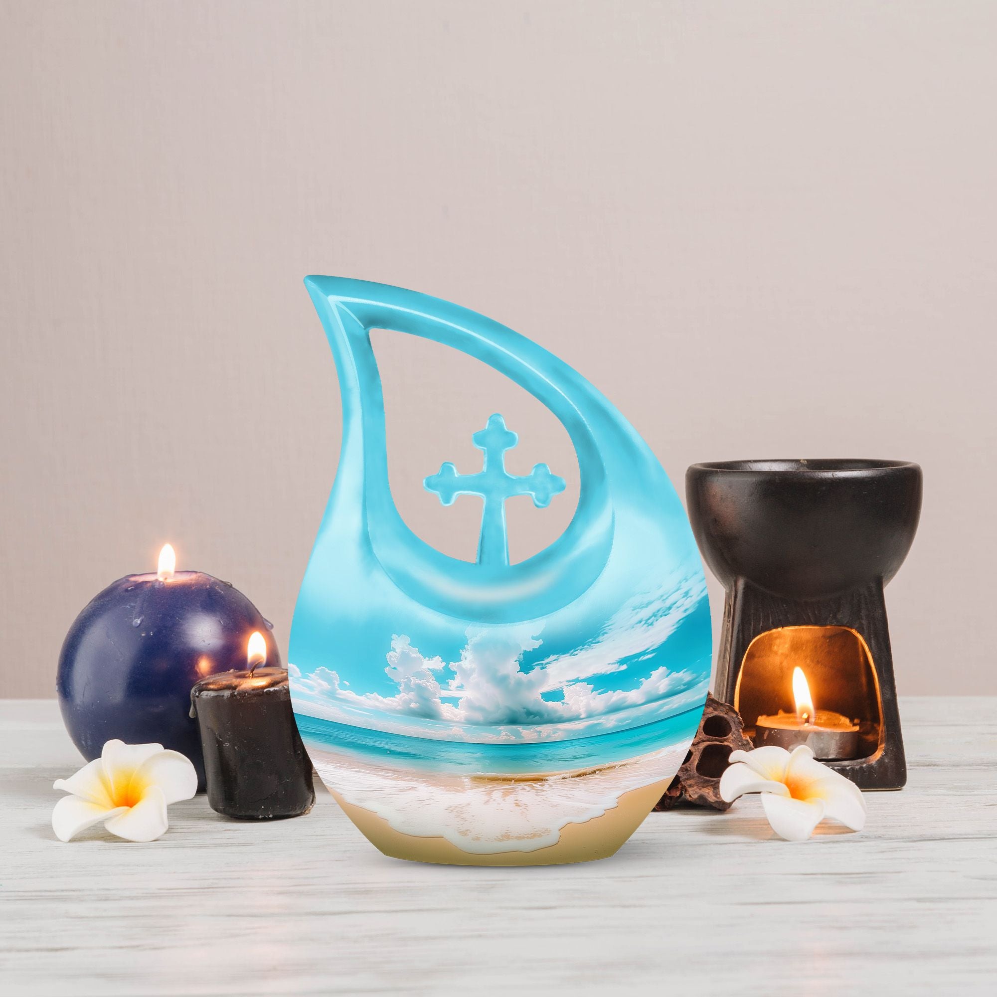 Immerse in the serenity of everlasting memories with our beach-inspired Memorial Urns. These 10-inch large aluminium urns play the perfect hosts, with a capacity of 200 cubic inches to lovingly contain the ashes of your dear ones. The urns don a Cross Drop theme, giving them an elegant and soothing aura. With a sturdy weight of 3.3 pounds and dimensions of 10 inches in height, the urns guarantee durability and trustworthy preservation. Personalize your tribute further by engraving names on the urns, making your remembrance truly unique. Safely nestled in a velvet pouch, the ashes stand a testament of time. Whether you are searching for the best cremation urn, companion urns for 2 adults or are exploring burial urns for sale, our modern urns ensure your quest ends right here. Celebrate life even in absence with our beach urn and transform your memories into a timeless keepsake.