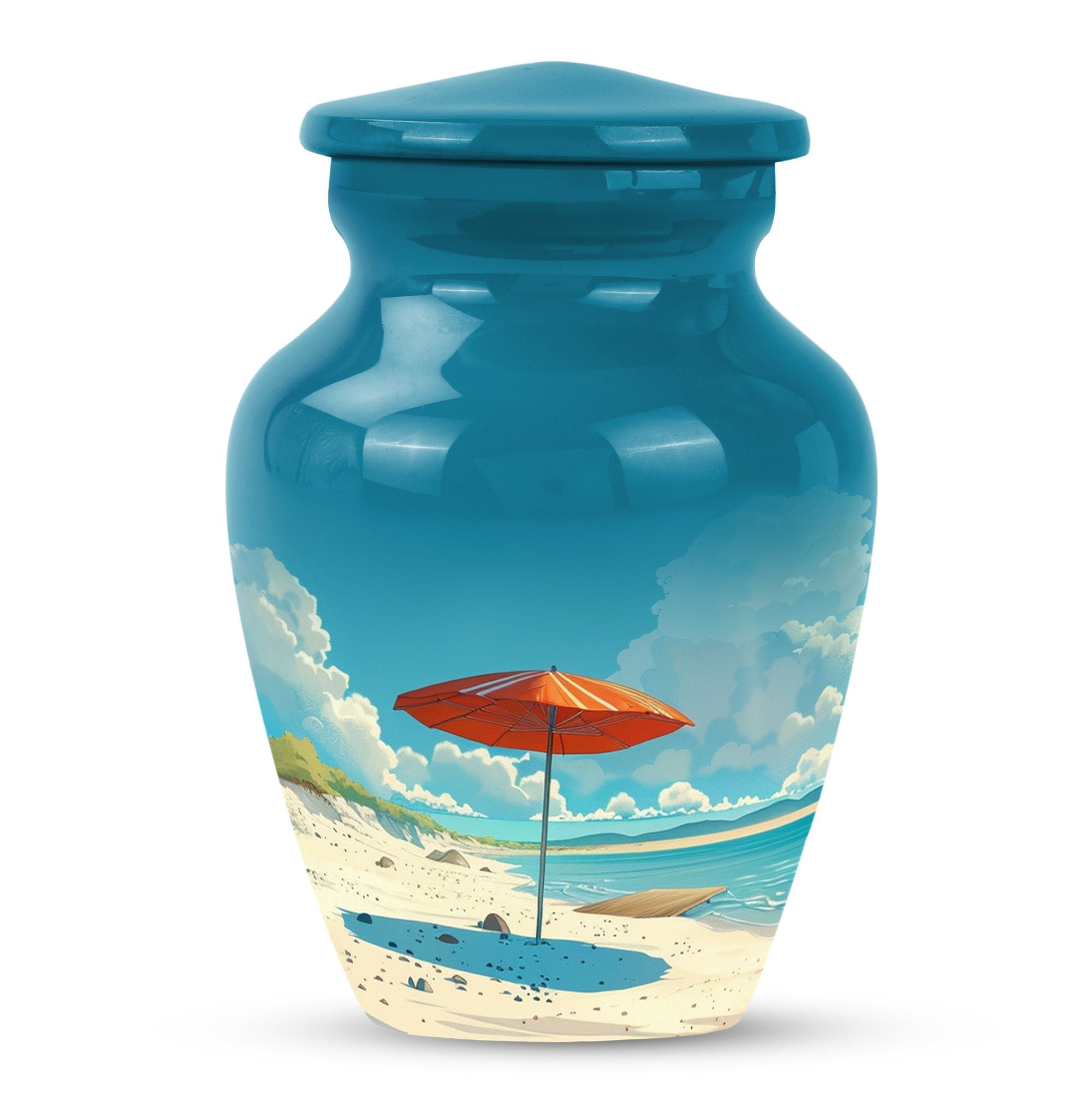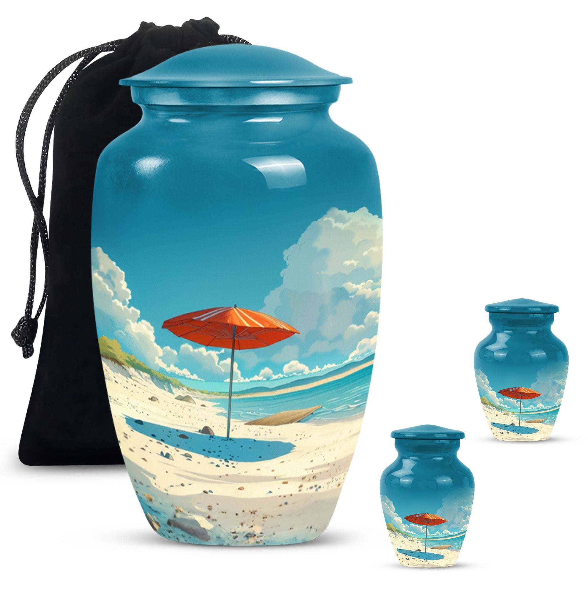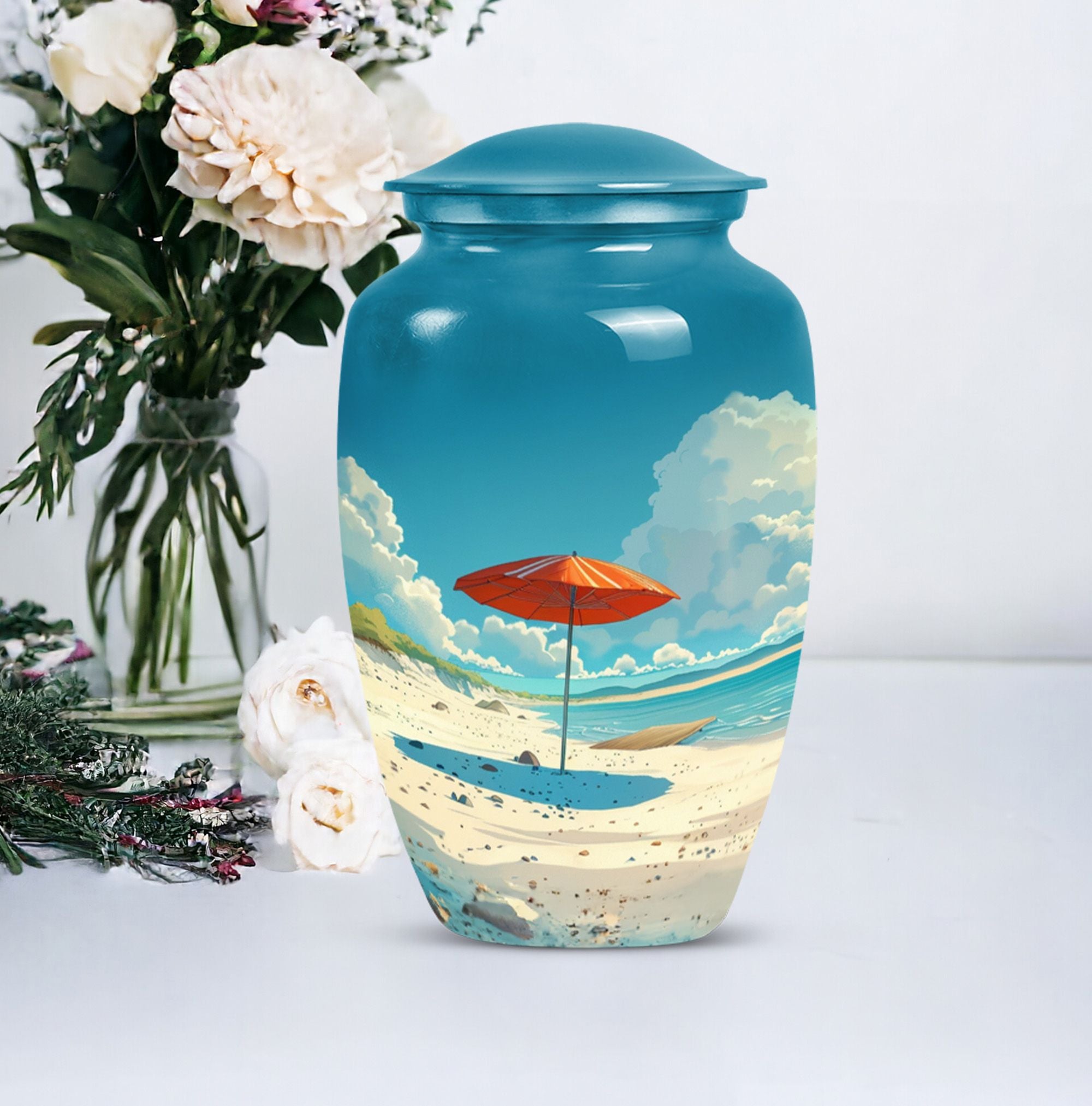 Cherish your loved one's memory with our compelling Beach Urn. This timeless and classic large urn stands 10 inches tall, crafted of resilient aluminium material. With a capacity of 200 cubic inches, it's ideal for containing human ashes. Weighing a modest 3.3 pounds, it can be conveniently transported for memorial ceremonies or burials. A unique feature is the inclusion of a velvet pouch, lending an extra layer of respect and privacy to the ashes' containment. For a personal touch, the urn allows for customization; you can honor your departed by engraving their names on it. It's graced with a delicate floral theme, setting a serene and harmonious tone fitting for a final resting place. This cremation urn serves as a poignant tribute, making it an ideal choice for funeral processional needs. This urn is exceptional in the realm of memorial funeral urns, seamlessly merging tradition with significance.