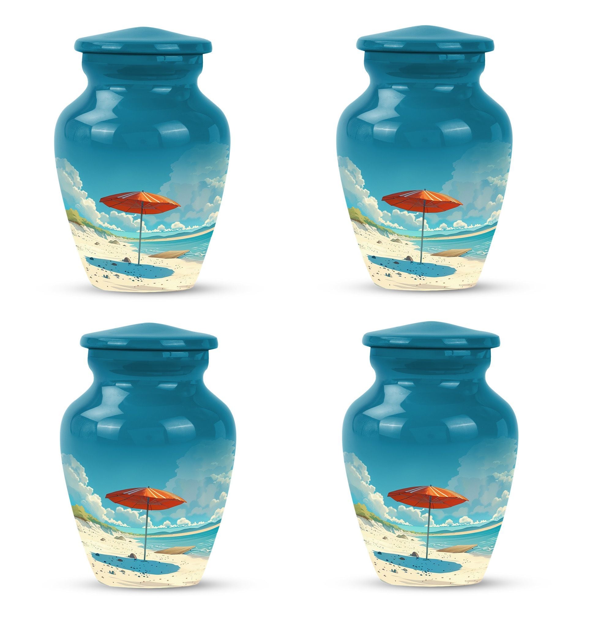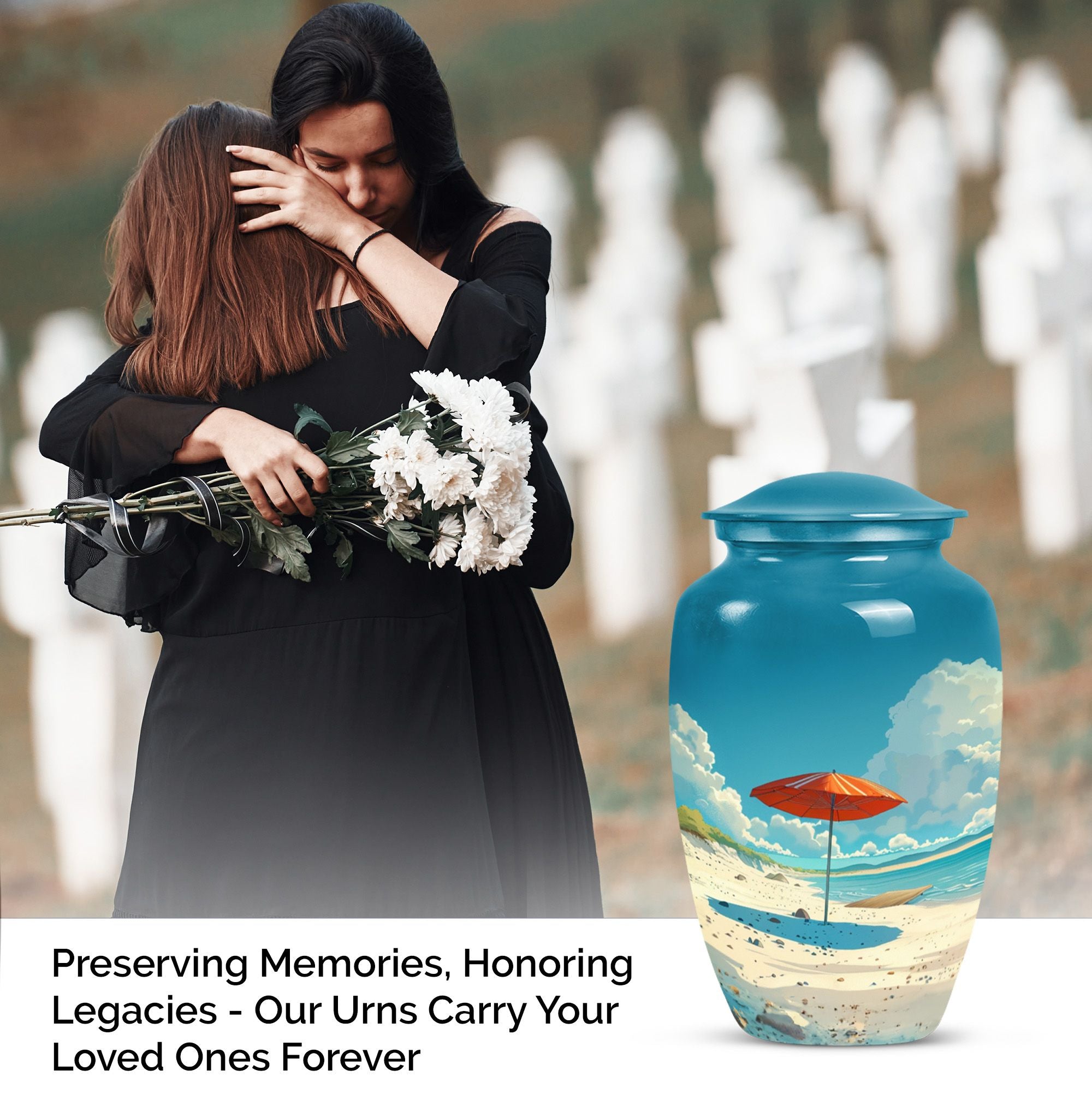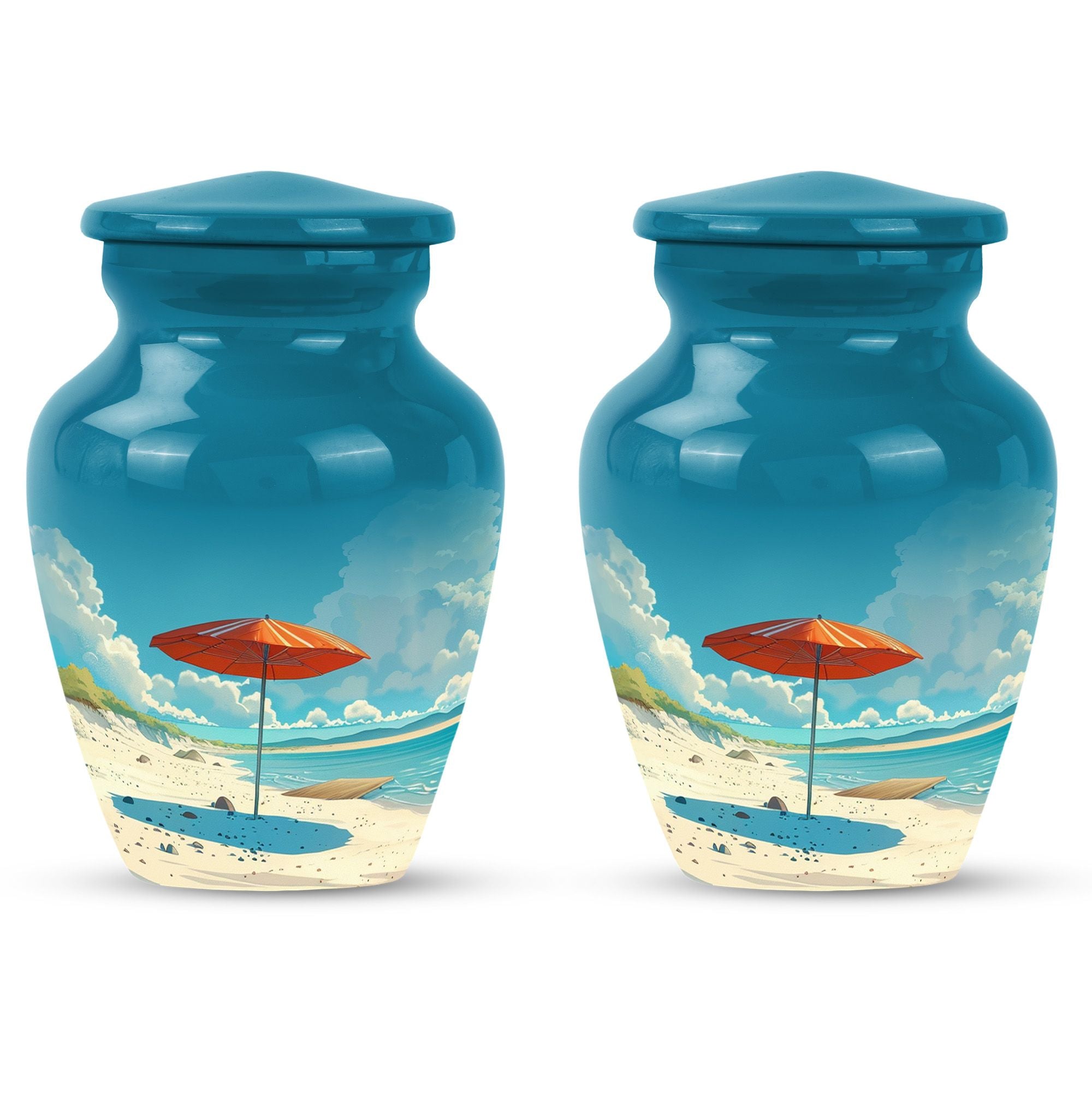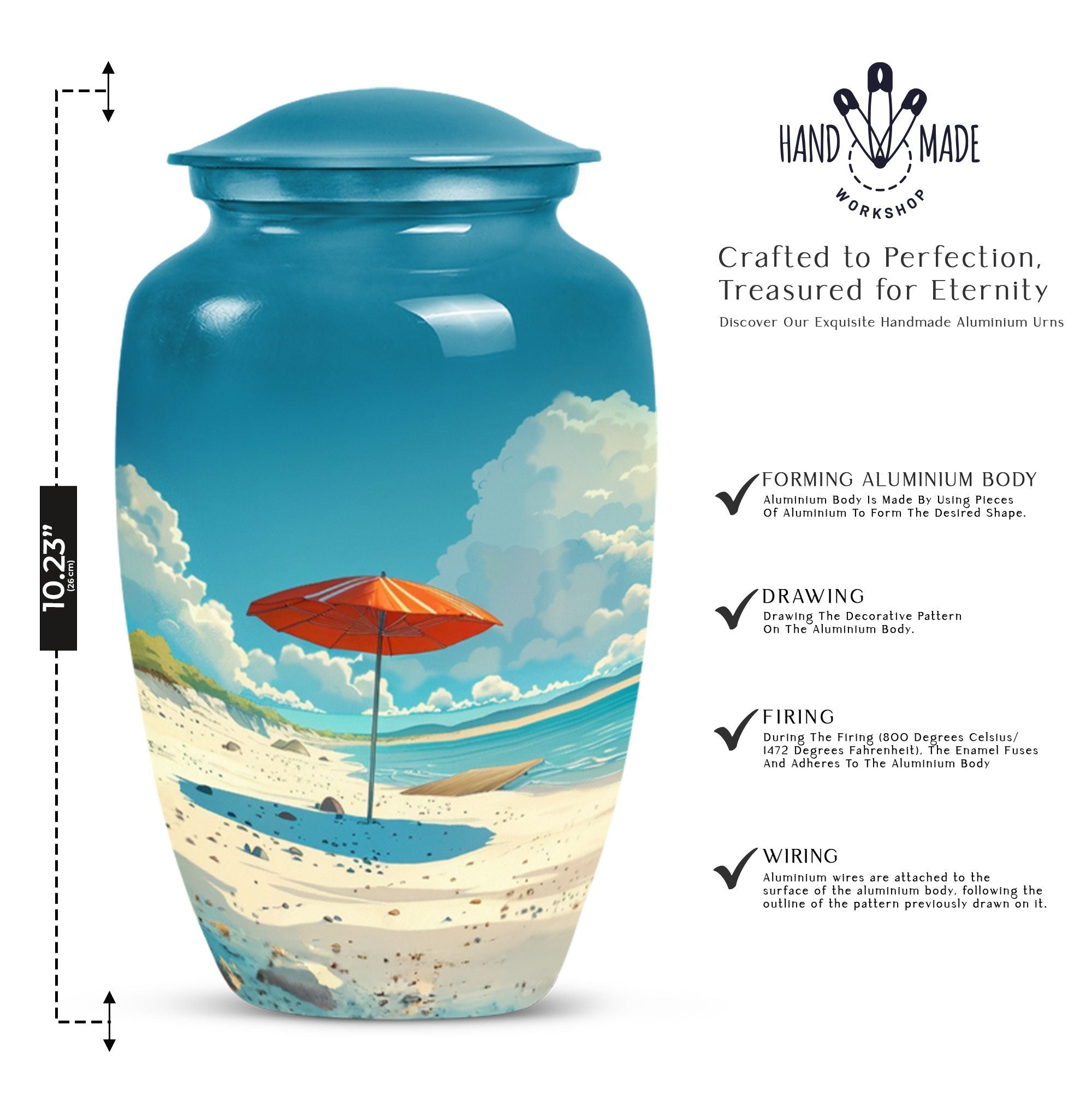 Cherish your loved one's memory with our compelling Beach Urn. This timeless and classic large urn stands 10 inches tall, crafted of resilient aluminium material. With a capacity of 200 cubic inches, it's ideal for containing human ashes. Weighing a modest 3.3 pounds, it can be conveniently transported for memorial ceremonies or burials. A unique feature is the inclusion of a velvet pouch, lending an extra layer of respect and privacy to the ashes' containment. For a personal touch, the urn allows for customization; you can honor your departed by engraving their names on it. It's graced with a delicate floral theme, setting a serene and harmonious tone fitting for a final resting place. This cremation urn serves as a poignant tribute, making it an ideal choice for funeral processional needs. This urn is exceptional in the realm of memorial funeral urns, seamlessly merging tradition with significance.