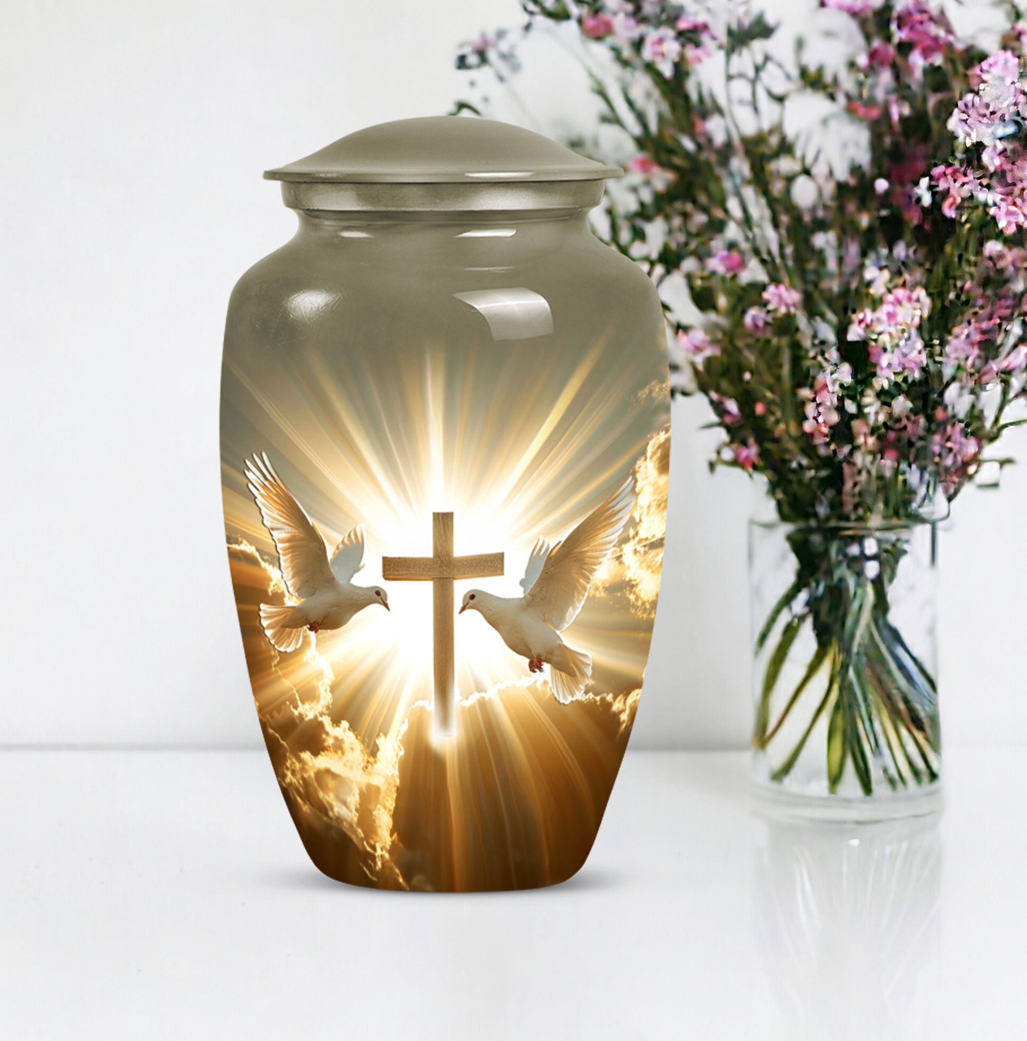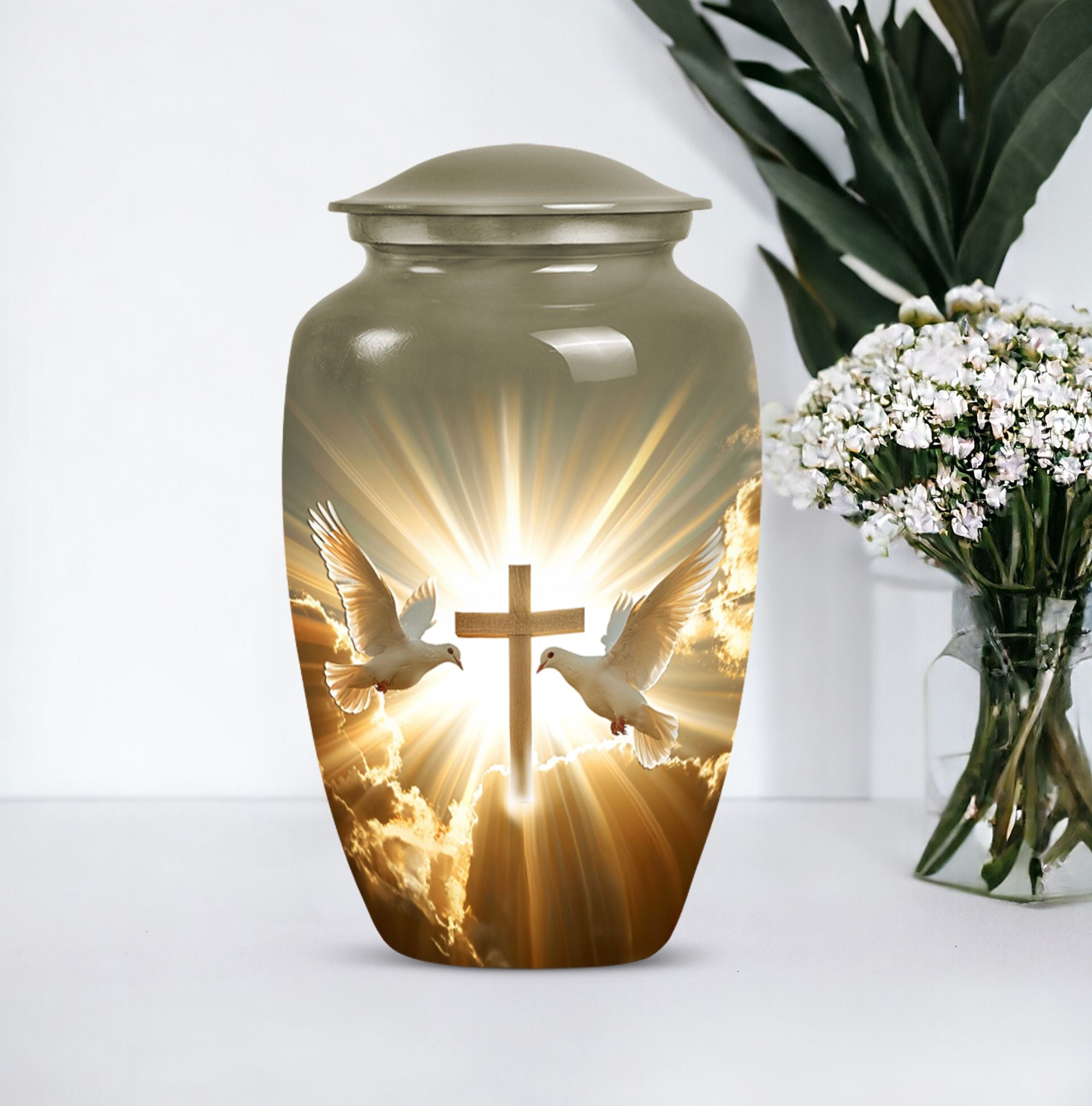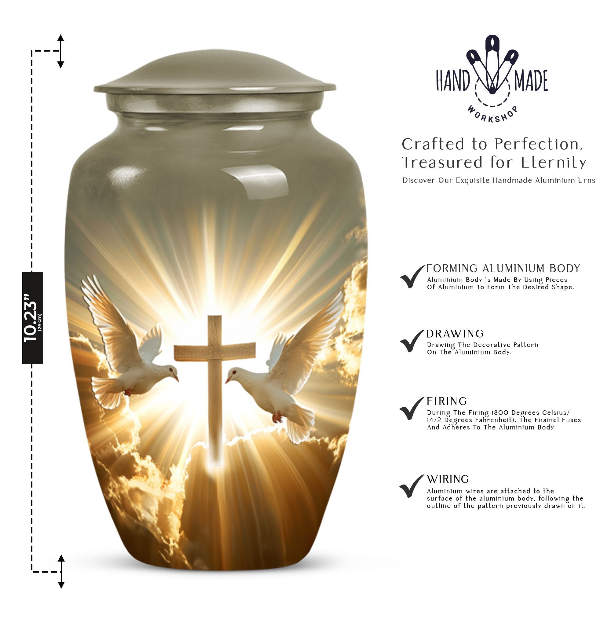 Adorned elegantly with flowering etchings on robust Aluminum, this 10-inch large urn captures the sense of serenity and beauty ideal for a cherished keepsake. Weighing 3.3 pounds, this sizable dove urn is designed with reverence to safely preserve a capacity of 200 cubic inches of beloved one's ashes. This memorial urn, often searched as 'memorial human urns for ashes', 'memorial funeral urns for ashes', and 'ashes of love', offers not only a resting place but a celebration of a person's life, treasuring them in an eternal memory. The package includes a velvet pouch, especially for containment of ashes, projecting care into every detail of this beloved object. Customizability is offered so you can personalize with engraved names, further adding an intimate touch to this cremation object. This is more than just an 'adult burial urn'; it's a tribute, a love messenger, solidifying memories into an object of reverence.