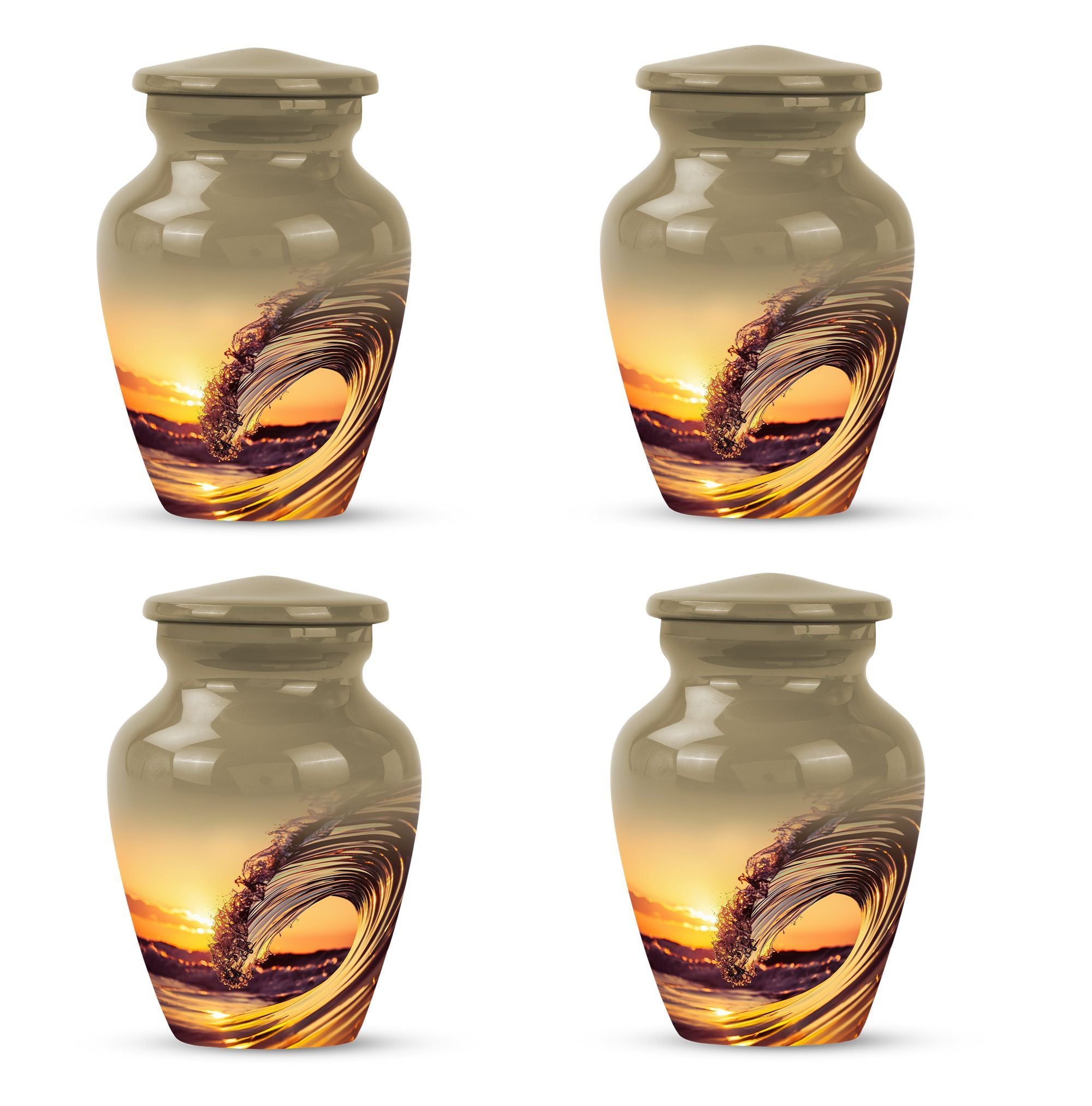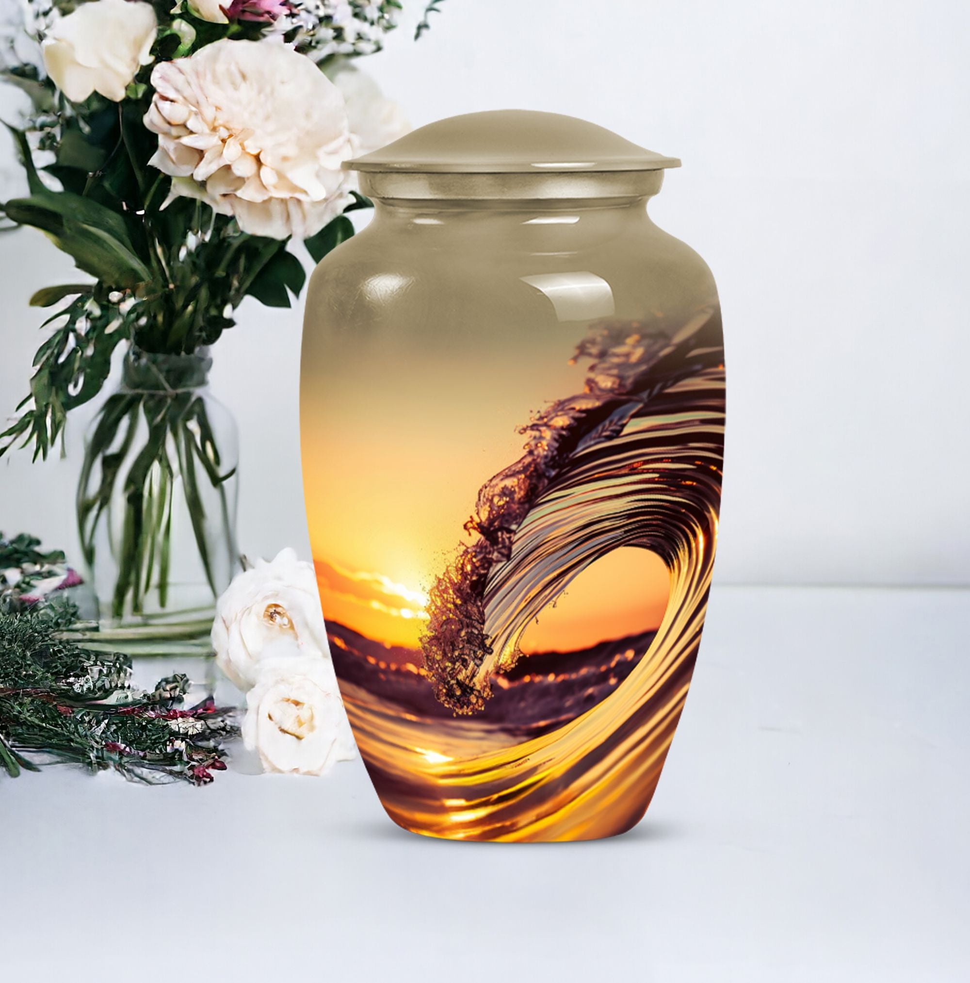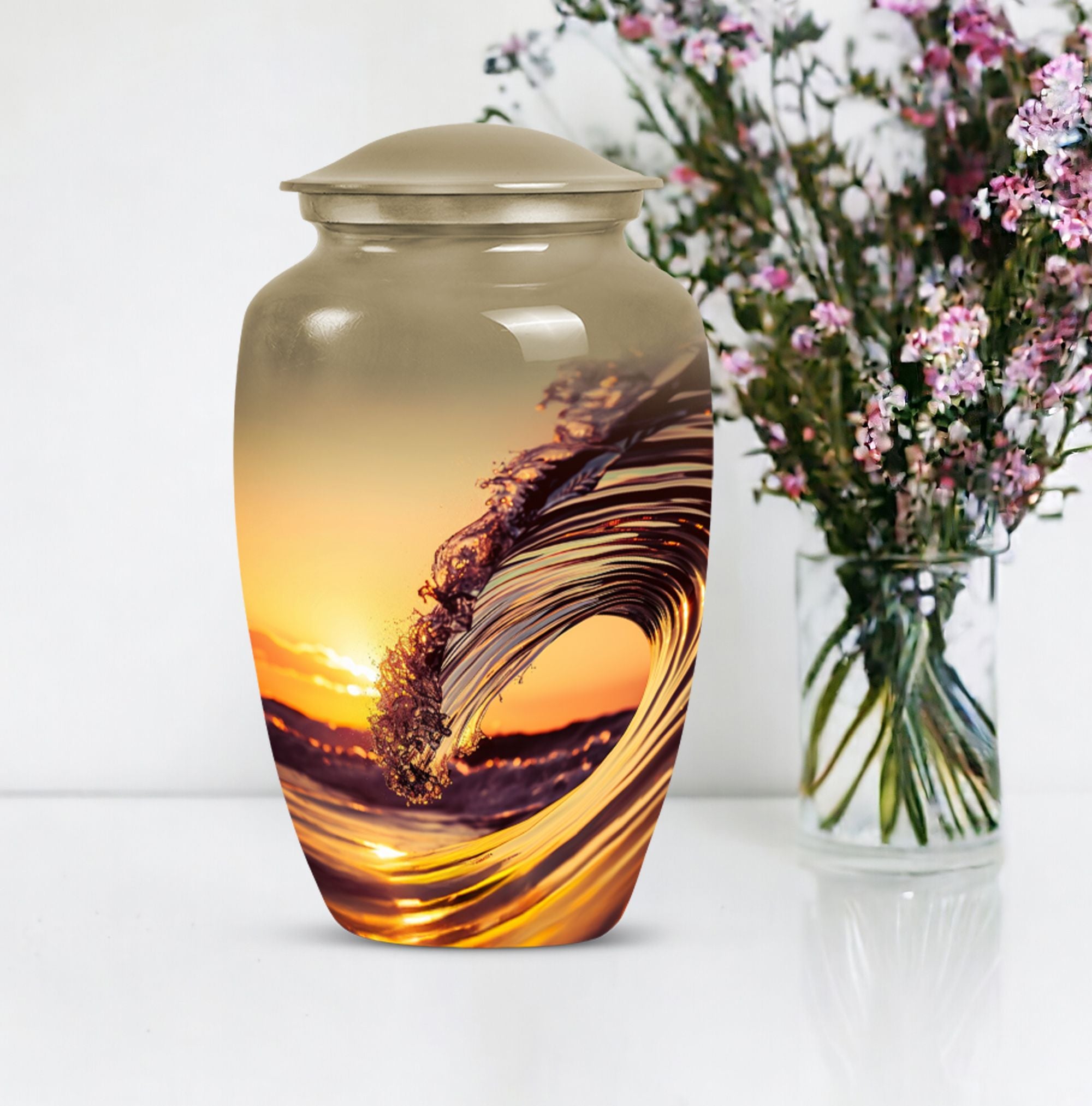 Immerse in serene memories as you embrace the final resting place of your beloved one with this 'Ocean Waves Urn'. This cremation urn is more than a vessel; it's a commemorative piece, meticulously crafted out of aluminium, showcasing an enduring appeal. It is accentuated with a Butterfly theme that adds a symbolic touch of transformation and new beginnings. This large urn, prudently sized at 10 inches in height, can accommodate up to 200 cubic inches, making it apt for adult or senior cremation. It weighs 3.3 pounds, symbolizing a tangible connection with your loved one. The urn comes with a velvet pouch, offering a gentle enclosure for the ashes. With a provision for personalizing with engraved names, the urn preserves your dear one's memory in a truly special way. This cremation large urn resonates with the tranquility of ocean waves, offering a soothing tribute. Let the 'Ocean Waves Urn' serve as a heartfelt reminder of a life well-lived, making a fitting choice among burial ashes urn, human ash urns, funeral urns and all types of cremation urns for human ashes.