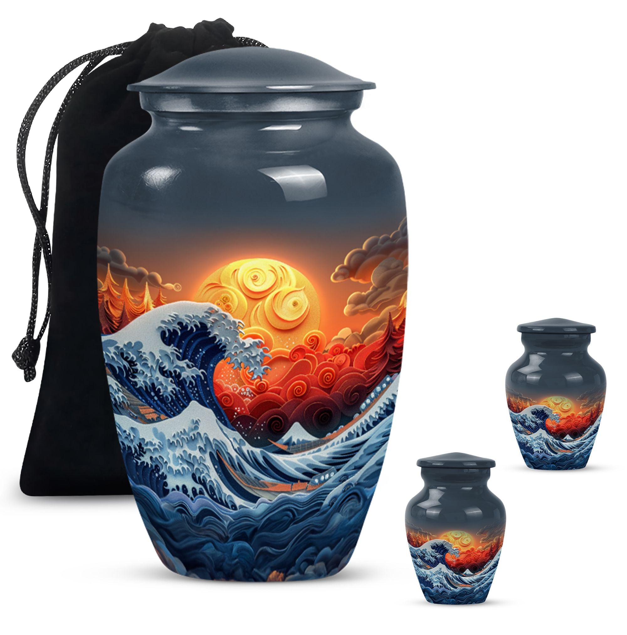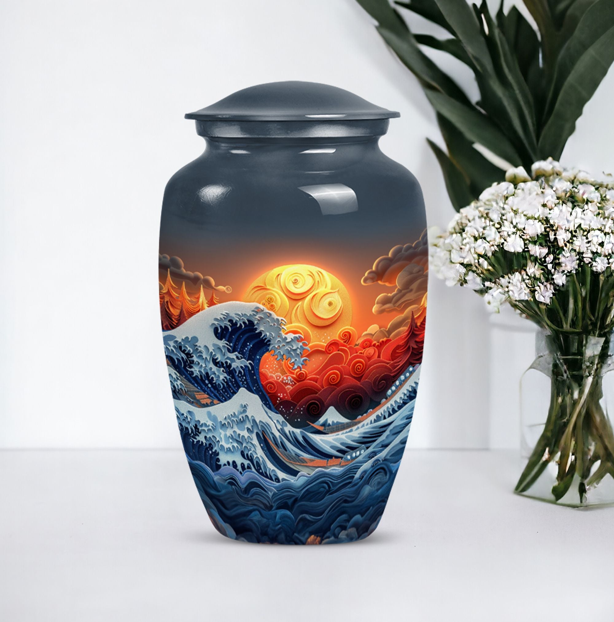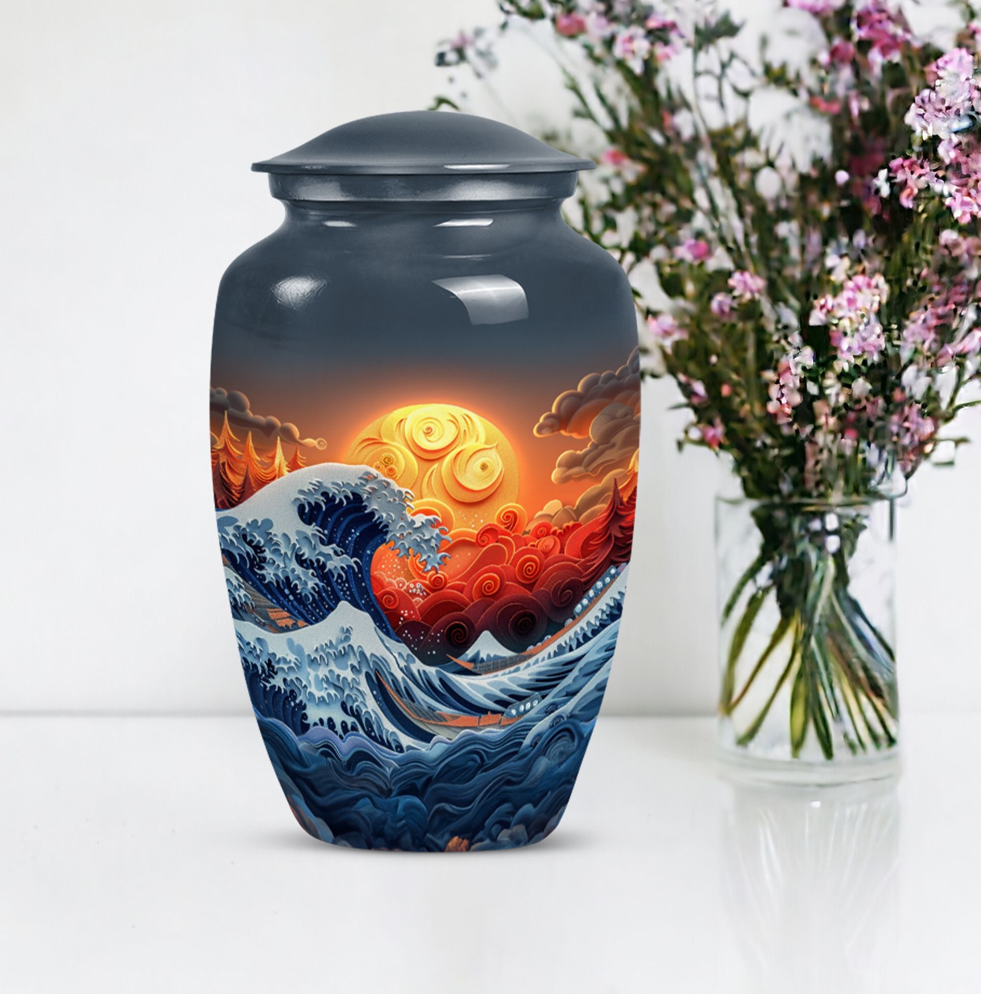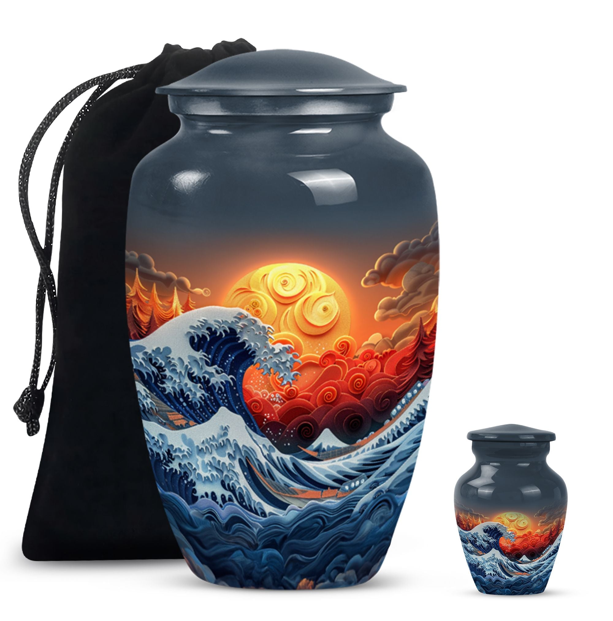 Discover the ocean waves urn, a 10-inch large, aluminium cremation urn for human ashes. This masterfully crafted urn weighs a solid 3.3 pounds and is designed to capture the essence of loved ones passed. Encapsulating a unique butterfly theme, its 200 cubic-inch capacity is perfect for adult ashes. Heralded as a classic urn, this product offers the opportunity to personalize it via engraving, imprinting the names of the dear departed eternally. As part of the package, you also receive a velvet pouch, meticulously designed for the containment and preservation of ashes. Carry the memory of your loved ones with you forever, encased in this ocean waves urn. A highly sought product for memorial ceremonies amongst seniors and adults. Embrace the value of the past as these burial urns become a comforting sight in your home.