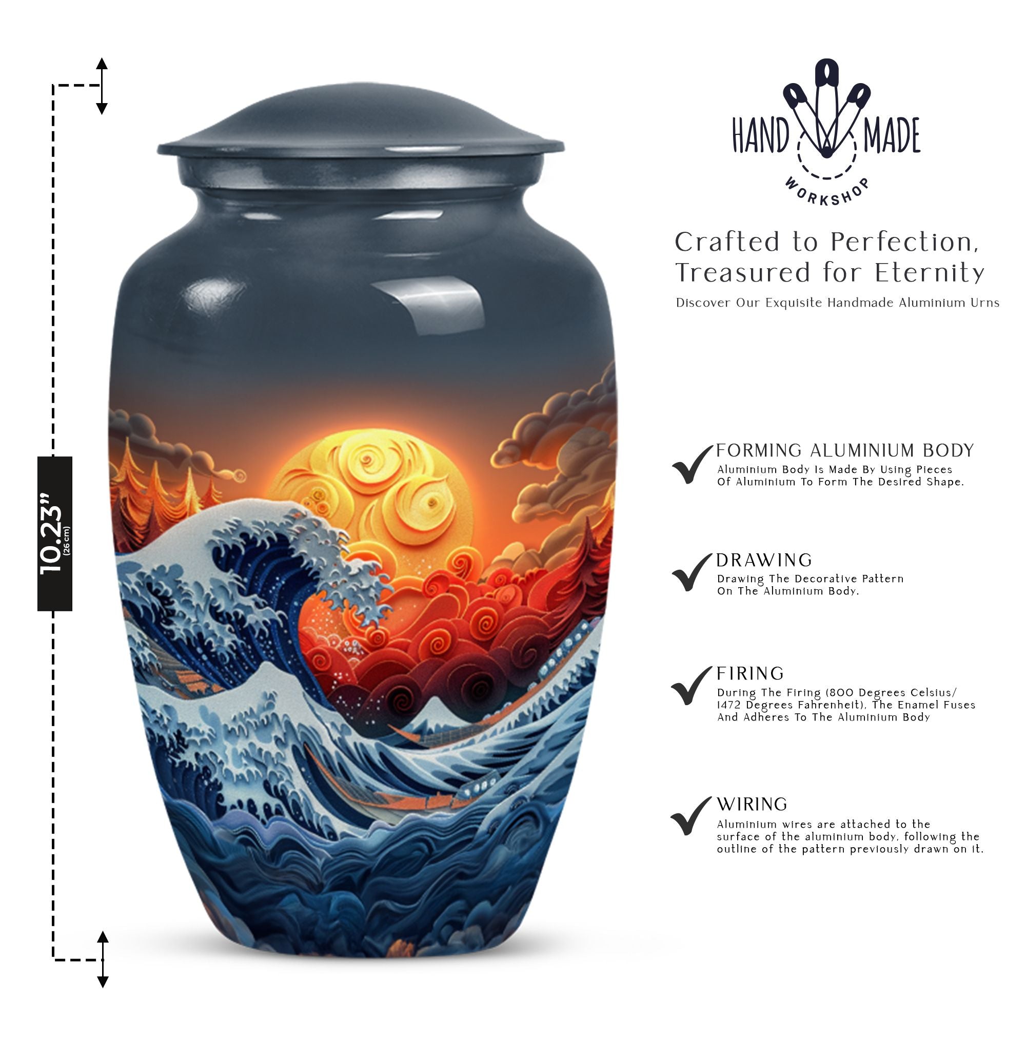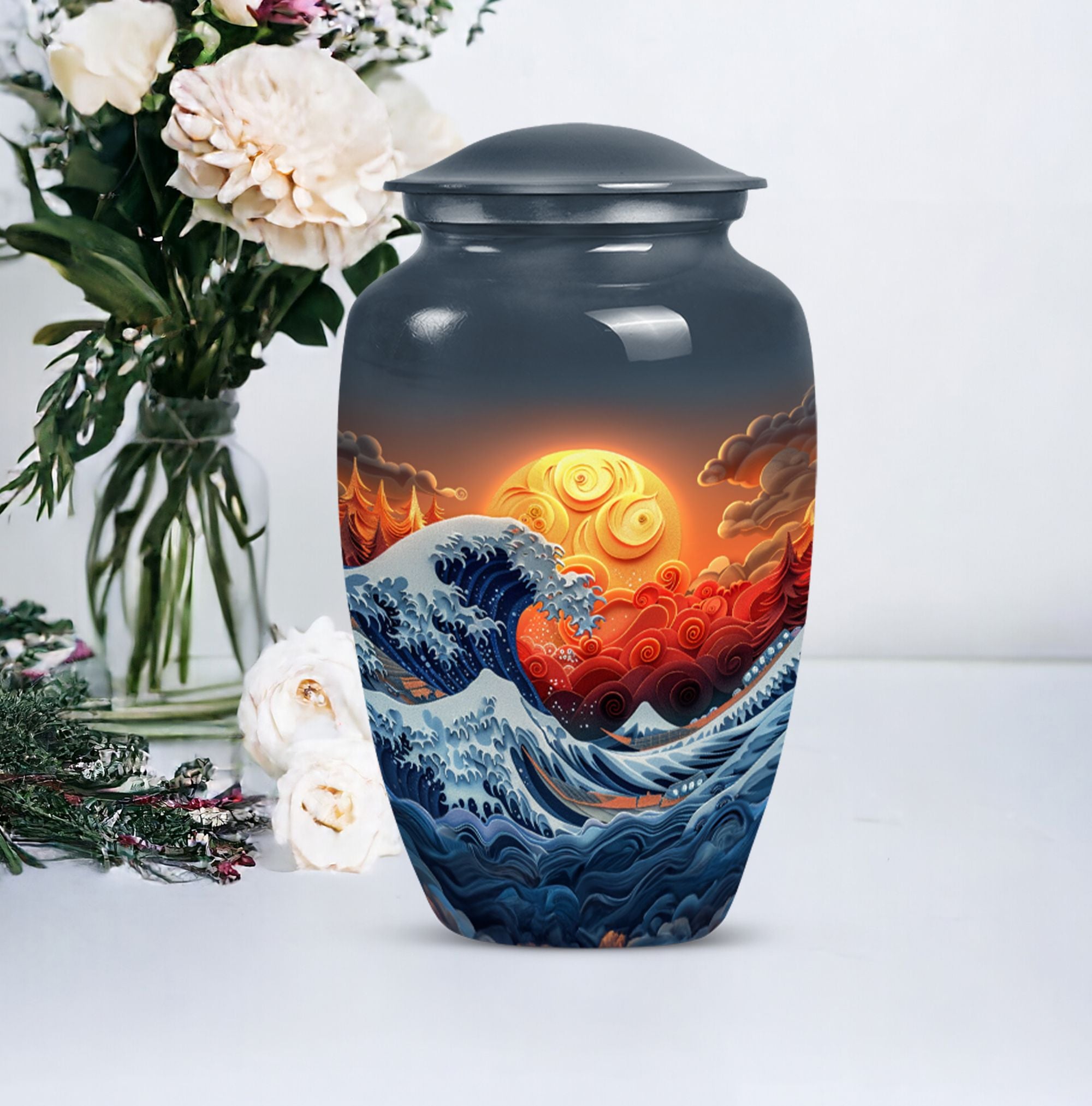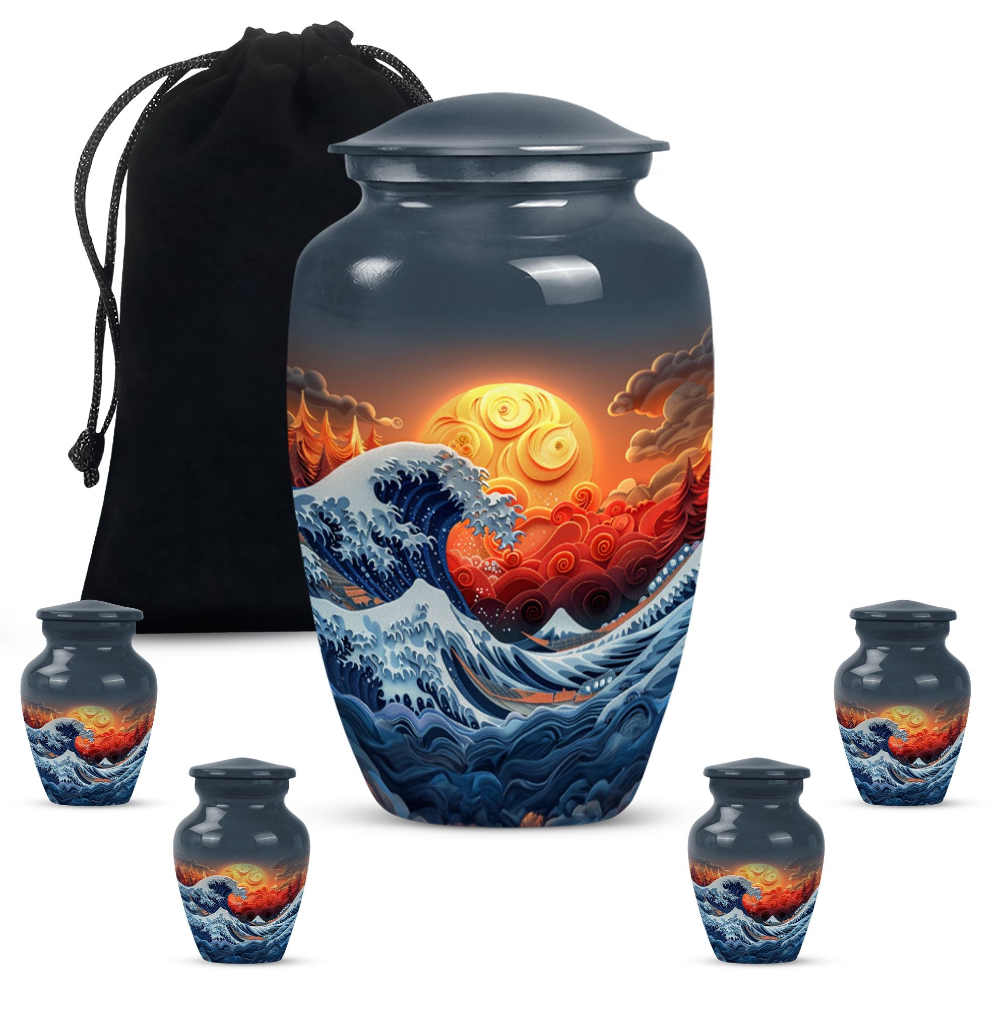 Discover the ocean waves urn, a 10-inch large, aluminium cremation urn for human ashes. This masterfully crafted urn weighs a solid 3.3 pounds and is designed to capture the essence of loved ones passed. Encapsulating a unique butterfly theme, its 200 cubic-inch capacity is perfect for adult ashes. Heralded as a classic urn, this product offers the opportunity to personalize it via engraving, imprinting the names of the dear departed eternally. As part of the package, you also receive a velvet pouch, meticulously designed for the containment and preservation of ashes. Carry the memory of your loved ones with you forever, encased in this ocean waves urn. A highly sought product for memorial ceremonies amongst seniors and adults. Embrace the value of the past as these burial urns become a comforting sight in your home.