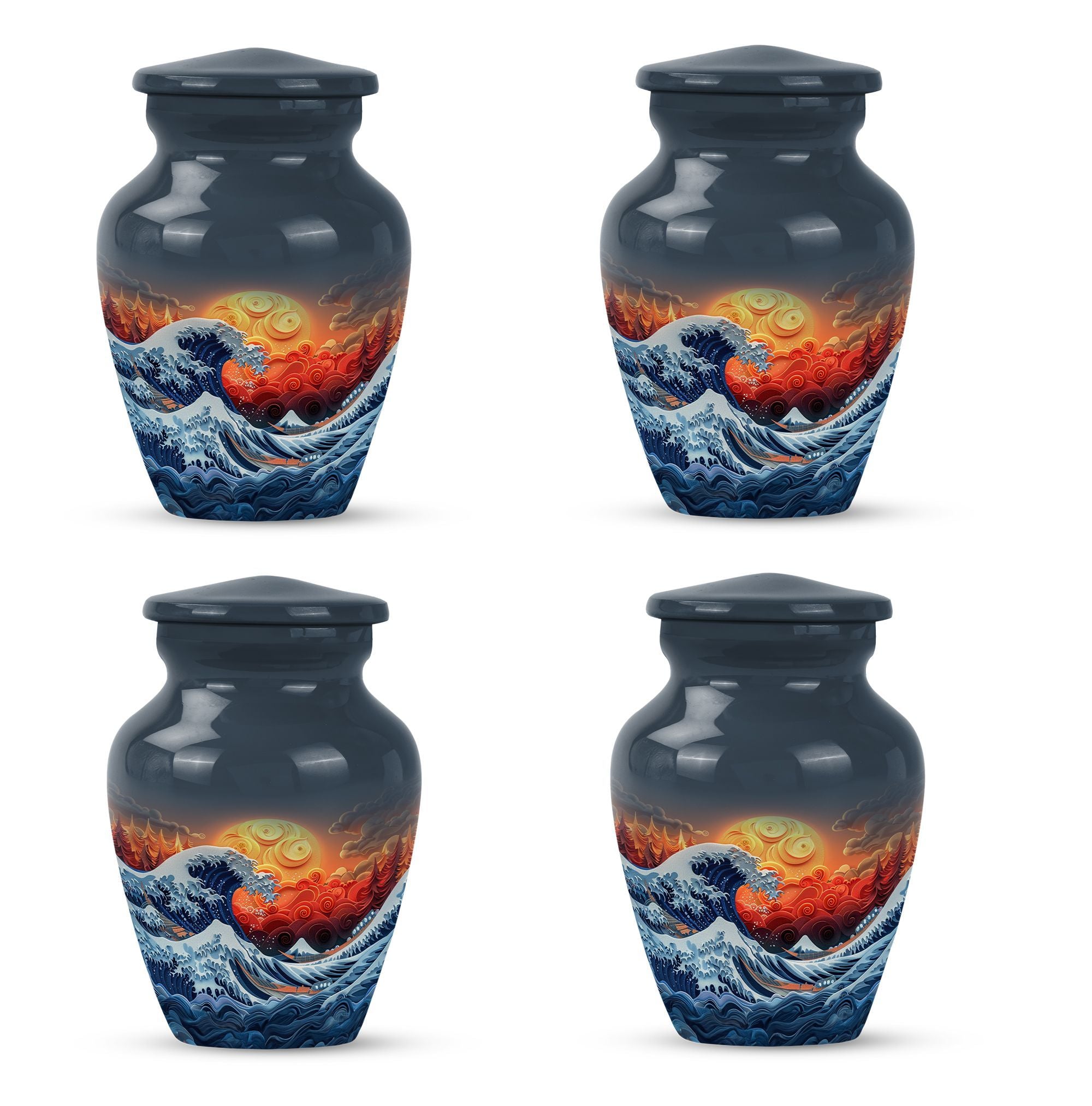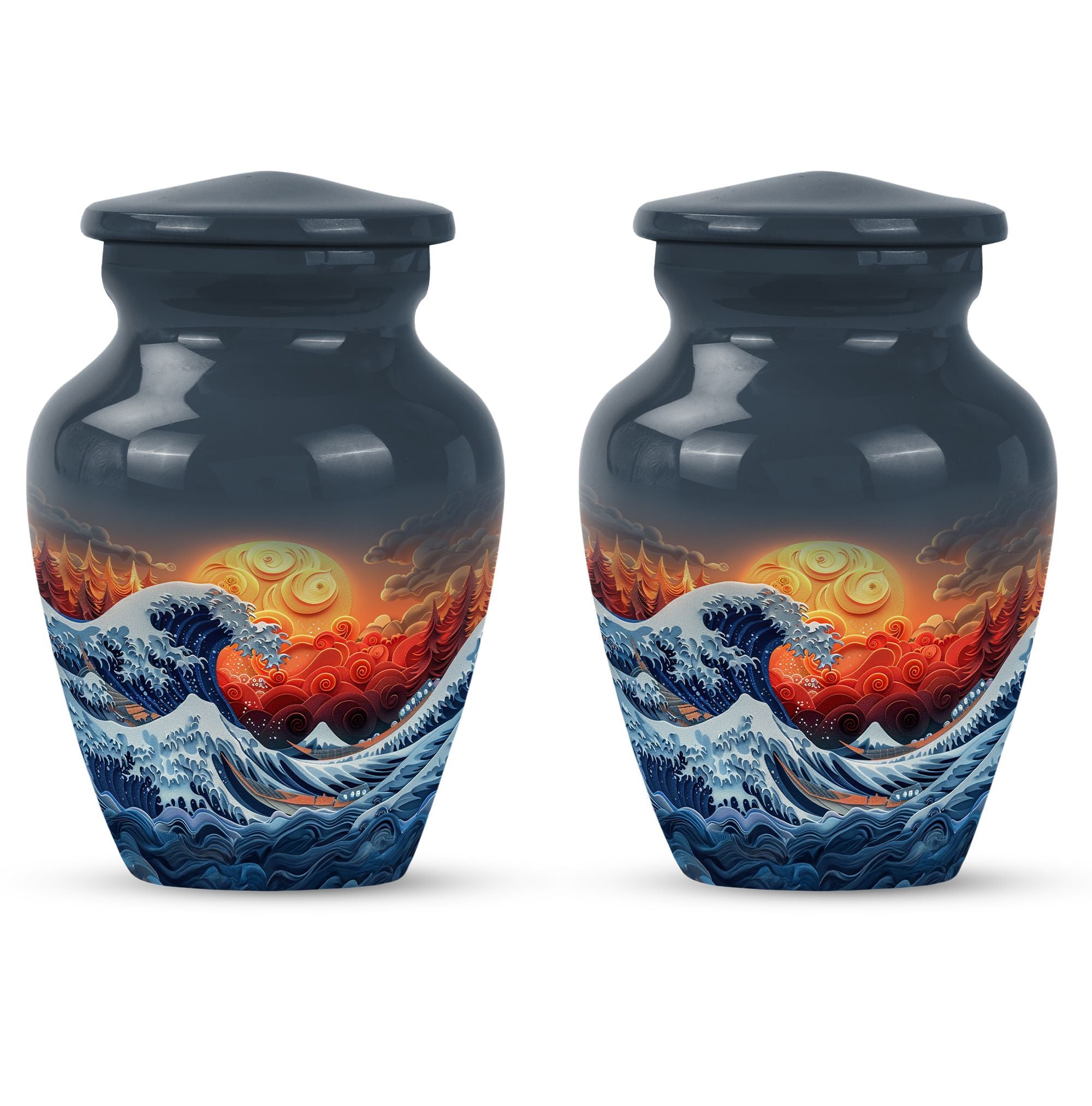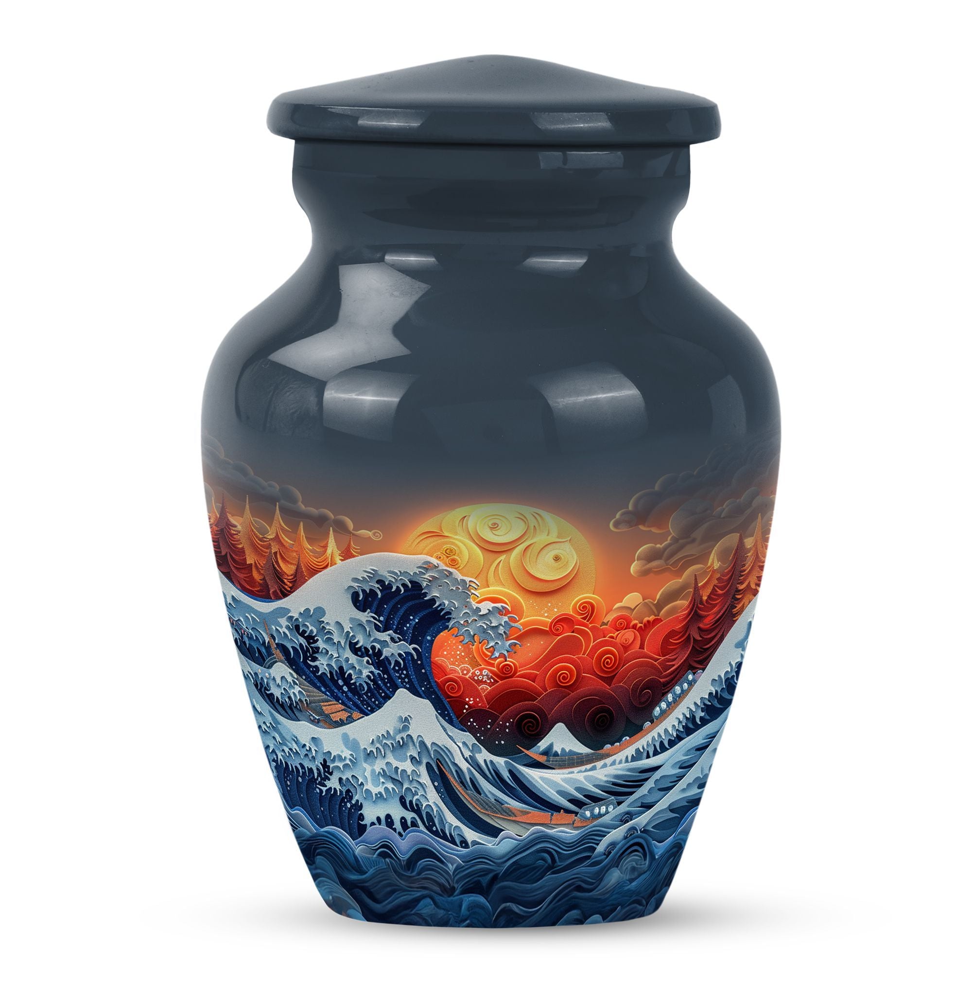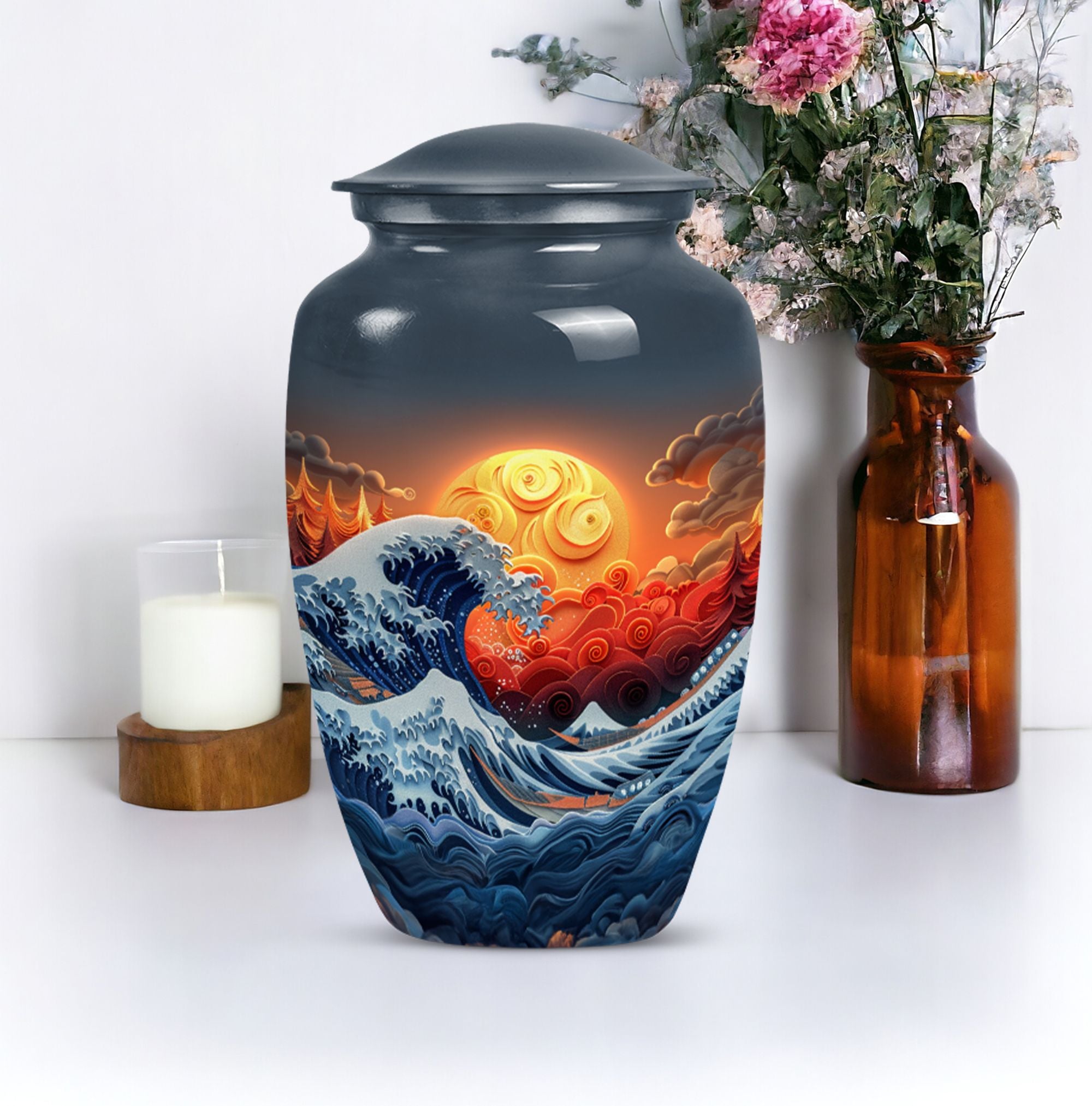 Discover the ocean waves urn, a 10-inch large, aluminium cremation urn for human ashes. This masterfully crafted urn weighs a solid 3.3 pounds and is designed to capture the essence of loved ones passed. Encapsulating a unique butterfly theme, its 200 cubic-inch capacity is perfect for adult ashes. Heralded as a classic urn, this product offers the opportunity to personalize it via engraving, imprinting the names of the dear departed eternally. As part of the package, you also receive a velvet pouch, meticulously designed for the containment and preservation of ashes. Carry the memory of your loved ones with you forever, encased in this ocean waves urn. A highly sought product for memorial ceremonies amongst seniors and adults. Embrace the value of the past as these burial urns become a comforting sight in your home.