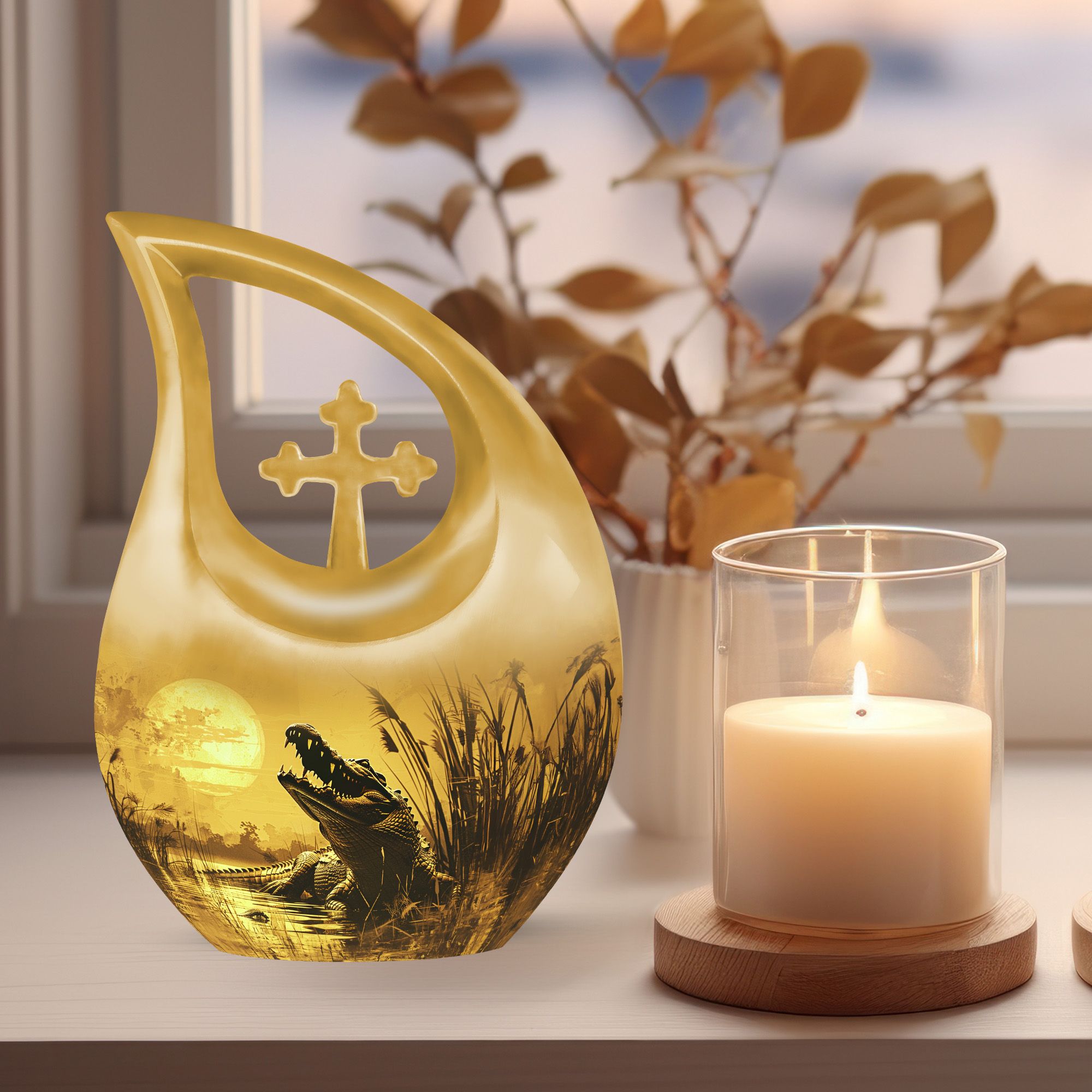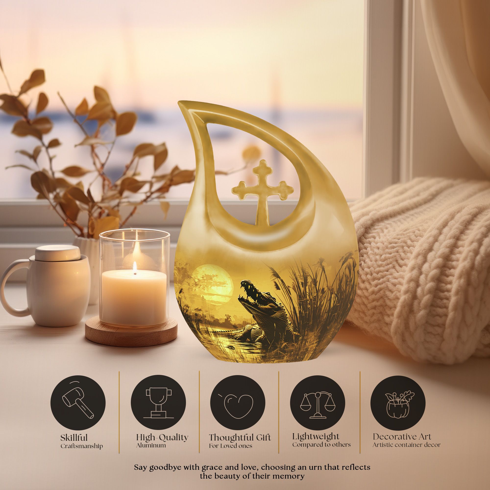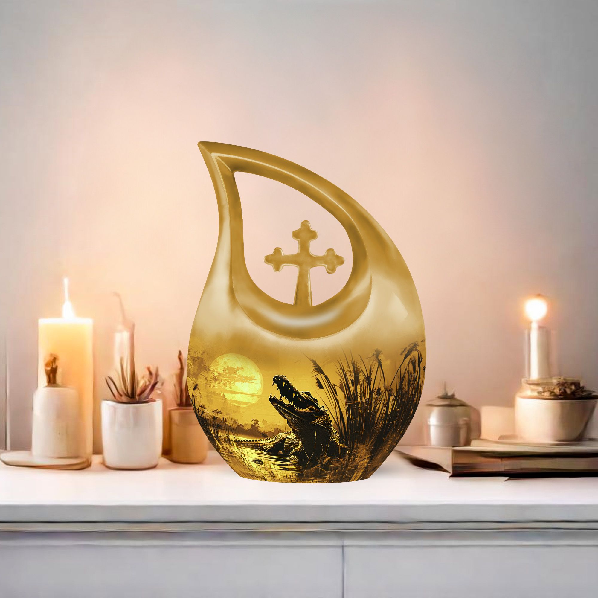 Crafted from durable aluminum, this urn features a radiant golden alligator design set against a peaceful sunset backdrop—symbolizing protection, strength, and the enduring journey of the spirit. With a secure screw-top lid and a full 200-cu-in capacity, it is ideal for those needing urns for ashes adult male large, large urns for human ashes adult female, or a timeless large human ashes urn. Its carefully detailed artwork and smooth finish make it both a memorial piece and a beautiful display for the home or service.
