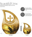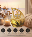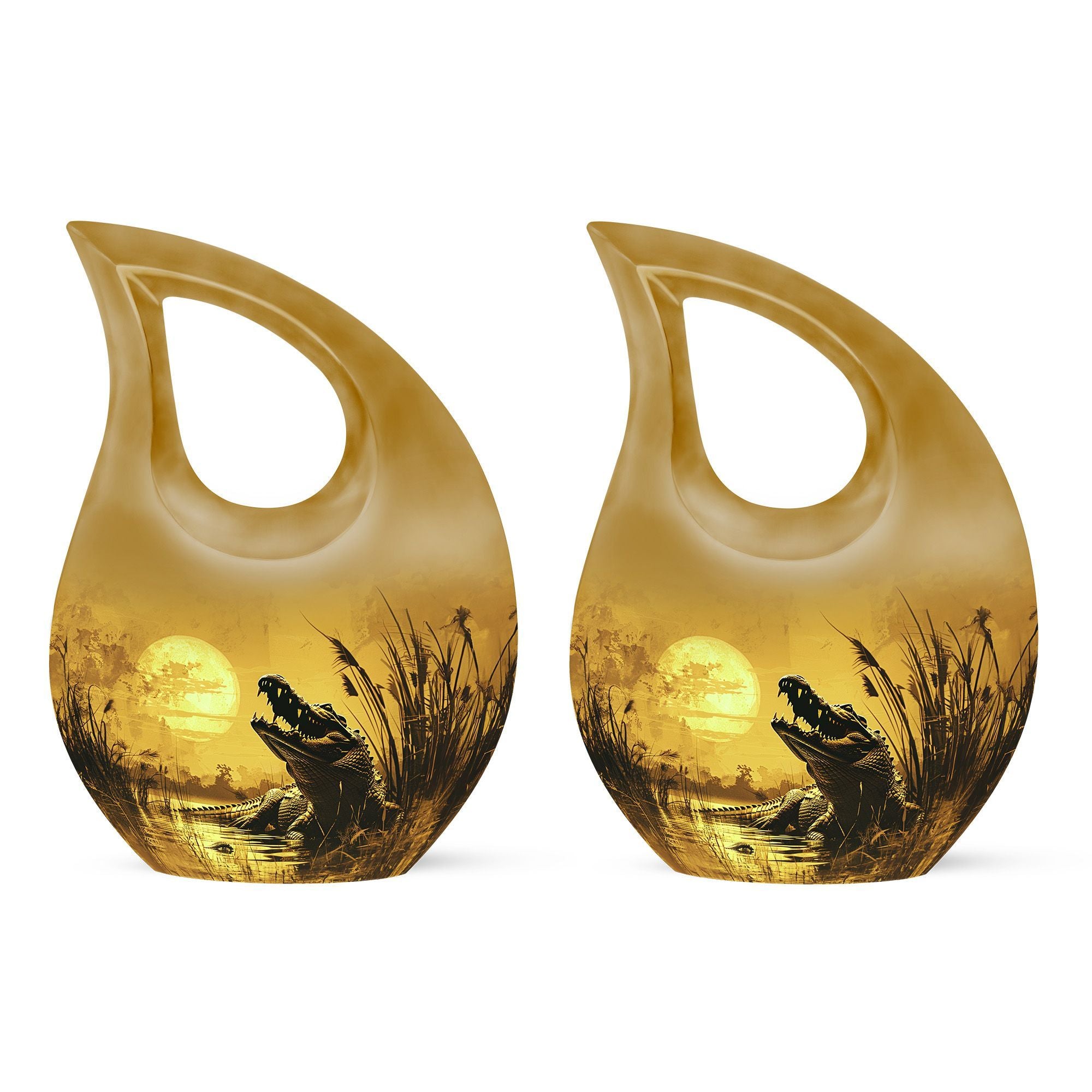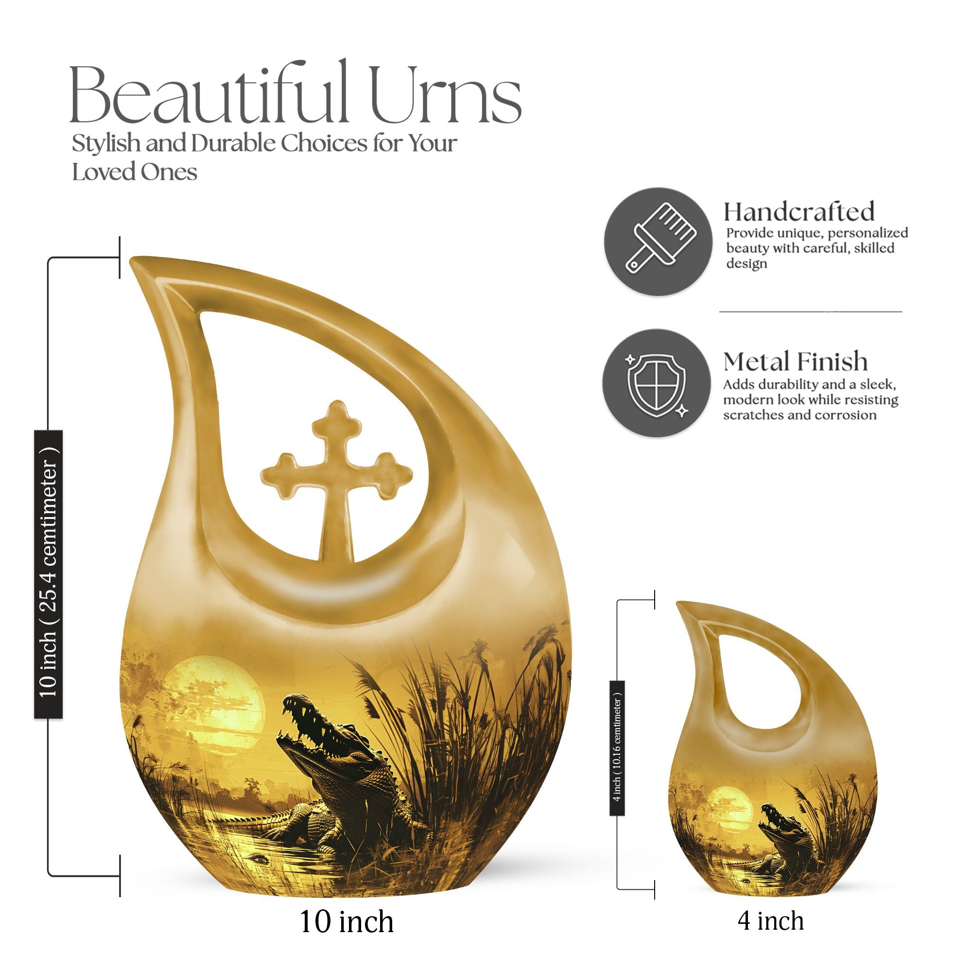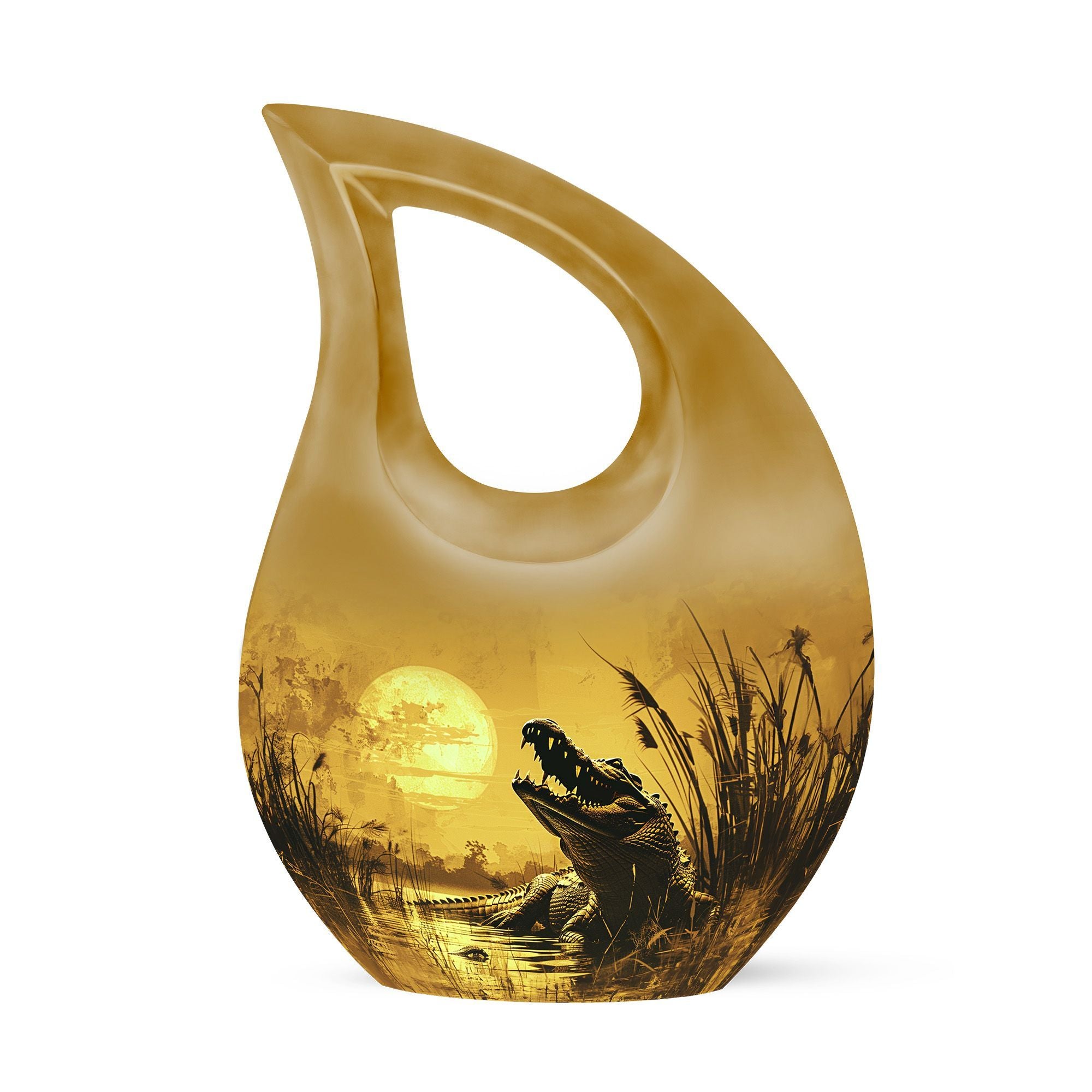 Crafted from durable aluminum, this urn features a radiant golden alligator design set against a peaceful sunset backdrop—symbolizing protection, strength, and the enduring journey of the spirit. With a secure screw-top lid and a full 200-cu-in capacity, it is ideal for those needing urns for ashes adult male large, large urns for human ashes adult female, or a timeless large human ashes urn. Its carefully detailed artwork and smooth finish make it both a memorial piece and a beautiful display for the home or service.