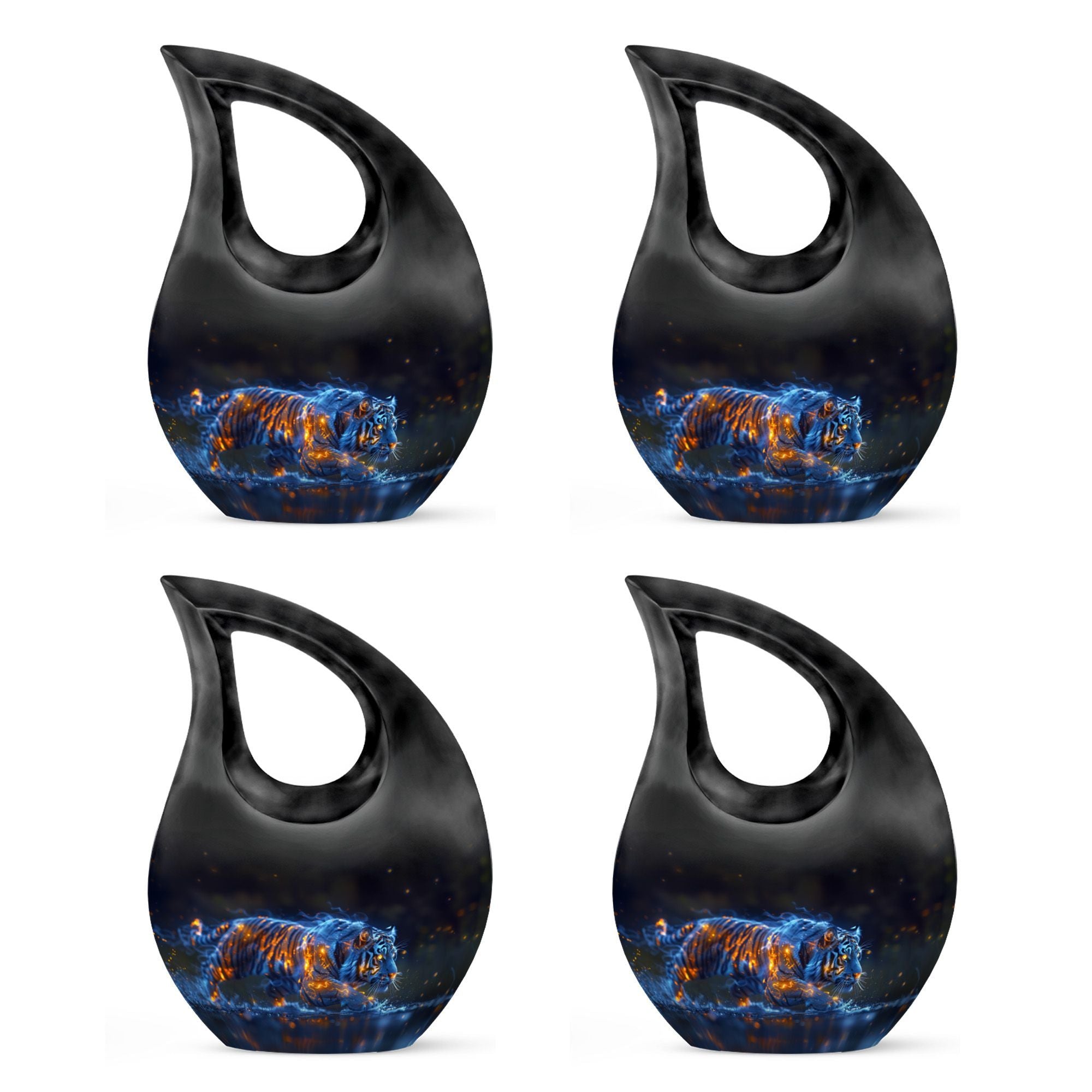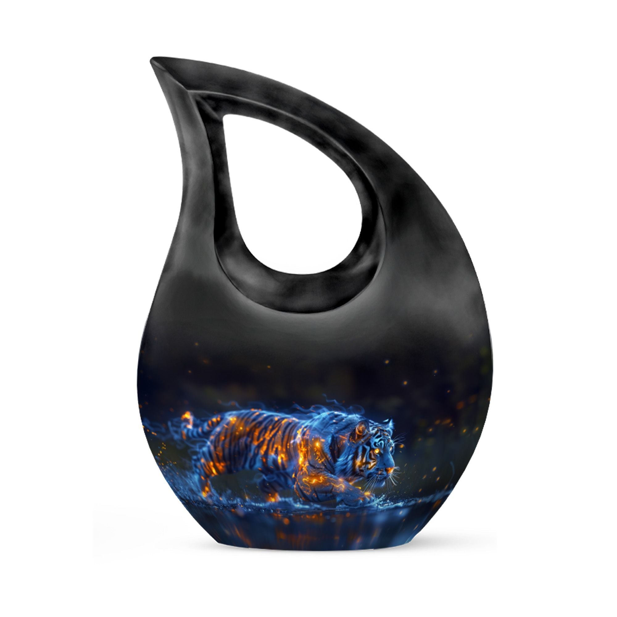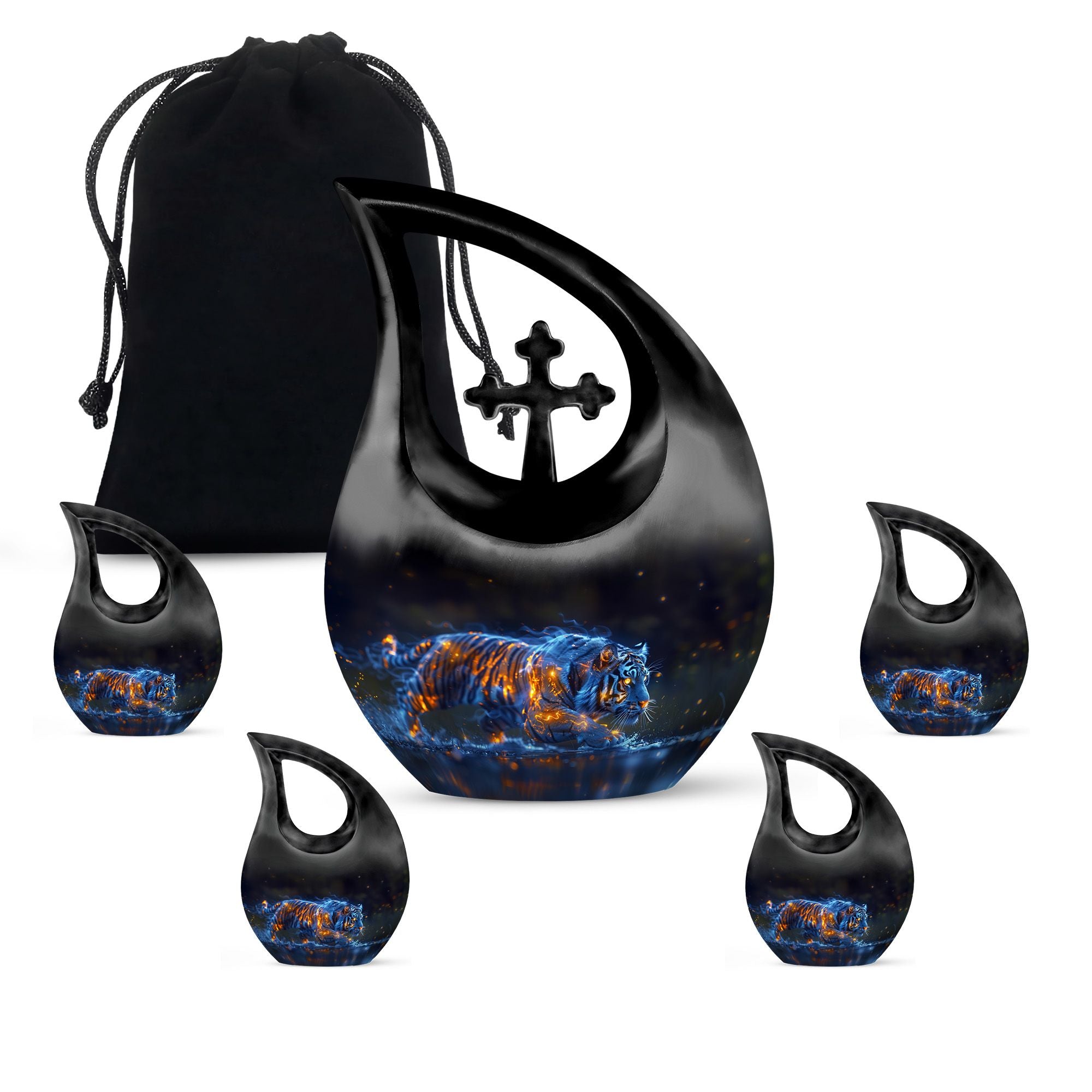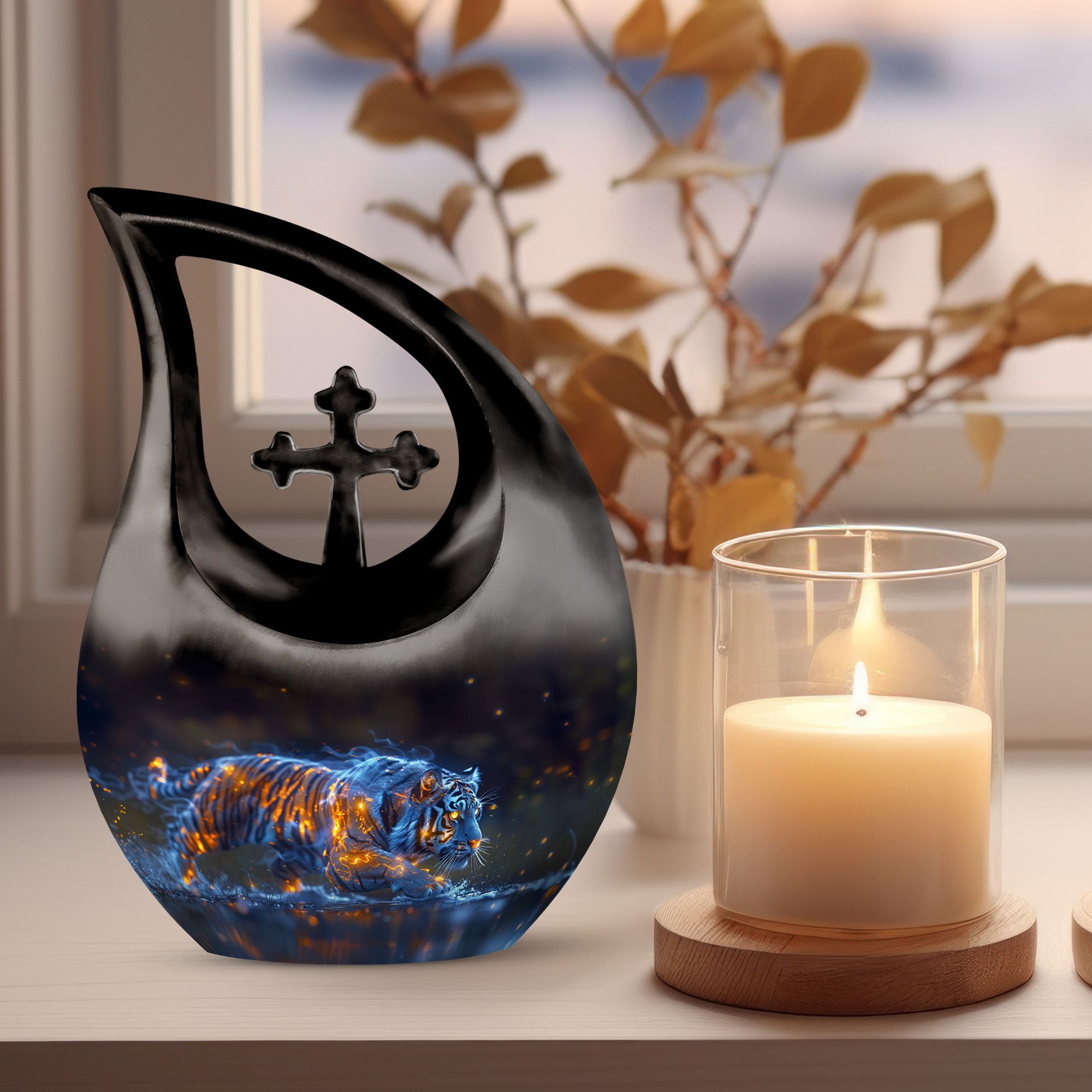 Cherish the memories of your loved ones with the Aquatic Fire Essence Urn. Our uniquely sized urn is a perfect keepsake, standing at a height of 10 inches and can hold up to 200 cubic inches of ashes. Weighing 3.3 pounds, this extra-large urn is made with durable aluminium material, ensuring long-lasting preservation. The striking 'Cross Drop' manifests a pure heartfelt tribute to the departed, echoing the eternal peace within. The urn comes with a protective velvet pouch ensuring secure containment of ashes. Adding a thoughtful touch, you can personalize this memento with engraved names, fondly remembering and celebrating a life beautifully lived. This perfect heirloom memorial urn, well-suited for two, allows room to hold a sizable amount of cremated remains, serving as a lasting tribute to love and life. Please note that it is exclusively designed keeping in mind the needs related to memorial ceremonies, and the artistic 'Aquatic Fire Essence' theme symbolizes the eternal journey of the soul.