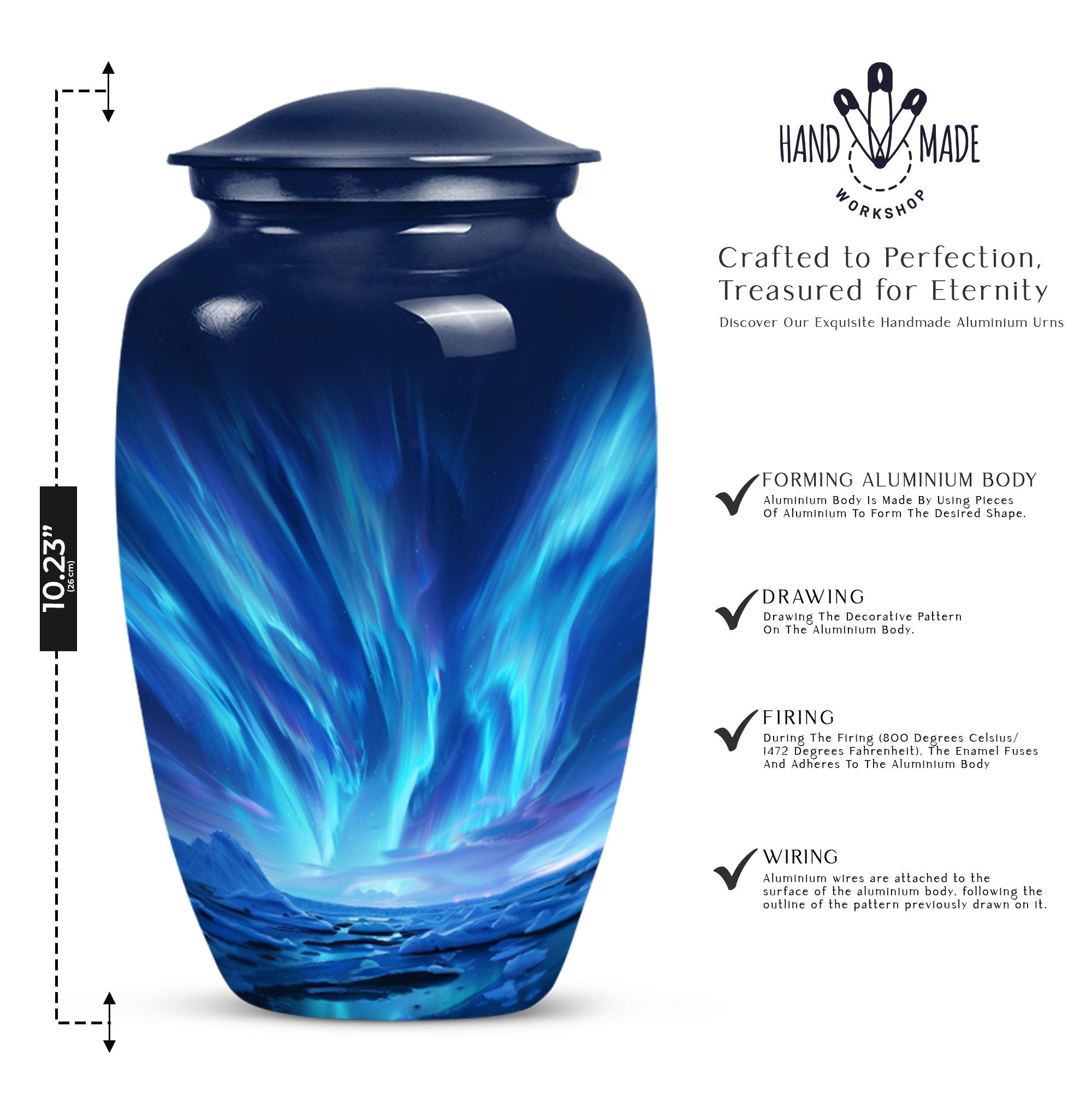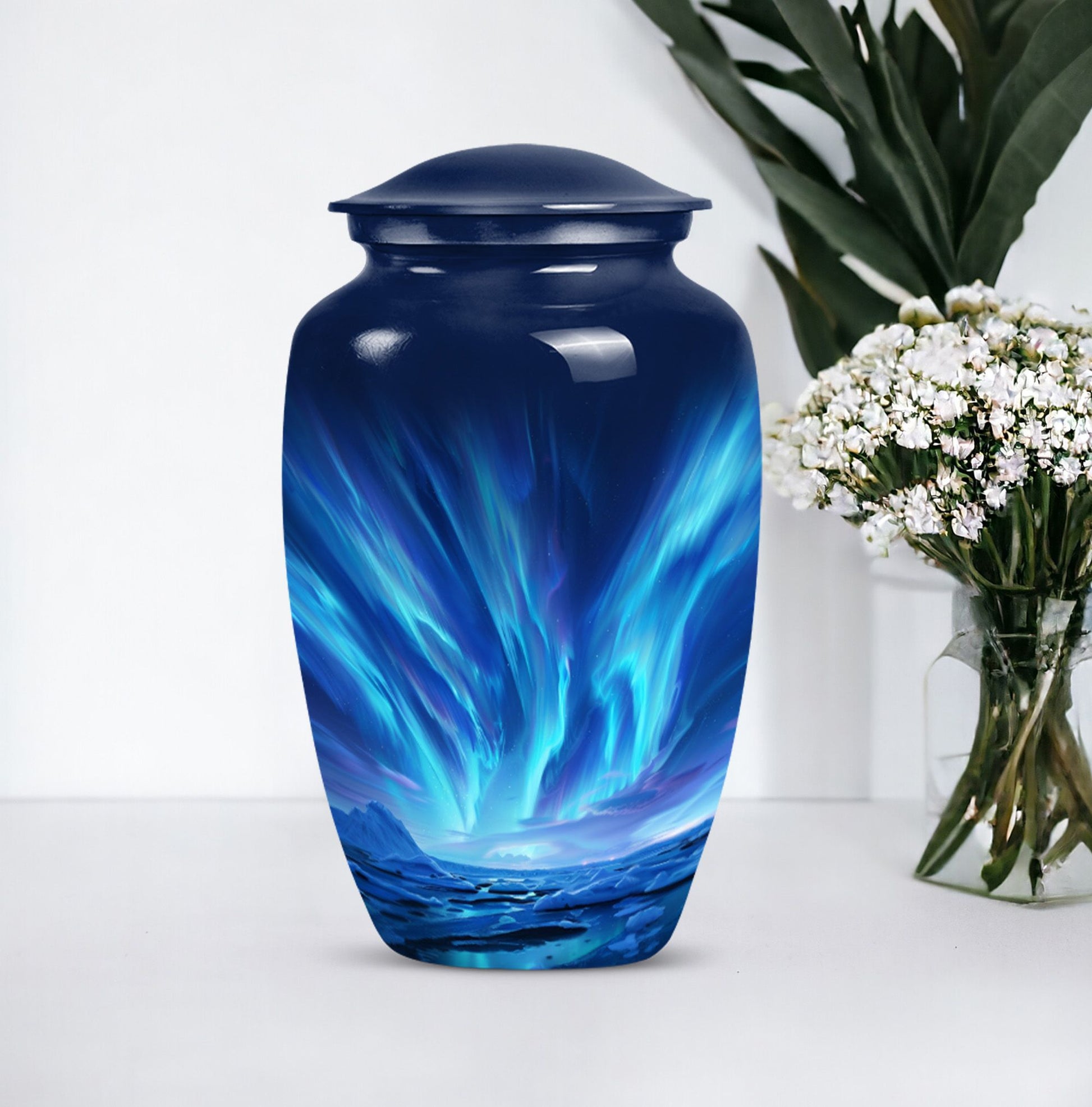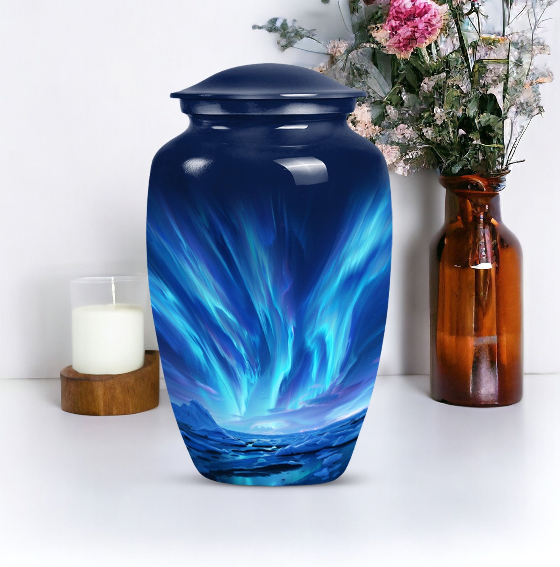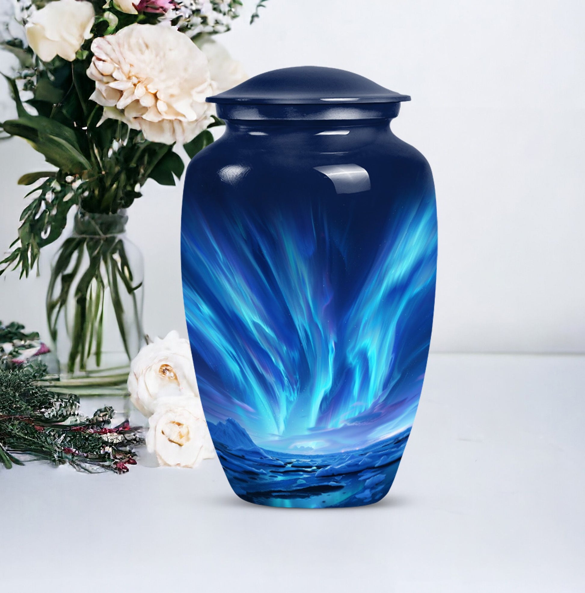 Experience a breathtaking tribute to your dearly departed with our Aurora Borealis Large Urn. This commemorative piece elegantly incorporates the captivating splendor of the 'Northern Lights' into its design motif. Standing at a solid 10', this aluminium large urn is remarkably durable and bears a stunning butterfly theme to symbolize transformation and the journey of the soul. It contains a generous capacity of 200 cubic inches, making it suitable for preservation of ashes from both male or female adults. This urn's understated classic design is inclusive of personal engraving options, enabling you to imprint your dear one's name or sentiment of choice. Supplementing the urn is a velvet pouch, providing a secure and discreet containment of ashes. This cremation urn weighs only 3.3 pounds, ensuring transport and placement are effortless tasks. Breathing life into keywords such as 'cremation companion urns' and 'memorial urns', this ceremonial supply embodies tranquility and a comforting sense of closure. Transform your farewell ceremony into a meaningful display of remembrance with our Aurora Borealis Large Urn.