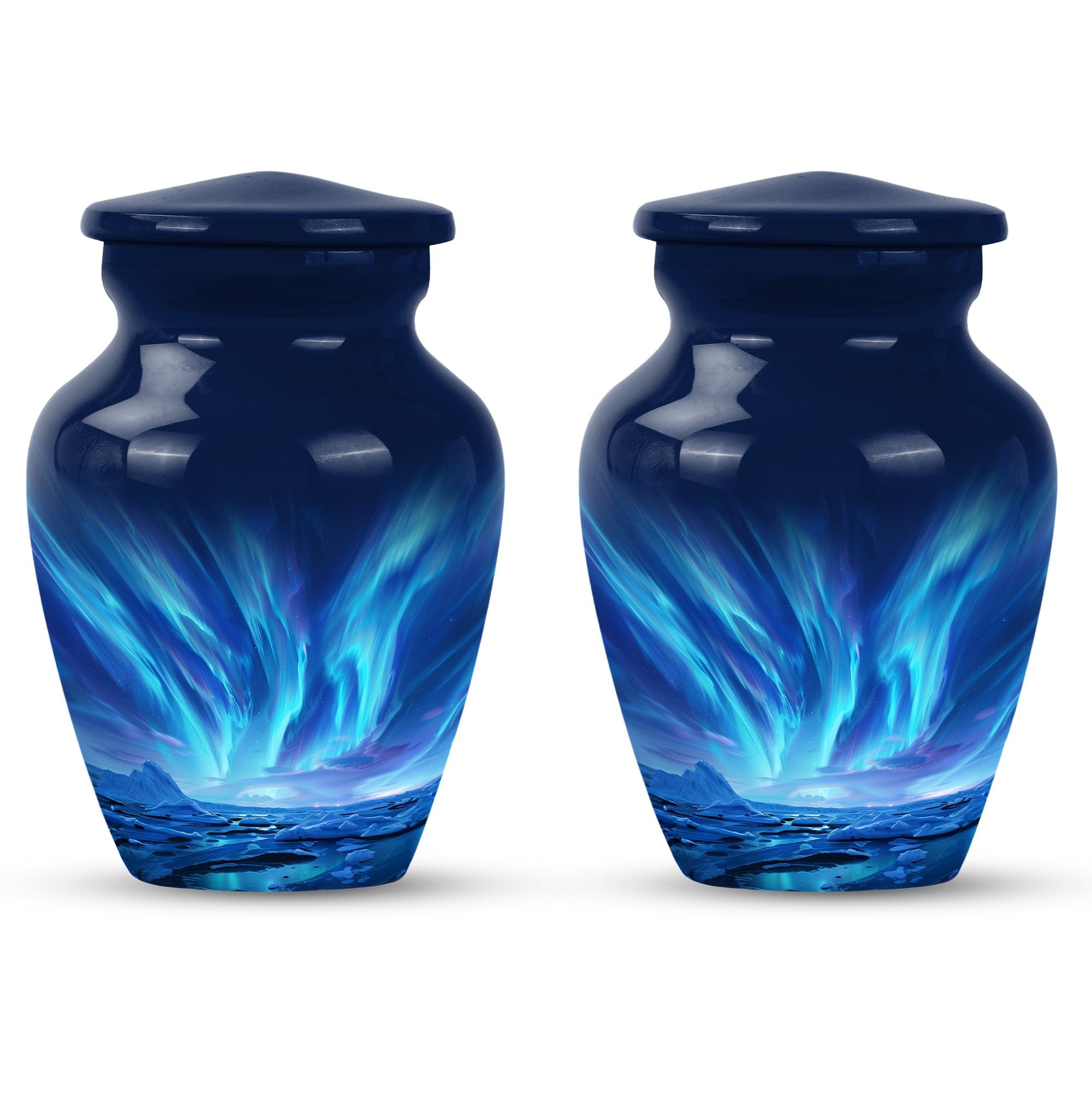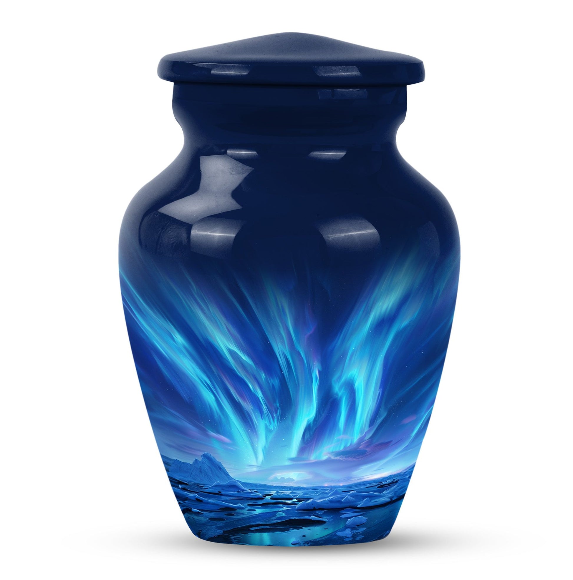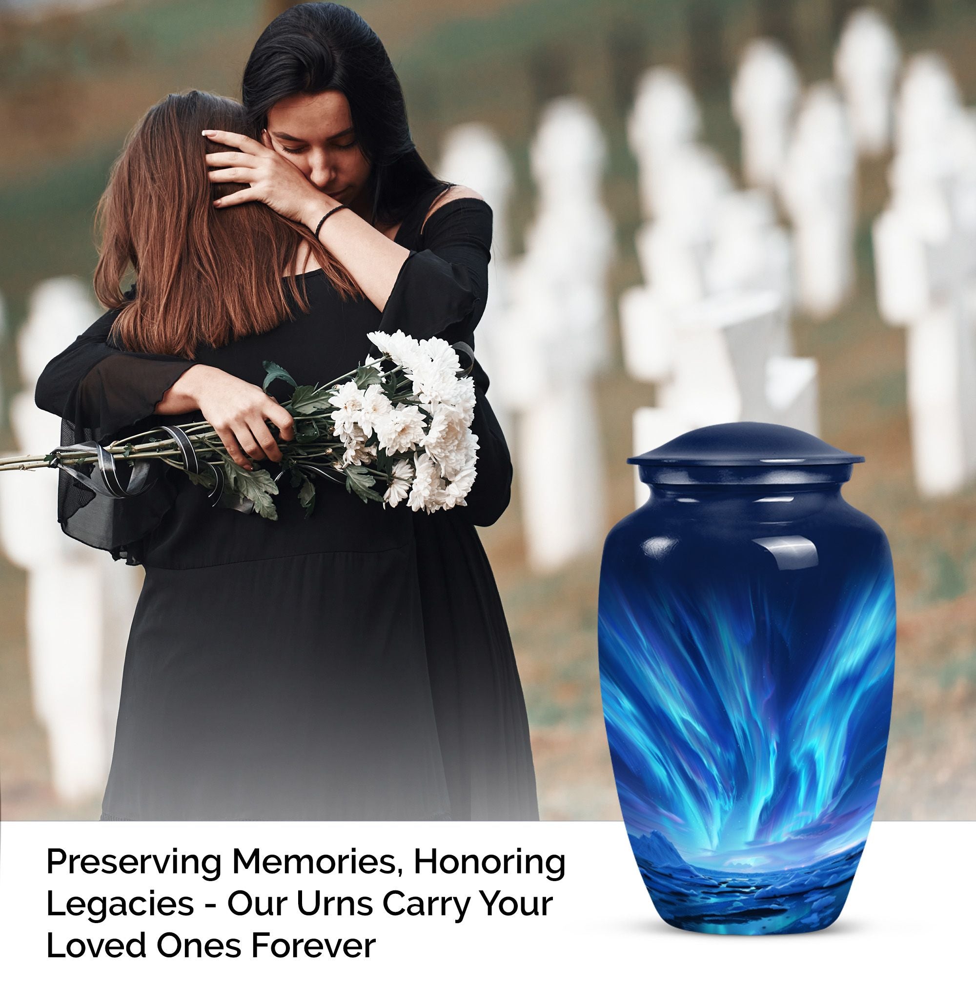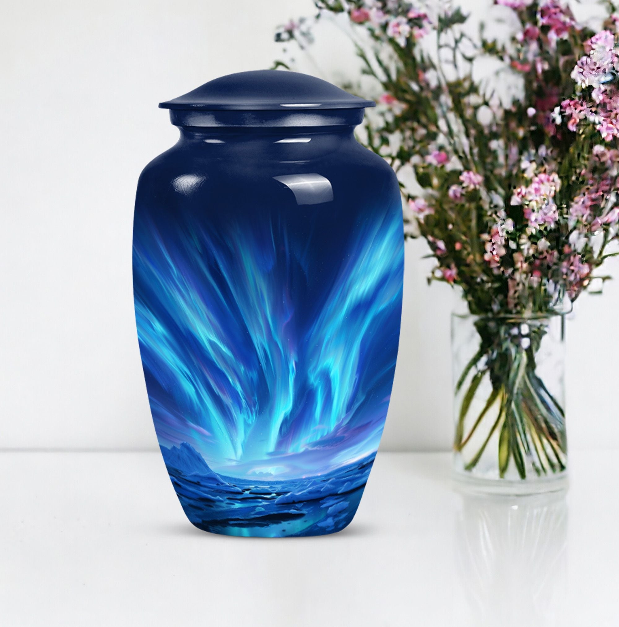 Experience a breathtaking tribute to your dearly departed with our Aurora Borealis Large Urn. This commemorative piece elegantly incorporates the captivating splendor of the 'Northern Lights' into its design motif. Standing at a solid 10', this aluminium large urn is remarkably durable and bears a stunning butterfly theme to symbolize transformation and the journey of the soul. It contains a generous capacity of 200 cubic inches, making it suitable for preservation of ashes from both male or female adults. This urn's understated classic design is inclusive of personal engraving options, enabling you to imprint your dear one's name or sentiment of choice. Supplementing the urn is a velvet pouch, providing a secure and discreet containment of ashes. This cremation urn weighs only 3.3 pounds, ensuring transport and placement are effortless tasks. Breathing life into keywords such as 'cremation companion urns' and 'memorial urns', this ceremonial supply embodies tranquility and a comforting sense of closure. Transform your farewell ceremony into a meaningful display of remembrance with our Aurora Borealis Large Urn.