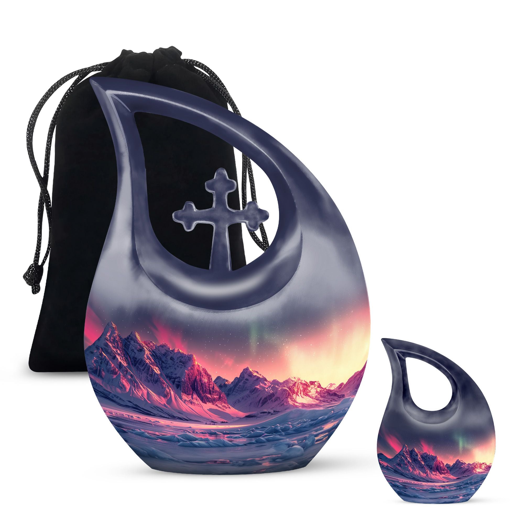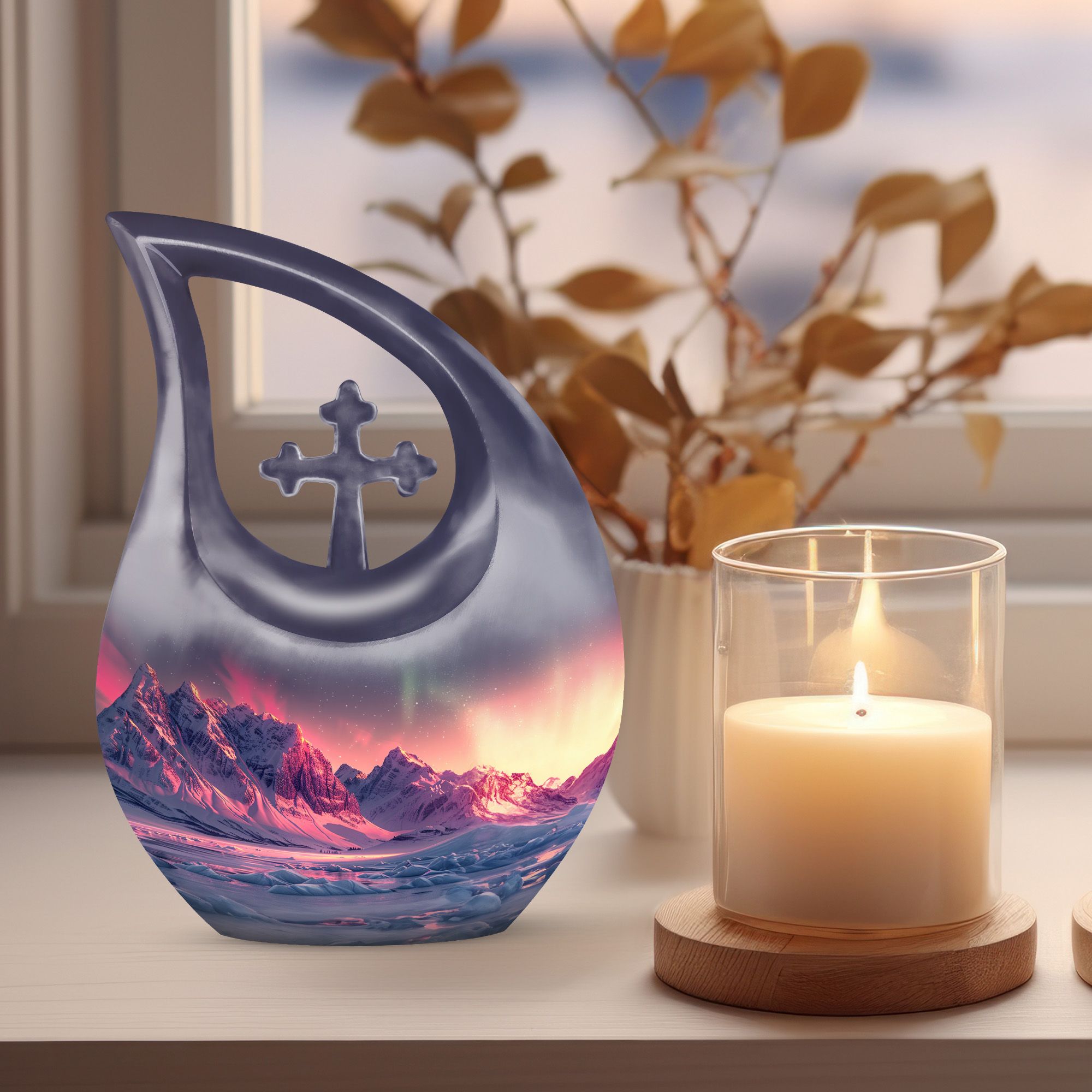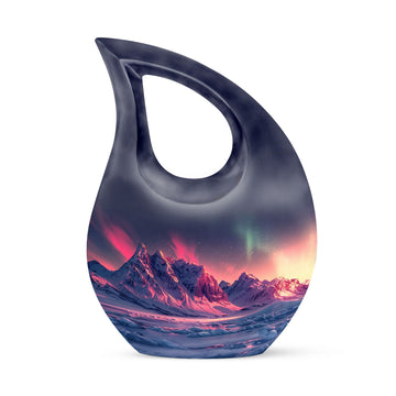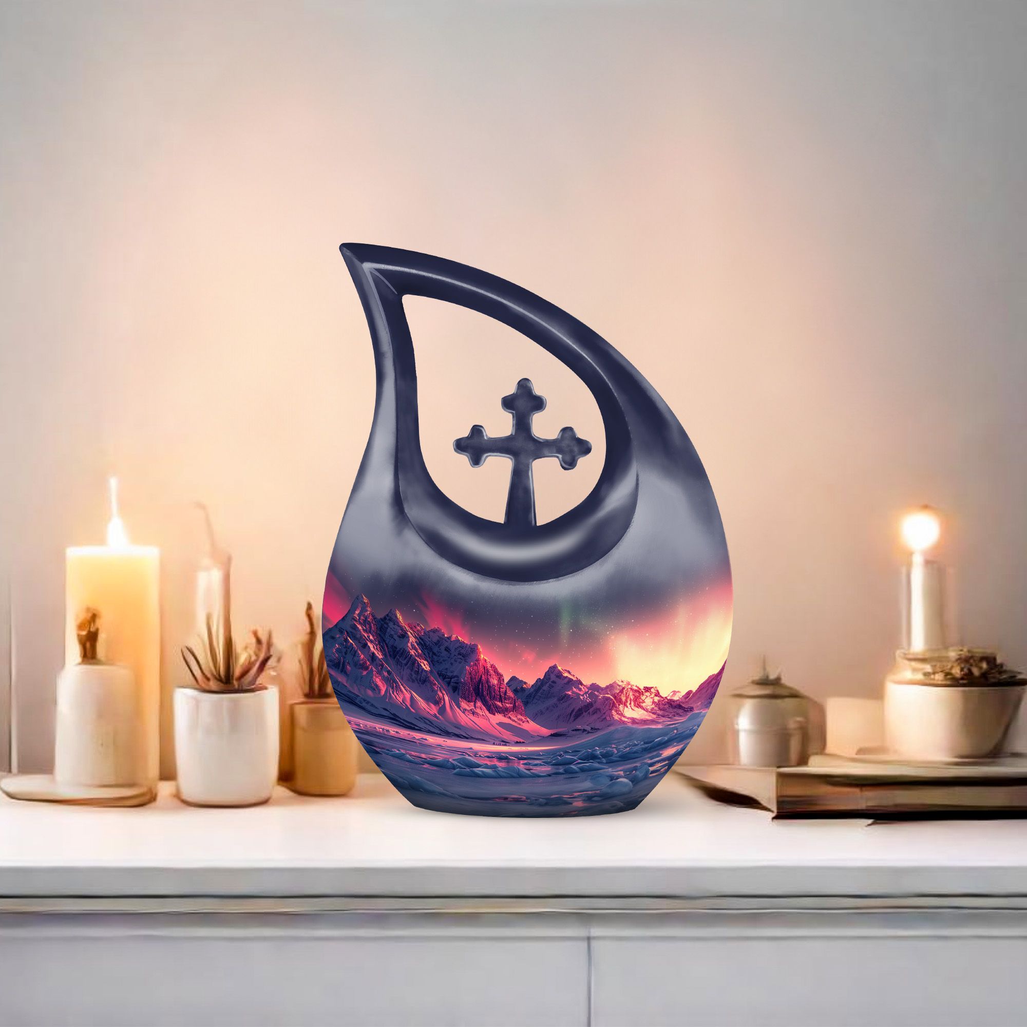 Expertly handcrafted from durable aluminium, this urn combines artistry and strength, making it an ideal choice for those seeking cremation urns large, large decorative urn styles, or a high-capacity cremation urn adult large. Its smooth finish, vivid mountain sunset artwork, and secure screw-top lid ensure both beauty and protection. With a standard full-size capacity, it serves as a reliable large cremation urn for human ashes for home display or burial.