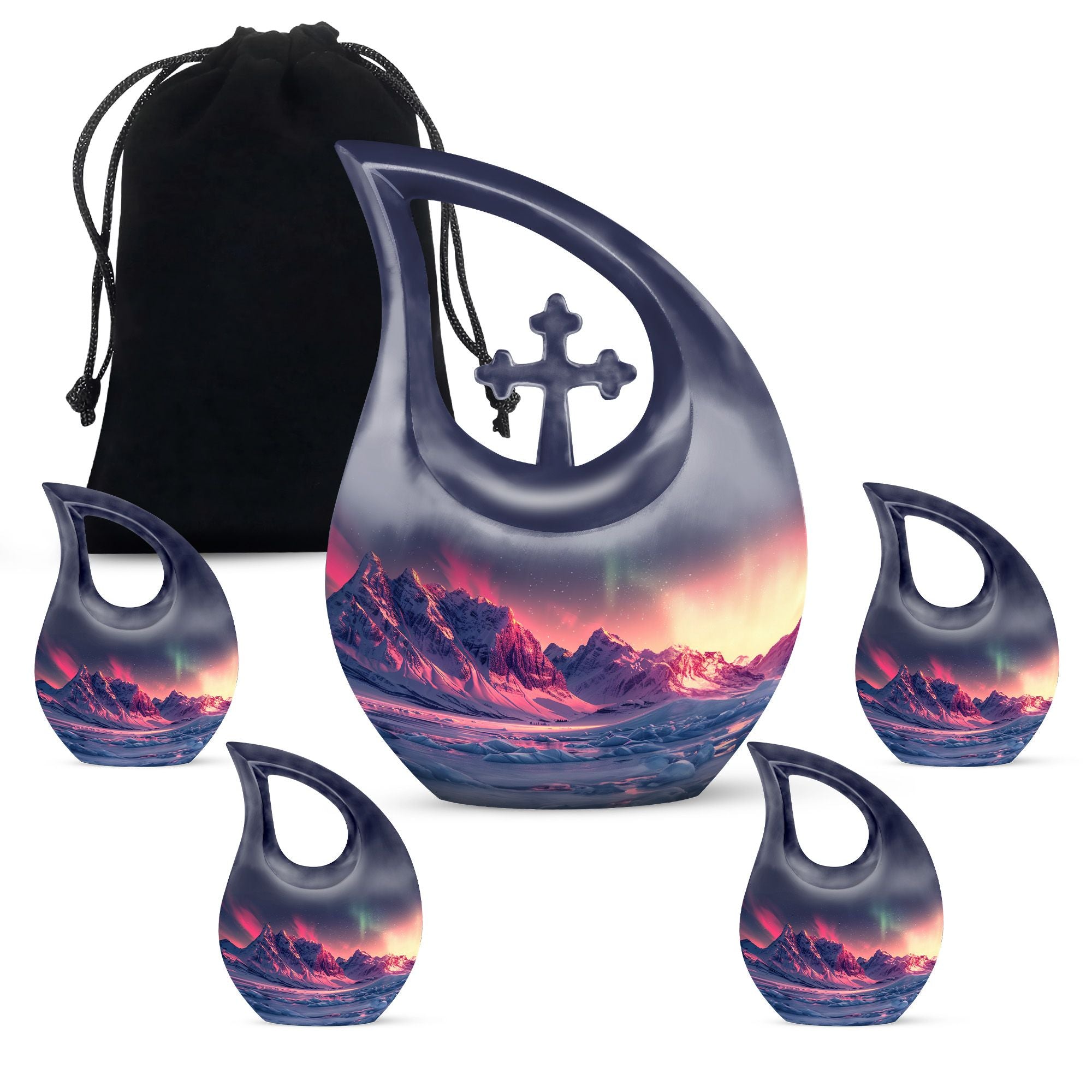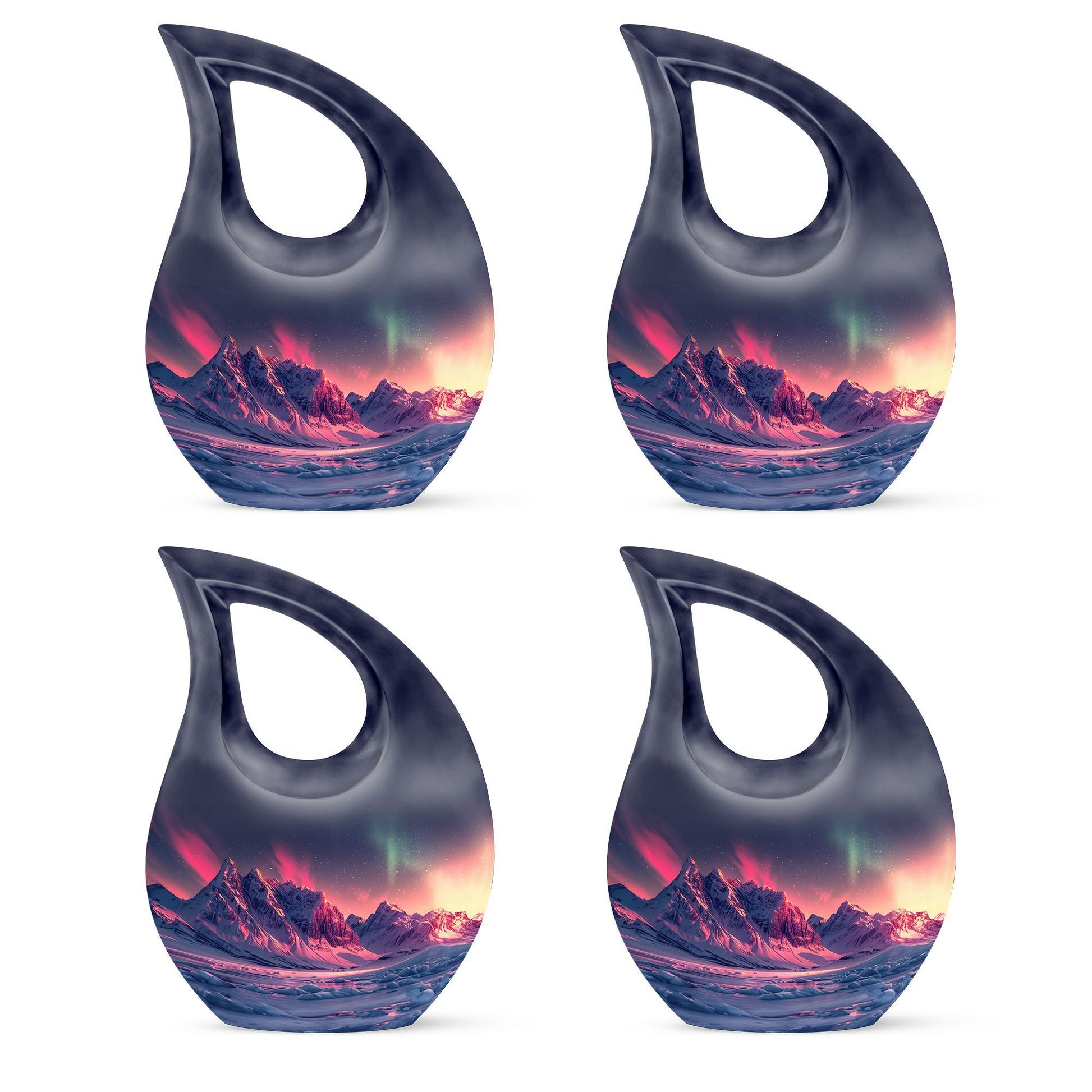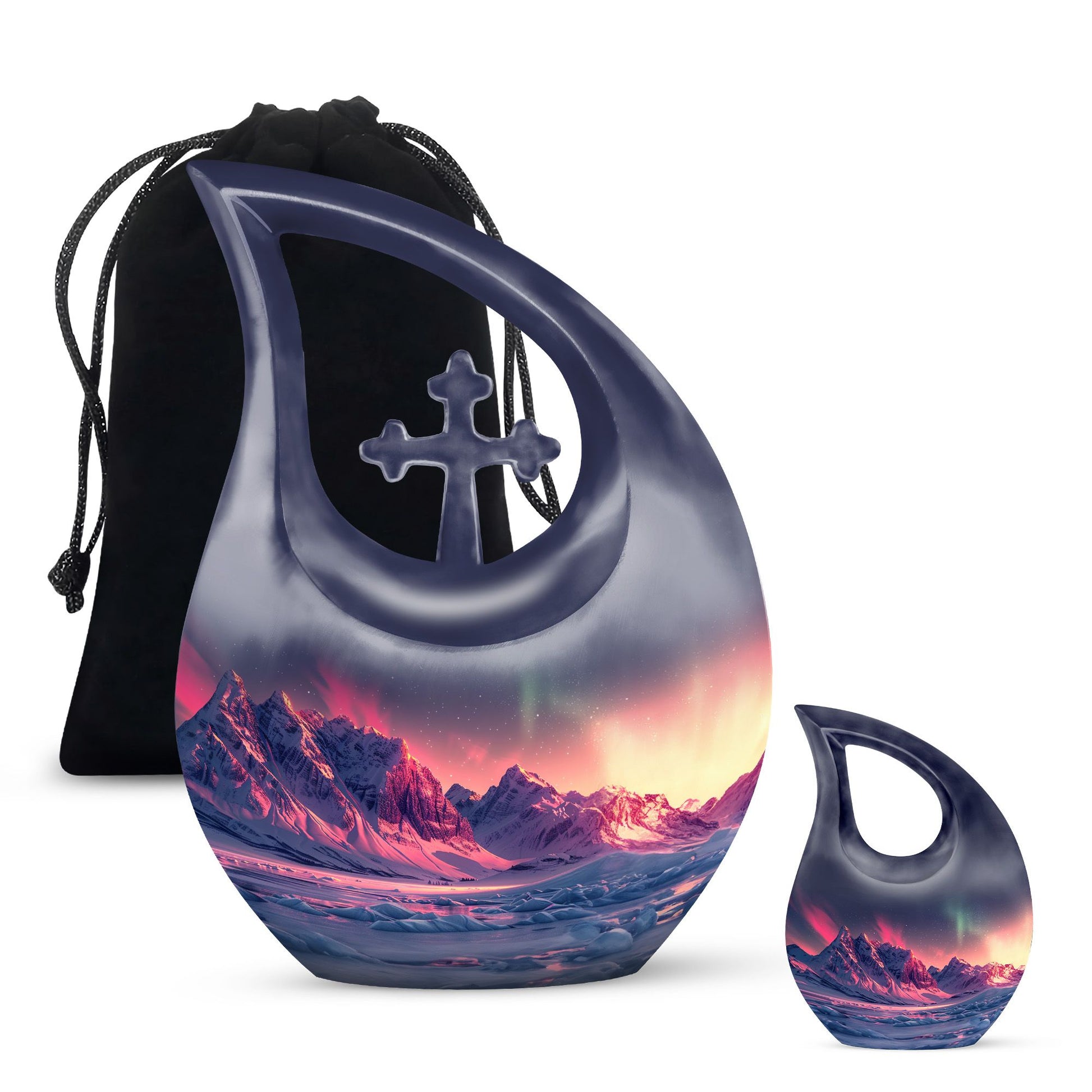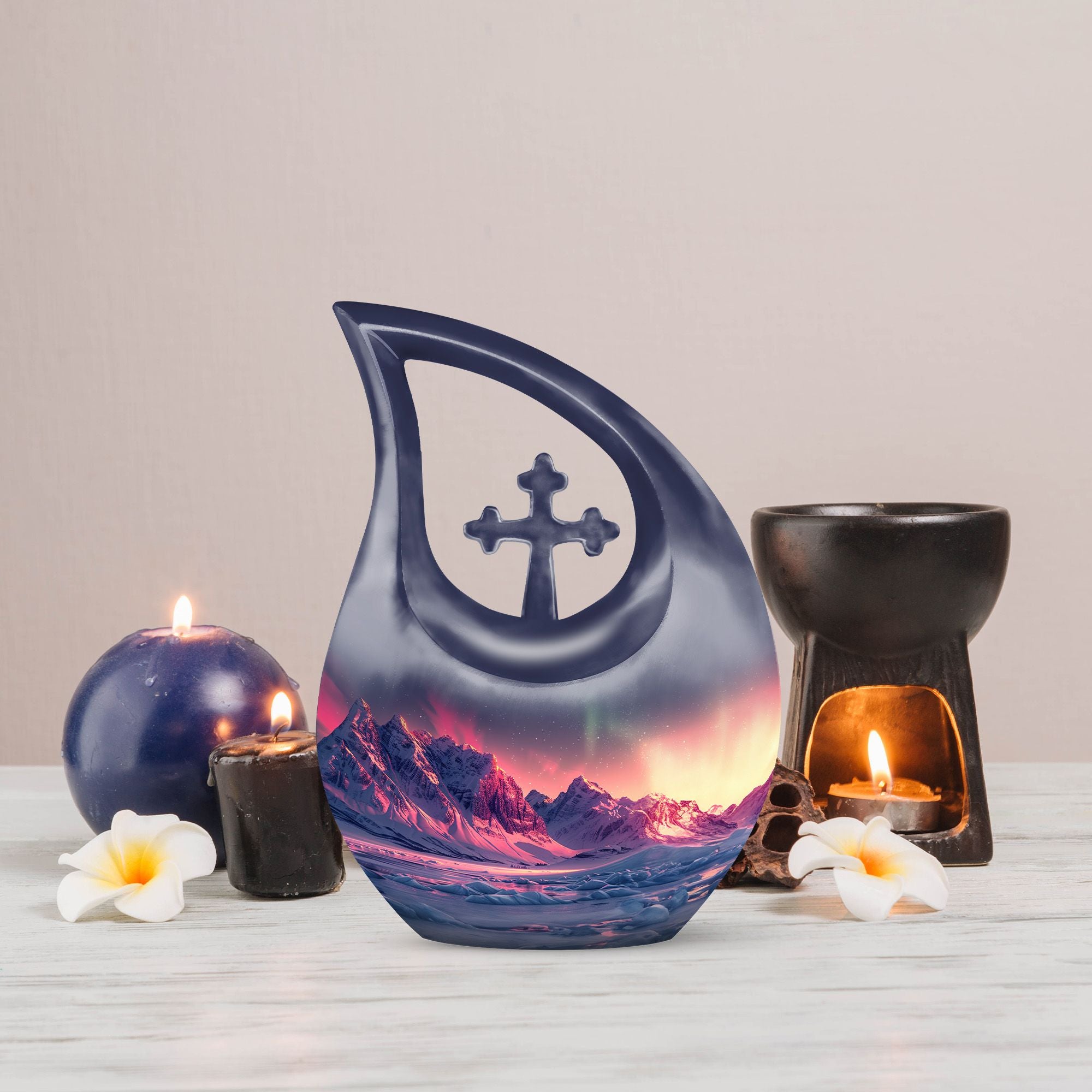 Expertly handcrafted from durable aluminium, this urn combines artistry and strength, making it an ideal choice for those seeking cremation urns large, large decorative urn styles, or a high-capacity cremation urn adult large. Its smooth finish, vivid mountain sunset artwork, and secure screw-top lid ensure both beauty and protection. With a standard full-size capacity, it serves as a reliable large cremation urn for human ashes for home display or burial.