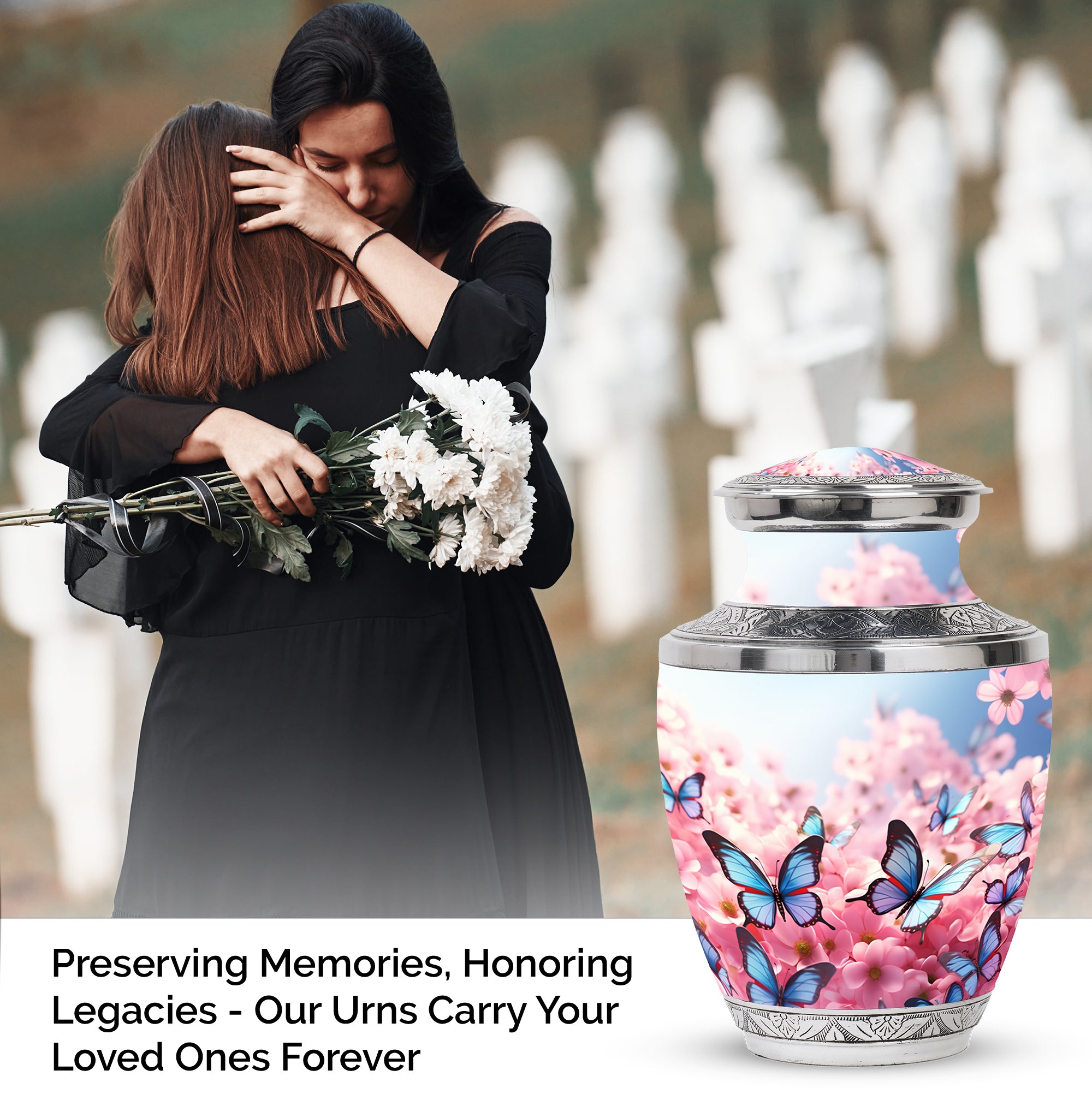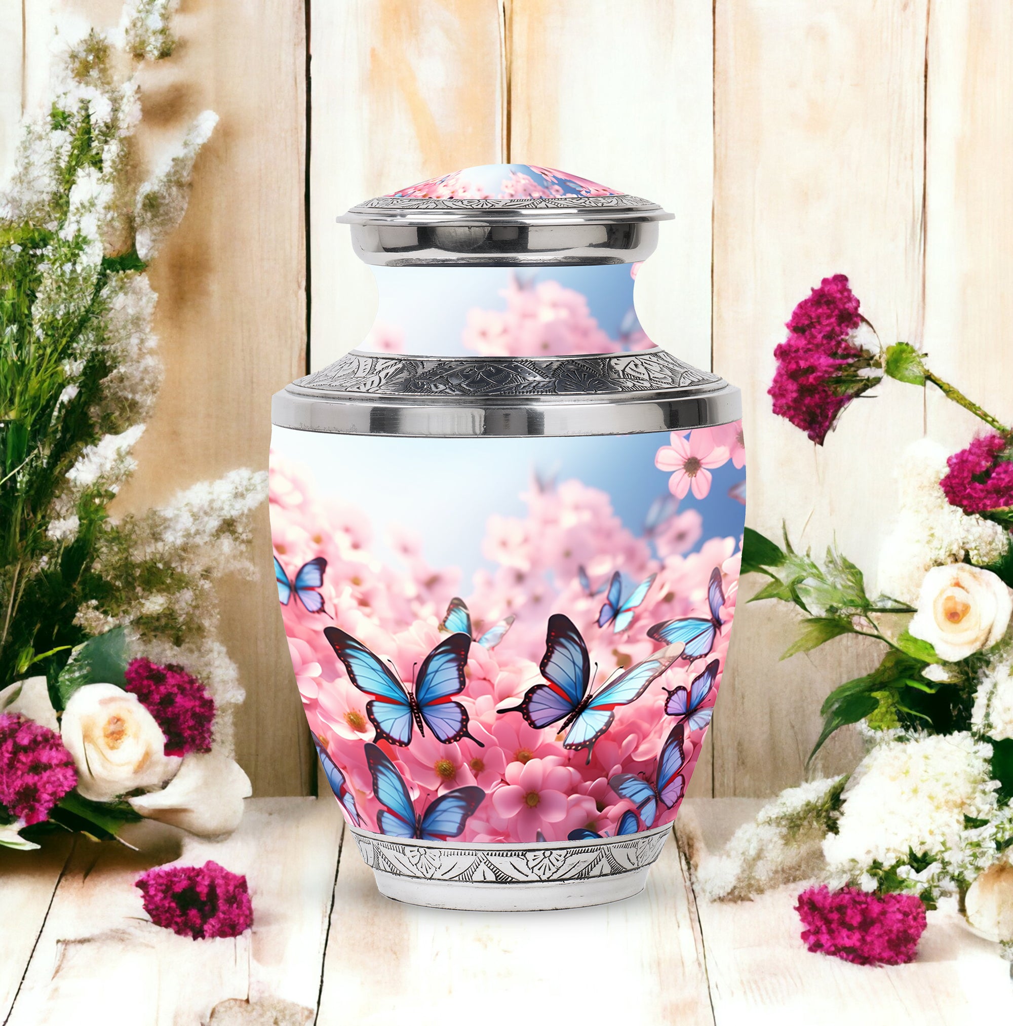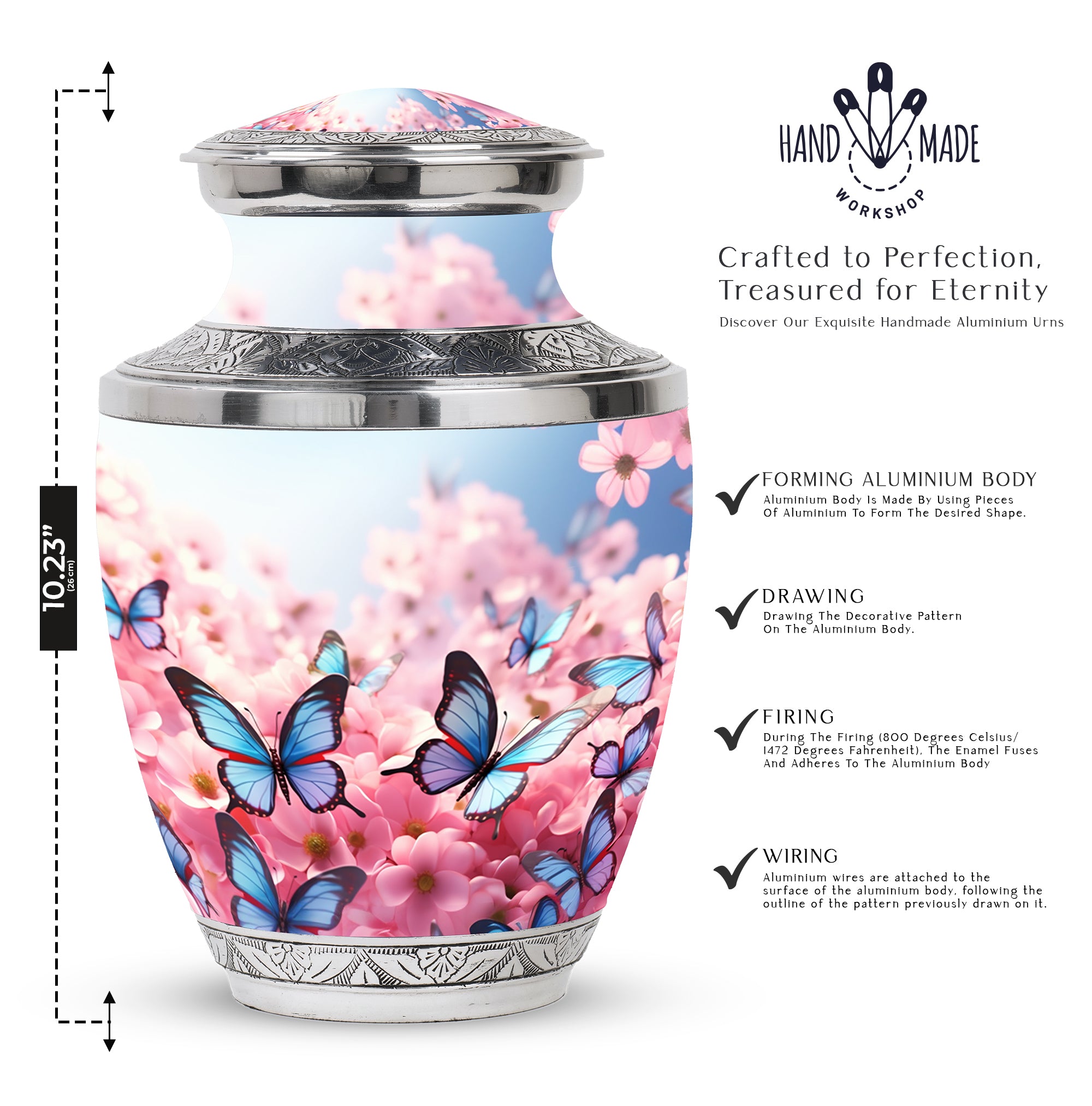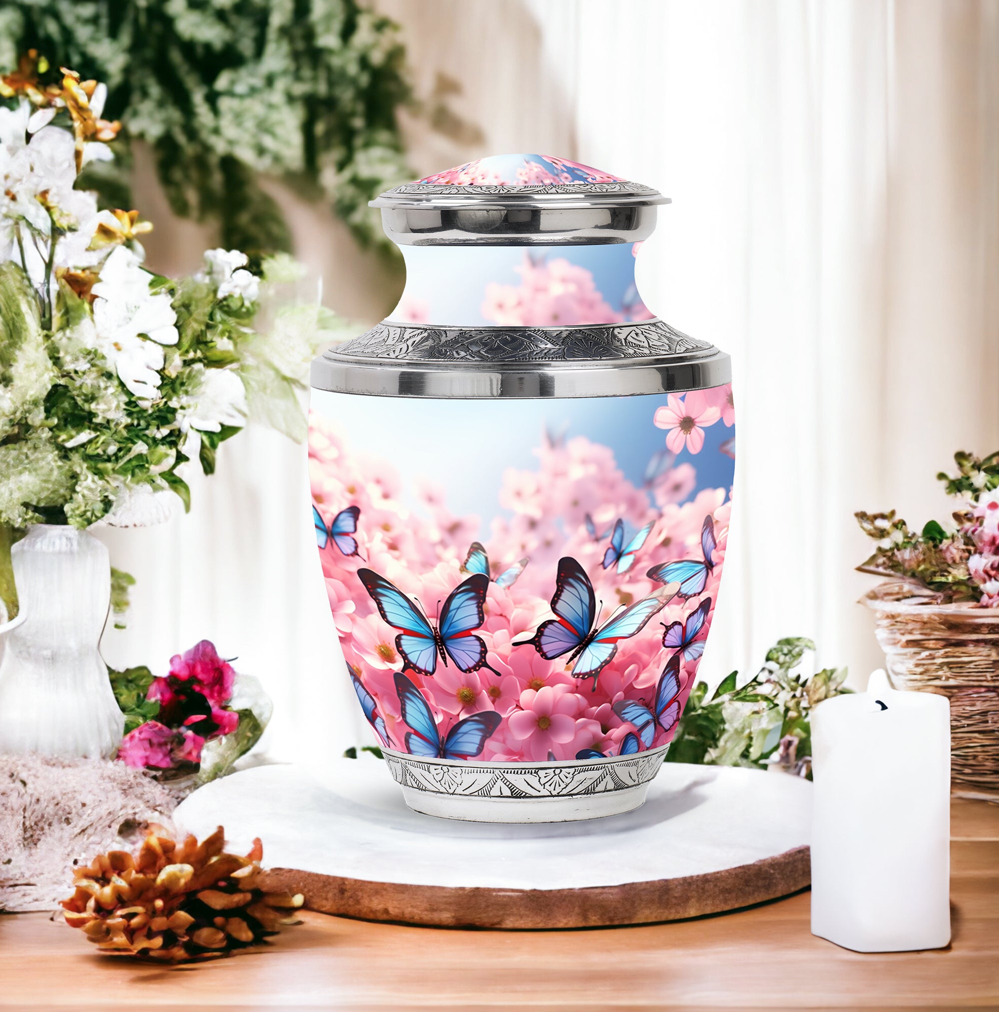 The Blue Butterfly Cremation Urn Tribute for Ashes combines the serenity of butterfly symbolism with the gentle beauty of pink floral patterns, creating a memorial that reflects peace, love, and eternal remembrance. This large cremation urn is crafted to last, designed with precision and care for families who seek both elegance and strength.
