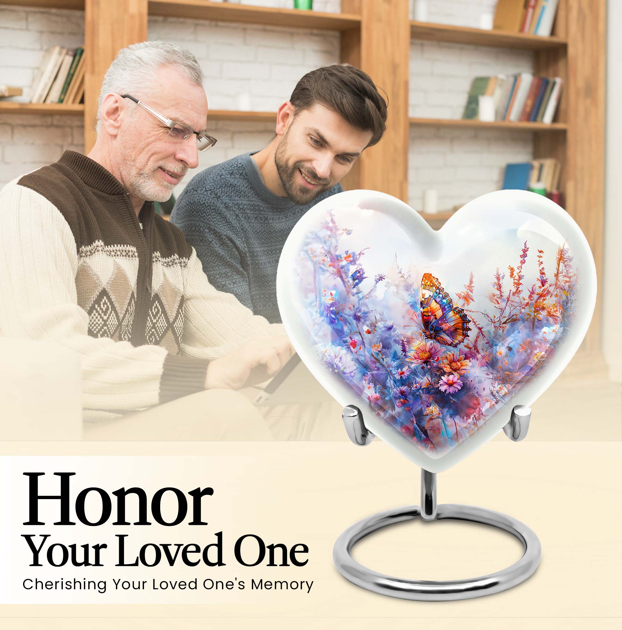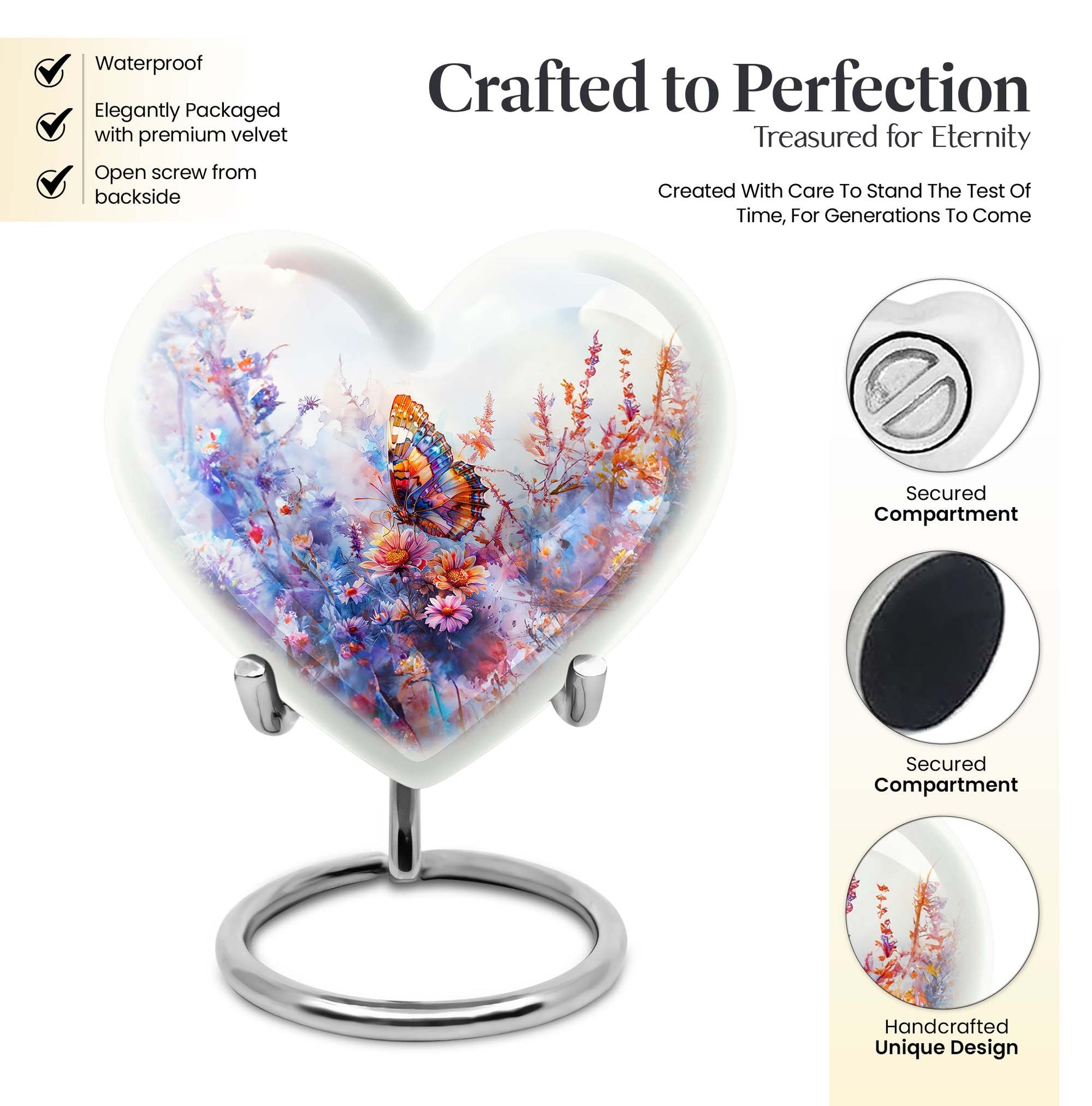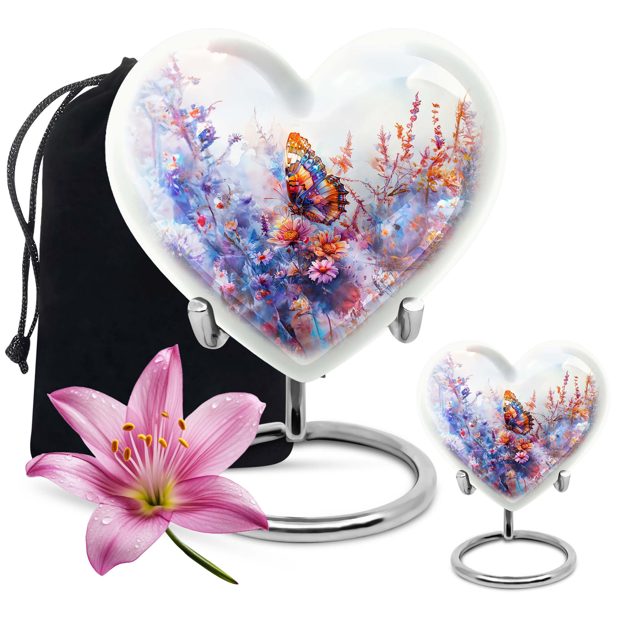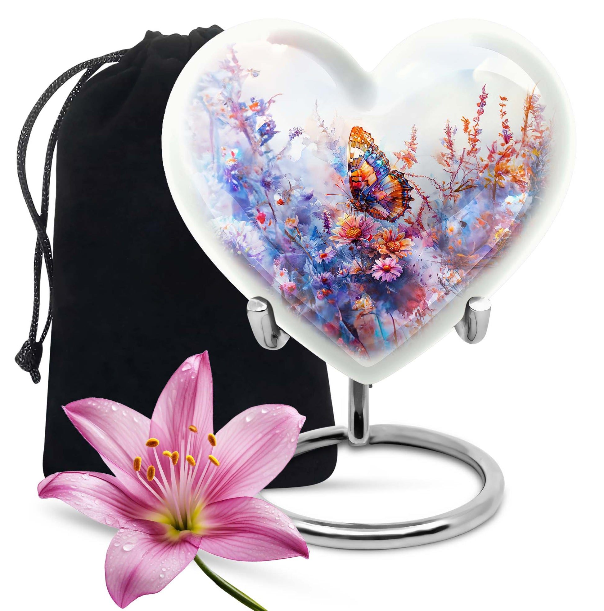 This exquisite heart-shaped butterfly urn is a beautiful way to cherish and safeguard your loved one’s memory. With vibrant artwork featuring butterflies and wildflowers, it symbolizes peace, hope, and eternal love.