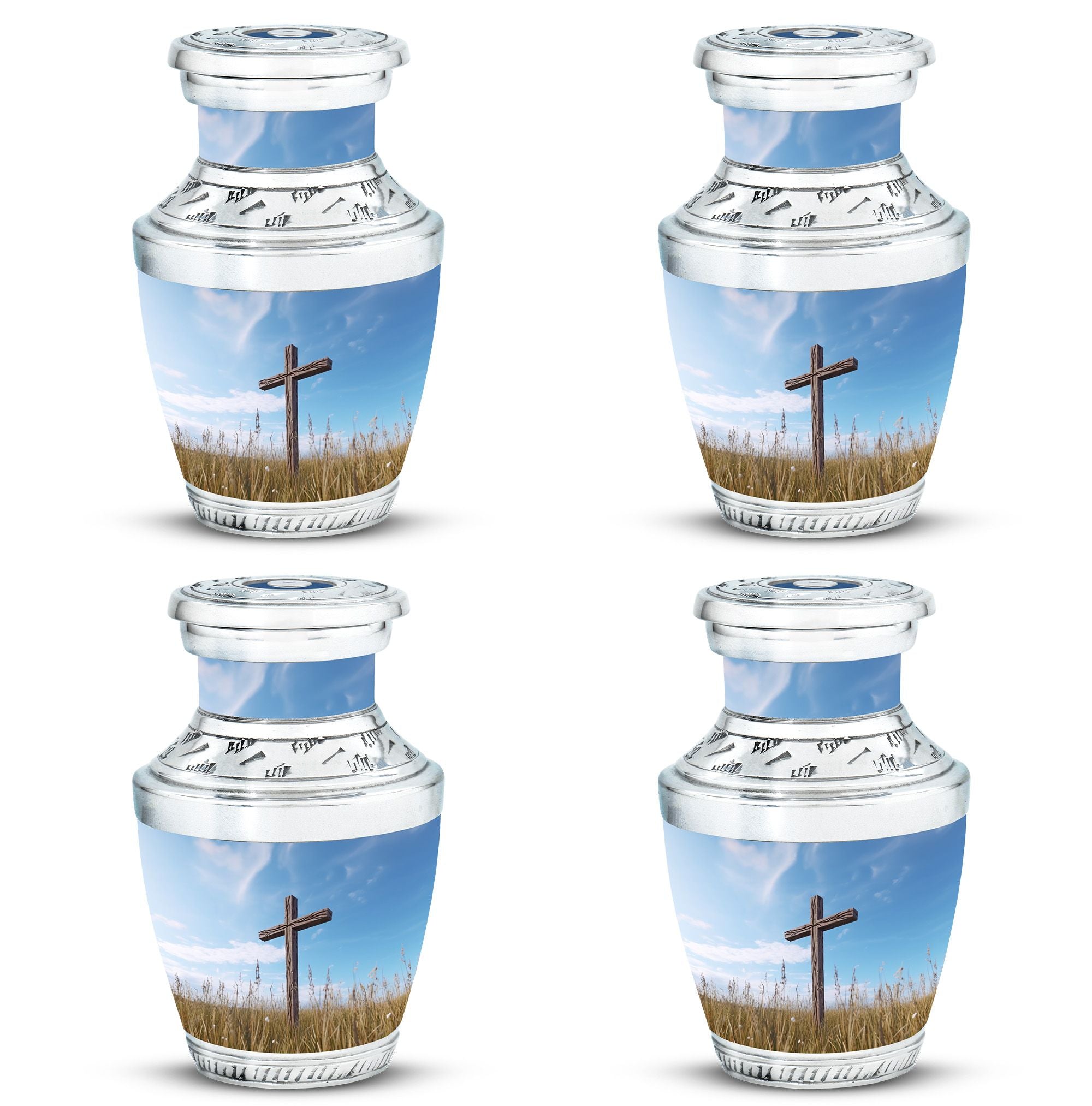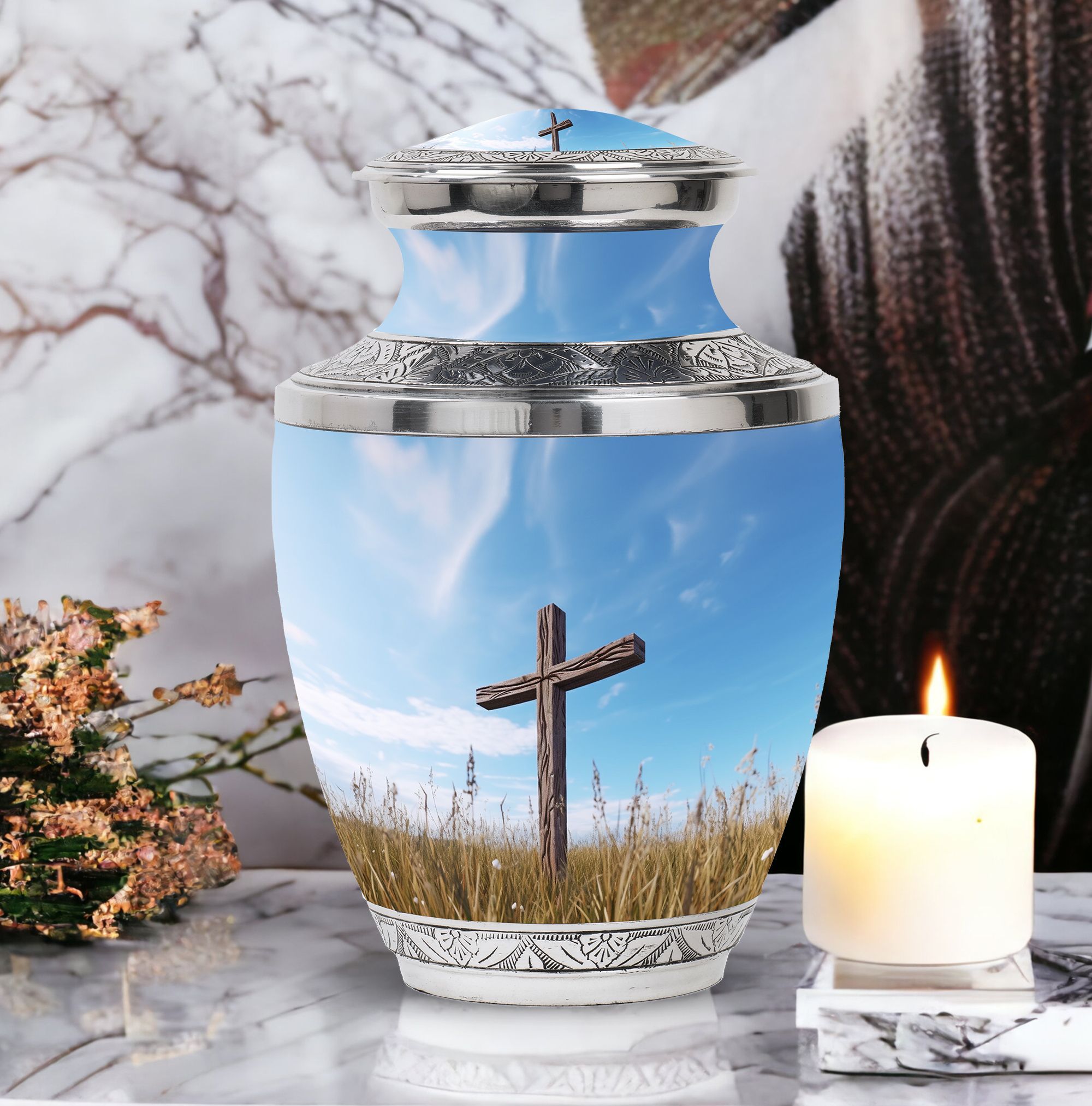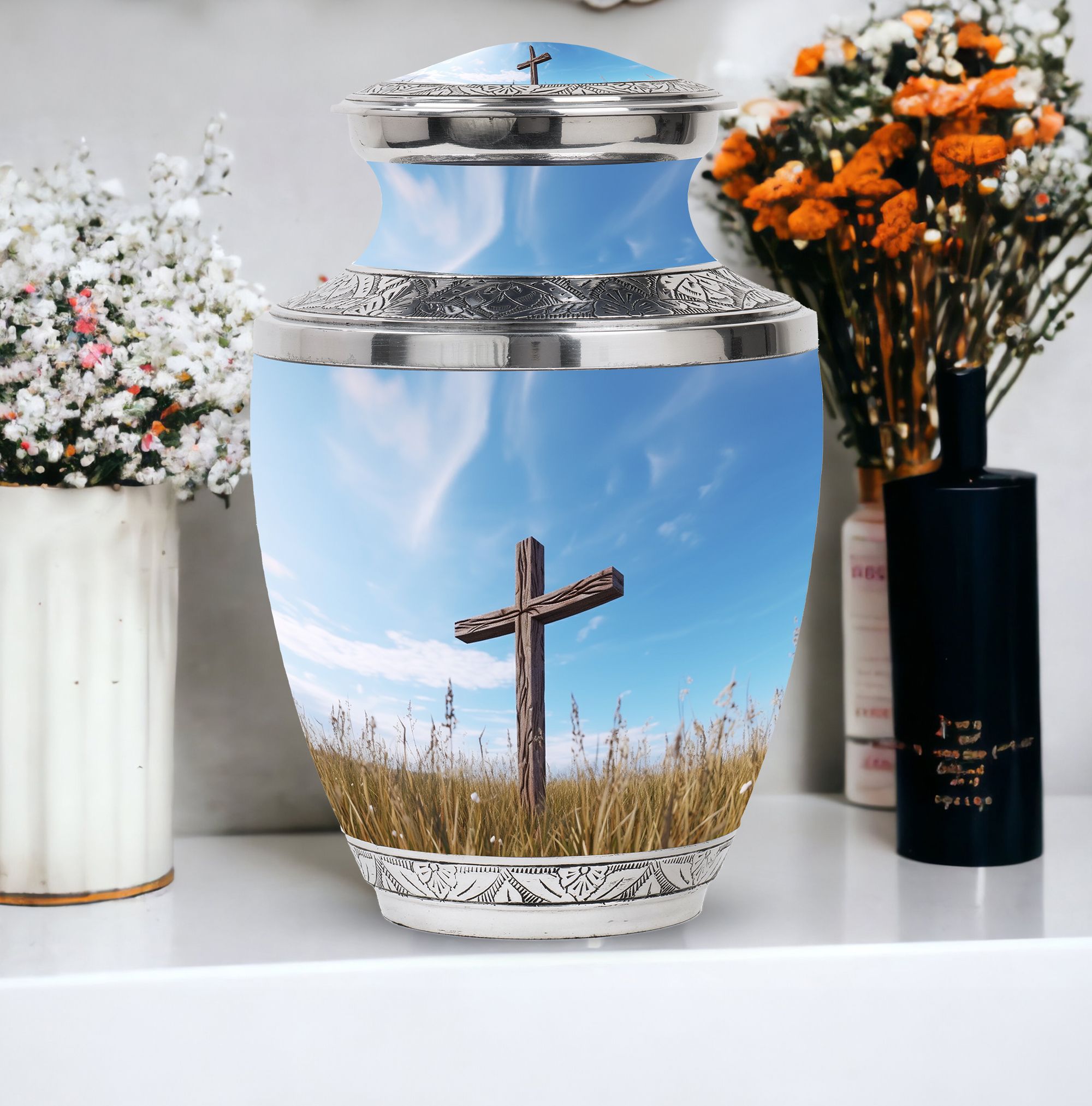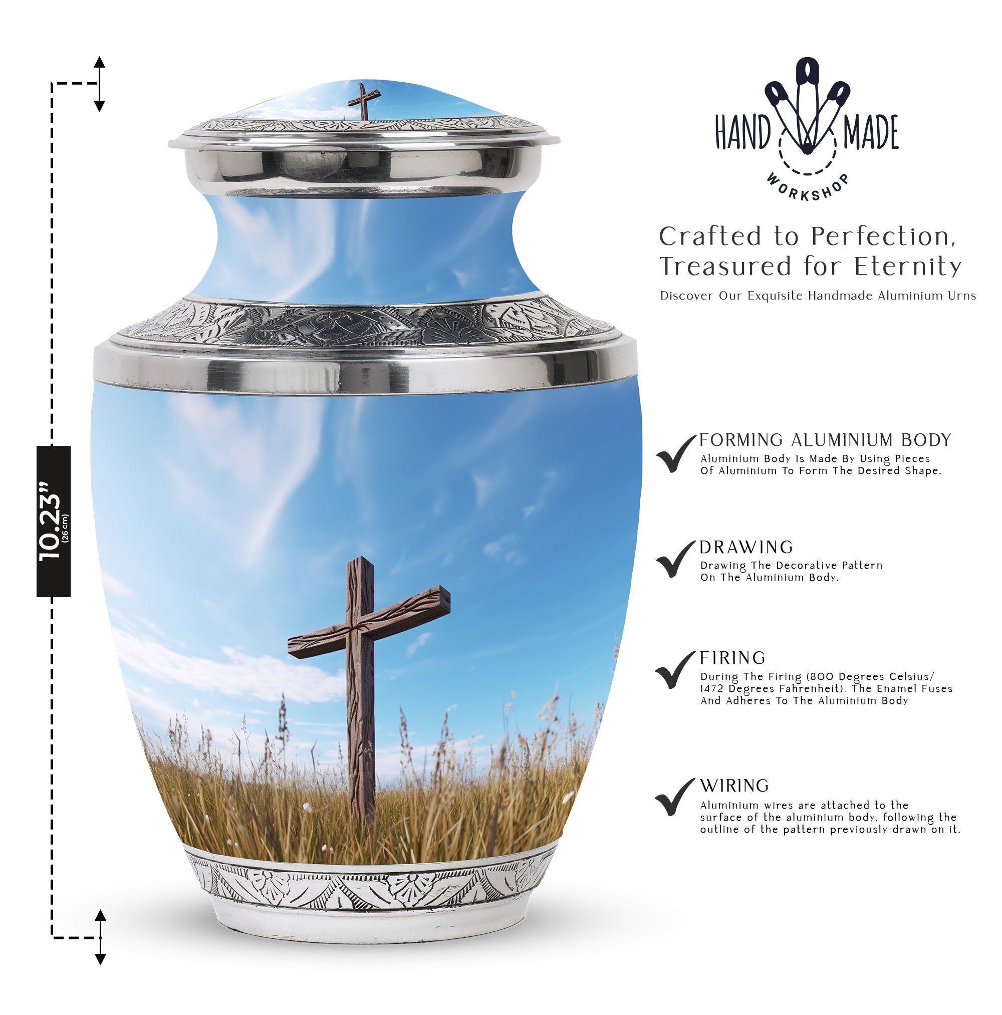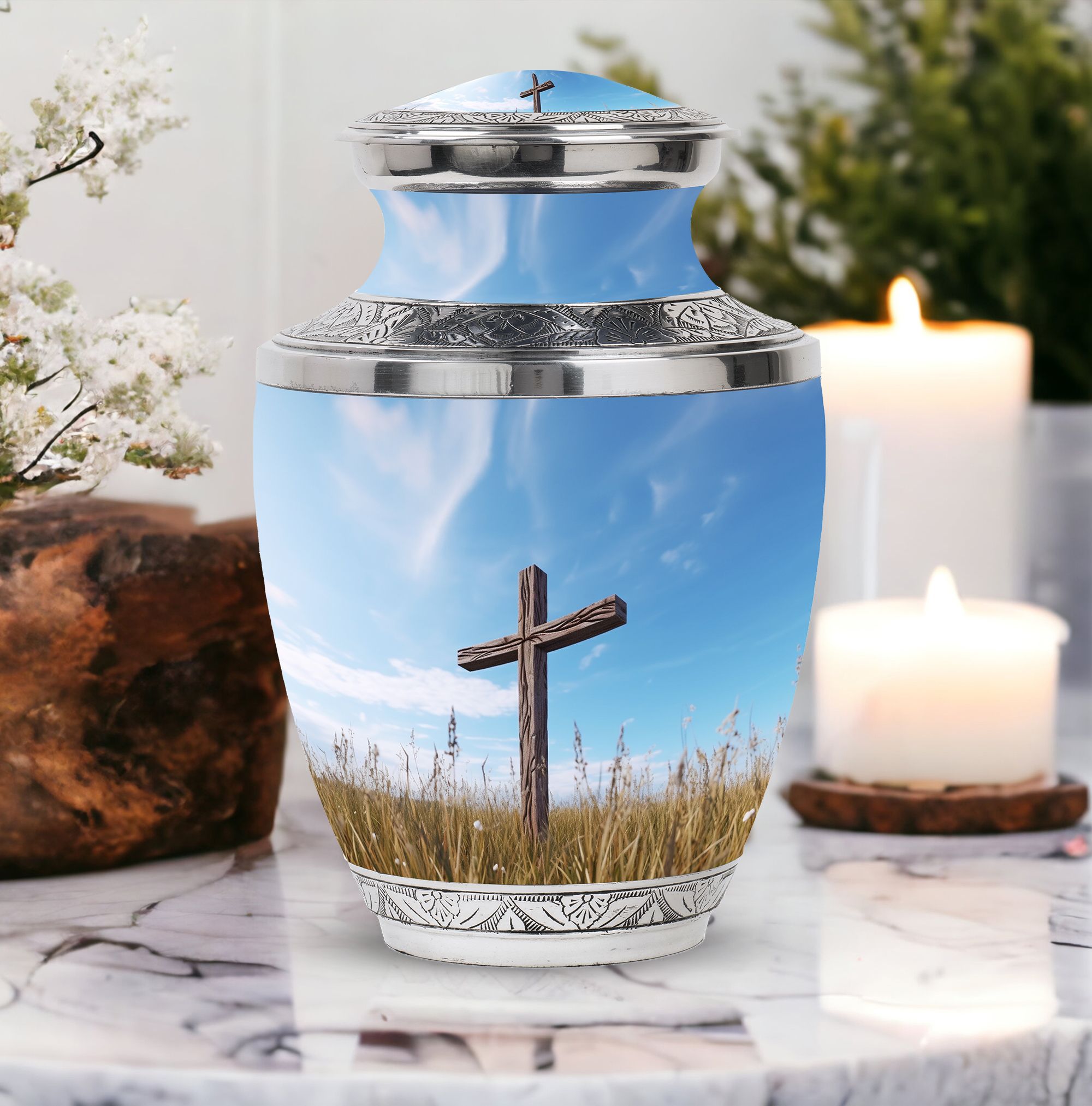 Impeccably crafted, the Jesus Christ Cross Cremation Urn represents a dignified and soulful way to honor a life lived with faith. This large urn, built with high-quality aluminium, reflects a comforting solidity at an approximate weight of 3.3 pounds. Its classic design stands at a decent size of 10 inches in height, with an ability to contain approximately 200 cubic inches of ashes. Perfect for any resting place, this urn features a 3-inch size that is both compact and emblematical. Personalized Urns like this offer an additional unique service: the option to customize this sacred memorial with engraved names. Furthermore, its packaging is just as serene and respectful, arriving with a velvet pouch to gently house the ashes. This Memorial Ceremony Supplies product makes a fitting tribute for ceremonial needs or as a Decorative Urn for Ashes. Recognize a spiritual journey, remembrance and love with this heartwarming cremation urn.