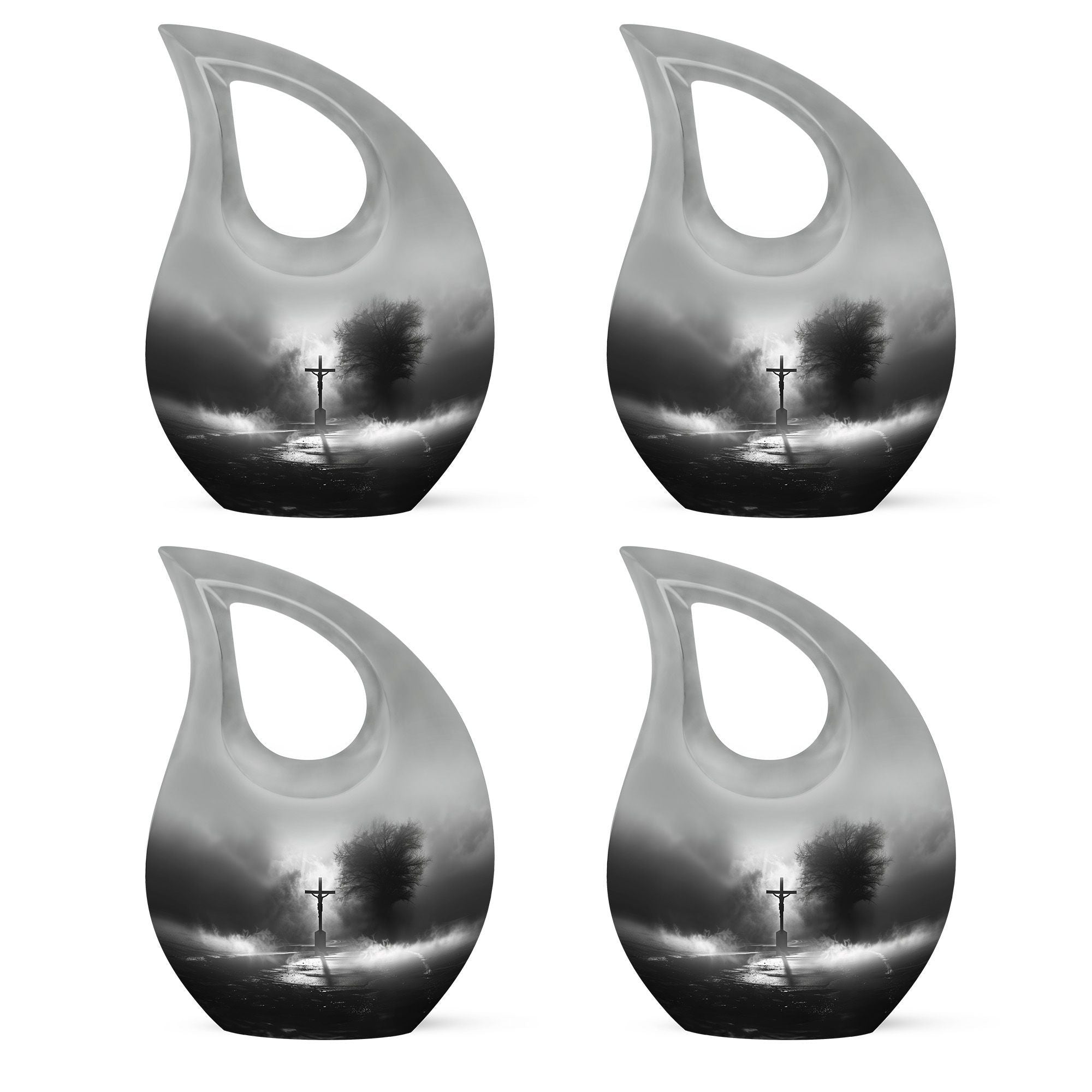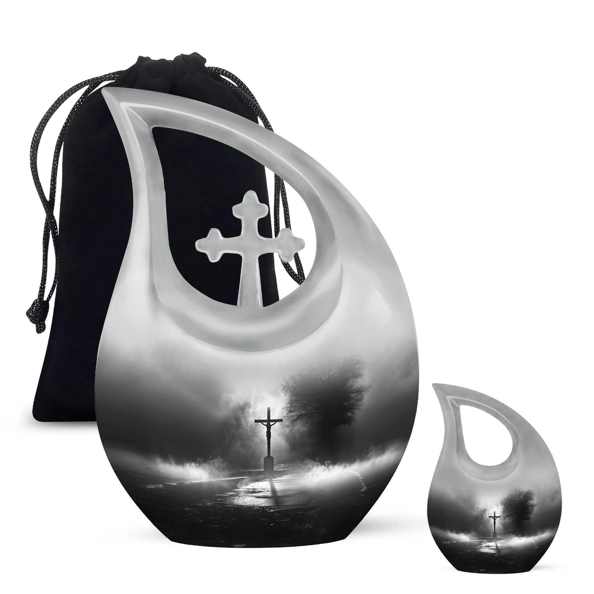 Experience the profound sense of reverence and peace with our precious Jesus Themed 10-inch aluminium urn. This solemn and dignified cremation keepsake, with its impressive Cross Drop design, serves as a respectful remembrance of your loved one. Weighing in at a solid 3.3 pounds and measuring 10 inches in height, it offers a substantial capacity of up to 200 cubic inches. Each large urn comes with a thoughtful velvet pouch, ideal for secure containment of the ashes. To make this memorial urn even more special, you can personalize it with engraved names, adding an exceptional touch to the tribute. This exquisite cremation urn, aside from being a fitting tribute to your loved one's memory, also serves as a beautiful decorative piece. Notably suitable for use as small urns for human ashes or keepsake urns for human ashes, it can also be used depending on other requirements, be it urns for cremation ashes or as a meaningful item among the wide array of cremation urns for sale.