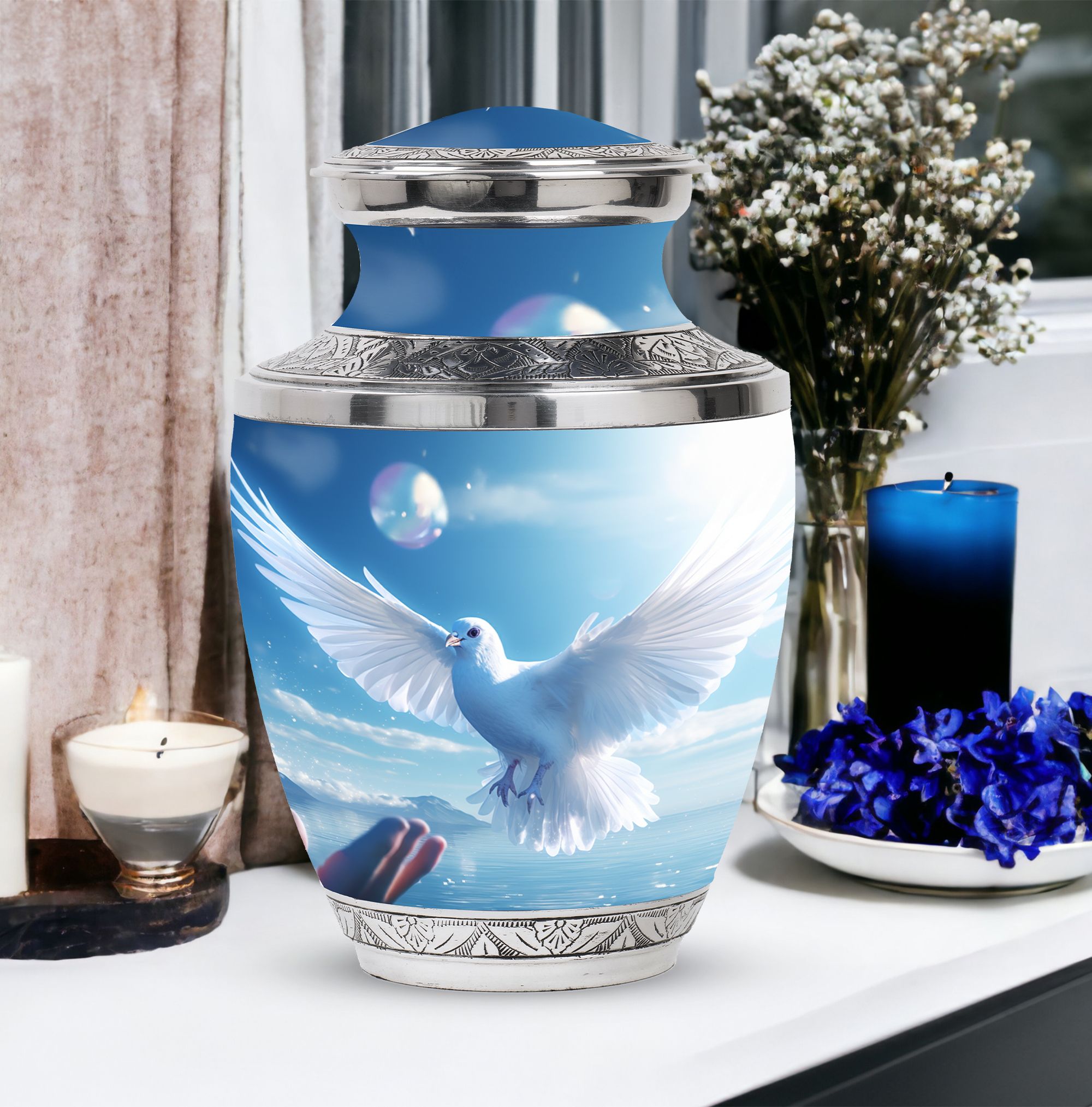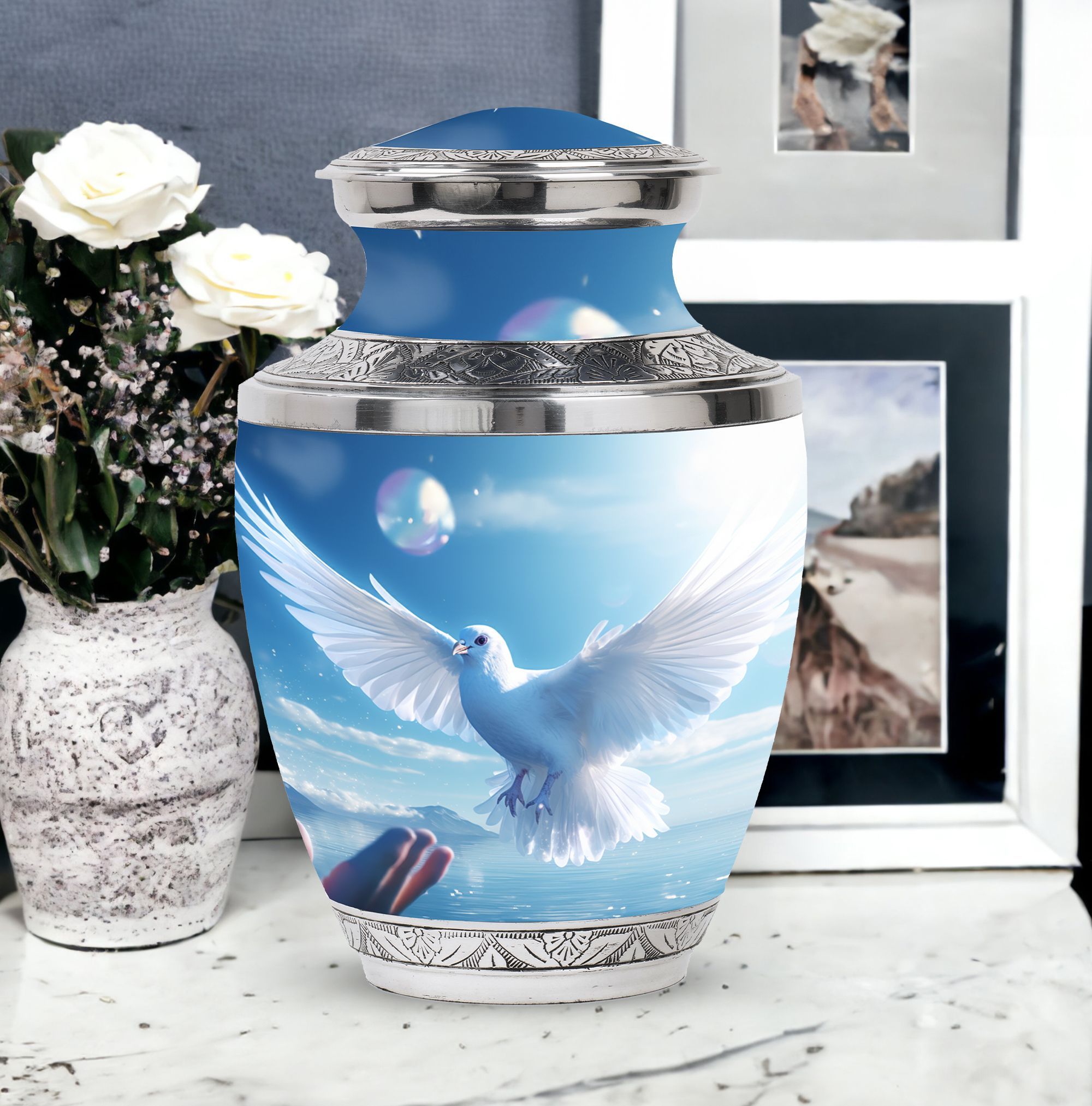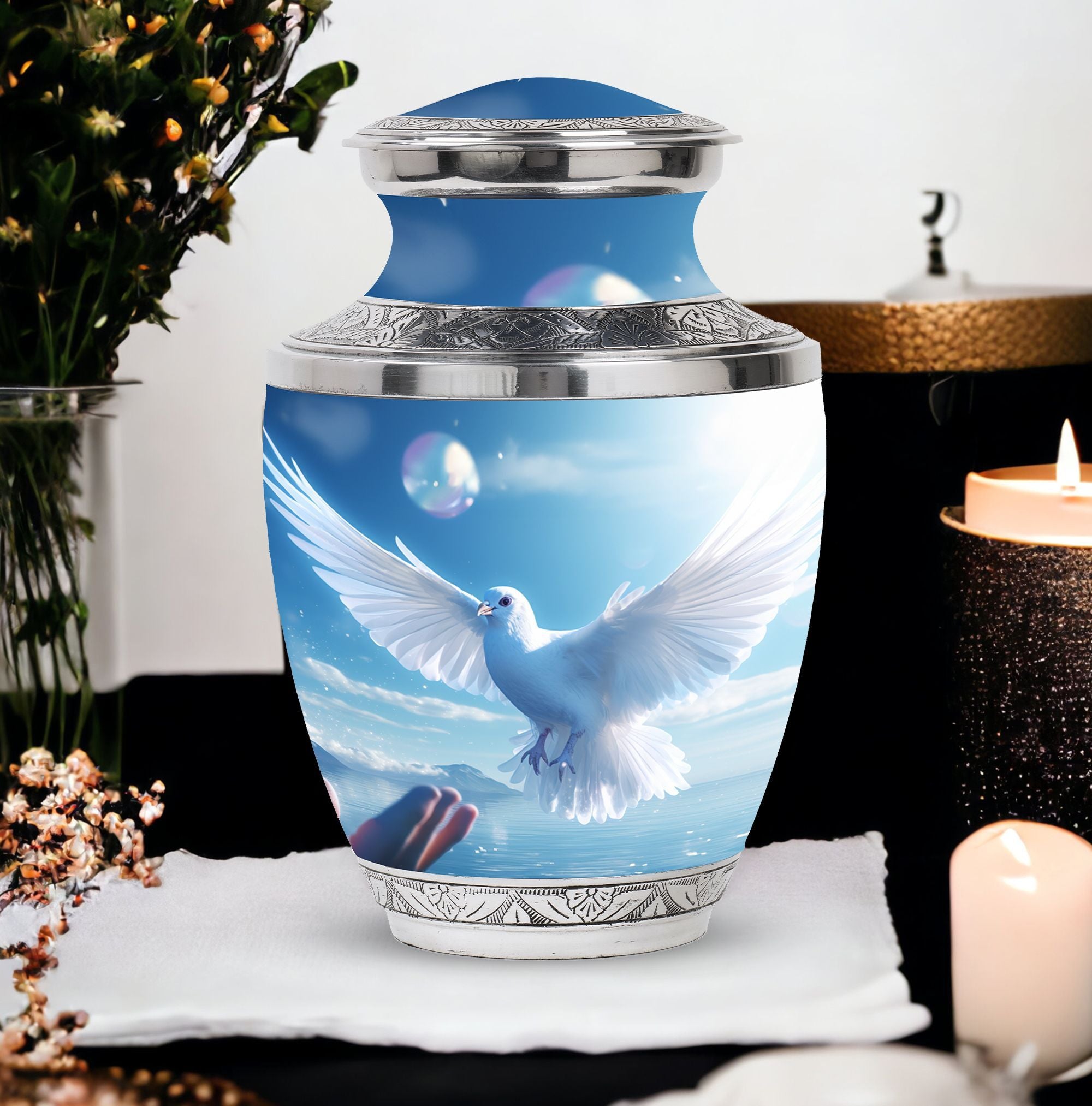 Our Dove Urns for Human Ashes provide a solemn and refined resting place for your departed loved ones. Customizable and constructed with durable Aluminium, these burial urns reassure the durability and quality to withstand decades. These large urns, weighing 3.3 pounds and standing 10 inches high, are capable of holding 200 cubic inches of ashes. The classic urn design brings a touch of elegance and respectability. Each purchase is complimented with a velvet pouch, ensuring safe and respectful containment of the remains. These particular urns, which are uniquely suited to fit any home's decor or burial sites, can be personalized with engraved names, making them even more special and significant. This 3-inch urn is a fitting tribute for your loved ones and an elegant addition to any memorial ceremony. Perfect for adults and seniors. With keywords like 'memorial urns', 'urns for ashes for dad', 'urns for human remains', and 'decorative urns for ashes', our product caters to various search terminologies commonly used by consumers in the Memorial Ceremony Supplies category.