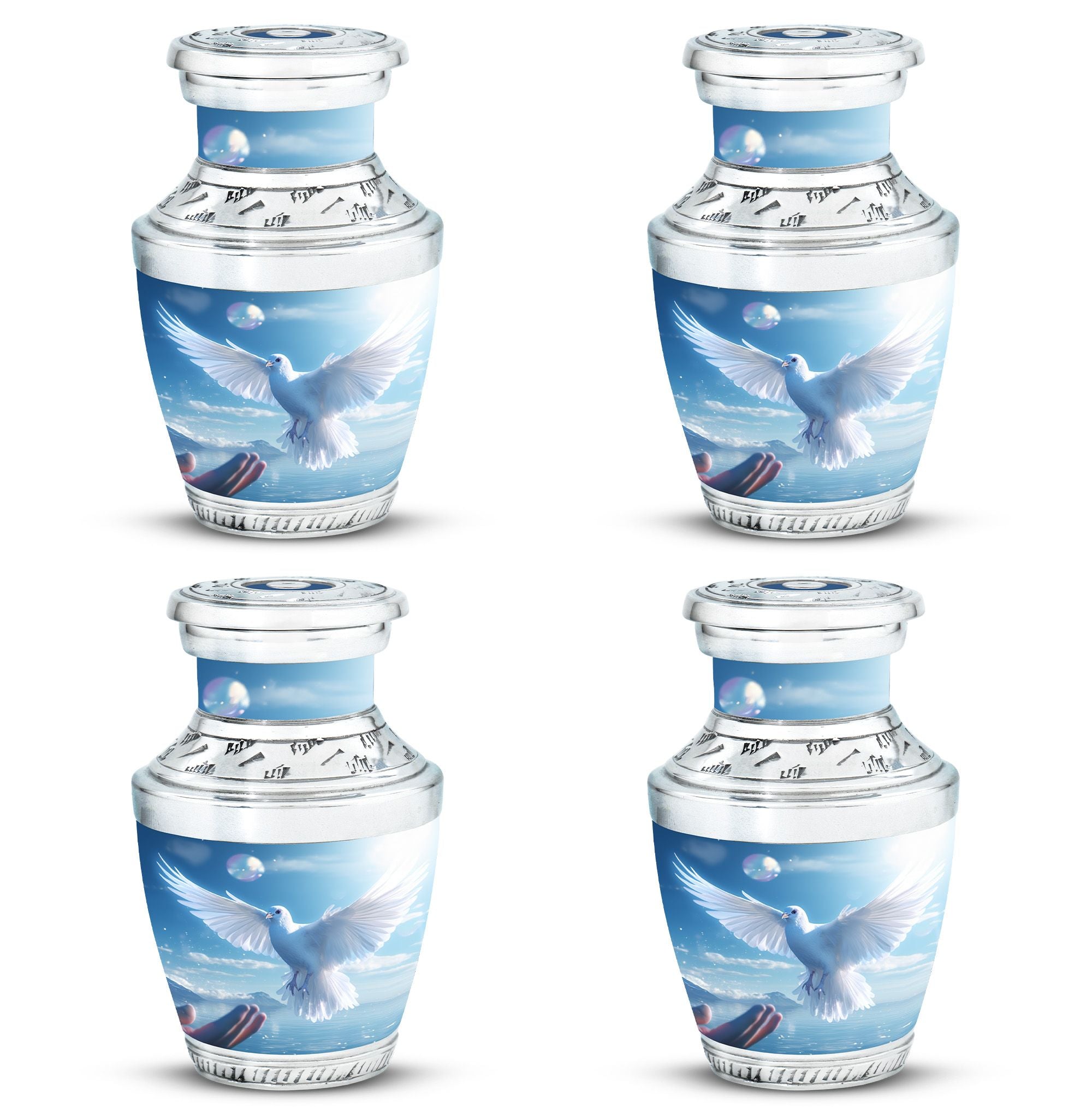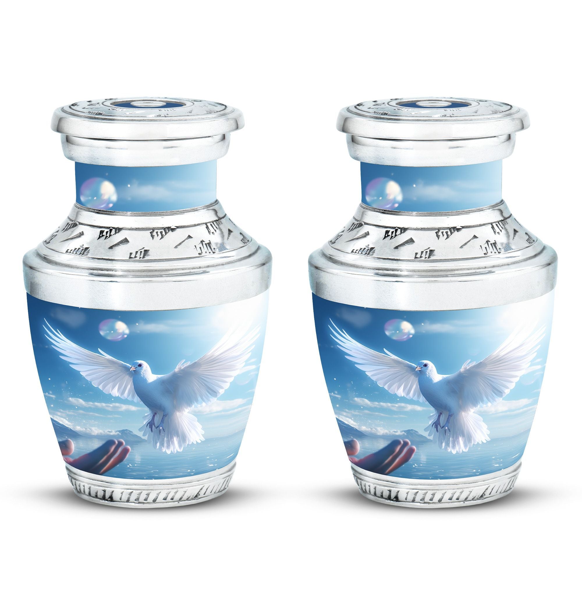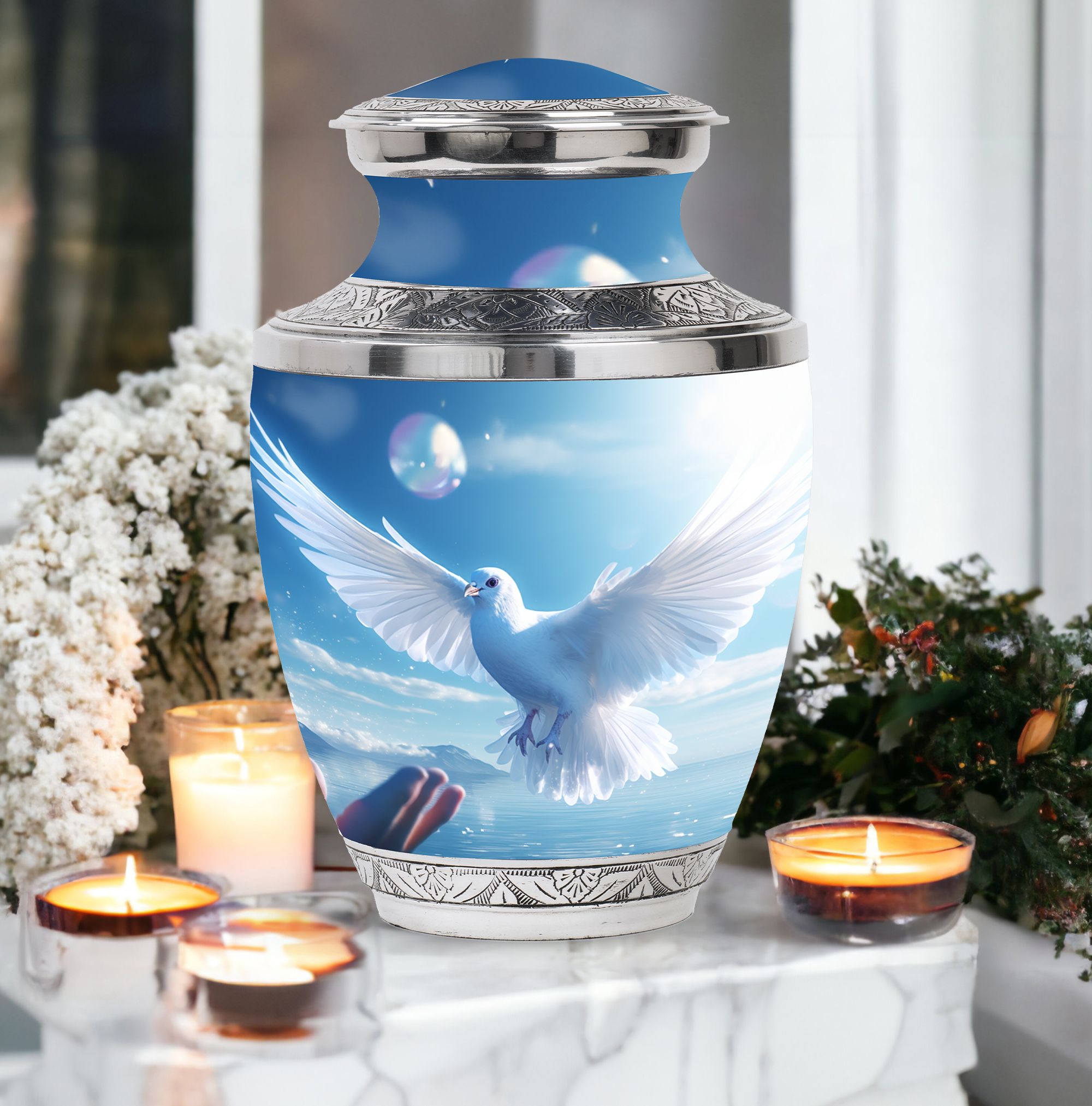Our Dove Urns for Human Ashes provide a solemn and refined resting place for your departed loved ones. Customizable and constructed with durable Aluminium, these burial urns reassure the durability and quality to withstand decades. These large urns, weighing 3.3 pounds and standing 10 inches high, are capable of holding 200 cubic inches of ashes. The classic urn design brings a touch of elegance and respectability. Each purchase is complimented with a velvet pouch, ensuring safe and respectful containment of the remains. These particular urns, which are uniquely suited to fit any home's decor or burial sites, can be personalized with engraved names, making them even more special and significant. This 3-inch urn is a fitting tribute for your loved ones and an elegant addition to any memorial ceremony. Perfect for adults and seniors. With keywords like 'memorial urns', 'urns for ashes for dad', 'urns for human remains', and 'decorative urns for ashes', our product caters to various search terminologies commonly used by consumers in the Memorial Ceremony Supplies category.