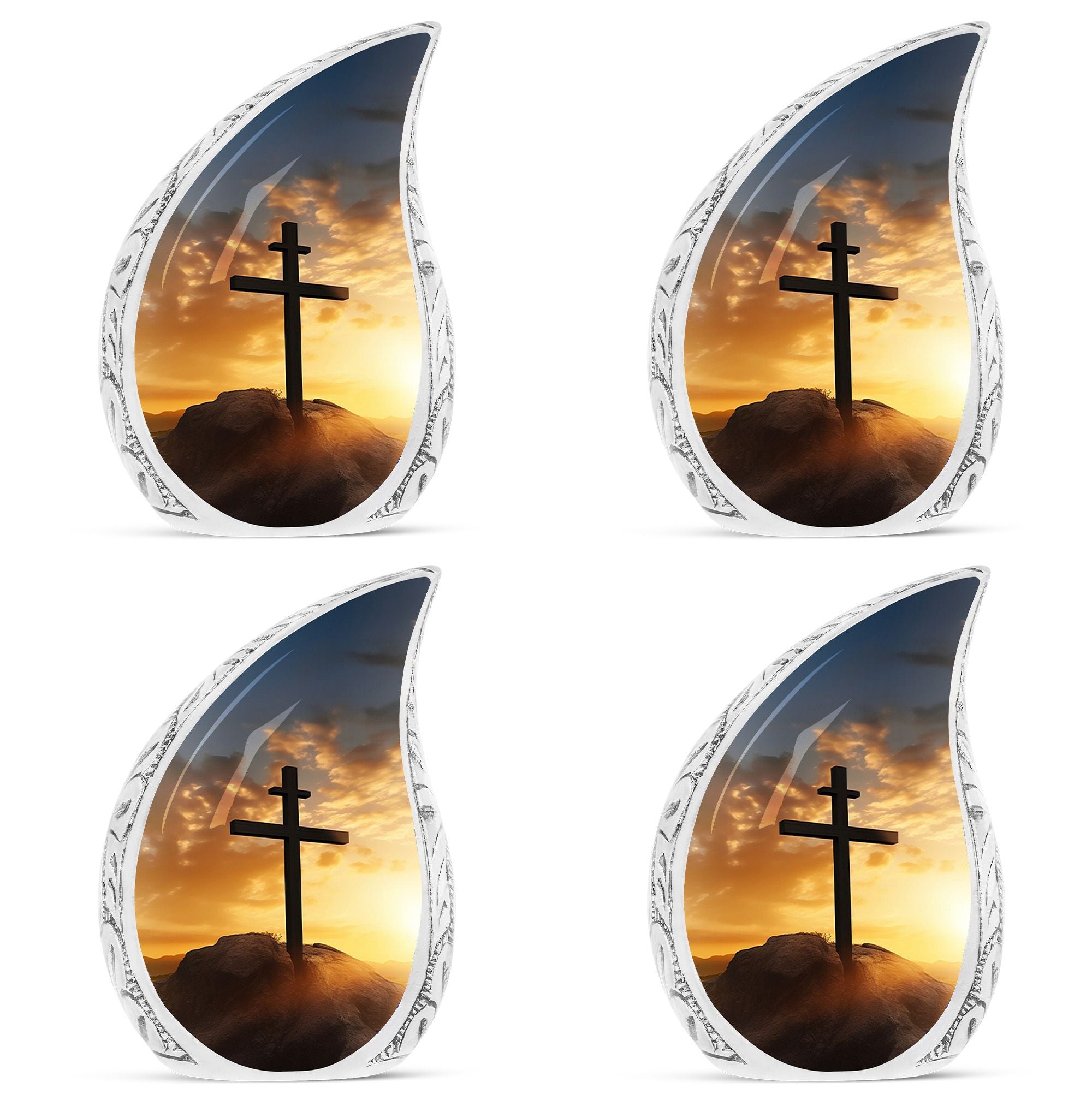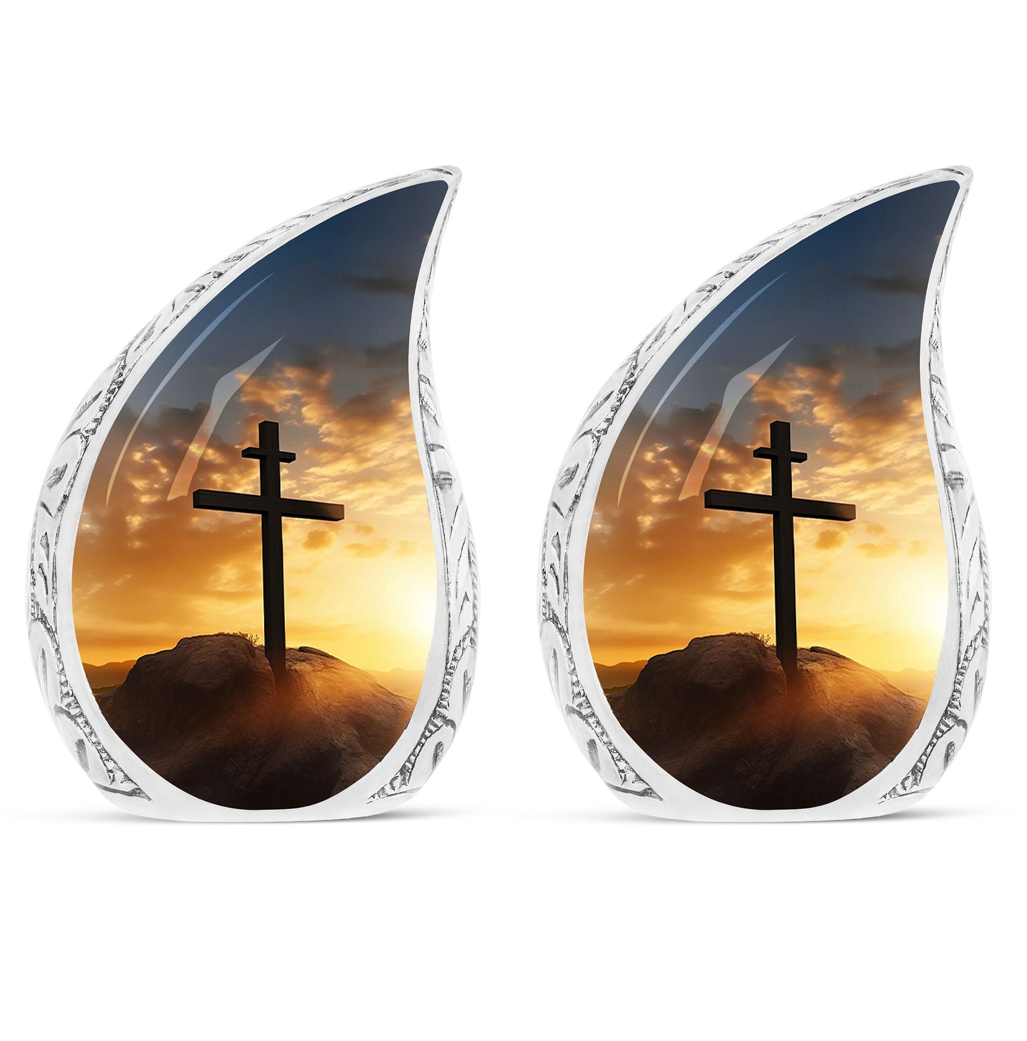 Honor and remember your departed loved one with our meticulously crafted 'Crucifixion of Jesus Christ Urn for Human Ashes.' Evoking a deeply spiritual motif, this exquisite keepsake urn is constructed from high-grade aluminium, giving it both a visual and physical weight that is both comforting and substantial. With a size of 3-inches, the urn weighs a reassuring 3.3 pounds and stands 10 inches tall, offering ample space with a capacity of 200 cubic inches. Our package includes a tastefully crafted velvet pouch, offering a dignified final dwelling for the ashes of the dearly departed. Customization with personalized, engraved names is available, establishing a profound connection with the departed. This large, classic urn is designed to be a reverent, enduring memorial for cremated remains.