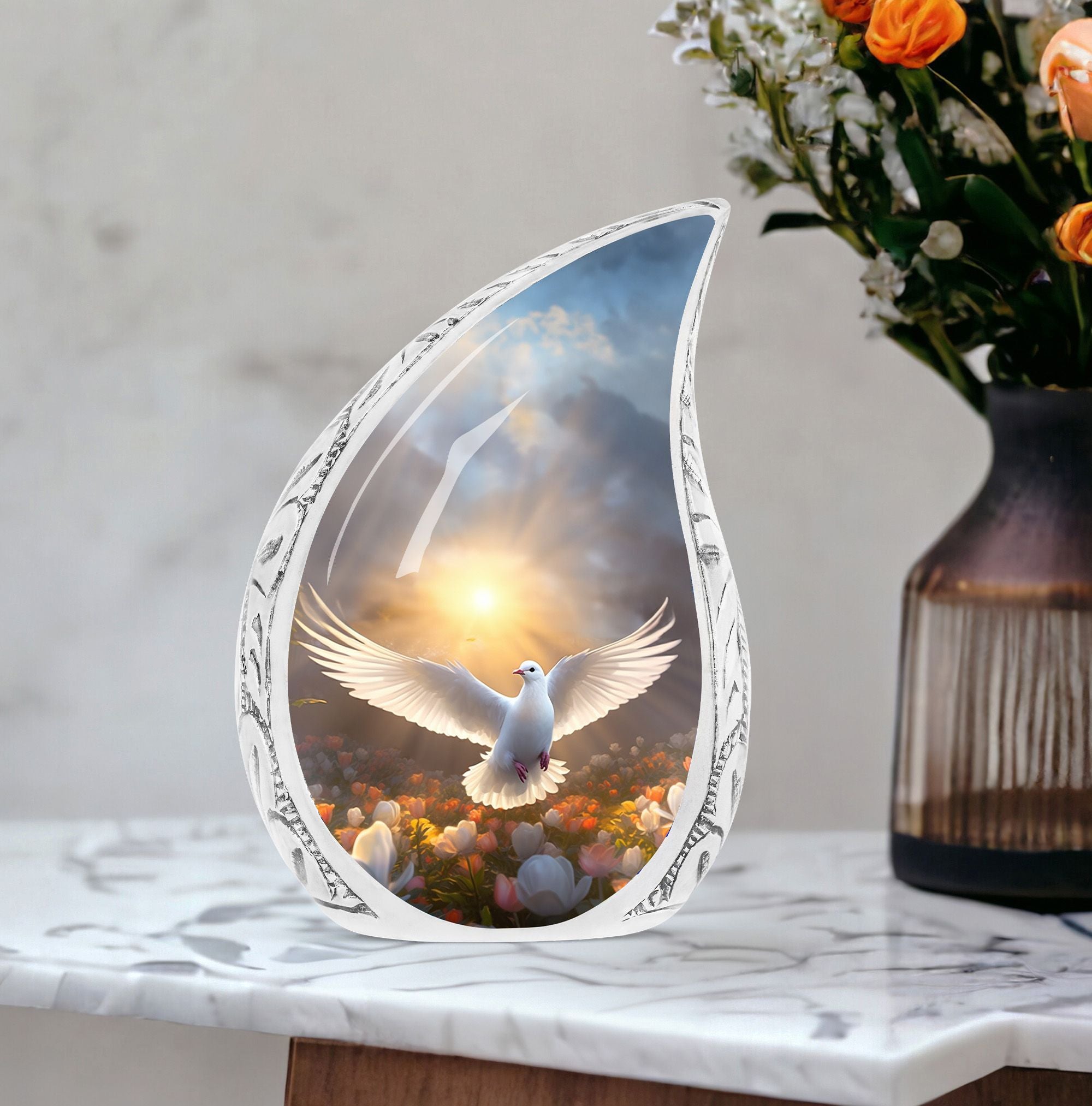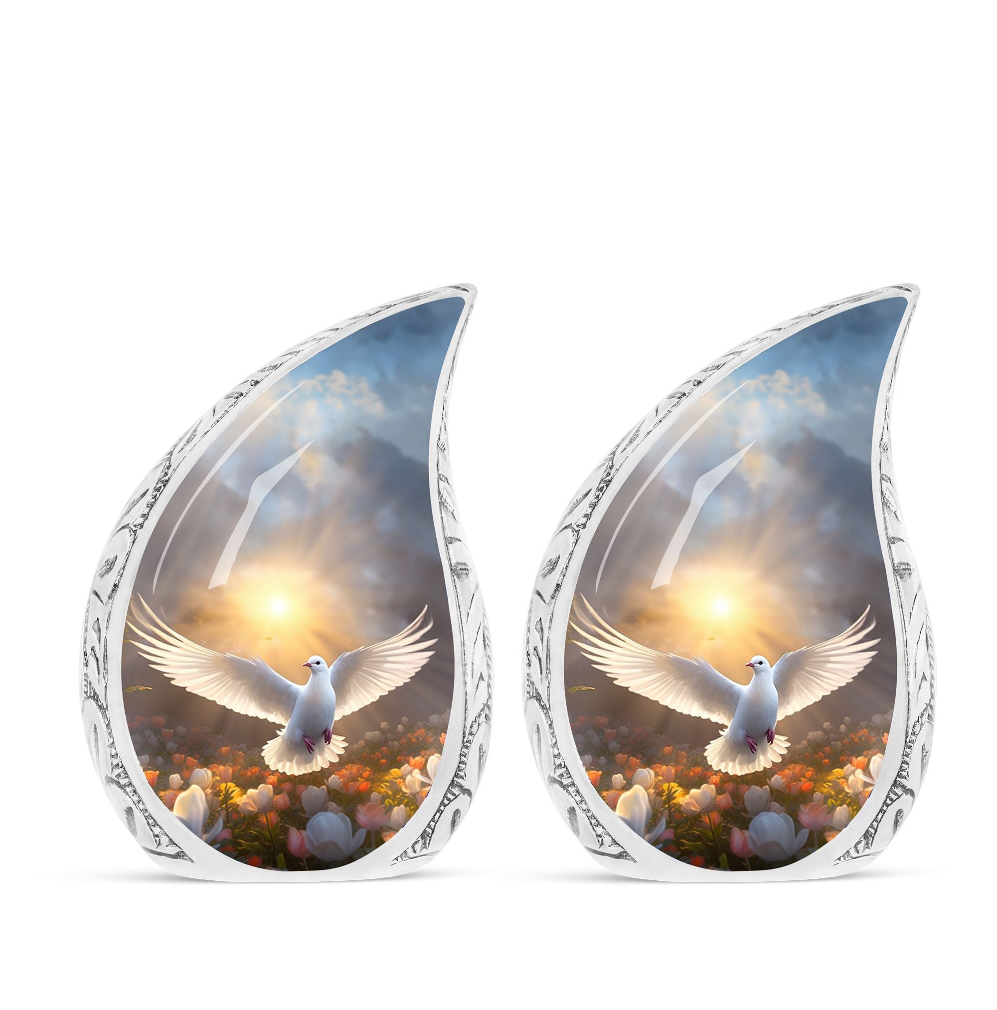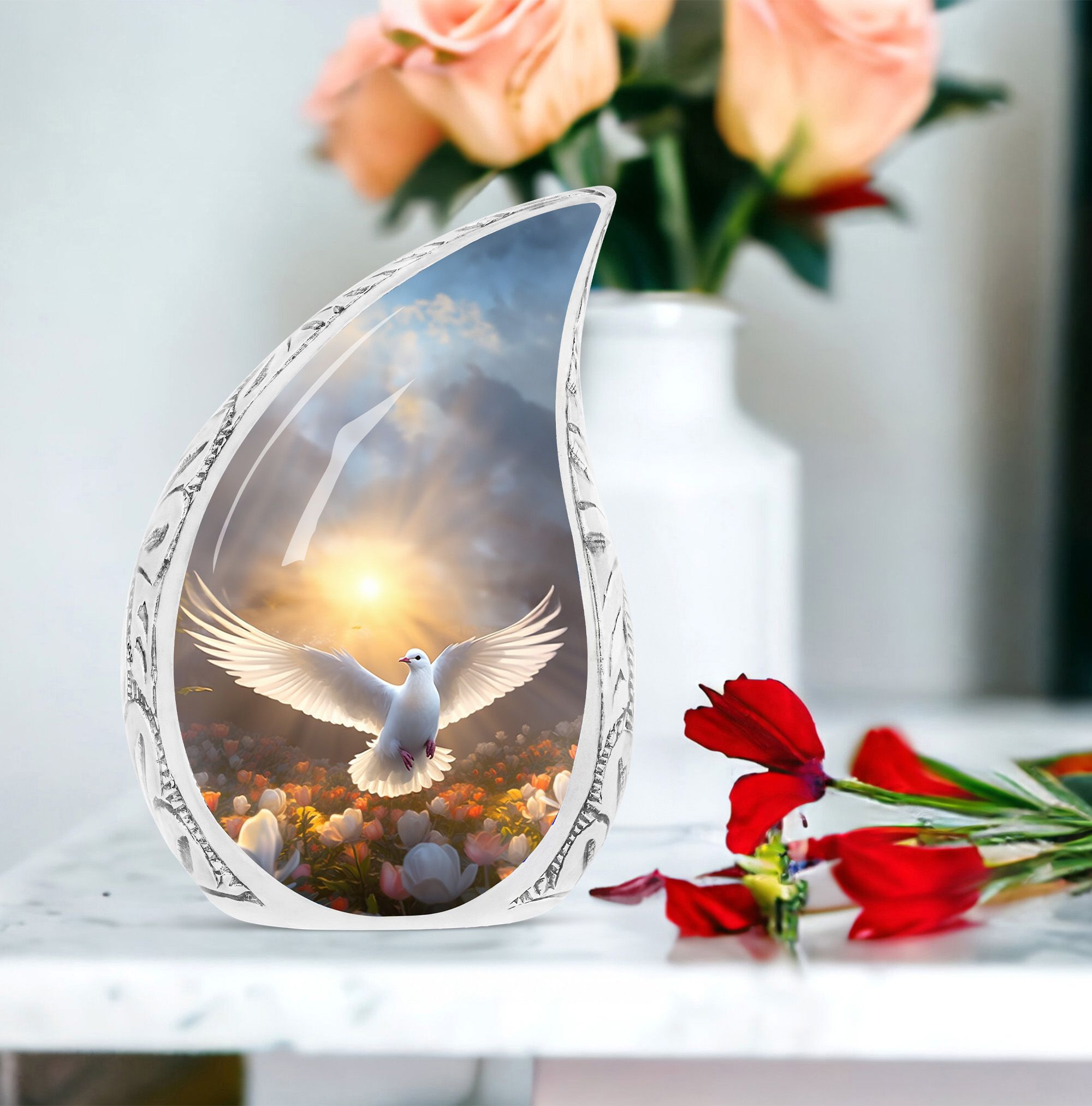 Presenting a Dove Memorial Cremation Urn that simply says, 'Sorry for your loss,' this large urn serves as a fitting repository for placing your loved ones' remains. Crafted from quality aluminum, this cremation urn is 10 inches tall and weighs 3.3 pounds, with a capacity of 200 cubic inches, making it large enough for ashes of any adult. The package includes a soft velvet pouch for the containment of ashes, further ensuring the sanctity and preservation of the remains. Our urn brings a unique level of customizability, offering the feature of personalizing with engraved names to signify the presence and memory of the departed. Accentuating high-quality construction and subtle elegance, this urn carefully caters to consumers looking specifically in the 'Memorial Ceremony Supplies' category, providing comfort during the difficult time of loss. In addition to its primary function, it also serves as an elegant piece of decor for your homes that signifies profound respect and remembrance for your beloved.