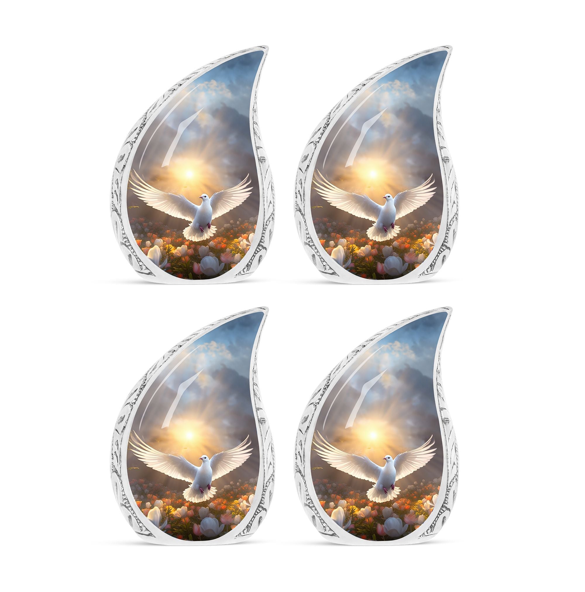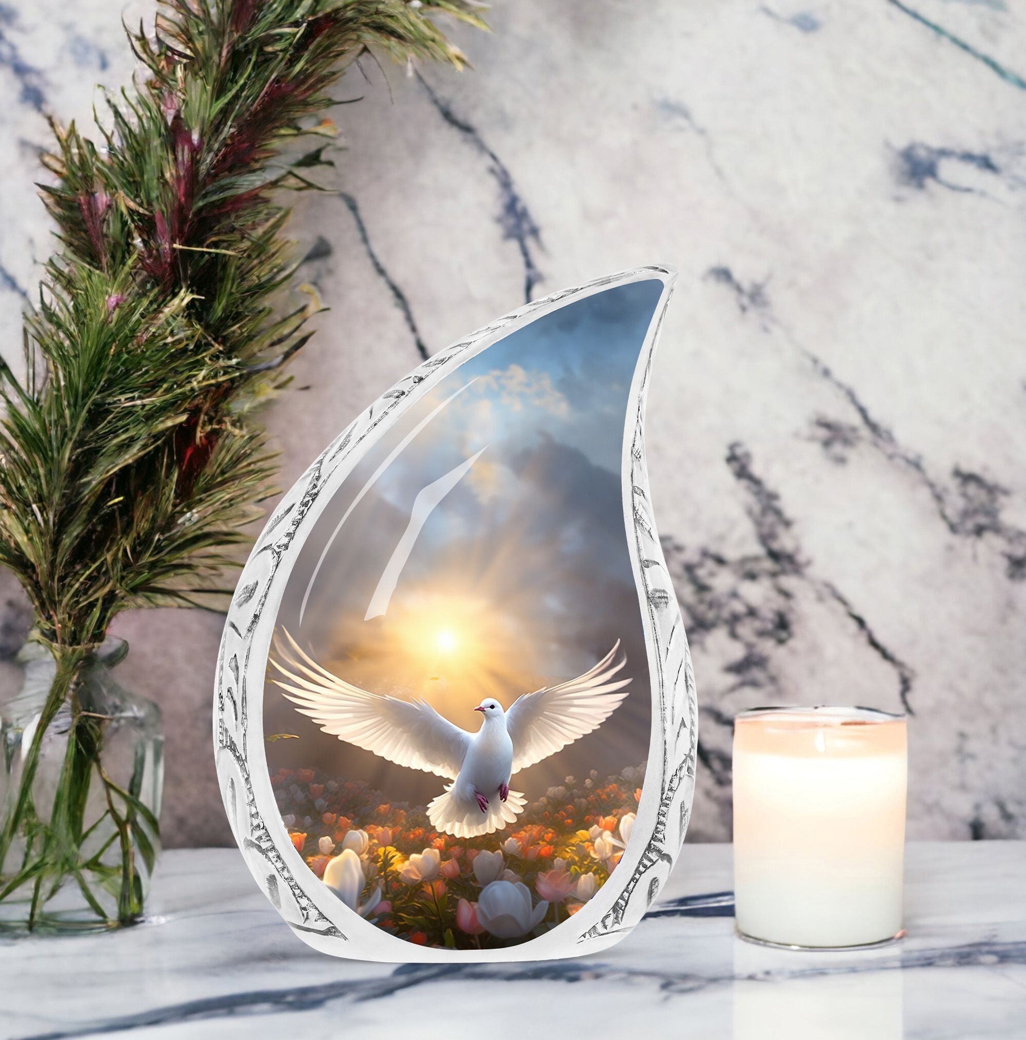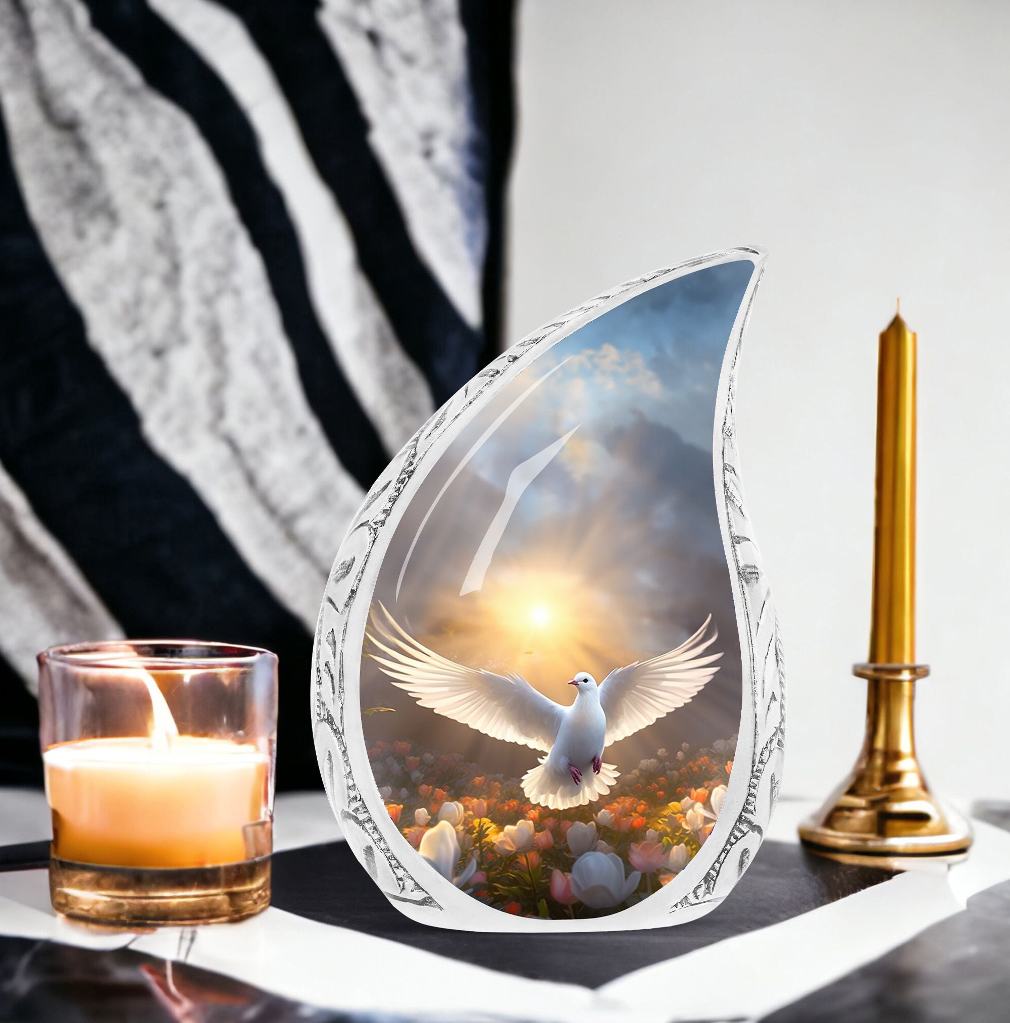 Presenting a Dove Memorial Cremation Urn that simply says, 'Sorry for your loss,' this large urn serves as a fitting repository for placing your loved ones' remains. Crafted from quality aluminum, this cremation urn is 10 inches tall and weighs 3.3 pounds, with a capacity of 200 cubic inches, making it large enough for ashes of any adult. The package includes a soft velvet pouch for the containment of ashes, further ensuring the sanctity and preservation of the remains. Our urn brings a unique level of customizability, offering the feature of personalizing with engraved names to signify the presence and memory of the departed. Accentuating high-quality construction and subtle elegance, this urn carefully caters to consumers looking specifically in the 'Memorial Ceremony Supplies' category, providing comfort during the difficult time of loss. In addition to its primary function, it also serves as an elegant piece of decor for your homes that signifies profound respect and remembrance for your beloved.