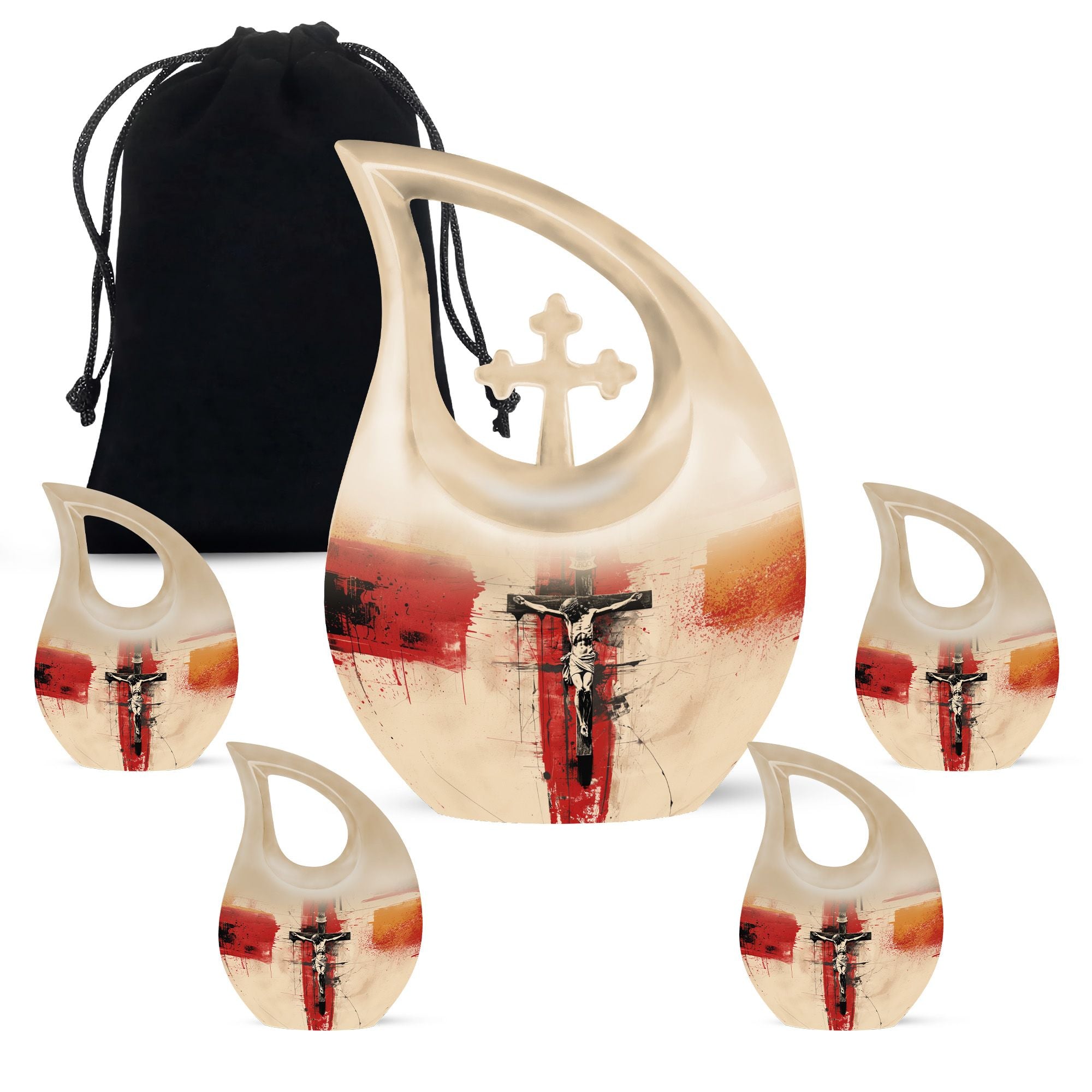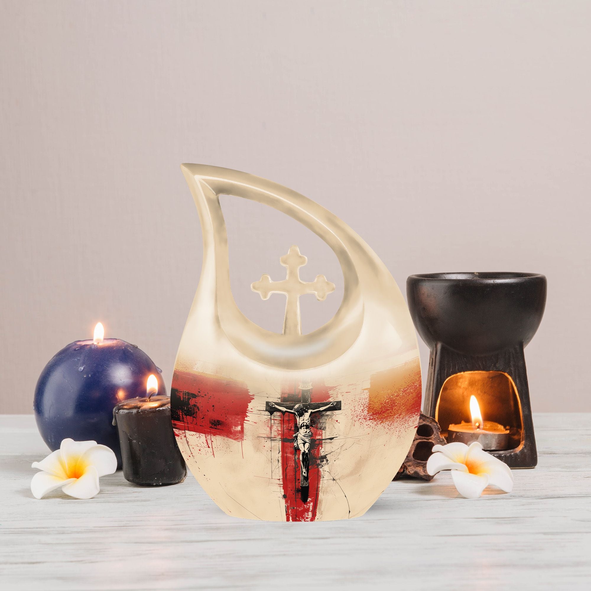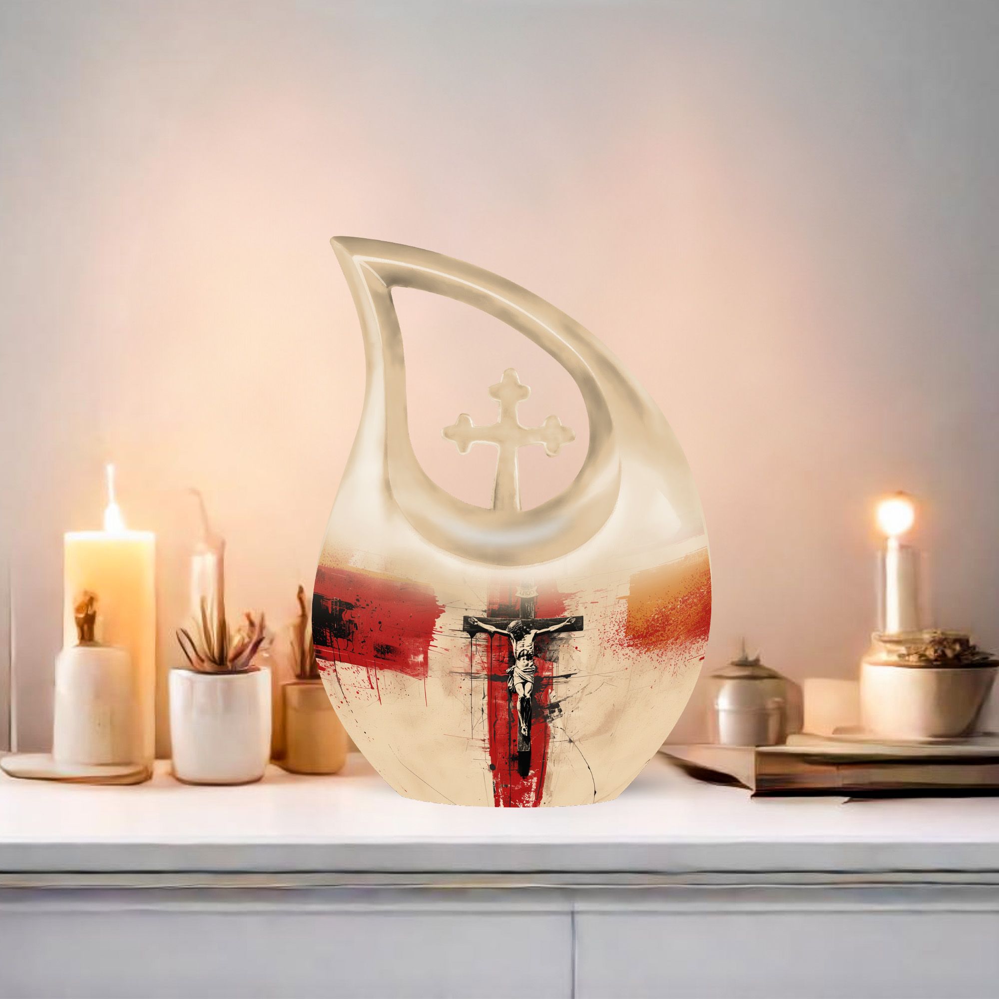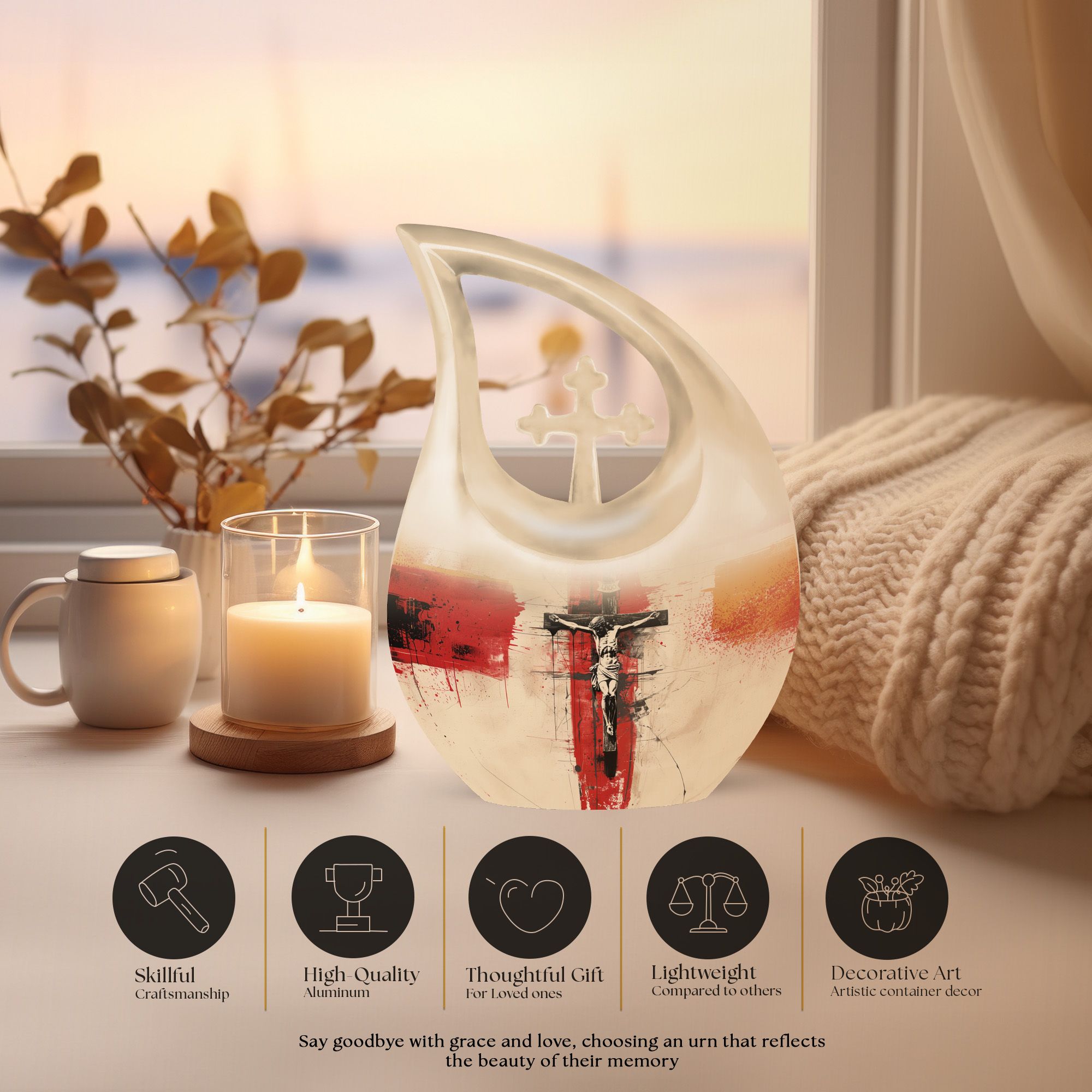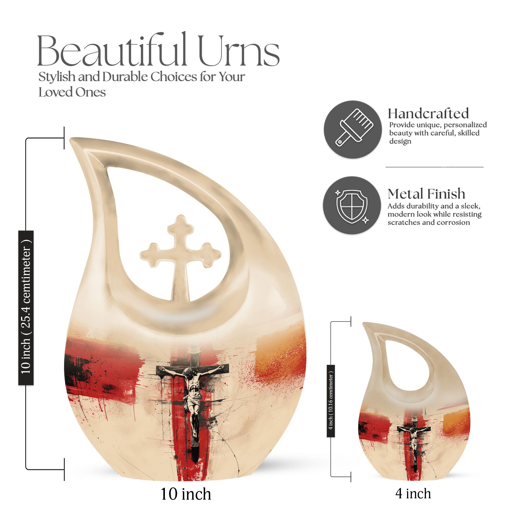Dignified and elegant, this 10-inch Jesus Urn is characterized by its unique Cross Drop shape. Crafted from high-quality aluminium, it is lightweight yet sturdy, tipping the scales at 3.3 pounds. Despite its size, it can comfortably hold up to 200 cubic inches of ashes. Encompassing the essence of remembrance, this large urn is designed to serve as a beautiful, visual tribute to your beloved, attaining a blend of reverence and affordability characteristic of cremation urns. This piece also offers the potential for customization, enabling you to etch names onto its surface, thereby turning it into an object of personal reverence. Coming along with a velvet pouch, it ensures safe containment of the ashes. This urn has been created with seniors and adults in mind, looking for a fitting way to memorialize their departed. These affordable urns are not just containers for ashes, but silent narrators of a beautiful life lived. Perfect for those searching for 'Cheap Funeral Urns' or 'Urns For Sale', this superior piece combines dignity with affordability. Purchase it today and let the legacy live on.