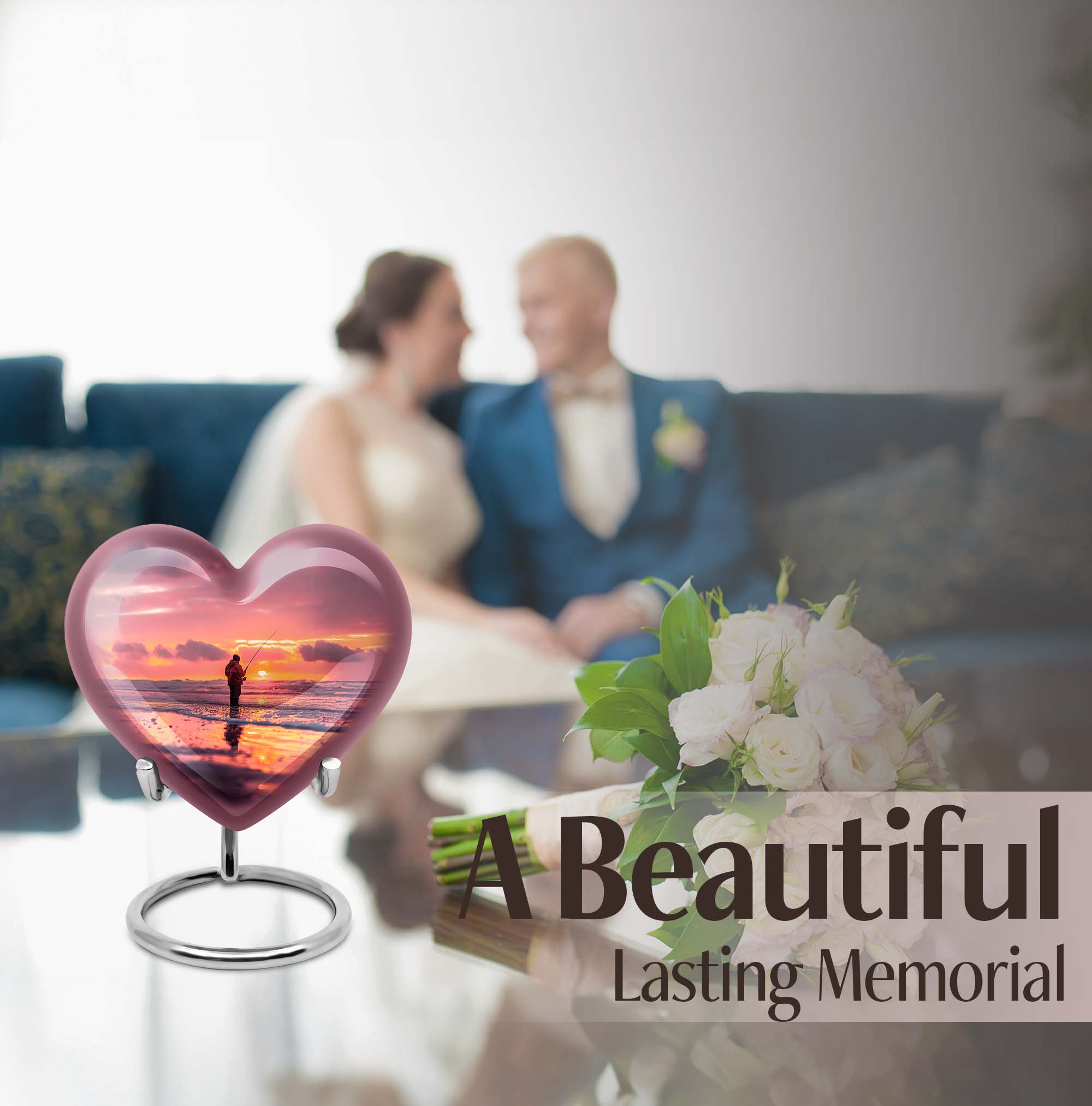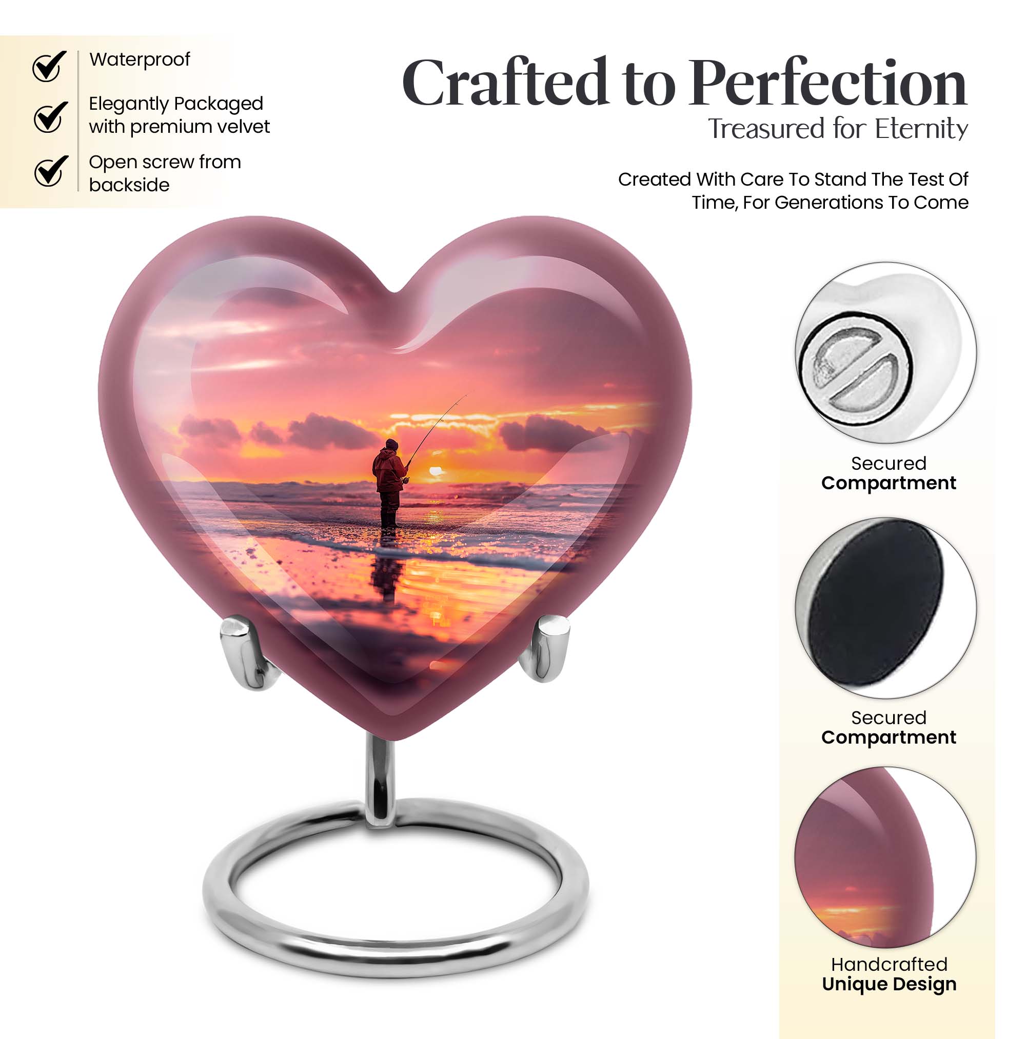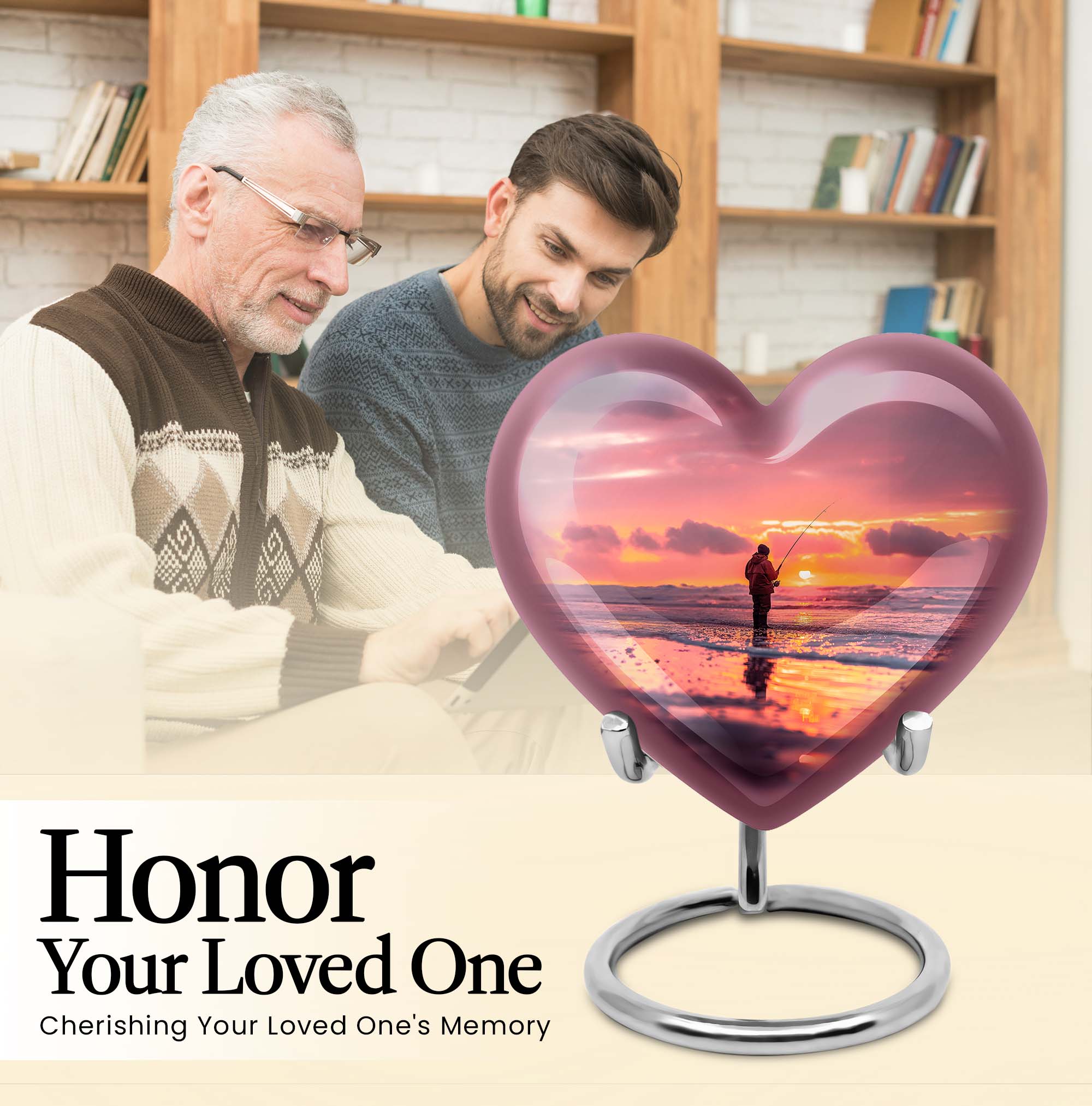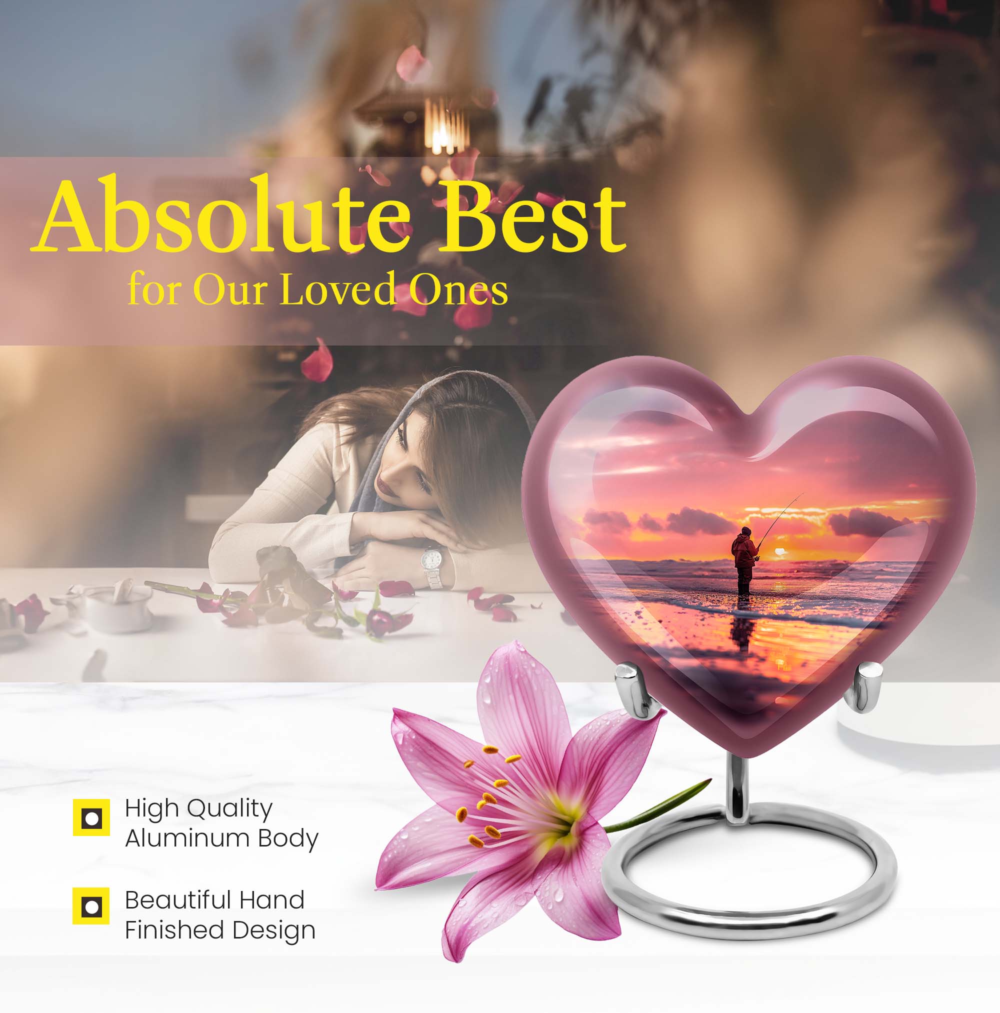 Treasure the memory of your loved one with our finely crafted Fishing Urn. As elegant and serene as the act of fishing itself, this 10-inch cremation urn serves as a respectful and fitting memorial. It is sturdily built from the highest quality aluminium, ensuring durability and longevity. Weighing only 3.3 pounds with dimensions of 10 inches in height, it has a generous capacity of 200 cubic inches. This allows it to adequately hold the ashes of an adult. The urn comes with a sophisticated velvet pouch, providing a safe and suitable containment for the ashes. As a unique and individual touch, our Fishing Urn offers you the opportunity to personalize it with engraved names. This large urn resonates with an abstract theme, presenting a tasteful tribute for both women and men. Keywords like 'cremation urns for women', 'funeral urns ashes', and 'metal urns for human ashes adult female' are great for finding this product online. Our elegantly designed memorial urns not only serve as a homage but also work wonderfully as thoughtful, unisex gifts for adults. Commemorate with the utmost respect and care using our one-of-a-kind Fishing Urn.