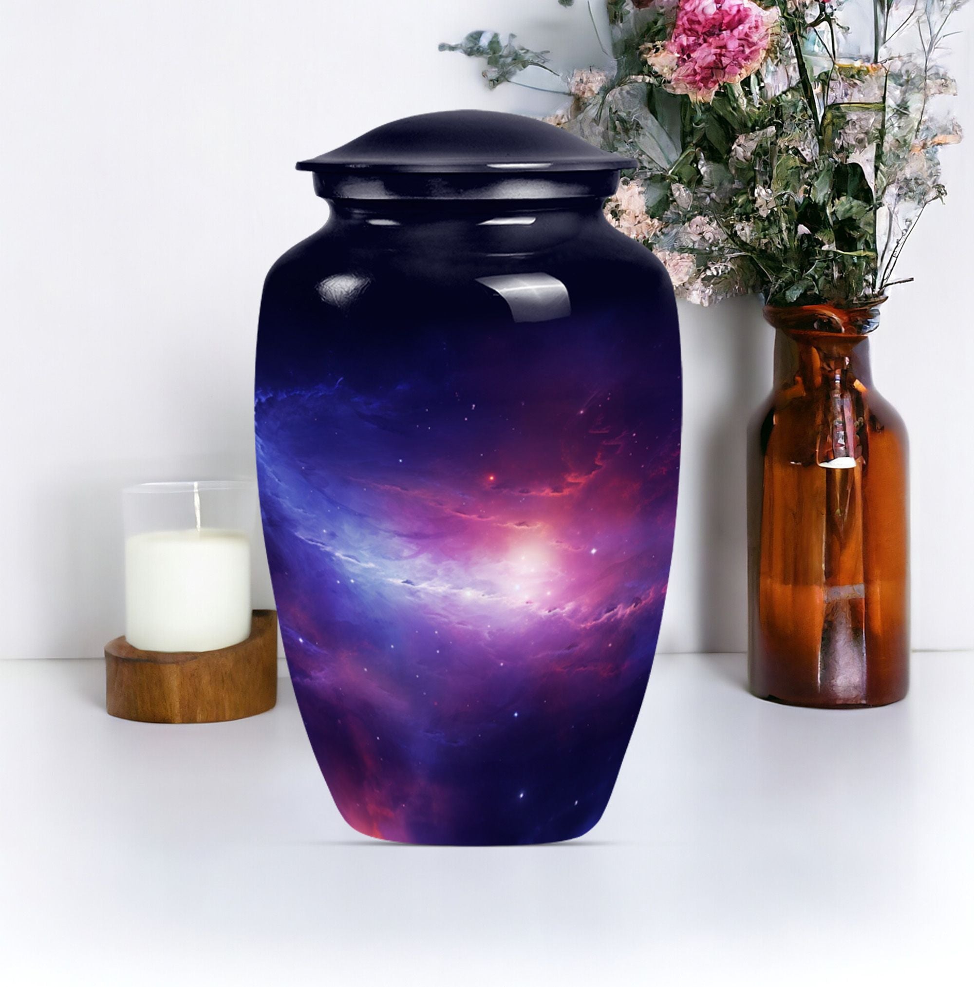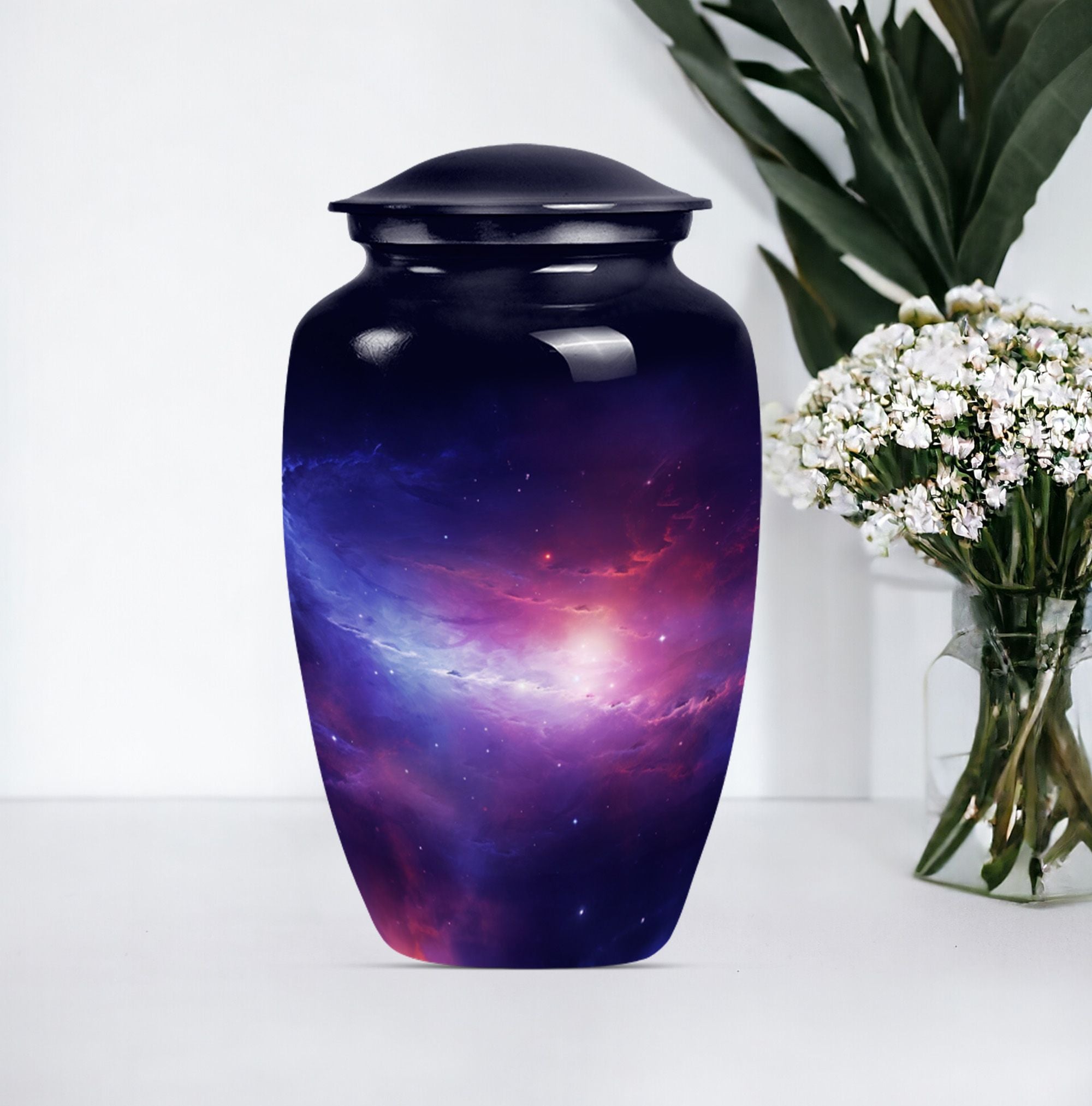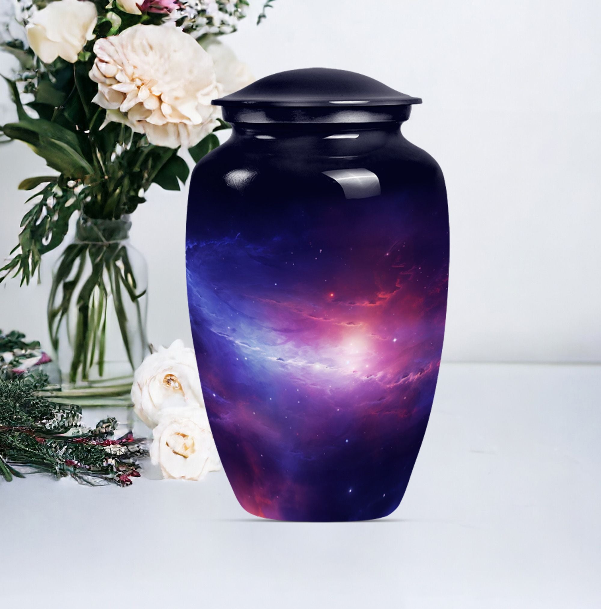 Finding a fitting tribute to a dearly departed loved one can be challenging, but our Purple Meadow-inspired Galaxy Urn is a beautiful and respectful choice. Measuring 10 inches in height, this large urn has a quality feel, being crafted from resilient Aluminium with a substantial weight of 3.3 pounds. Its capacity is vast, accommodating up to 200 cubic inches of ash, making it suitable to hold the remnants of an adult. For an intimate touch, this cremation urn can be personalized with engraved names, fitting the memory of the deceased in a poignant way. It arrives well-protected in a soft velvet pouch for containment of ashes, adding an extra layer of respect to this important memorial. Whether you are looking for funeral urn for men's ashes or memorial urns for adults, you'll find peace and comfort in this Classic Urn design. Our Galaxy Urn stands apart from the rest, offering a distinctive design that perfectly honors a loved one's memory.