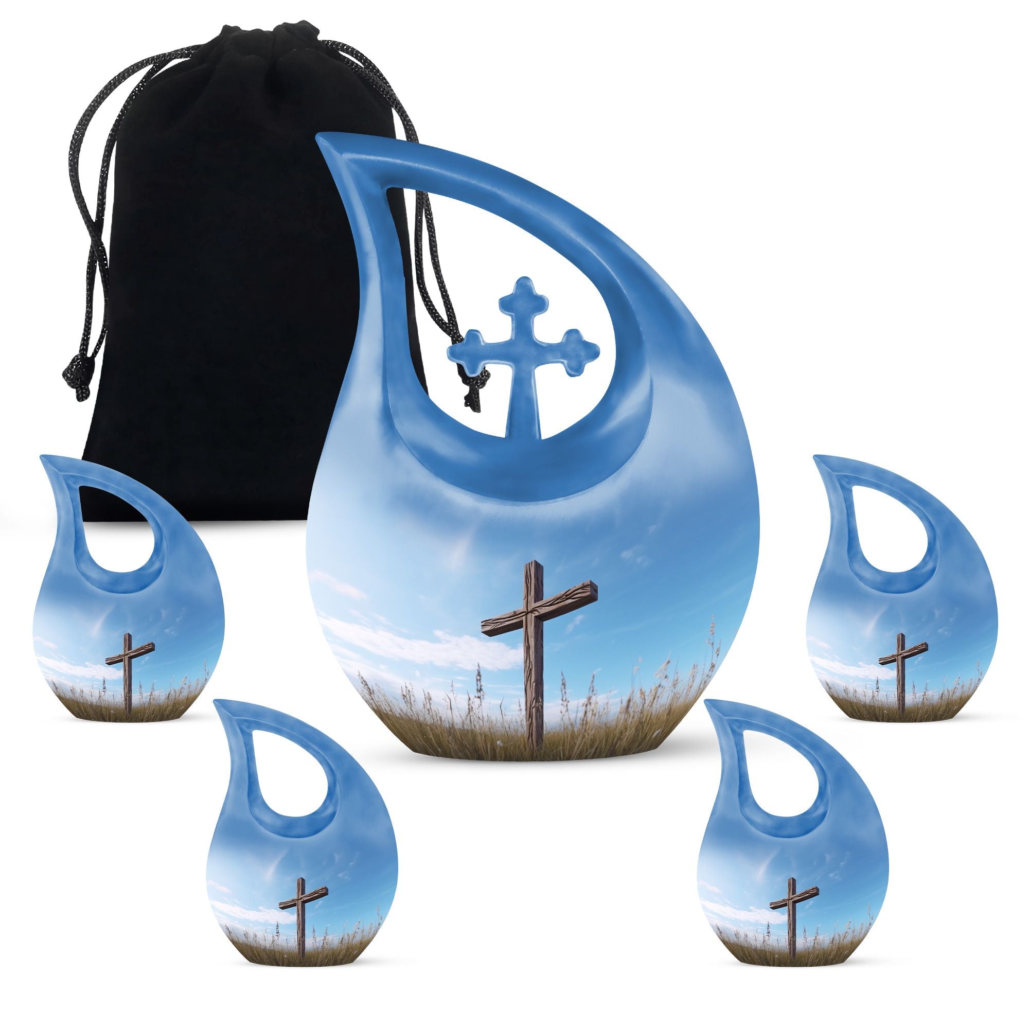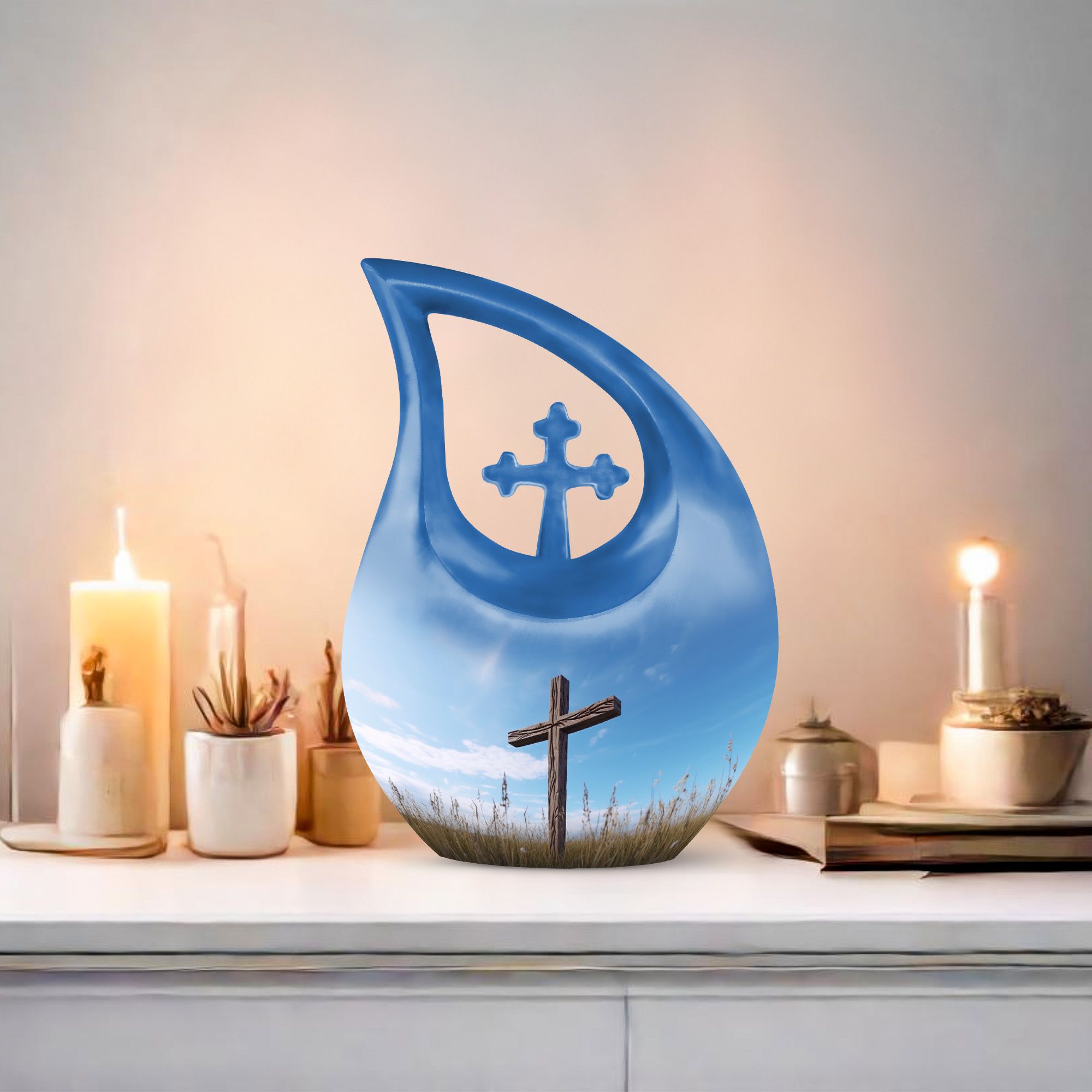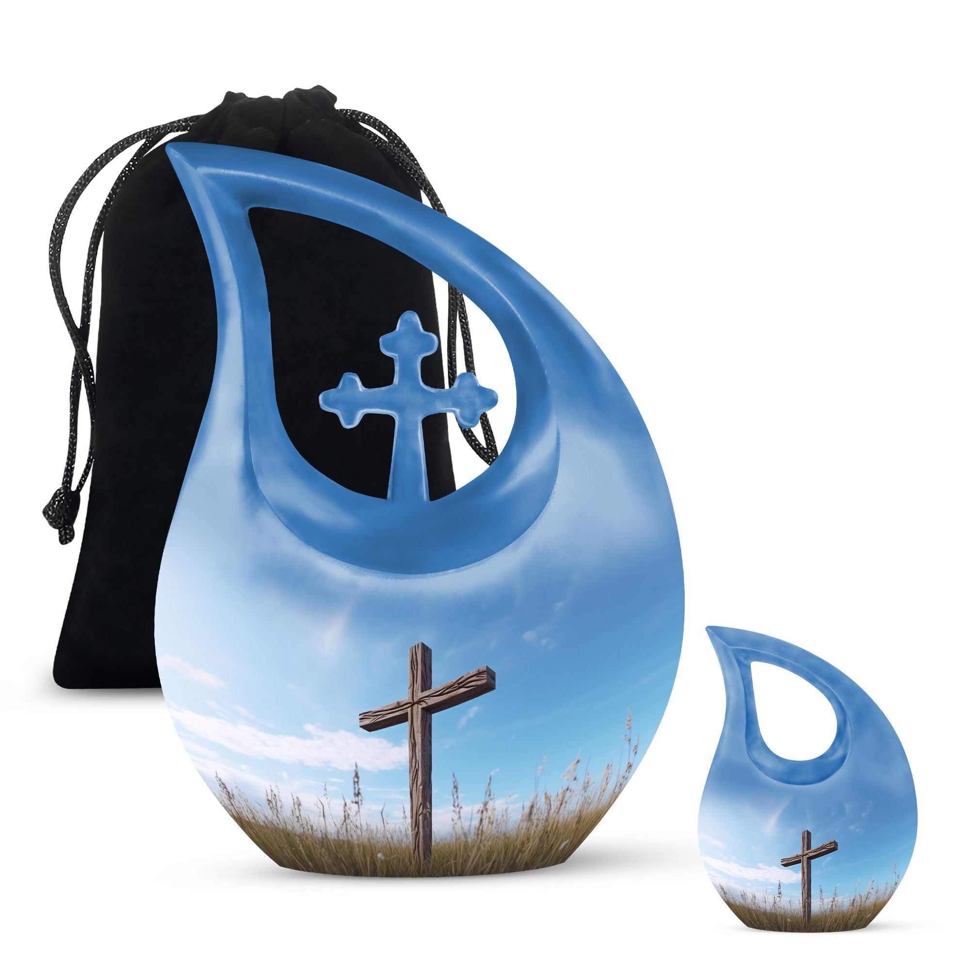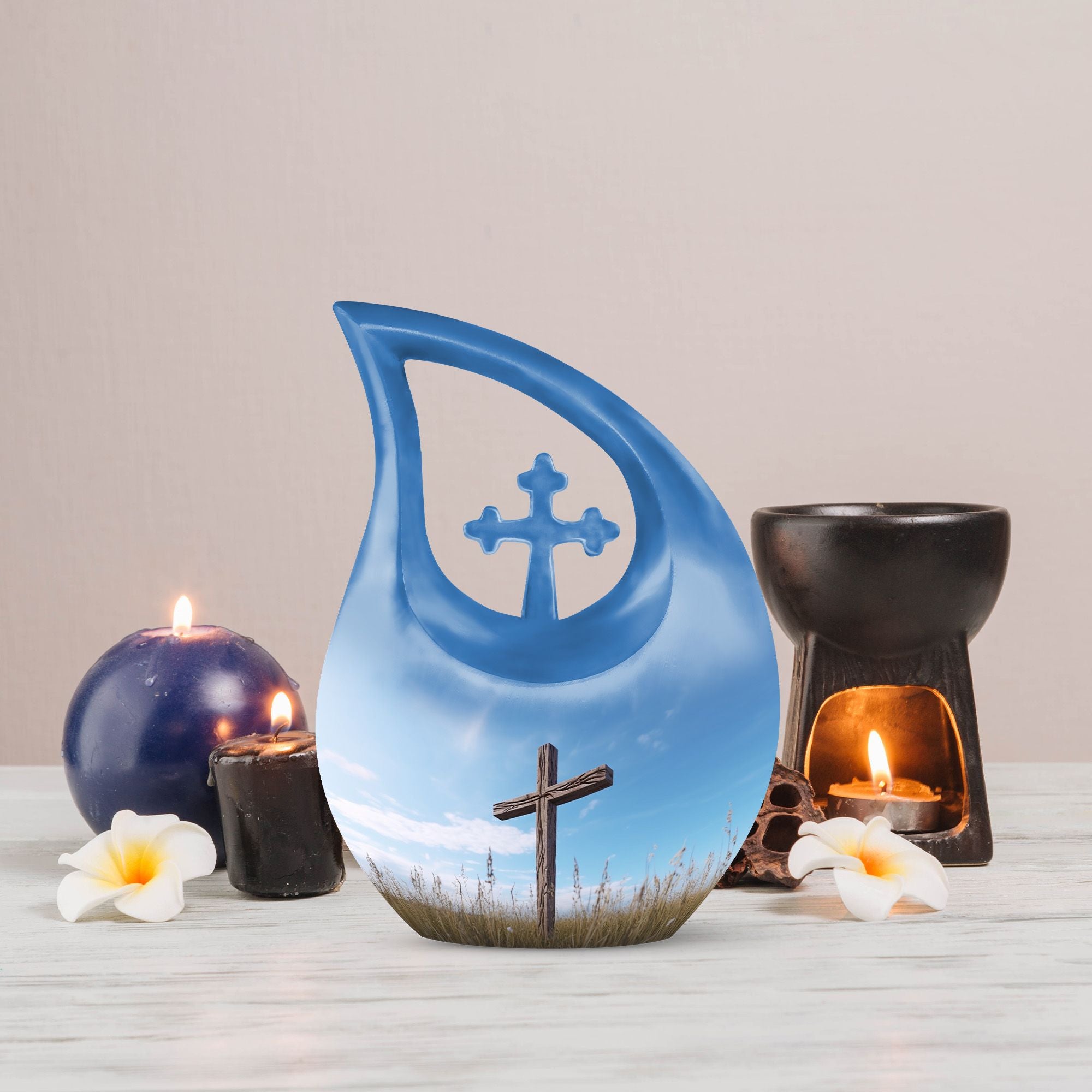 Welcome the tranquility and sacredness of our Jesus Christ Urn, a highly treasured addition to our select collection of large urns online. Bestowing honor to a loved one's memory, this cross drop urn measures a formidable 10 inches, providing a Capacity of 200 cubic inches to treasure the ashes of your departed love. Skillfully crafted from durable aluminium, our urn is both aesthetically pleasing and exudes immense stability with a weight of 3.3 pounds. To further elevate your memorial tribute, each purchase offers an option for customization by means of engraved names, ensuring an everlasting bond. The urn arrives cradled in a plush velvet pouch, bespeaking of our commitment to respecting and preserving your treasured keepsakes. Our memorials urns transcend commonality, offering an intimate keepsake memory box for moments of quiet reflection. Refresh your search from conventional cremation boxes for adults, and embrace the serenity of our metal urns for ashes, a true embodiment of solace and honor.