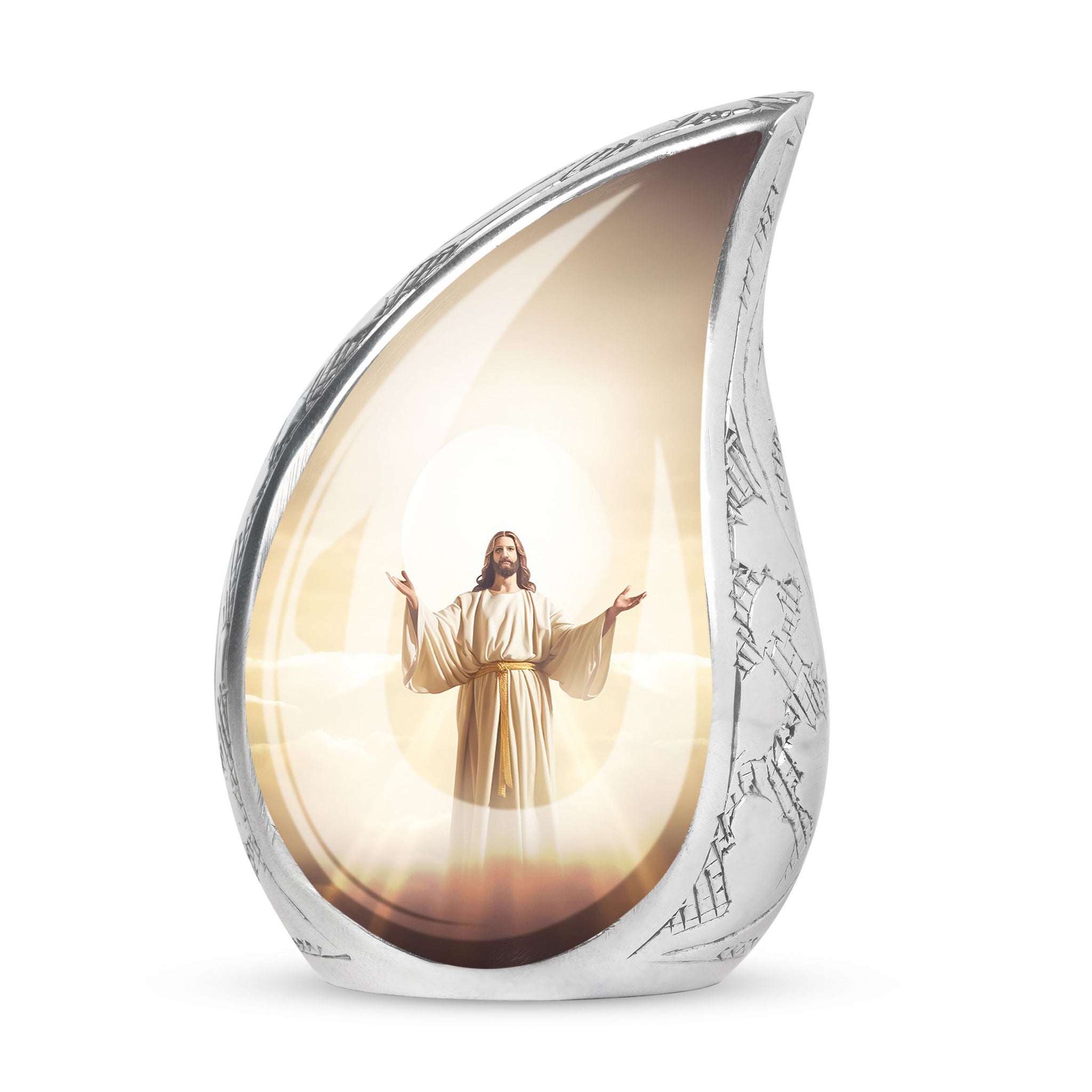 Cherish and hold close the precious memories of your loved ones with our Large Jesus Christ Cross Cremation Urn. Carefully crafted from long-lasting Aluminium materials, this ashes container serves as the perfect, enduring memorial for deceased loved ones. The urn exudes a solemn appeal befitting the final resting place of your cherished one. Its large capacity of 200 cubic inches accommodates the ashes efficiently while its weight of 3.3 pounds provides a substantial yet manageable heft. Our contemporary urn stands at an impressive 10 inches in height, with a diameter of 3 inches, fitting varied spaces with ease. Each purchase includes a plush velvet pouch to contain the ashes. Offering an option to engrave names, the urn provides an avenue for personalization. The Classic Urn, which notably omits the design specification, offers an understated aesthetic that allows for customization while allowing its inherent beauty to shine. As a thoughtful holder for human cremation ashes, this memorial urn encompasses age-old tradition in a sleek, modern design. Ideal as burial urns, this large Jesus Christ Cross Cremation Urn serves as a constant remembrance of a well-celebrated life.