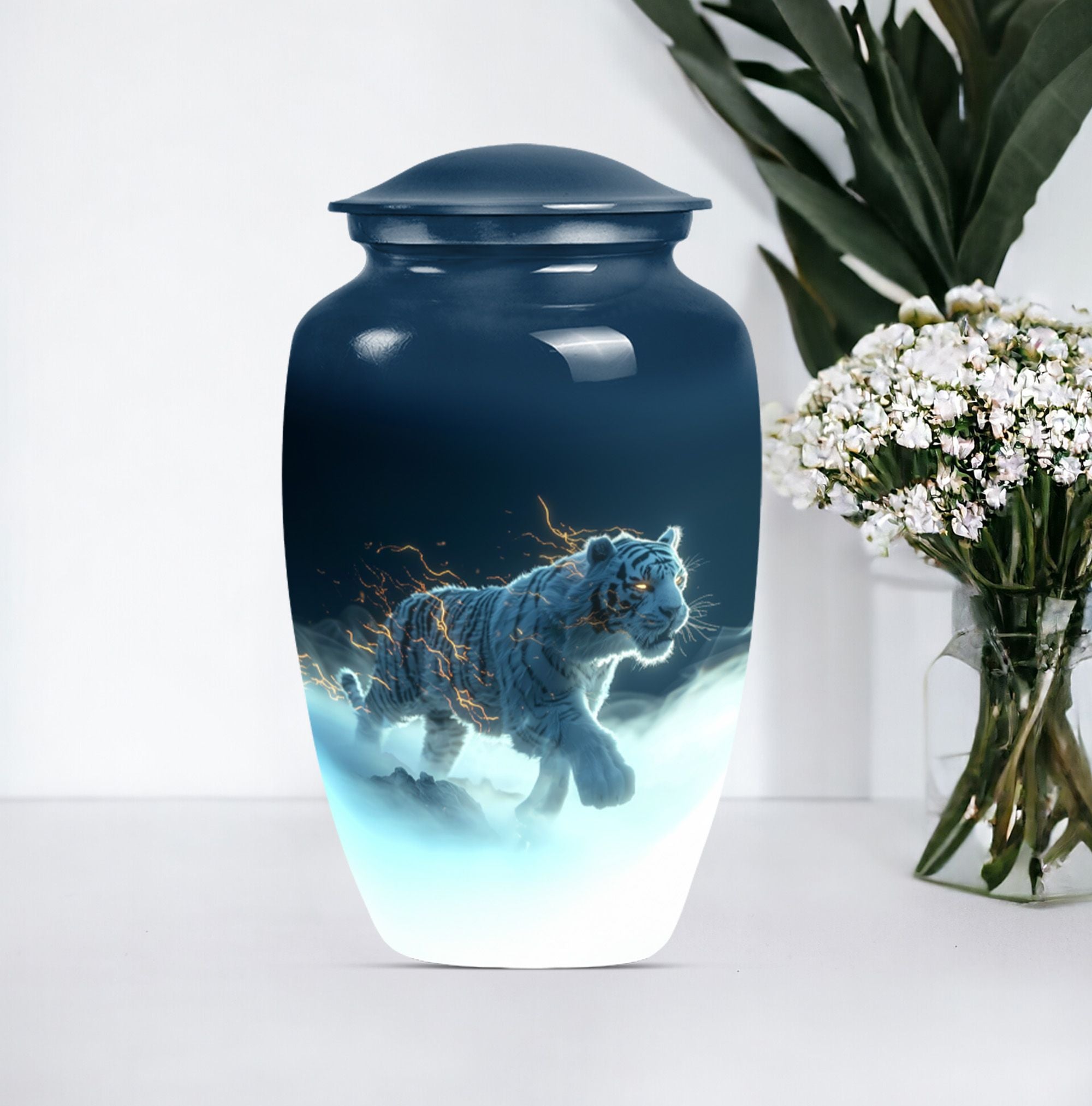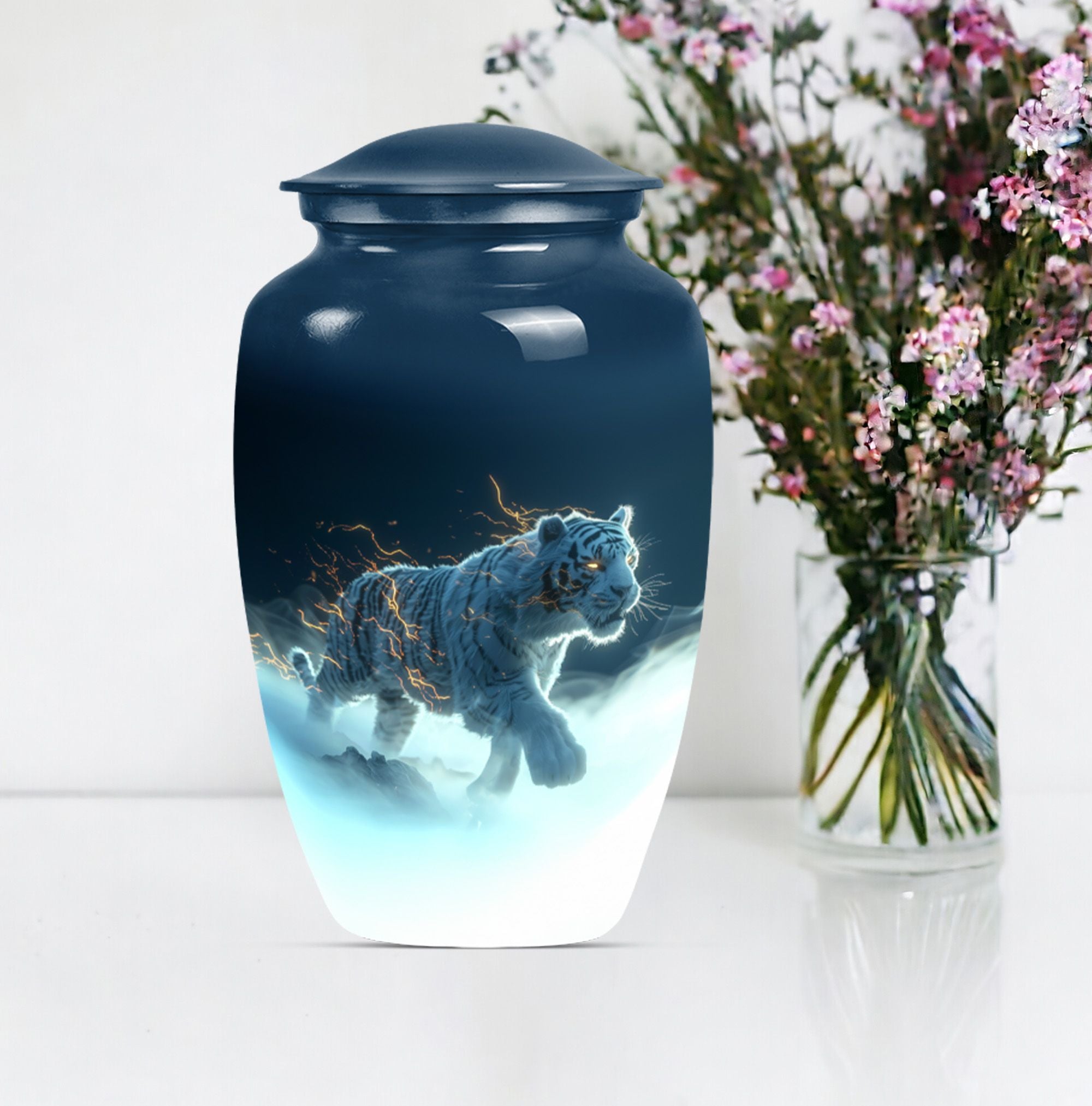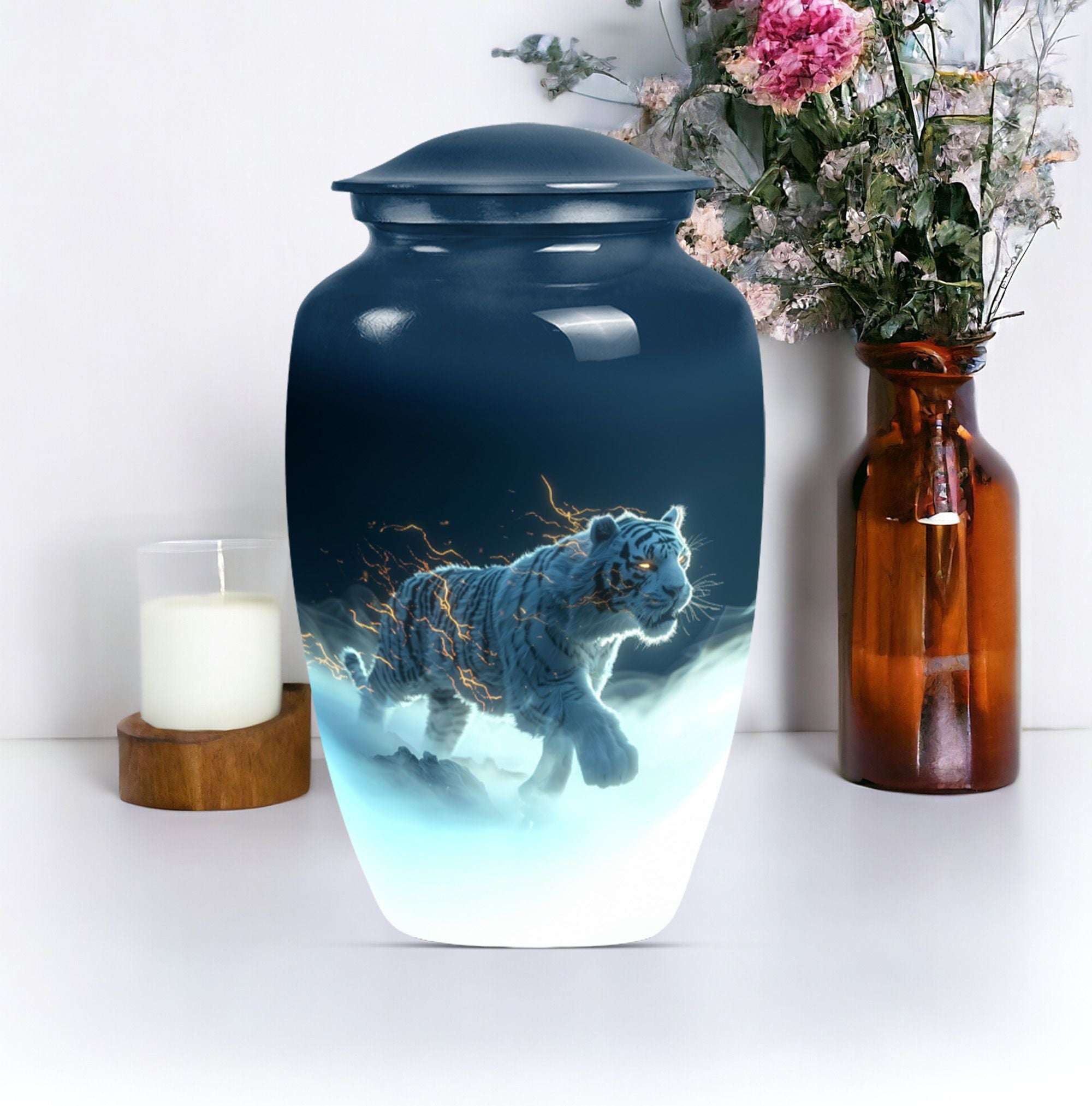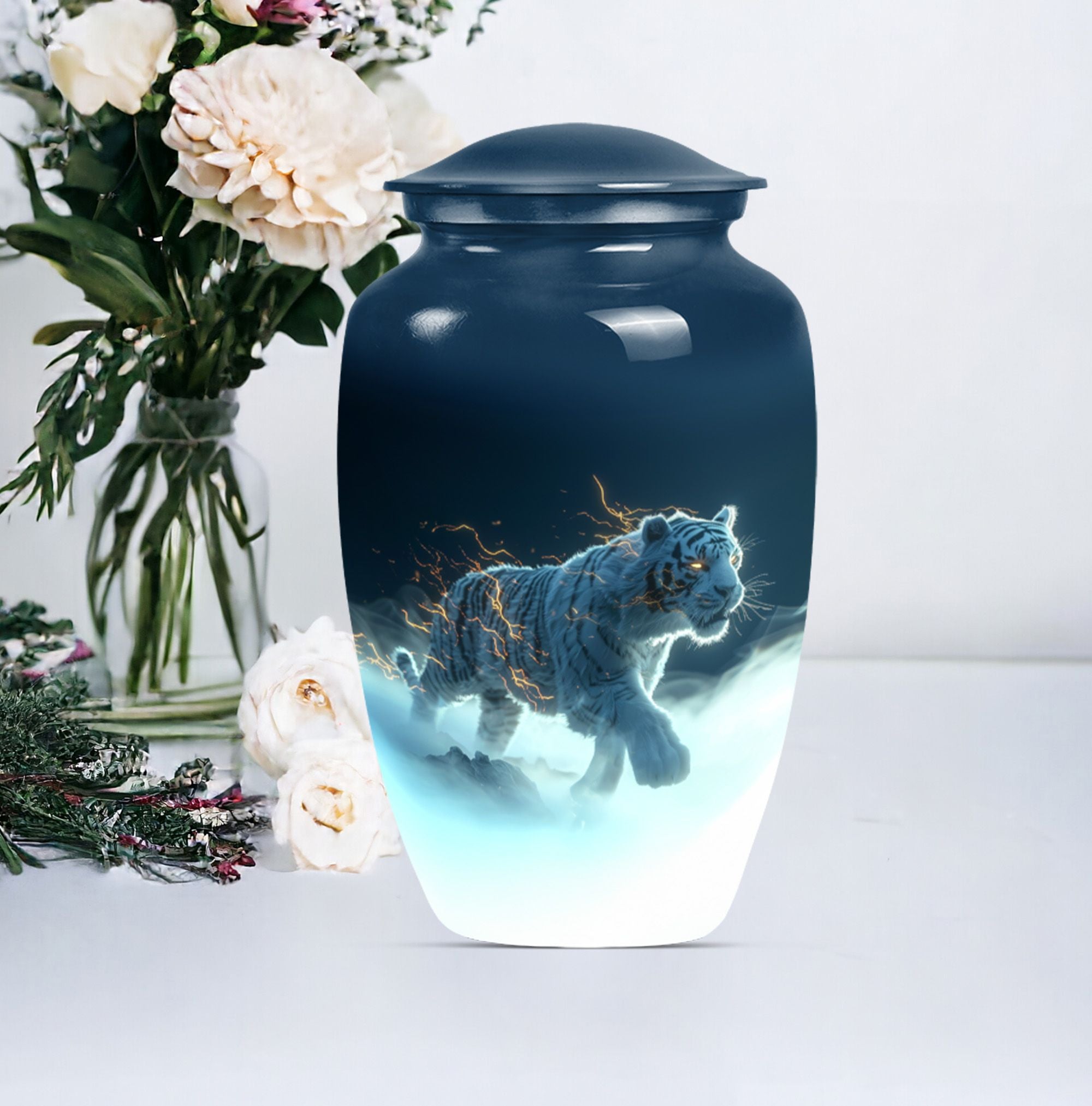 Unleash the celestial spirit of your loved ones, now resting in peace, with our Wolf Howling Themed Large Urn. This 10 inches tall aluminium urn, weighing at a solid 3.3 pounds, is designed to carry up to 200 cubic inches of ashes. Known as 'Tiger Urn', the intimate burial urn is deemed perfect for women, however, does not undermine its capacity to serve as an equally touching token for men too. The exquisitely crafted memorial urns make honored keepsakes for those who wish to pay their respects to their loved ones in a delicate and dignified manner. These large urns come with a cosy velvet pouch which provides a delicate asylum for the poignant ashes. Plus, the urn caters customization by engraving names, so you can make it as unique as the invaluable personalities you ardently cherish. For those seeking meaningful memorial gifts, this burial cremation urn resonates the perfect sentiment.