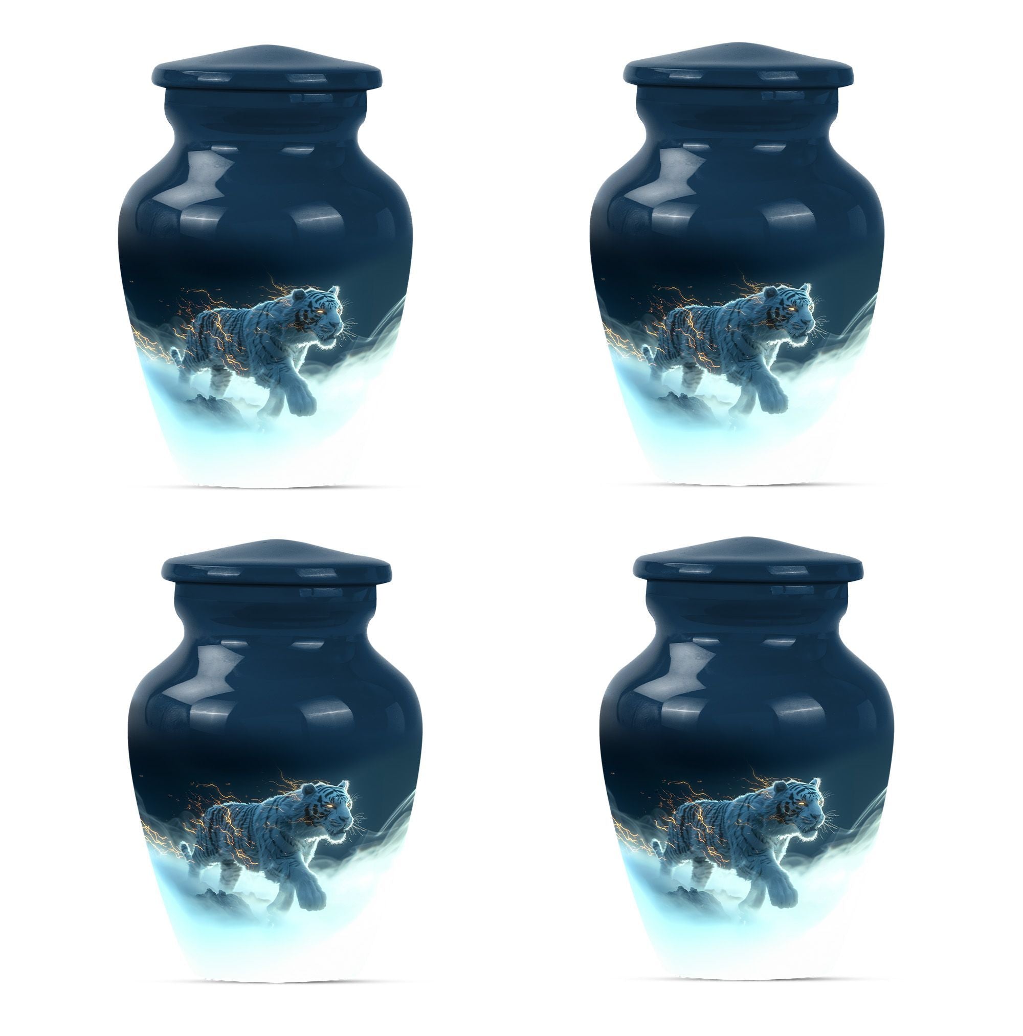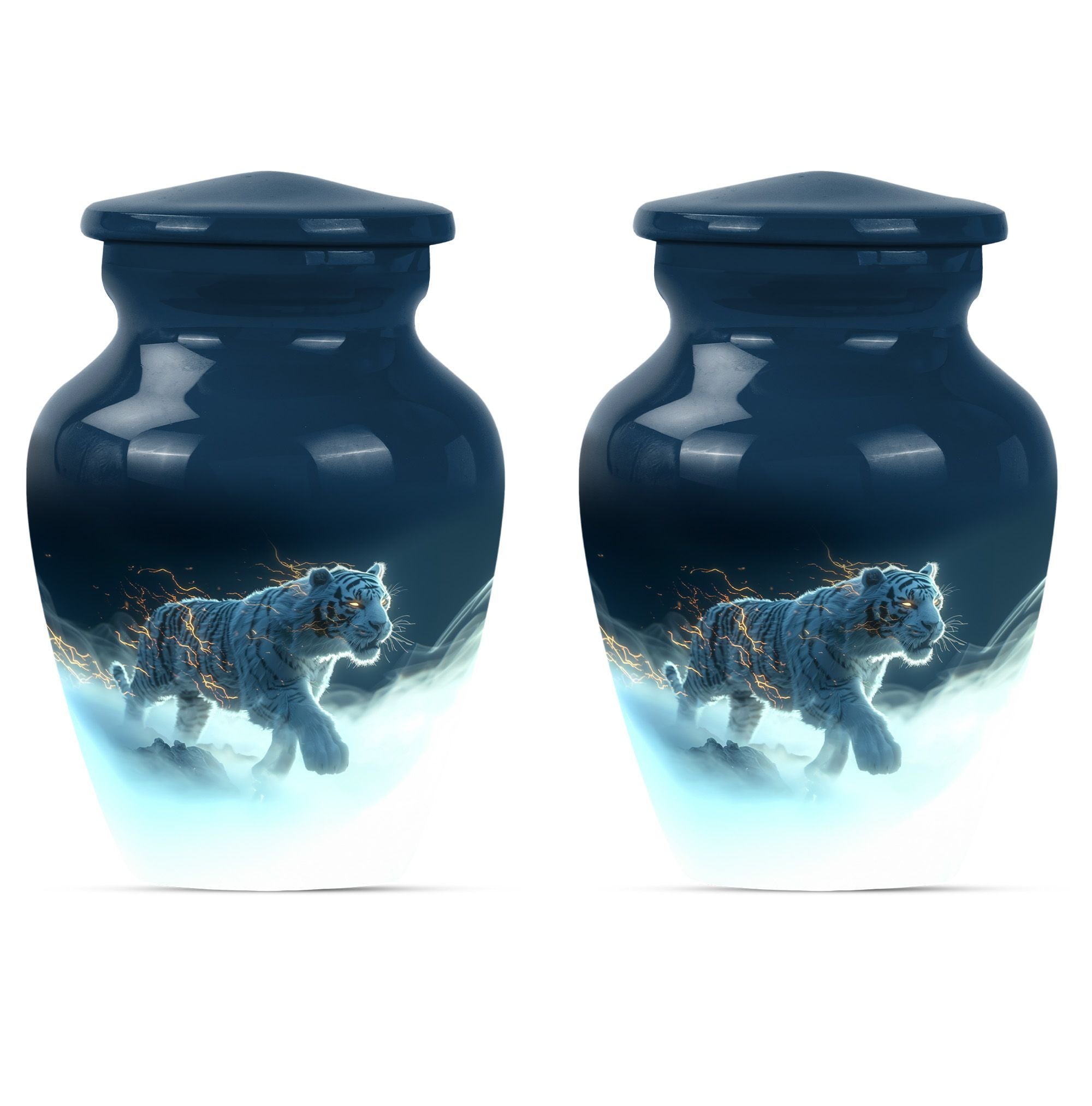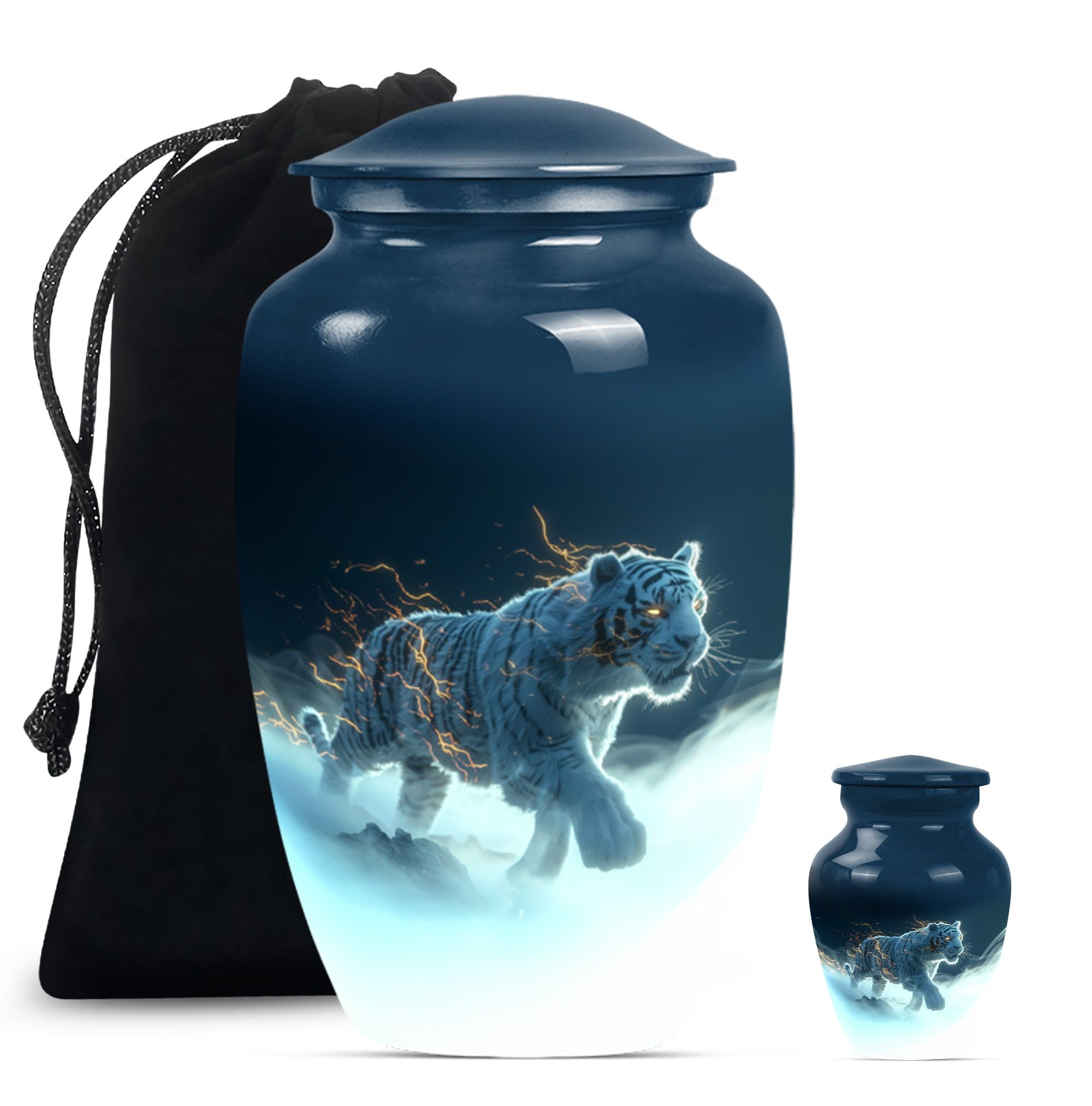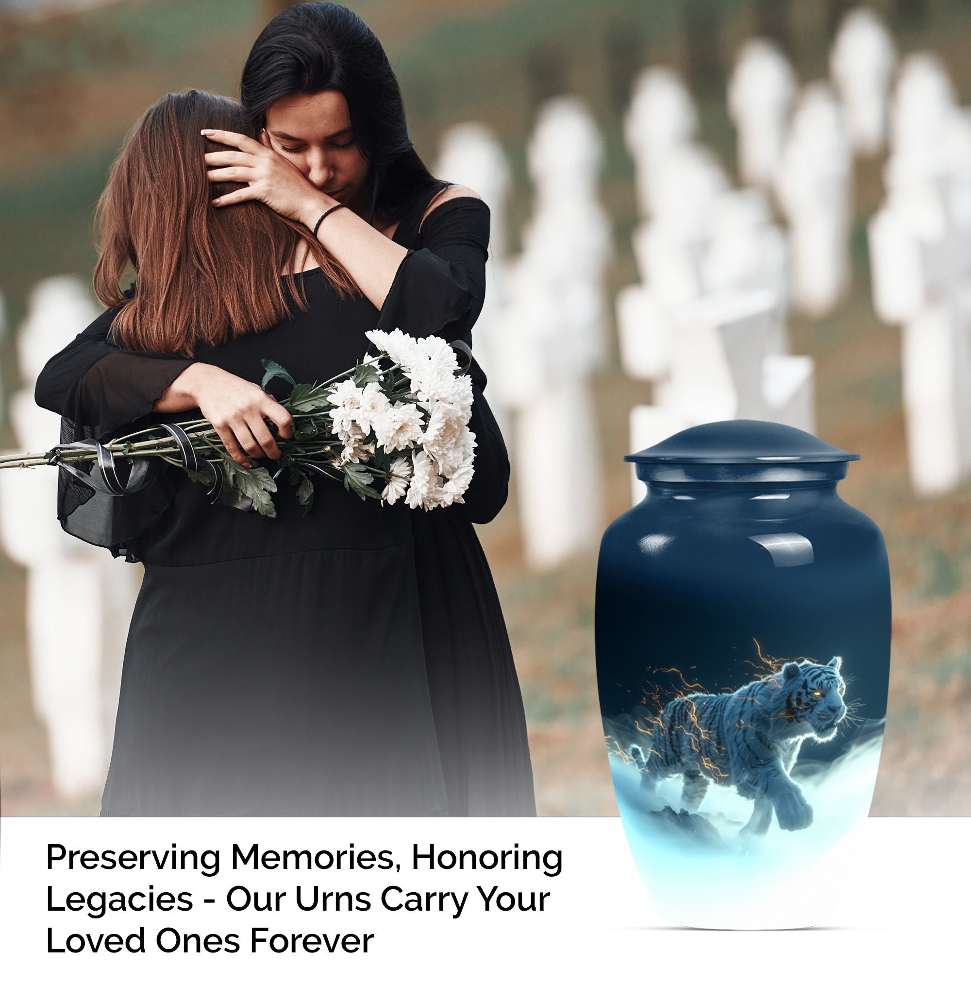 Unleash the celestial spirit of your loved ones, now resting in peace, with our Wolf Howling Themed Large Urn. This 10 inches tall aluminium urn, weighing at a solid 3.3 pounds, is designed to carry up to 200 cubic inches of ashes. Known as 'Tiger Urn', the intimate burial urn is deemed perfect for women, however, does not undermine its capacity to serve as an equally touching token for men too. The exquisitely crafted memorial urns make honored keepsakes for those who wish to pay their respects to their loved ones in a delicate and dignified manner. These large urns come with a cosy velvet pouch which provides a delicate asylum for the poignant ashes. Plus, the urn caters customization by engraving names, so you can make it as unique as the invaluable personalities you ardently cherish. For those seeking meaningful memorial gifts, this burial cremation urn resonates the perfect sentiment.