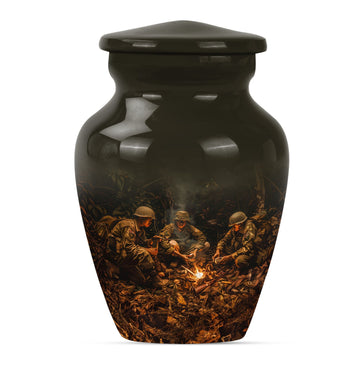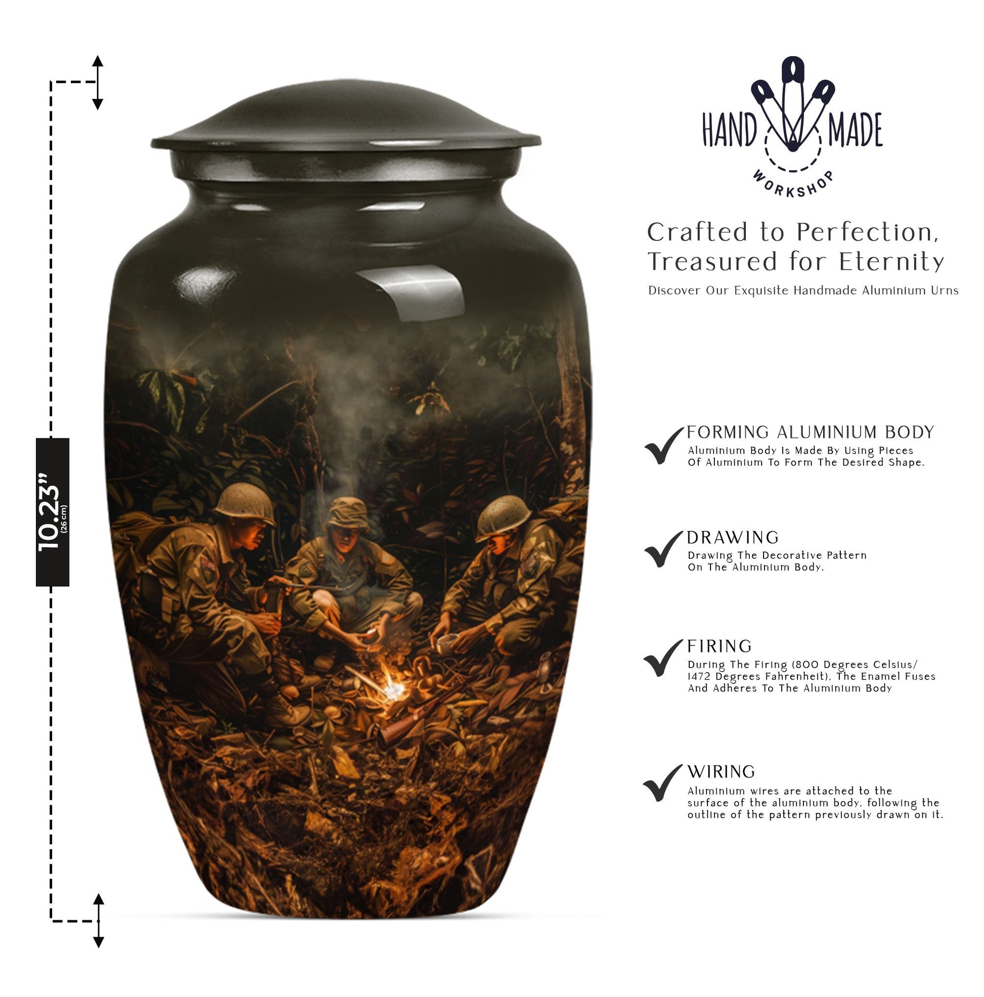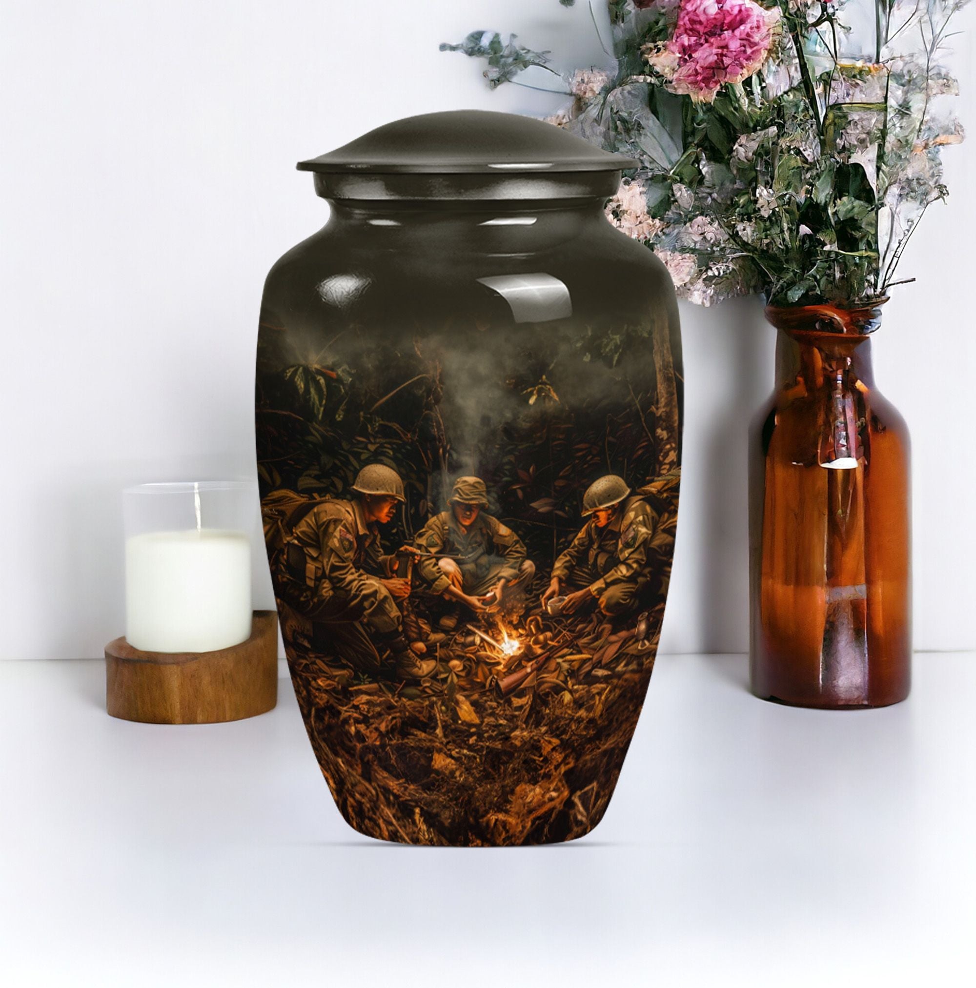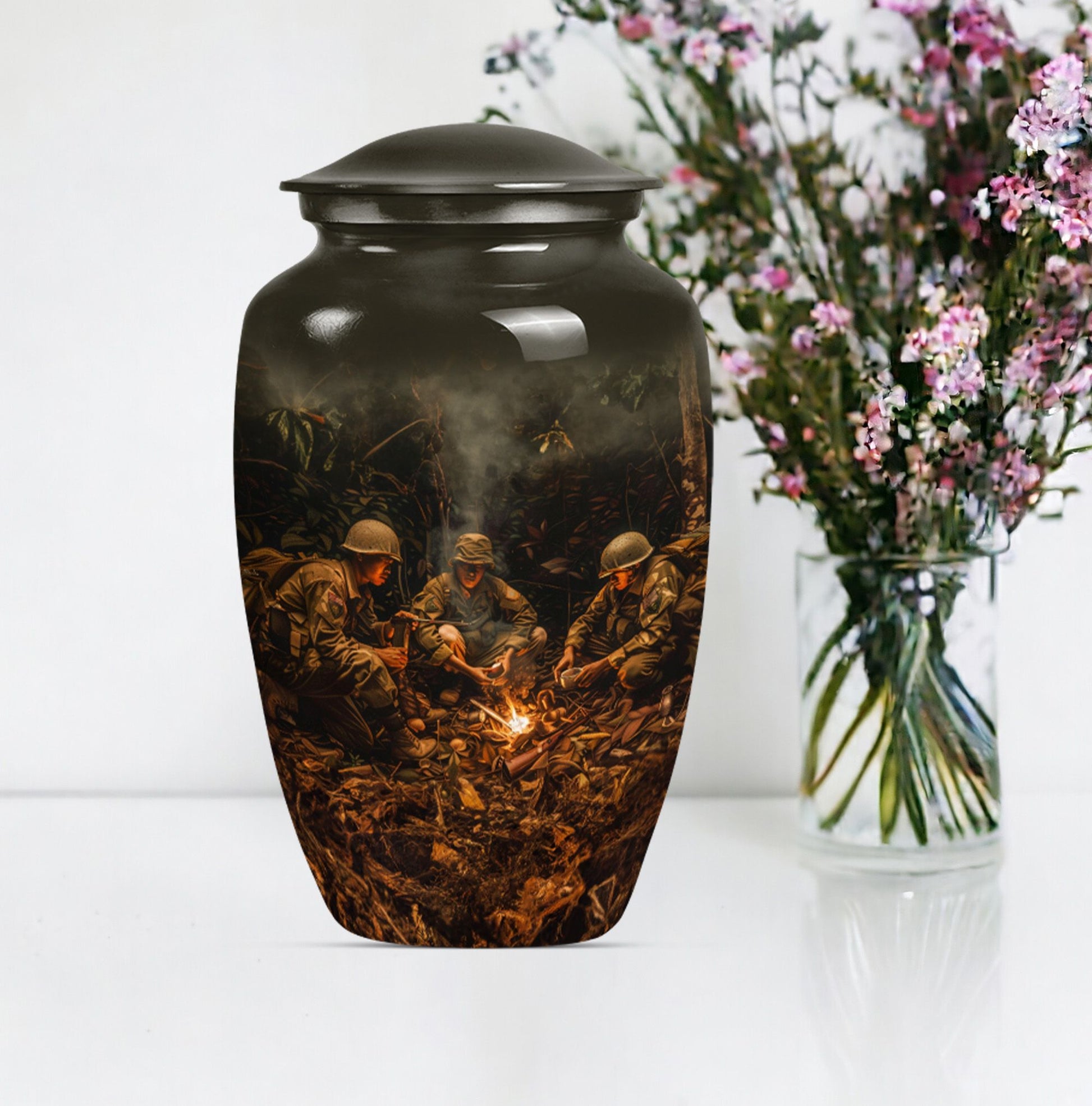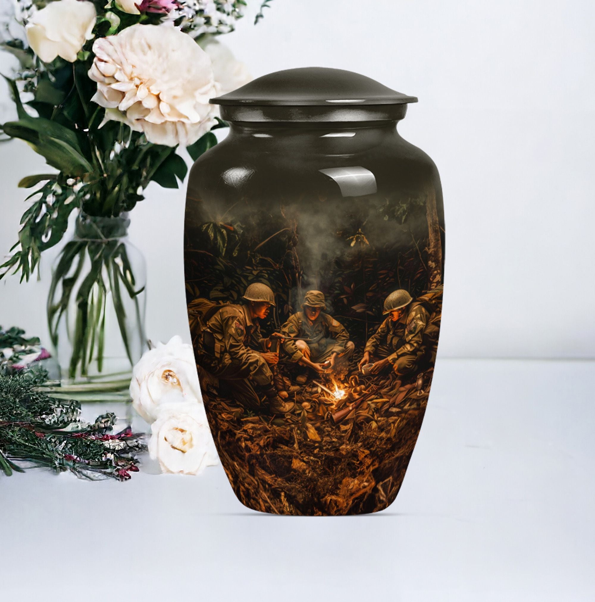Our 'Classic Urn' epitomizes the union of elegance and simplicity. This piece, designed as a military urn, resonates with a feeling of solemn respect and honor. Crafted from high-quality aluminium, this urn is robust and has a substantial weight of 3.3 pounds. It stands at a dignified 10-inch height and can securely store up to 200 cubic inches of ashes. The urn comes complete with a velvet pouch, providing a tasteful and respectful means of containment for your cherished one's ashes. Personalization with engraved names is available, enabling you to commemorate your loved one in an intimate and personal manner. This makes an ideal choice for 'memorial adult urns for human ashes' catering to both women and men. Its unique abstract theme sets it apart, appealing to those seeking 'large urns for cremation ashes', 'adult urns', 'large funeral urns' or 'cremation urns for women'. Honor your loved one's memory with our distinct and dignified 'Classic Urn'.