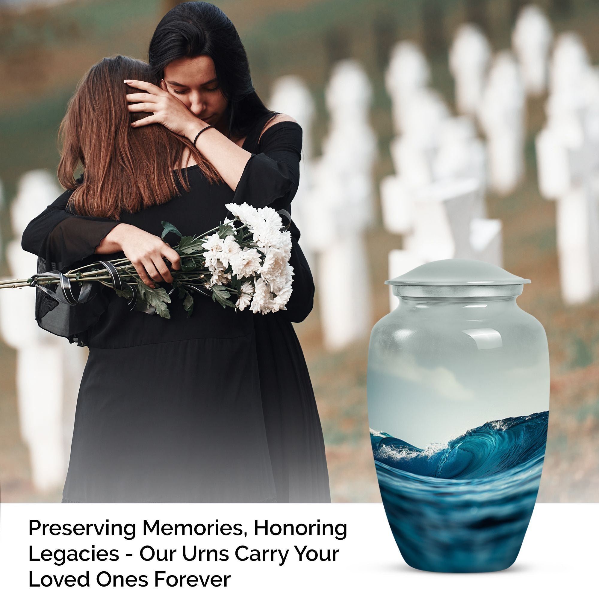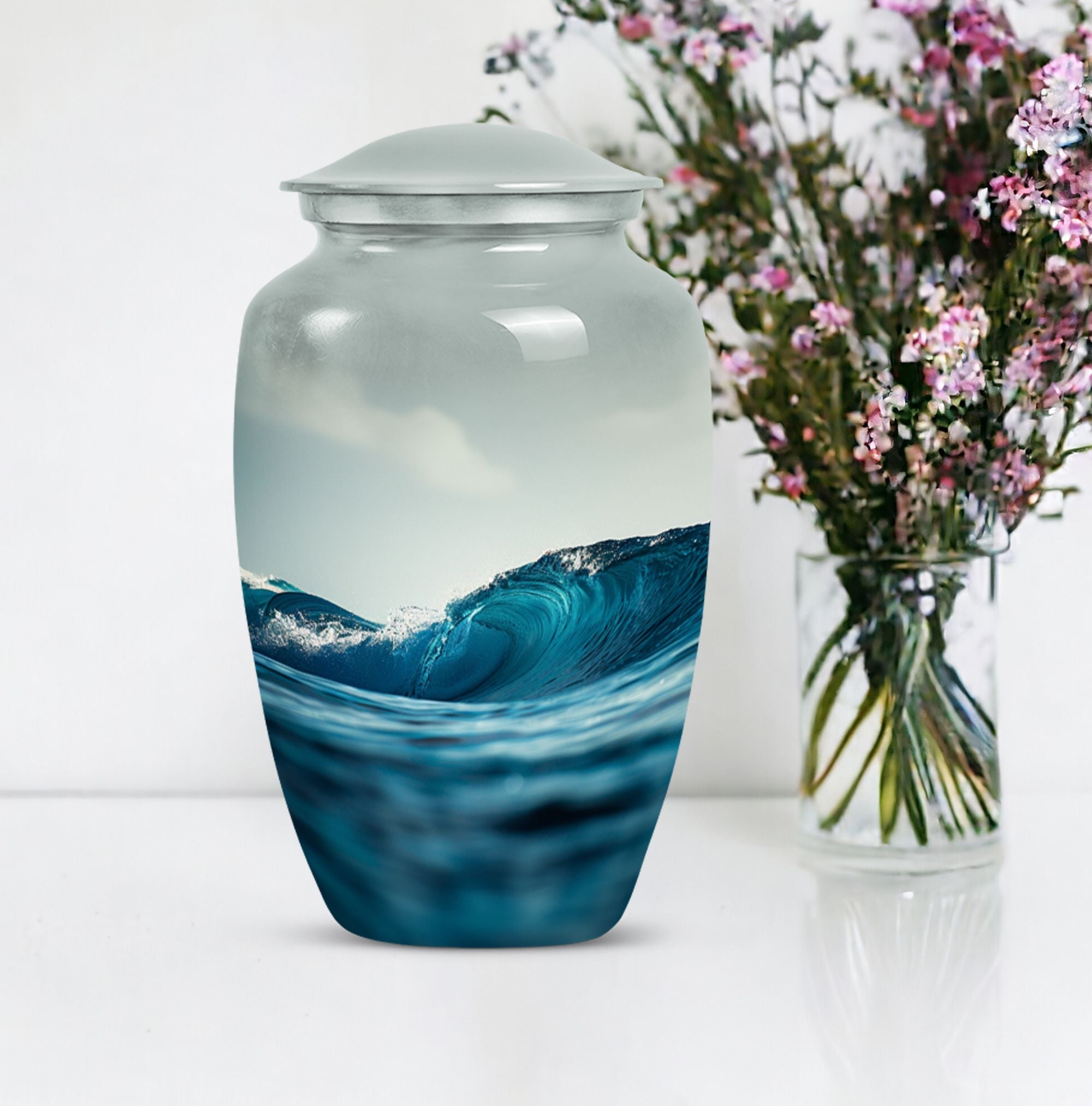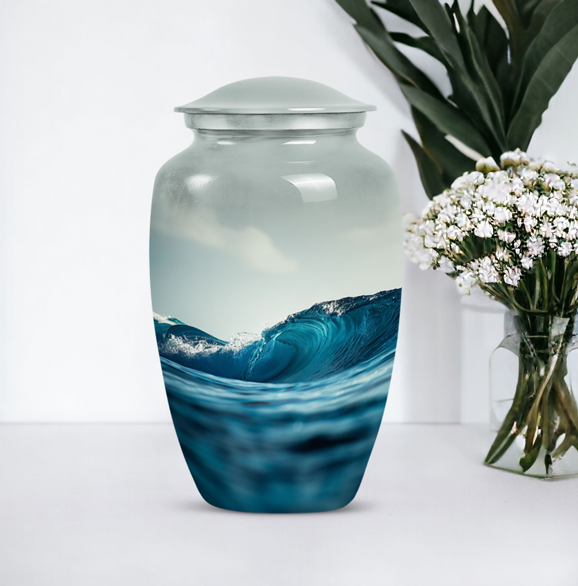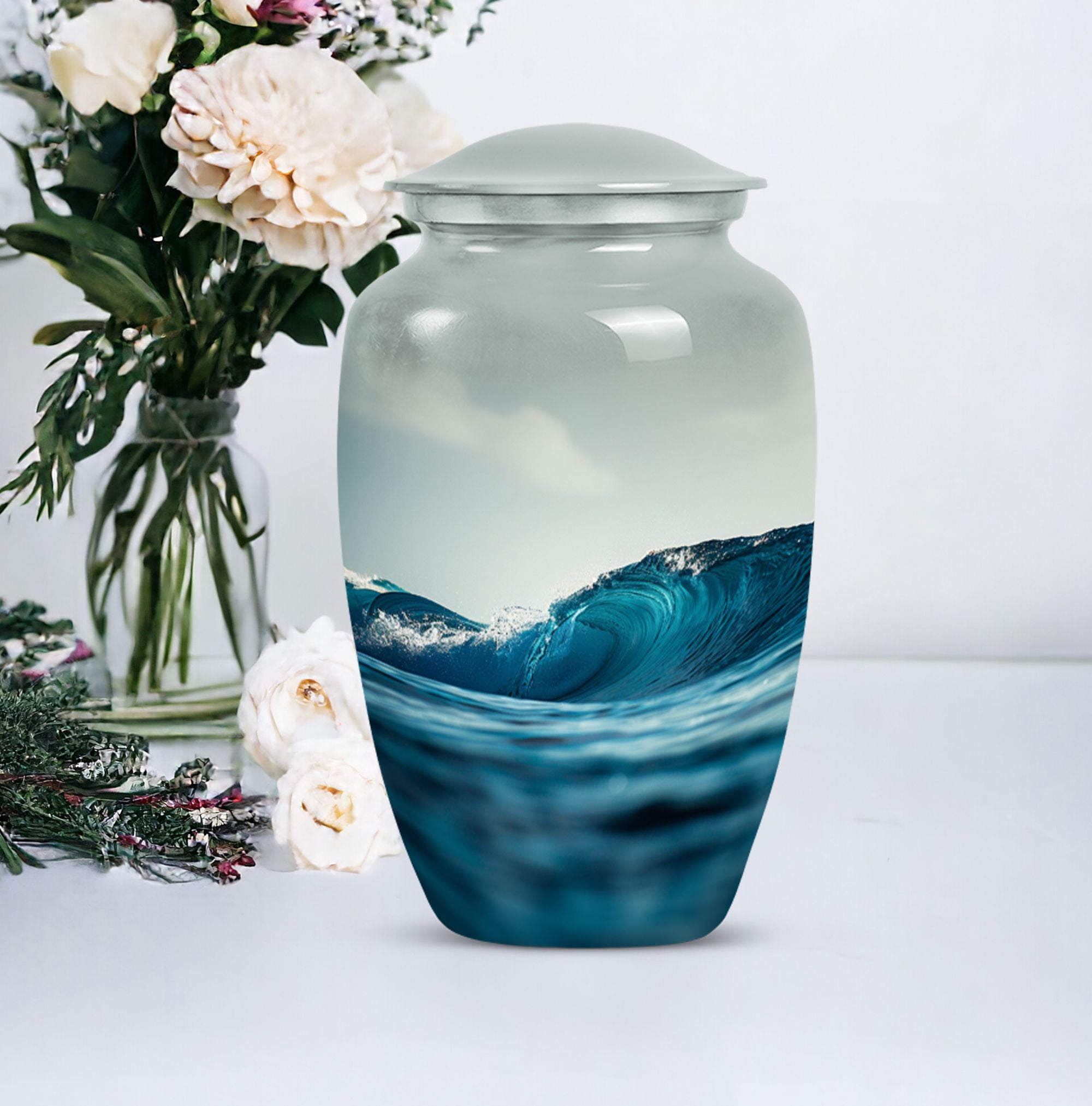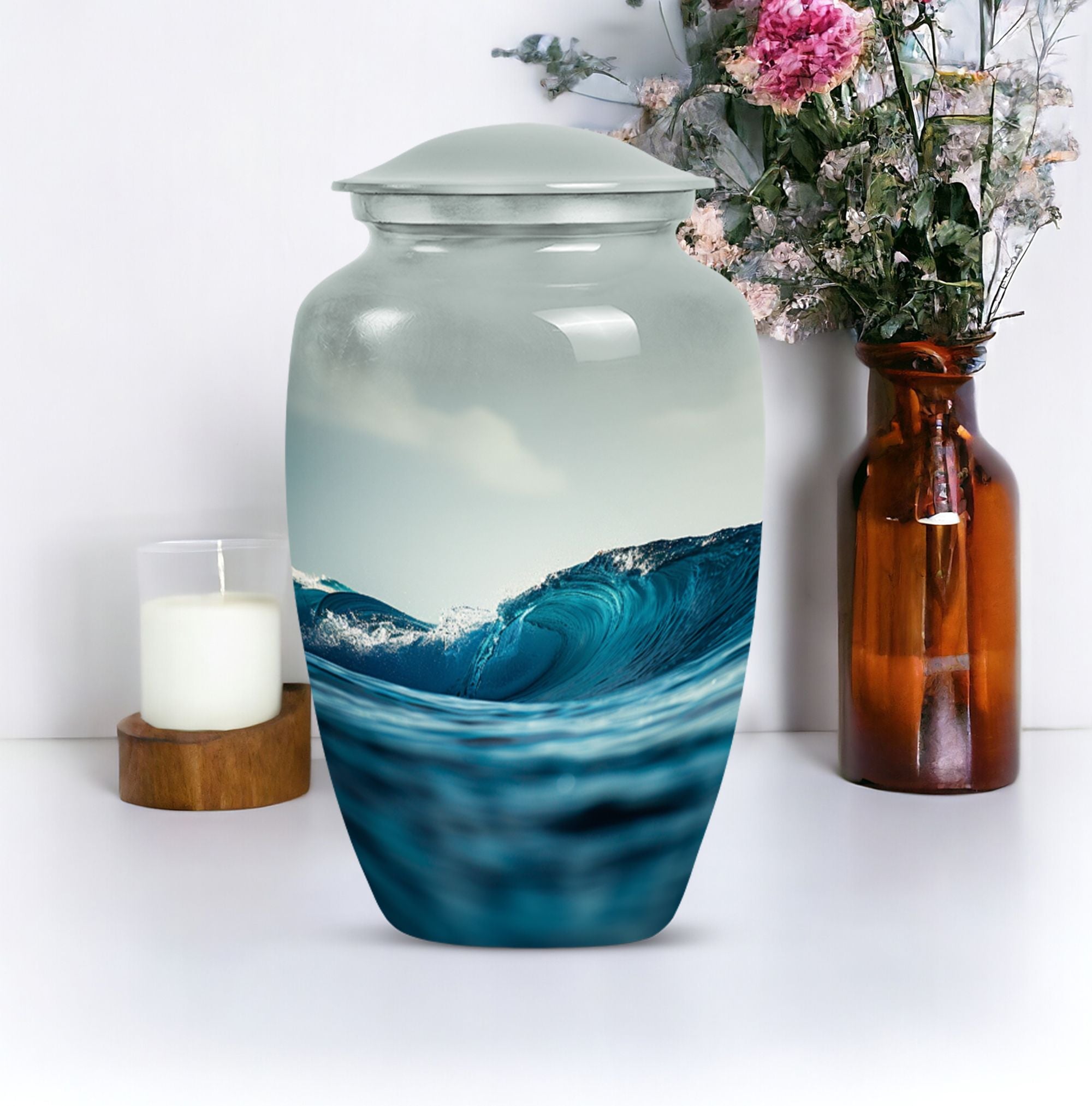 Immerse yourself in the tranquil tranquillity of our 'Ocean Waves Urn'. Specifically targeted towards adults and seniors, this 10-inch Classic Urn, a prominent product in the space of memorial ceremony supplies, manifests a subtle butterfly theme, beautifully symbolizing transformation and the journey to the afterlife. Made of aluminium and weighing 3.3 pounds, it exhibits grandeur without being unmanageably heavy. It holds an ample capacity of 200 cubic inches, making it ideal funeral large urns for both human ashes adult male and female. Thoughtfully, the urn comes with a velvet pouch, adding a layer of delicate containment for the ashes. Additionally, the Ocean Waves Urn offers an option for customization – etch onto it, the precious names of your departed loved ones. So, when you search for 'memorial urns' or 'cremation companion urns', let our product be the beacon that brings resounding peace in remembrance. Note: the urn design refers to its format and does not cover aesthetics.