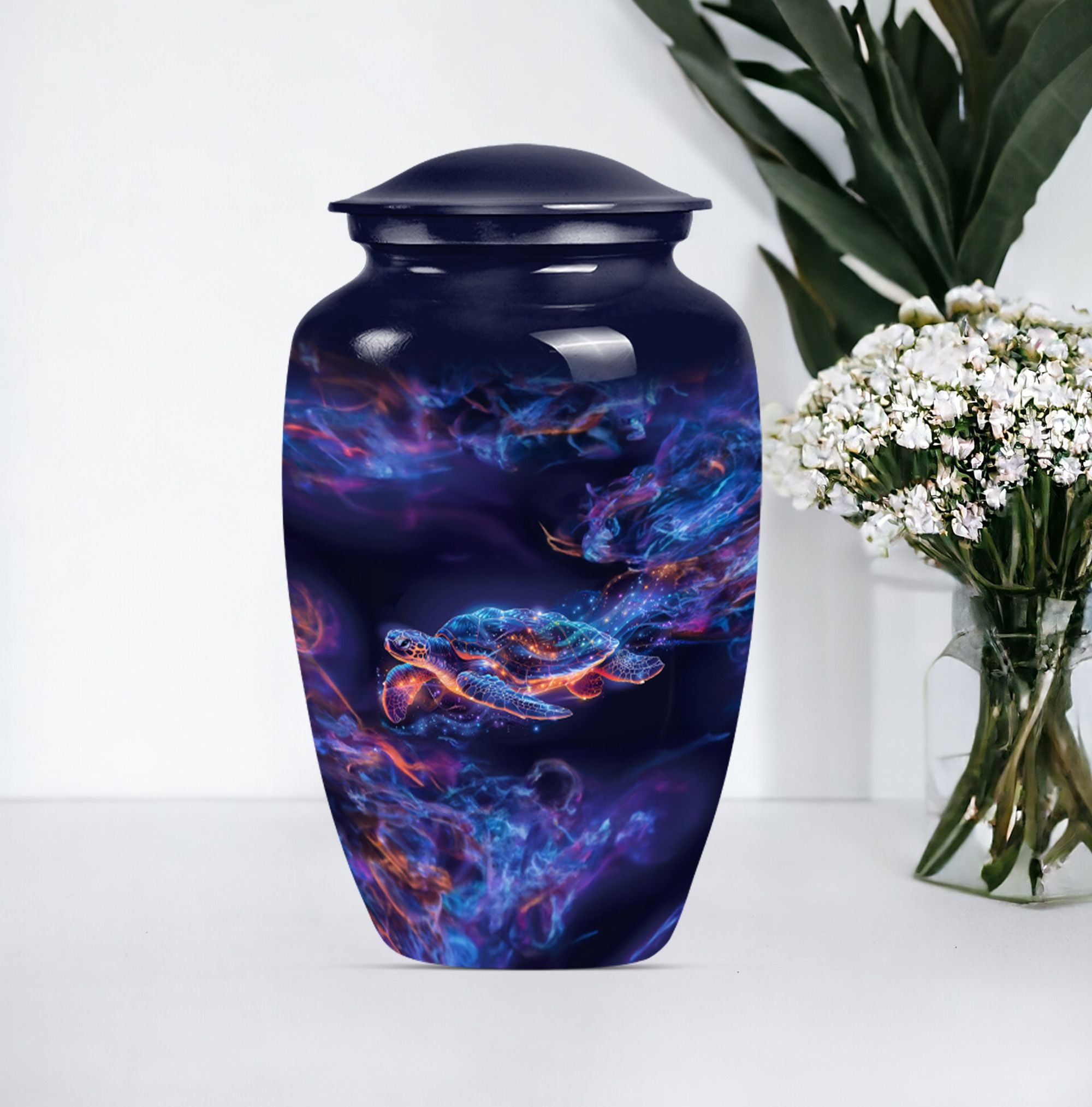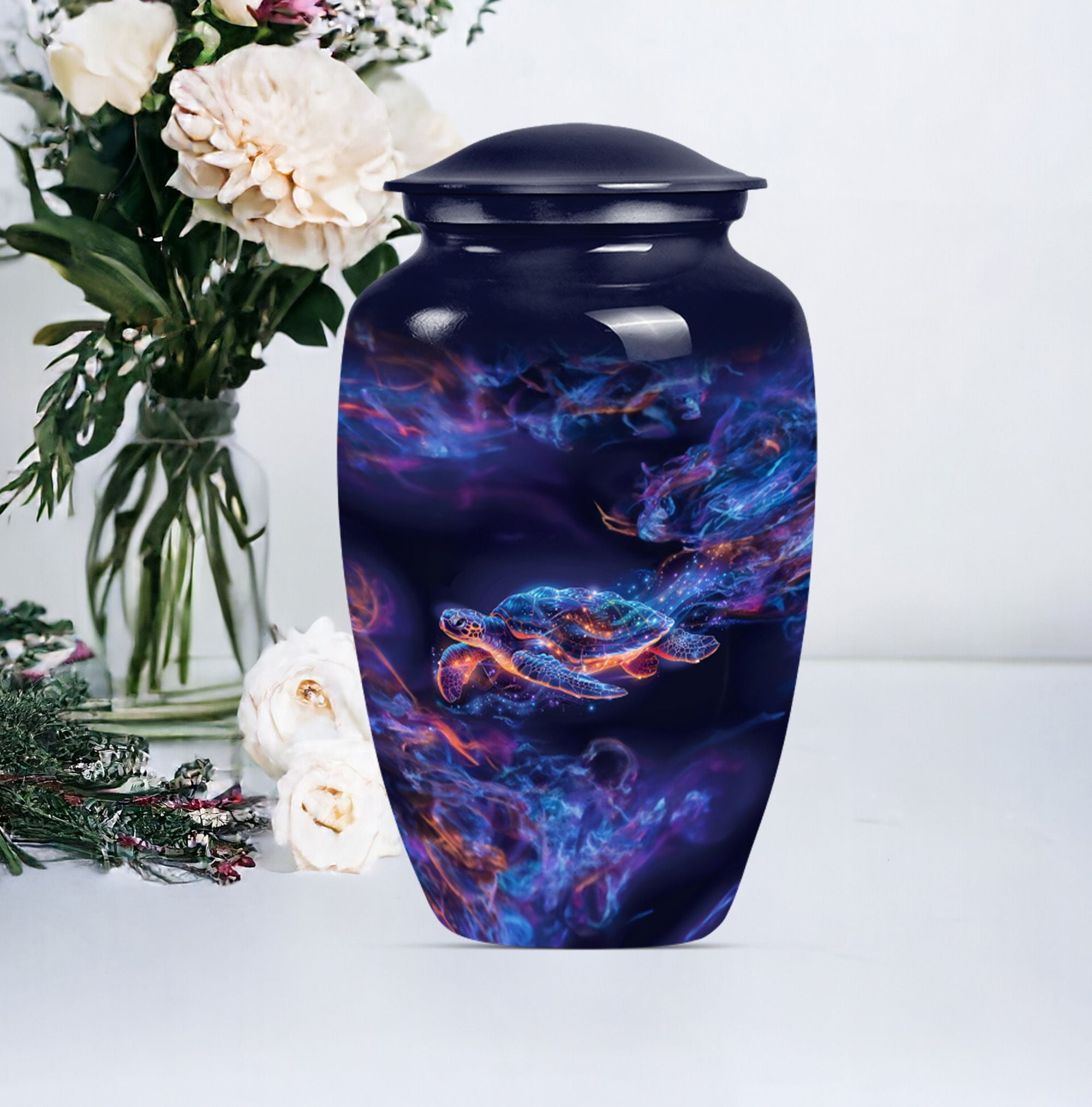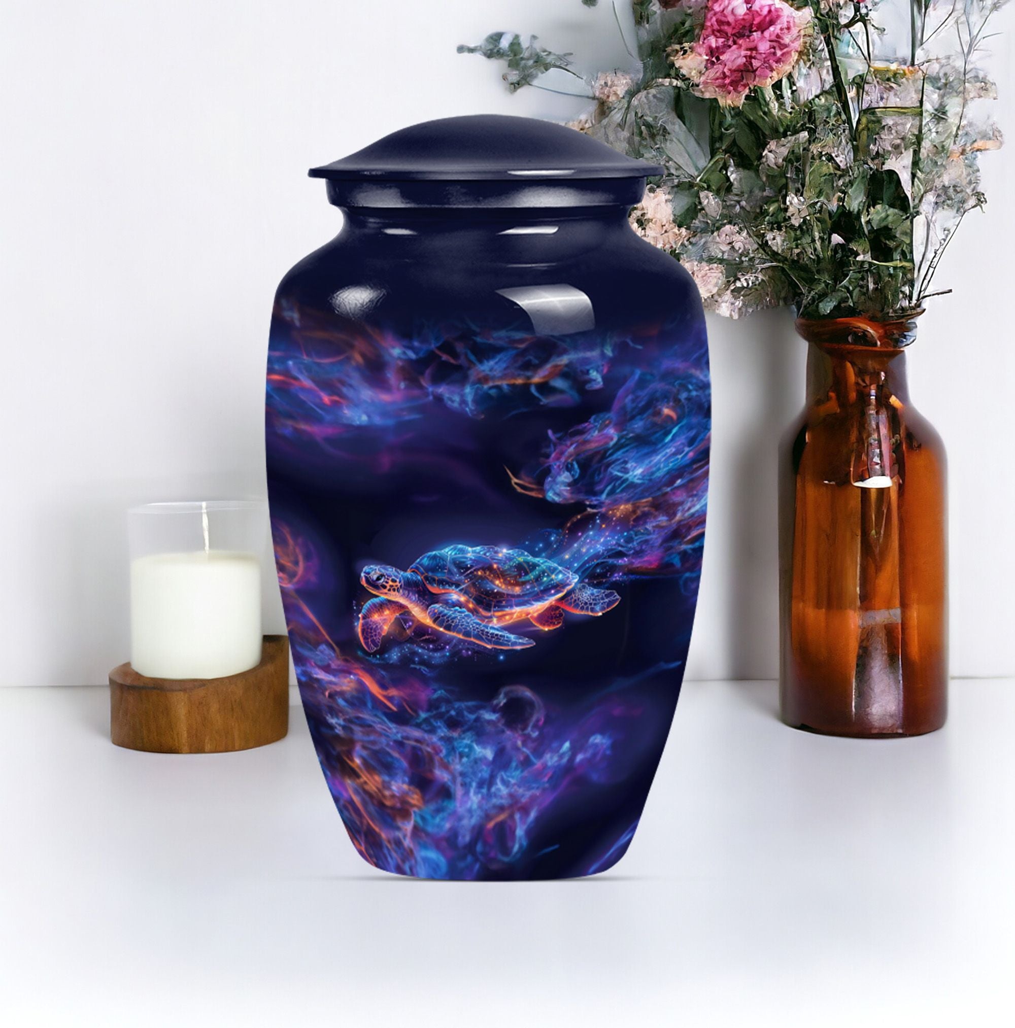 Expertly crafted from durable aluminium, this adult funeral urn features elegant turtle artwork that represents serenity and eternal love. The secure screw-top lid ensures ashes remain safe, offering peace of mind. Whether chosen as an urn for adult female ashes, urns for ashes adult male large, or urn cremation keepsake, this piece reflects harmony and care.