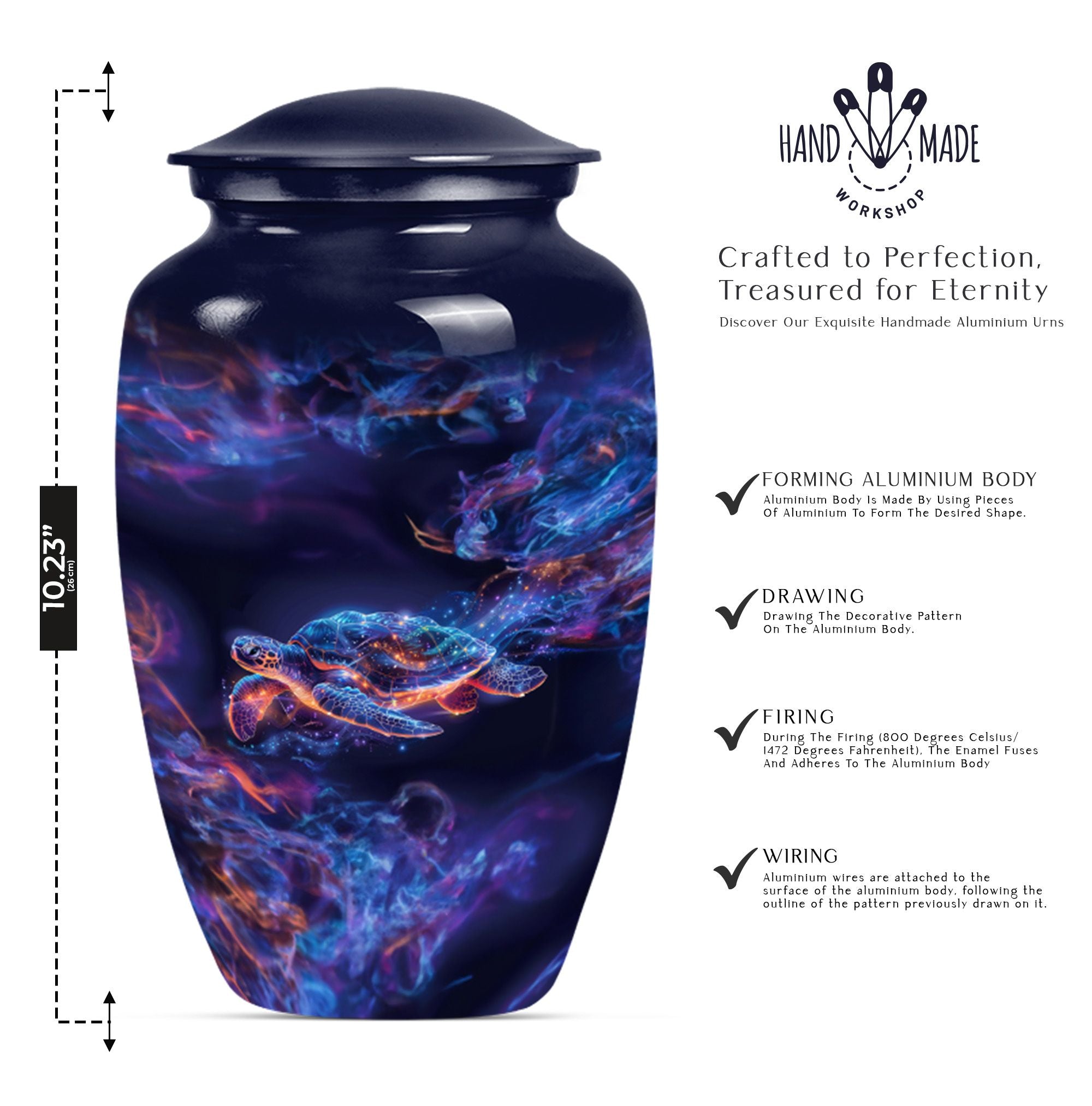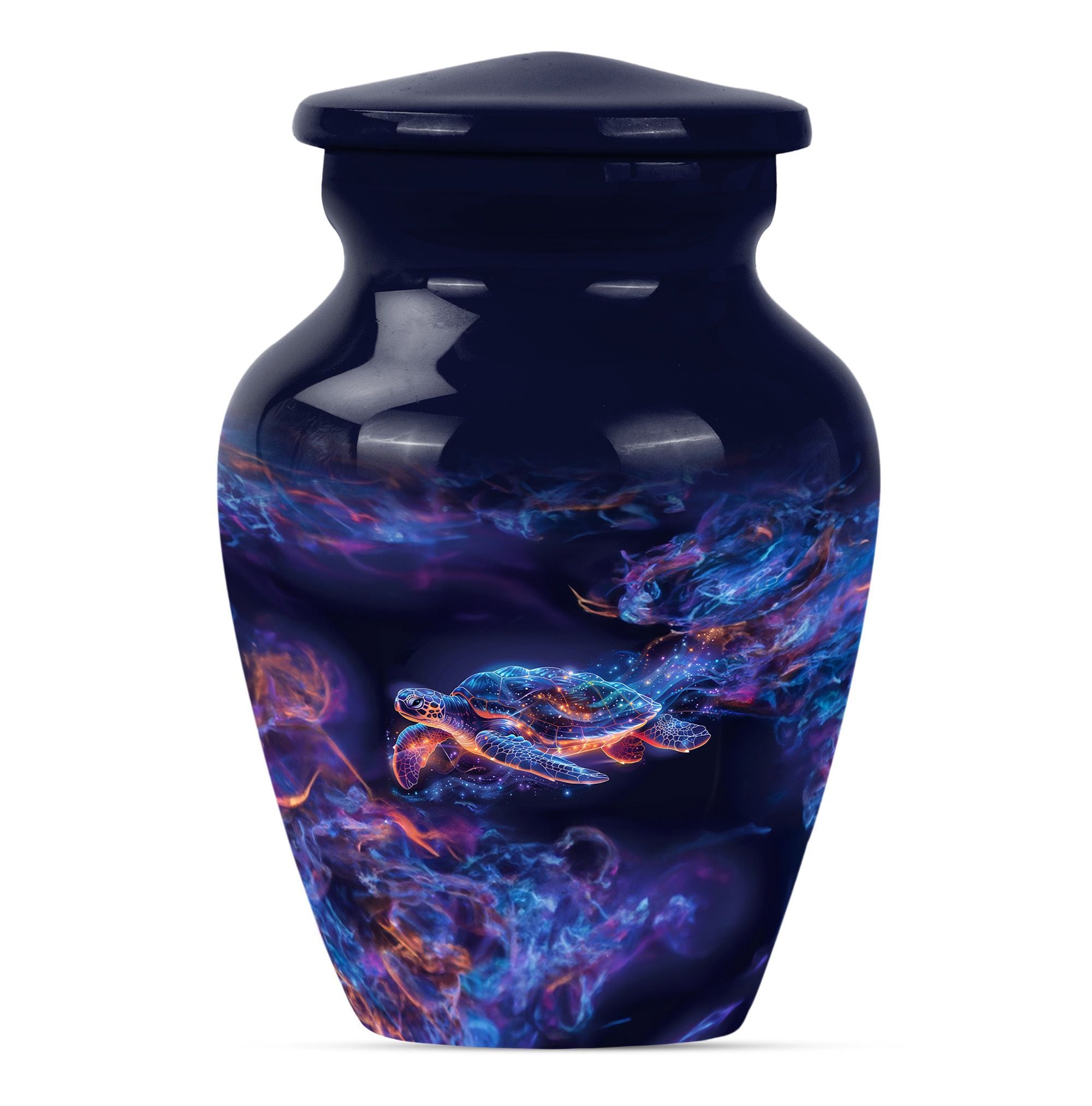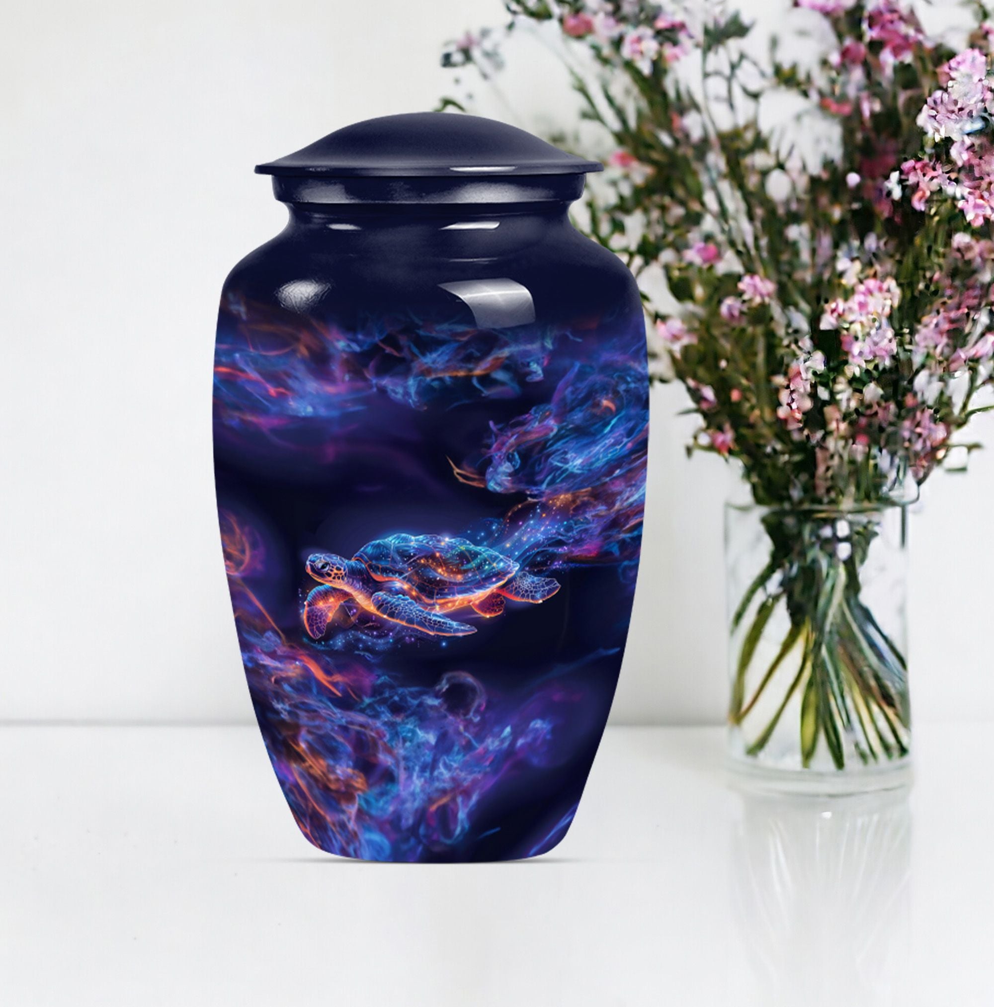 Expertly crafted from durable aluminium, this adult funeral urn features elegant turtle artwork that represents serenity and eternal love. The secure screw-top lid ensures ashes remain safe, offering peace of mind. Whether chosen as an urn for adult female ashes, urns for ashes adult male large, or urn cremation keepsake, this piece reflects harmony and care.