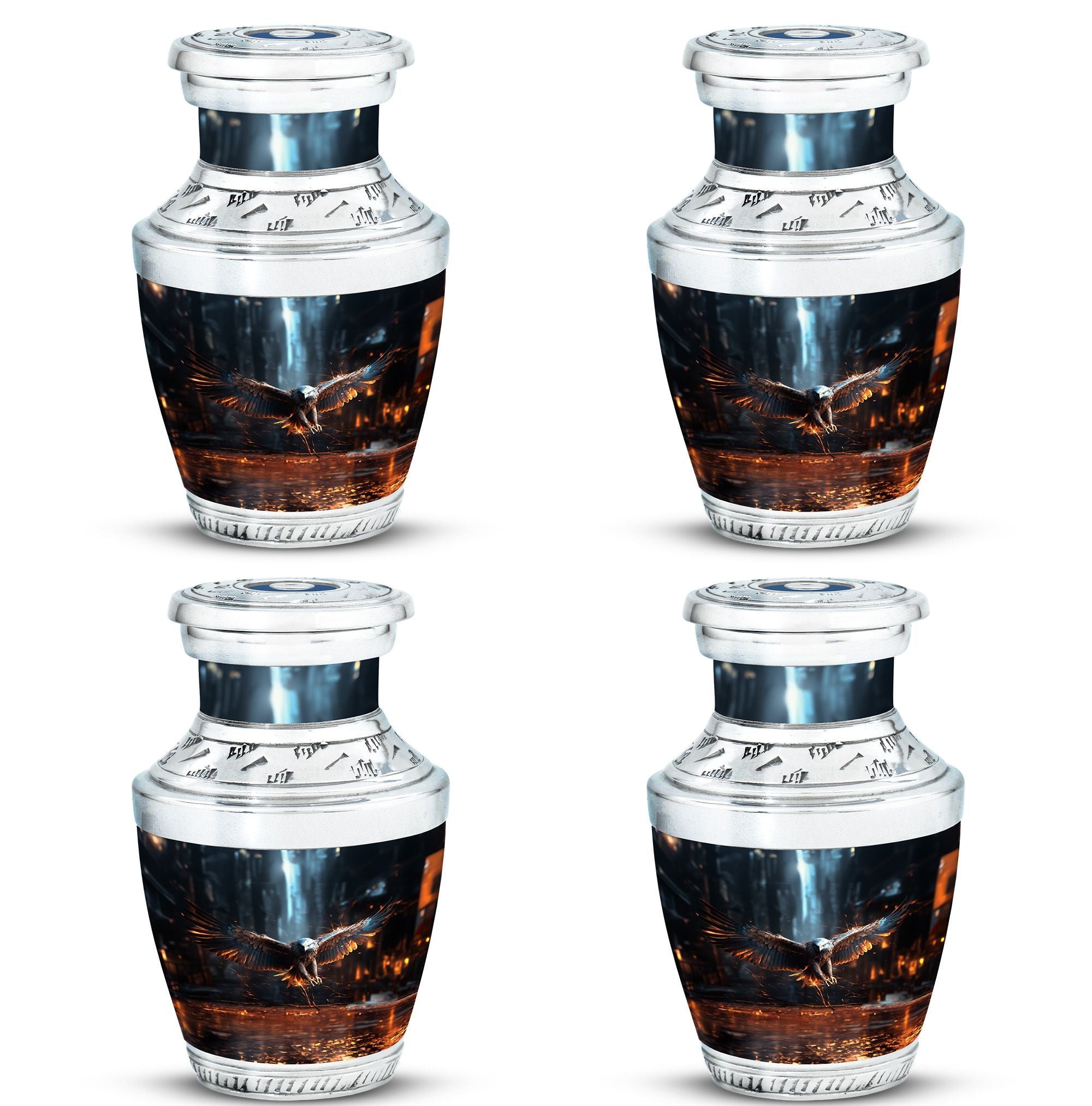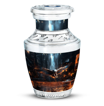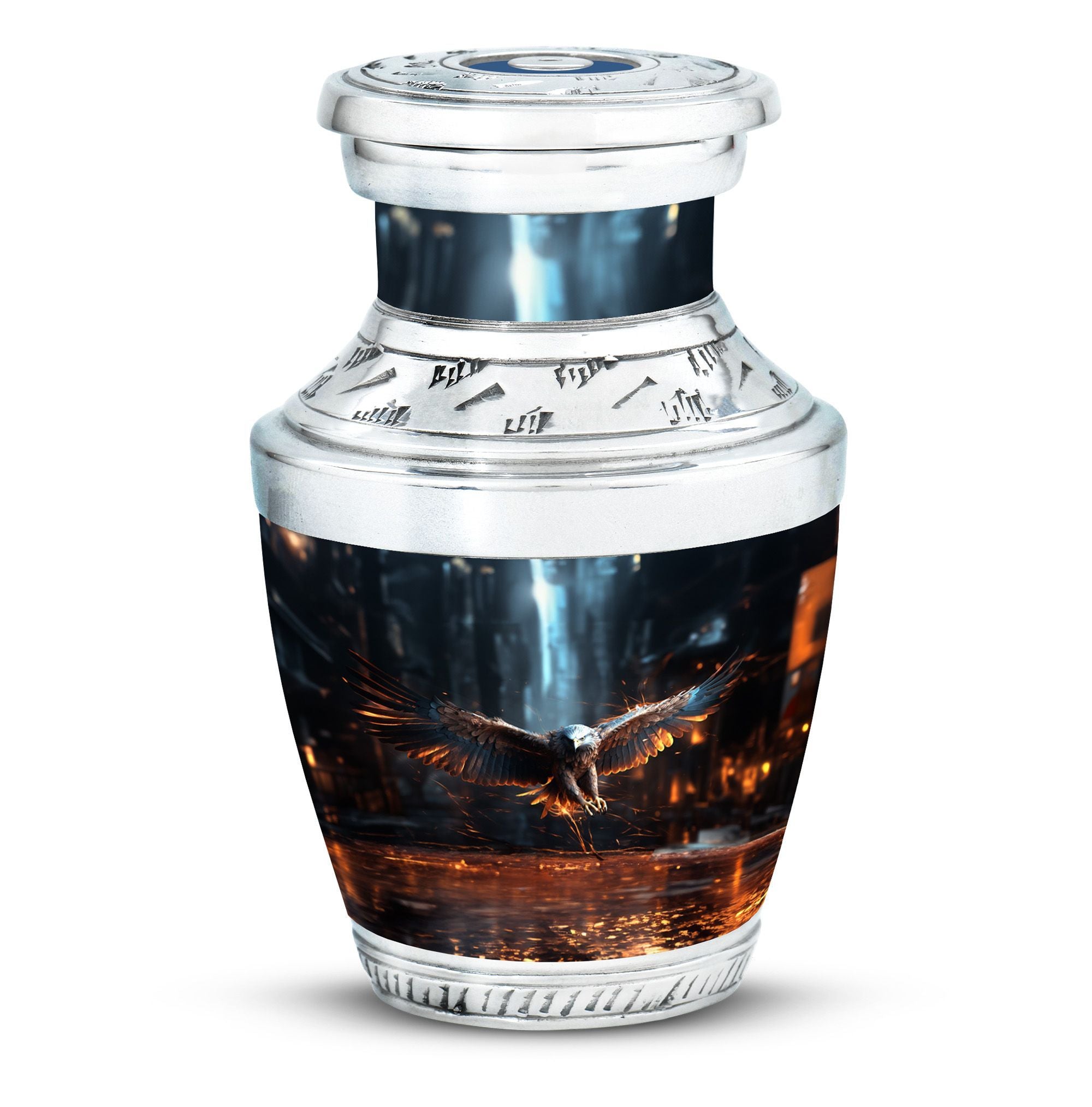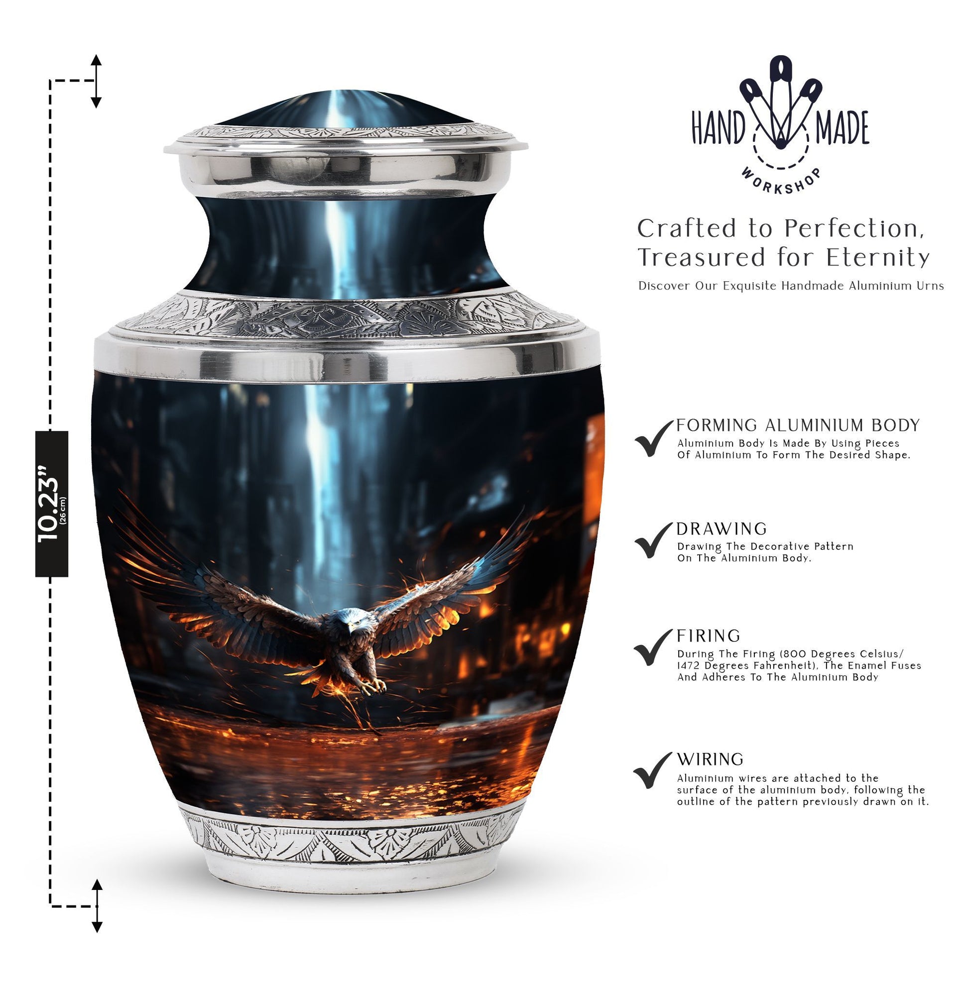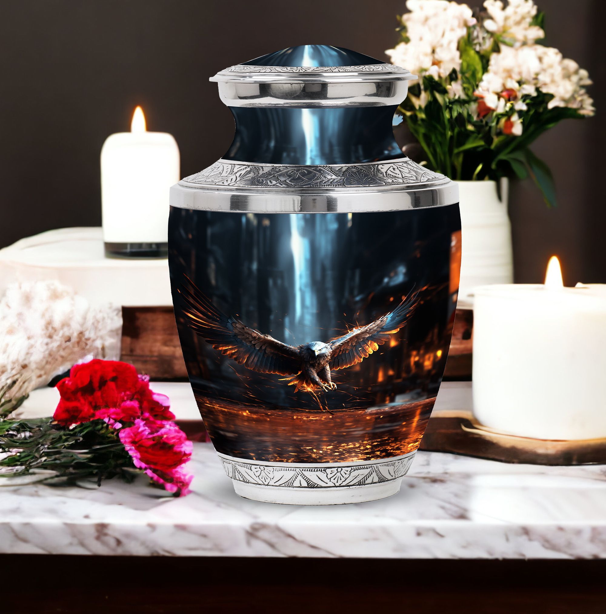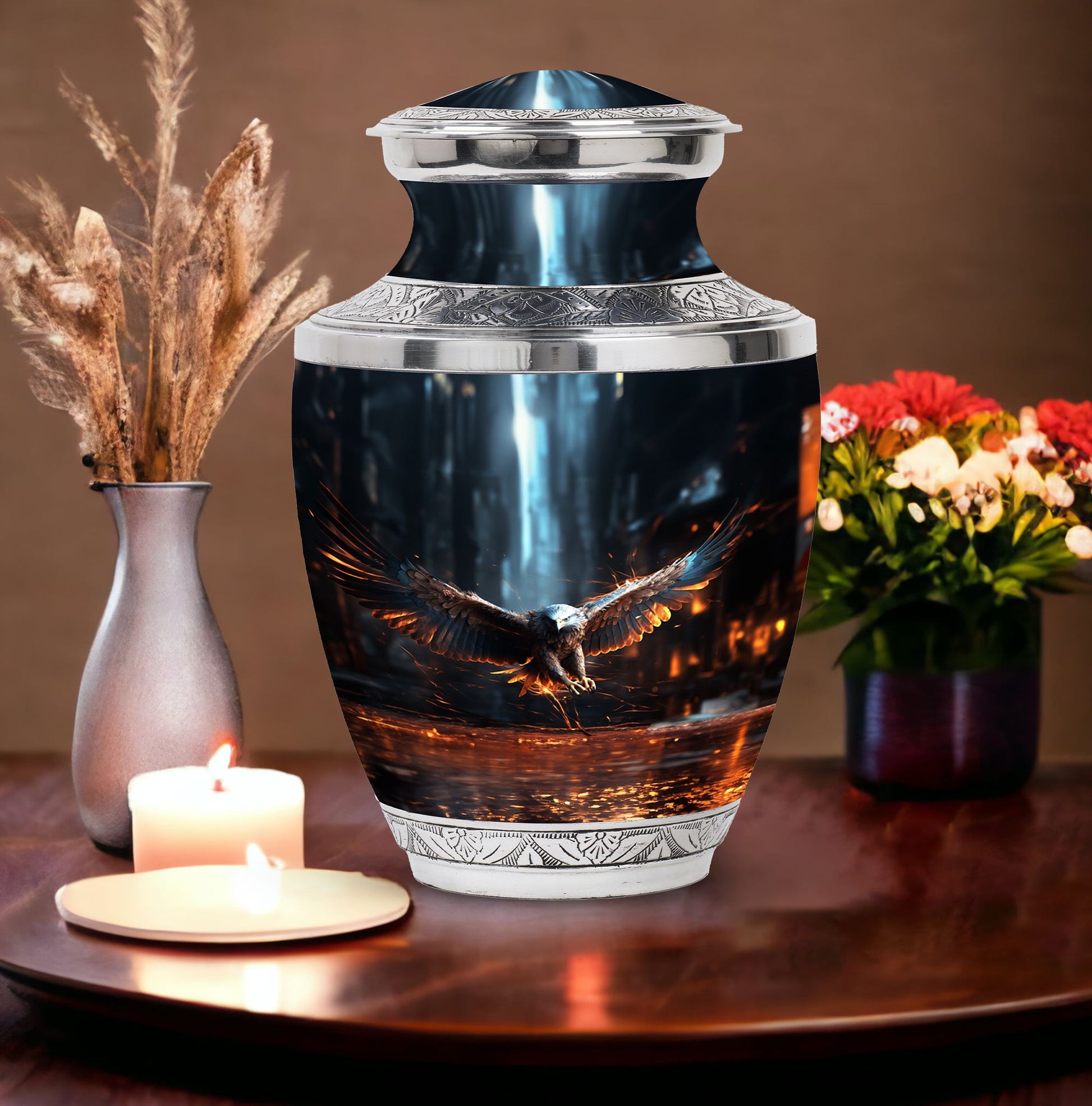 Honor the memory of your loved one with the exquisitely crafted Eagle Urn. This large urn made from high-quality aluminium is skillfully designed to echo fond remembrances. A classic urn, it stands 10 inches tall and can hold up to 200 cubic inches of ashes, making it a fitting tribute to those we hold dear. With a weight of just 3.3 pounds, this urn's manageable size allows for subtle placement at any memorial spot. As part of your purchase, you'll receive a velvet pouch, which can be used to respectfully contain the ashes. As a nod to the uniqueness of each life lived, this urn offers the option for personal customization. Add the engraved names of those whose memory you wish to commemorate, making this urn a timeless piece.
