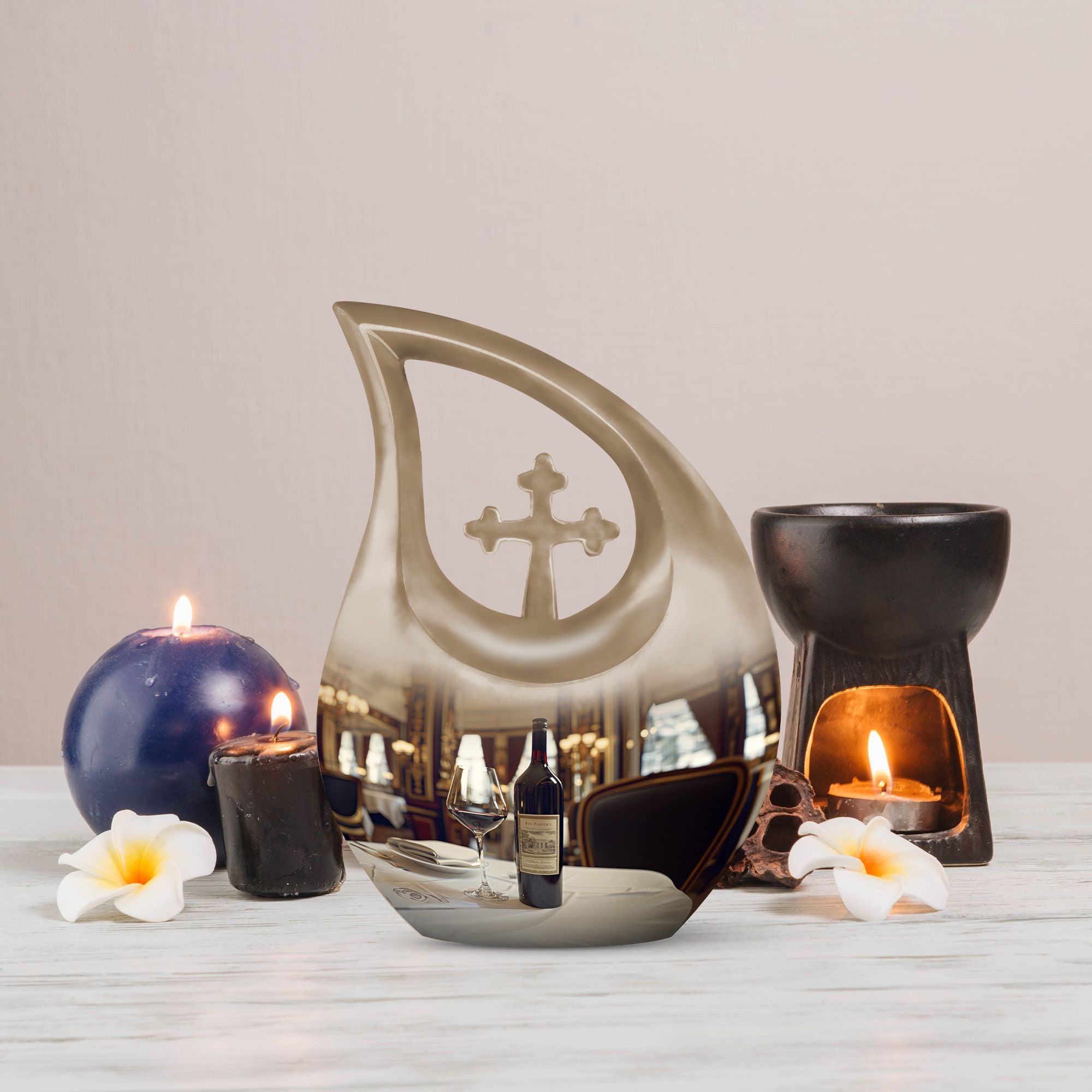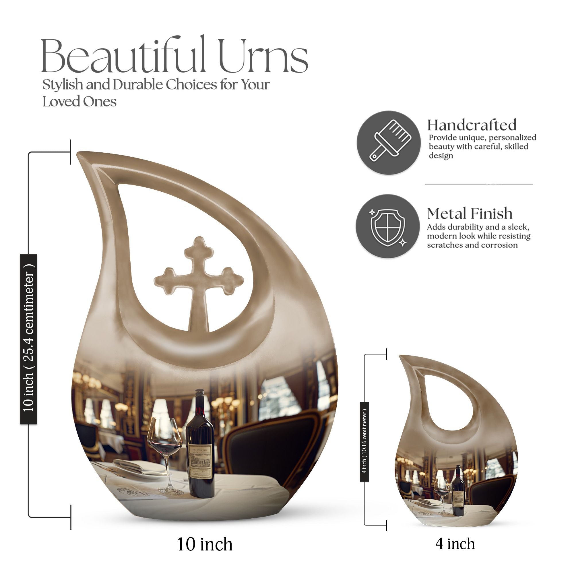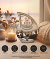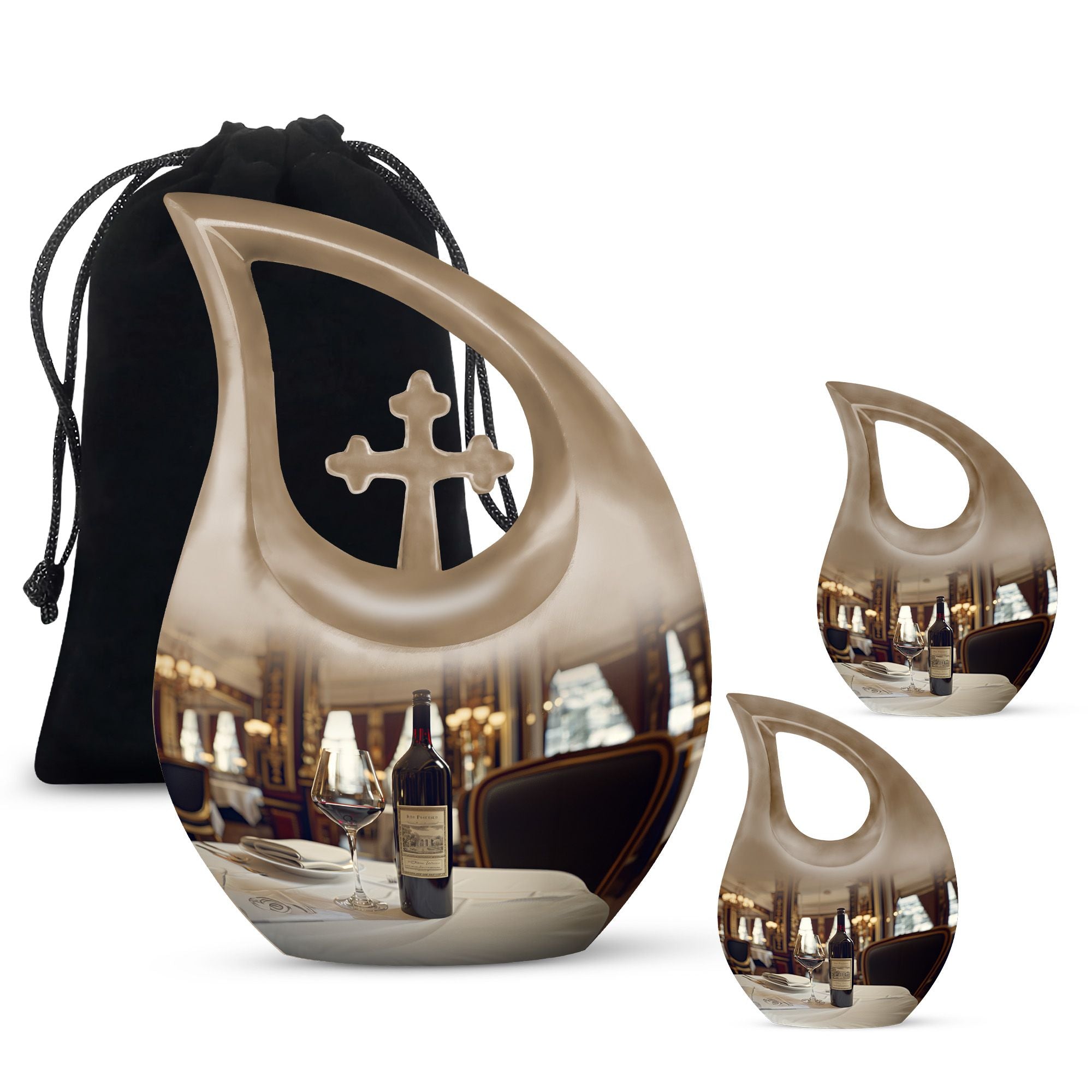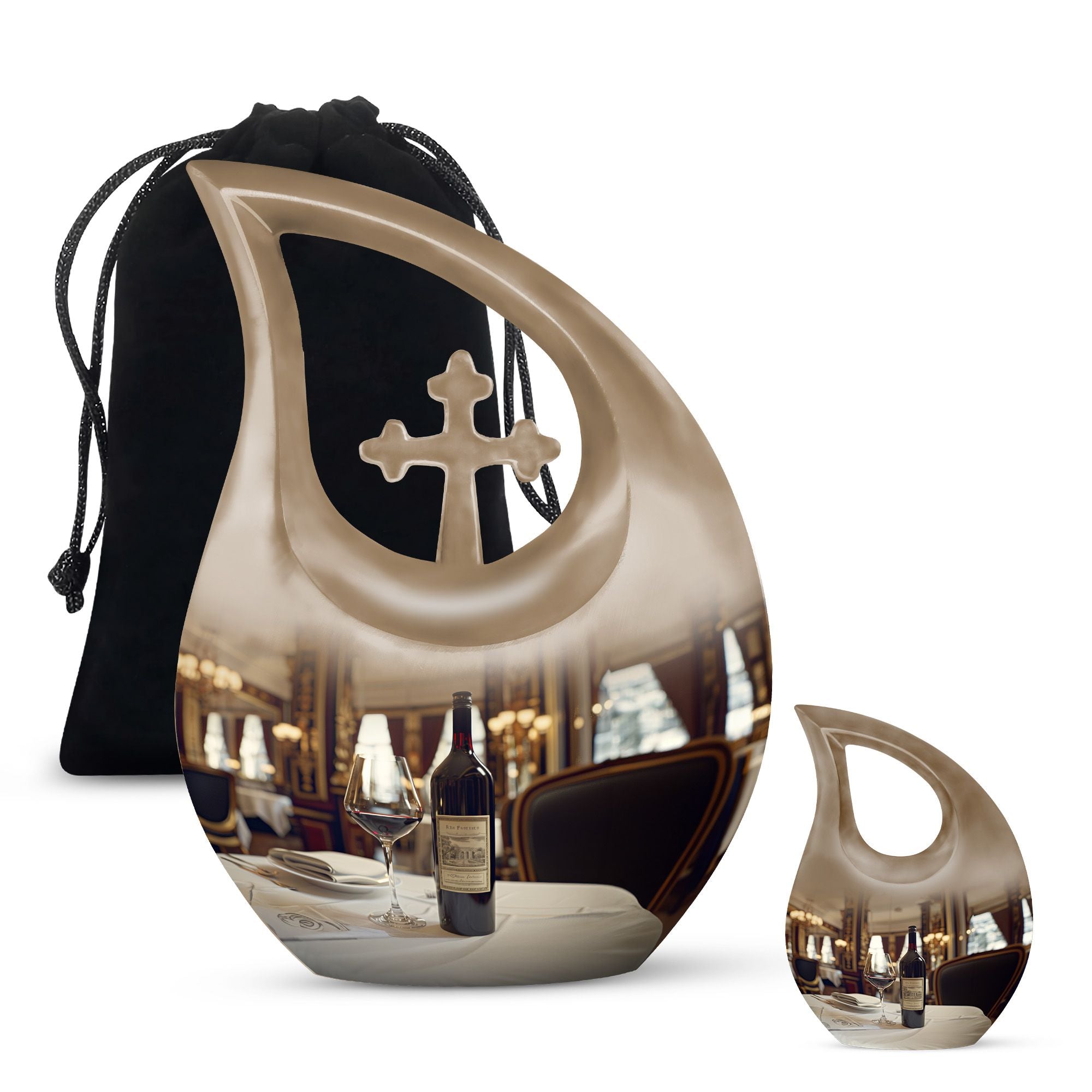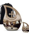 Honor your loved one's memories with an enduring token of remembrance, the Cross Drop Wine Urn. This 10-inch aluminum Memorial Urn for Ashes features an artistic cross-drop pattern and a deep, rich wine theme, suggesting serenity, peace, and strength. Weighing in at 3.3 pounds, our memorial urn provides a spacious capacity of 200 cubic inches, ample room for preserving the ashes of your loved ones. Along with the urn, we offer an elegant velvet pouch for respectful containment of ashes. Goodbyes are difficult, but the right symbol of love makes it slightly easier. This large urn's beauty lies in its customizability—make it special by engraving names on it, adding a personal touch. Our Cross Drop Wine Urn is not just an urn, it's a keepsake that symbolizes endless love and respect. Purchase our finely crafted urns and create a memorial that truly reflects the spirit of your loved ones.