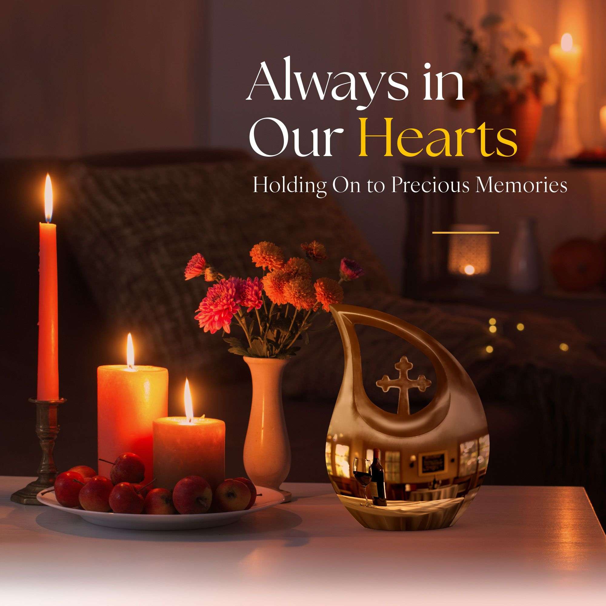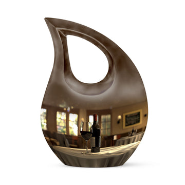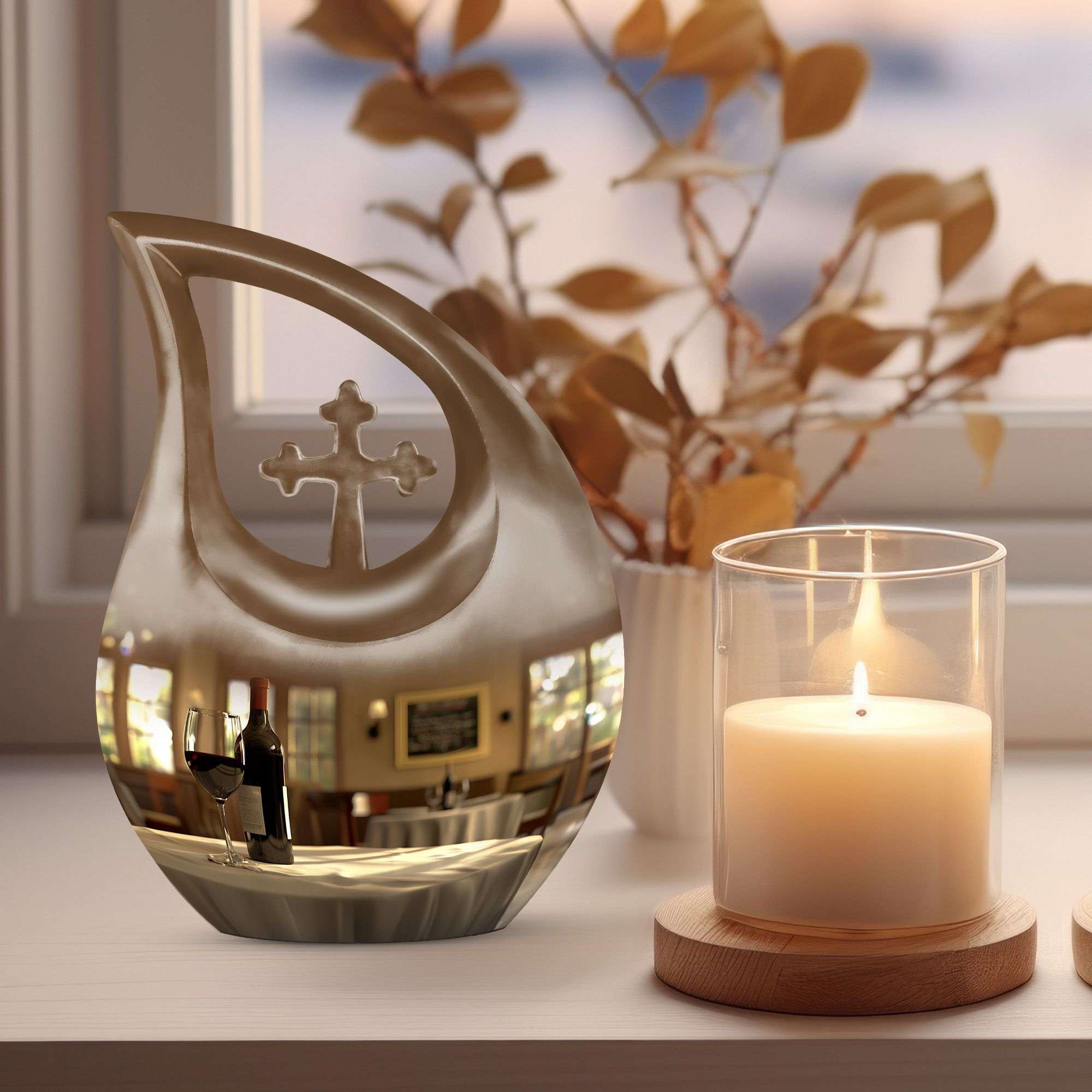 Capture the essence of your loved one's memory with this stunningly crafted Wine Cross Drop Urn. This 10-inch urn embodies a blend of reverence and elegance, balancing the solemn act of remembering a dear one with the beauty of its wine-themed design. This cremation box is a substantial piece, weighing 3.3 pounds, and has the capacity to hold 200 cubic inches of ashes. Manufactured from high-quality aluminium, the urn is not only sturdy, but also has an aesthetic appeal that adds grace to any memorial ceremony. One special feature of this urn is the opportunity to personalize it with engraved names - a heartfelt way to carry reminders of a personal bond. Each urn is accompanied by a velvet pouch, providing a delicate and respectful containment for the ashes. The Wine Urn is an ideal choice for individuals seeking memorial urns, cremation boxes, or even mini urns for ashes. This urn shines in its unique class, standing out amongst purple urns or small urns for ashes with its distinct presentation and dignified design.