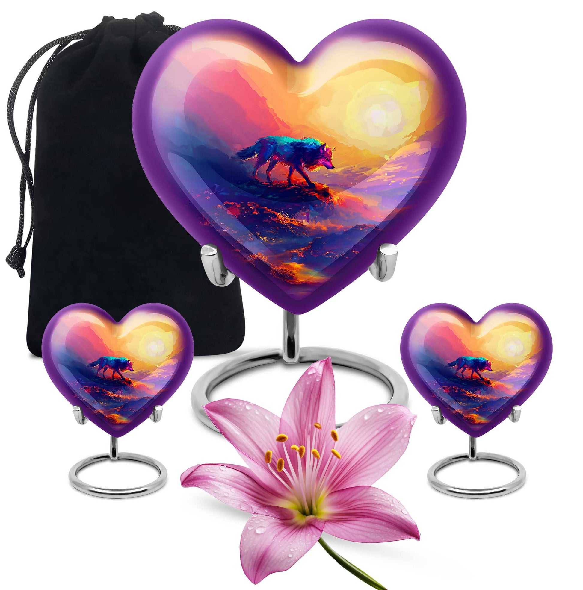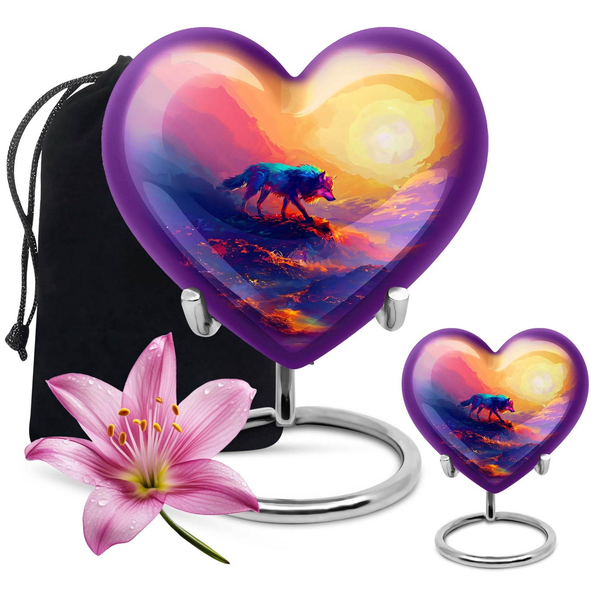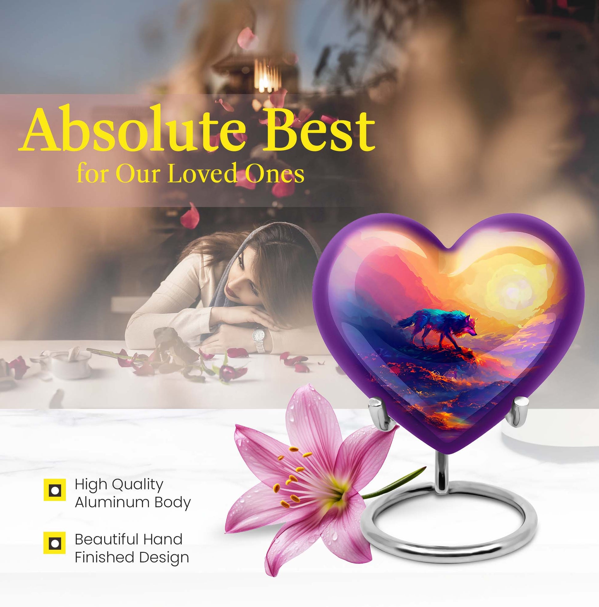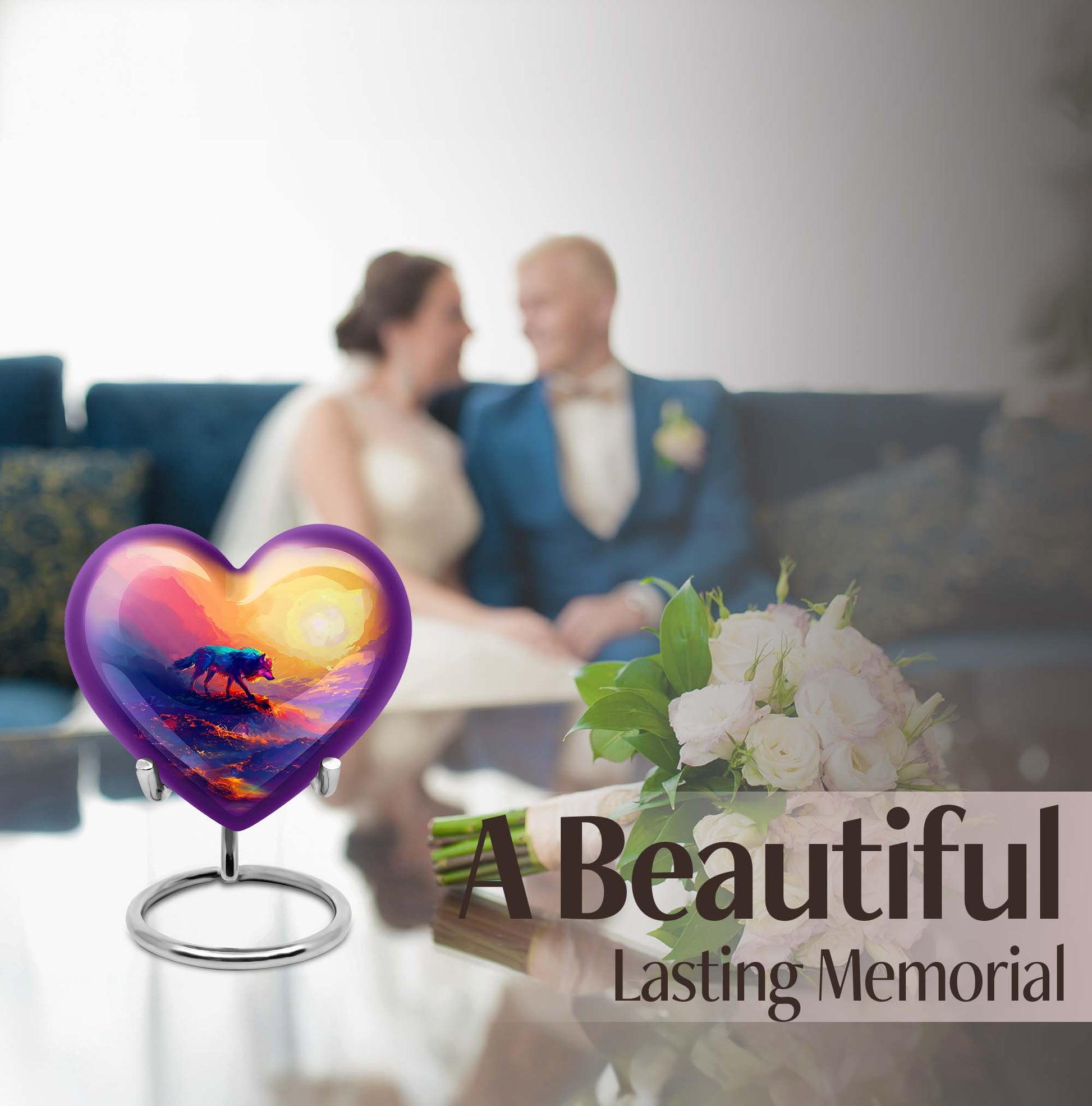 Reminiscent of abstract artistry and enduring craftsmanship, this magnificent Wolf Urn is an epitome of honor, resiliency, and spiritual connection. Molded from durable Aluminium, the large urn weighs 3.3 pounds and stands at 10 inches in height, making it a notable piece for serene reflection. Its unique heart shape offers a tender tribute to the departed soul. Primarily designed to serve as a Cremation Urn, it can hold up to 200 cubic inches of ashes. The package includes a plush velvet pouch for dignified containment of ashes and promises a secured place for your cherished reminiscences. One fascinating feature permits personal customization. You can personalize the urn with engraved names, immortalizing a tangible testament of love and fetching memories. This Burial urn also doubles as a multipurpose urn - aptly sized for an inclusive photo frame. Certainly, not typical funeral urns, rather a gentle commemoration of life lived with passion. The keywords to locate this unique artifact online would be 'wolf urn', 'cremation urn for ashes', 'burial urn for cremation', 'multipurpose urn with photo frame', and 'funeral urns for adult ashes women'.