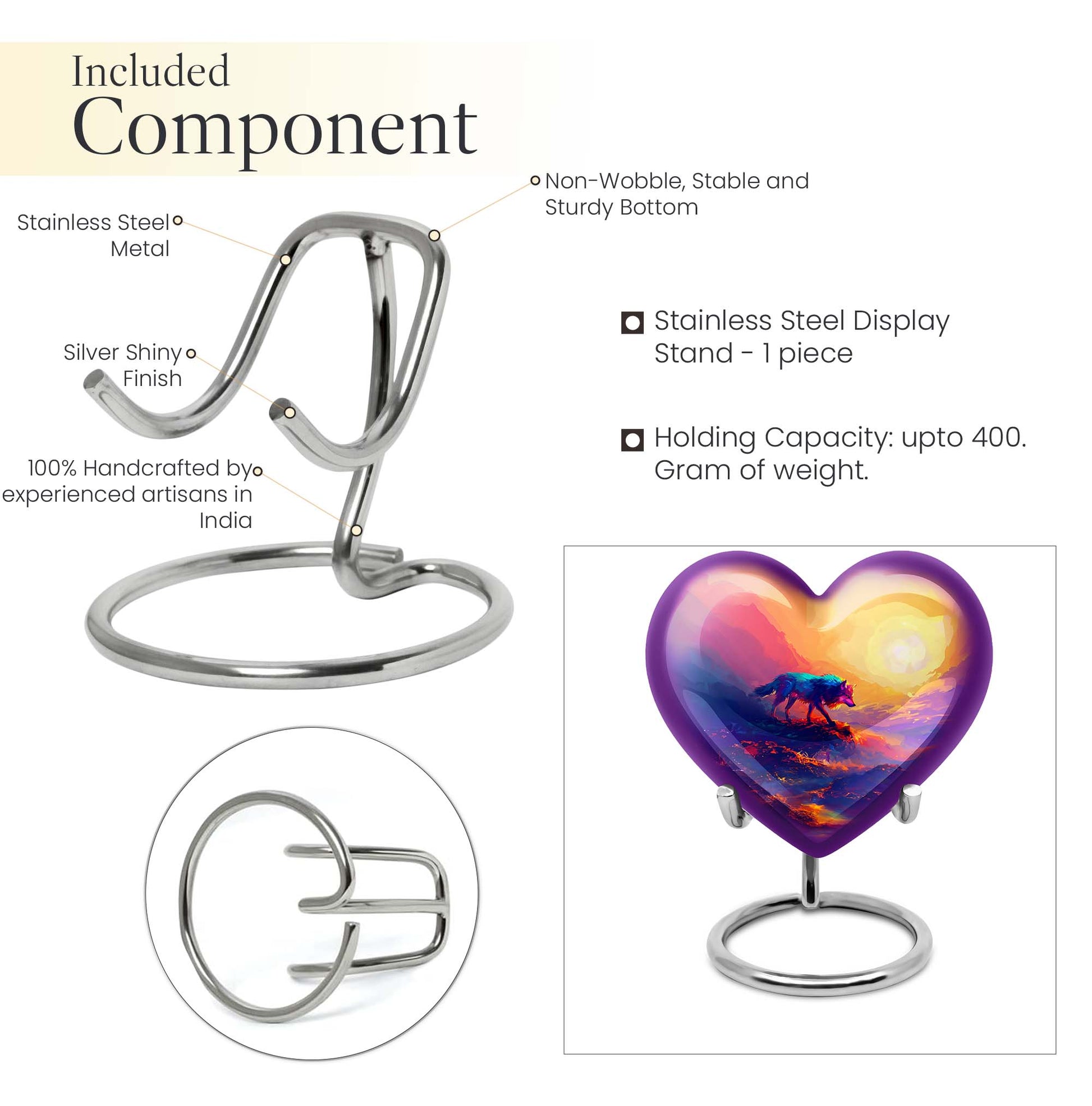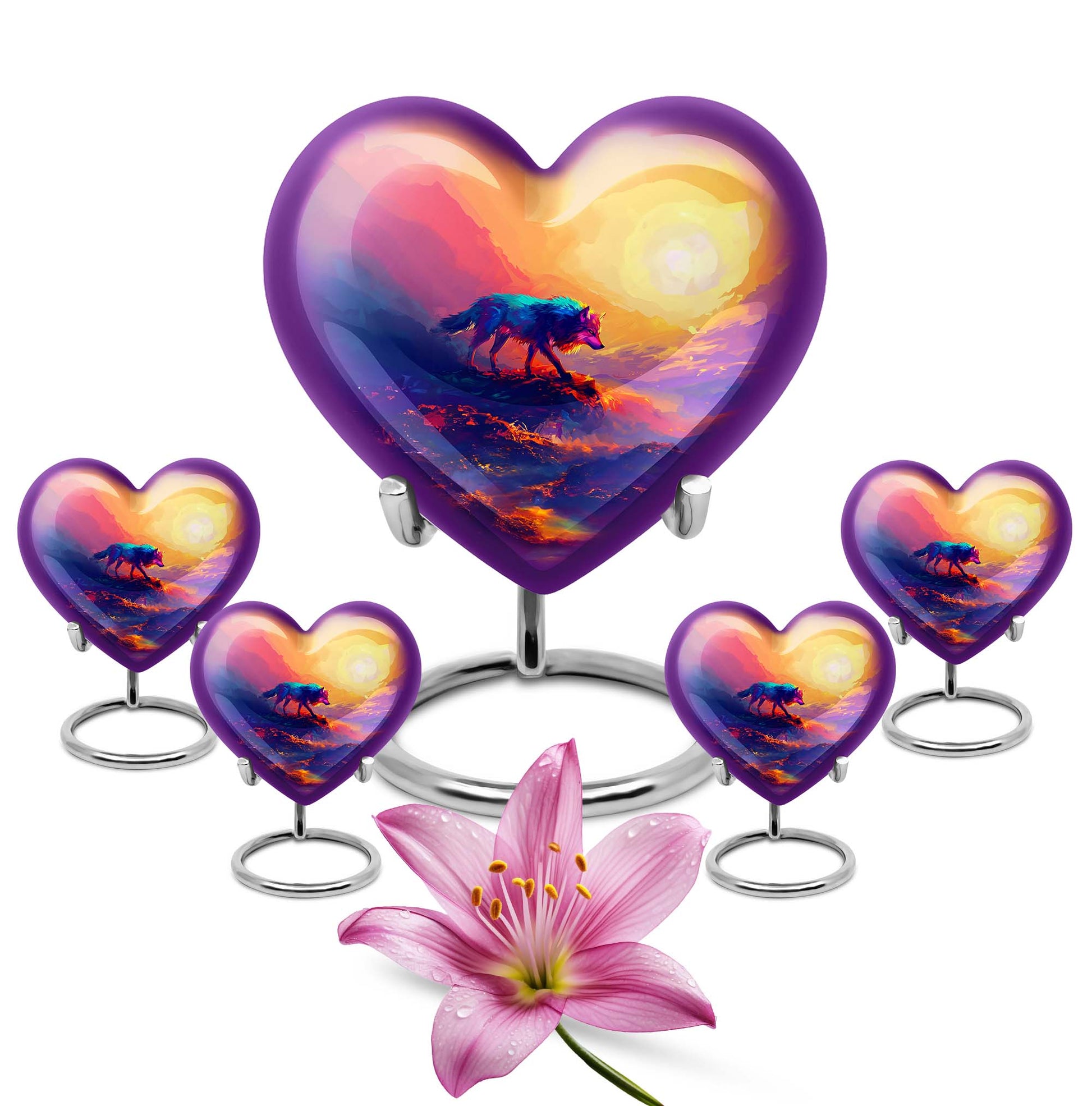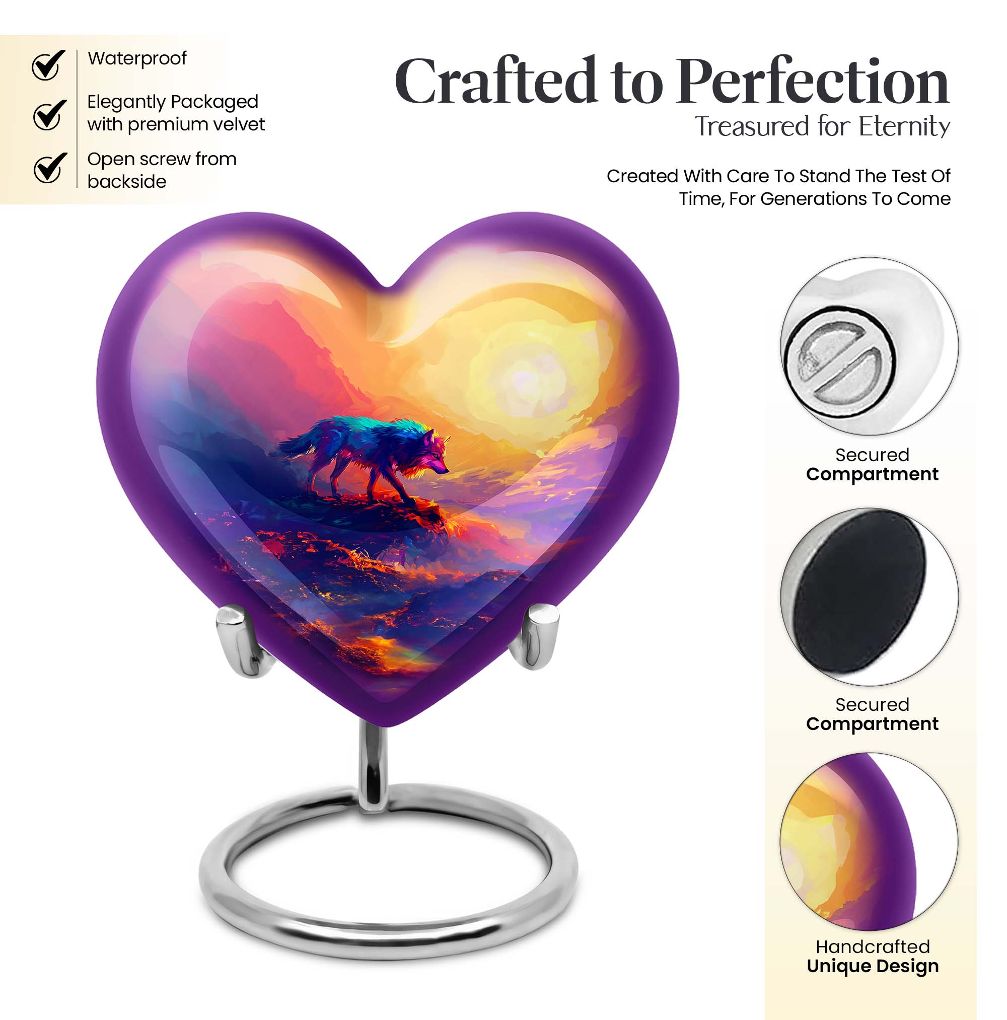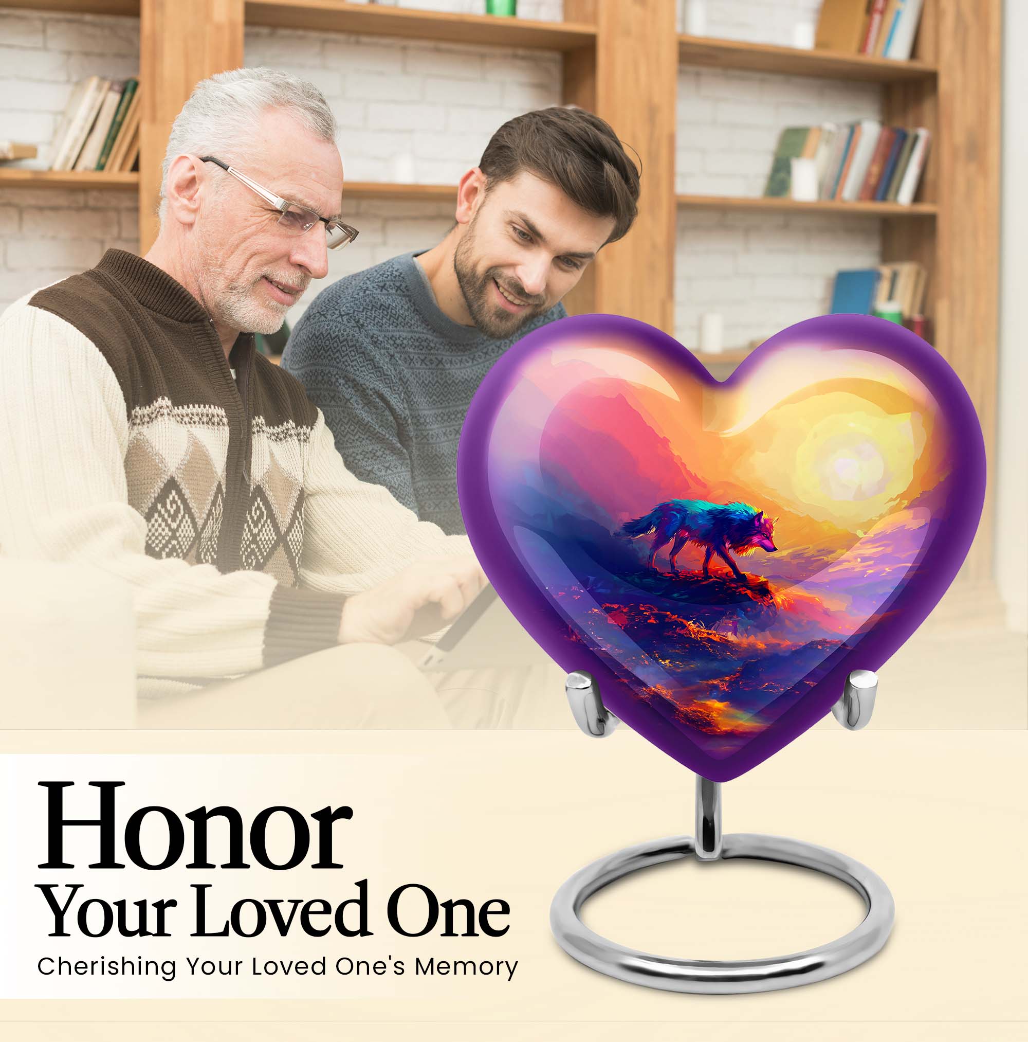 Reminiscent of abstract artistry and enduring craftsmanship, this magnificent Wolf Urn is an epitome of honor, resiliency, and spiritual connection. Molded from durable Aluminium, the large urn weighs 3.3 pounds and stands at 10 inches in height, making it a notable piece for serene reflection. Its unique heart shape offers a tender tribute to the departed soul. Primarily designed to serve as a Cremation Urn, it can hold up to 200 cubic inches of ashes. The package includes a plush velvet pouch for dignified containment of ashes and promises a secured place for your cherished reminiscences. One fascinating feature permits personal customization. You can personalize the urn with engraved names, immortalizing a tangible testament of love and fetching memories. This Burial urn also doubles as a multipurpose urn - aptly sized for an inclusive photo frame. Certainly, not typical funeral urns, rather a gentle commemoration of life lived with passion. The keywords to locate this unique artifact online would be 'wolf urn', 'cremation urn for ashes', 'burial urn for cremation', 'multipurpose urn with photo frame', and 'funeral urns for adult ashes women'.