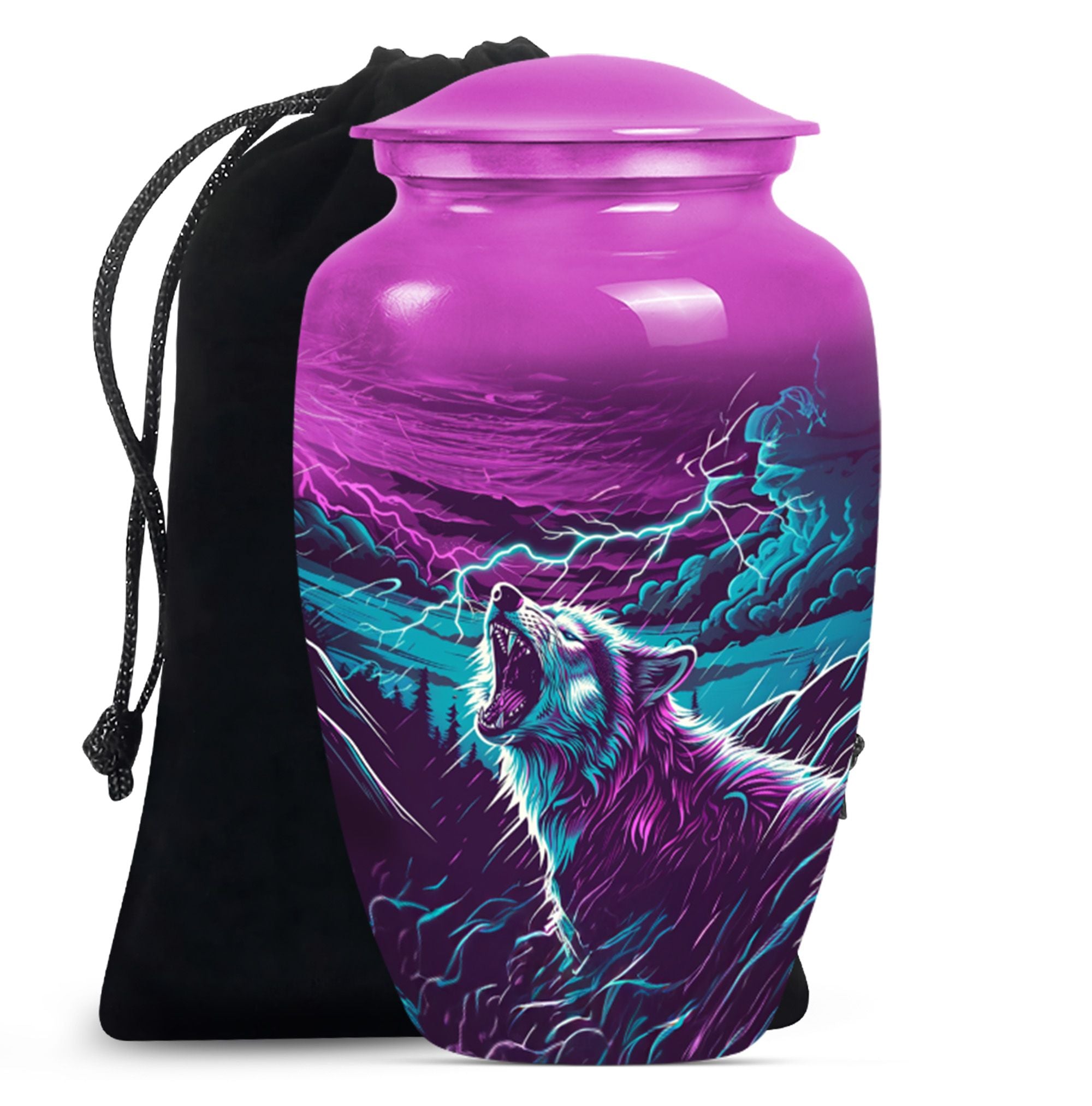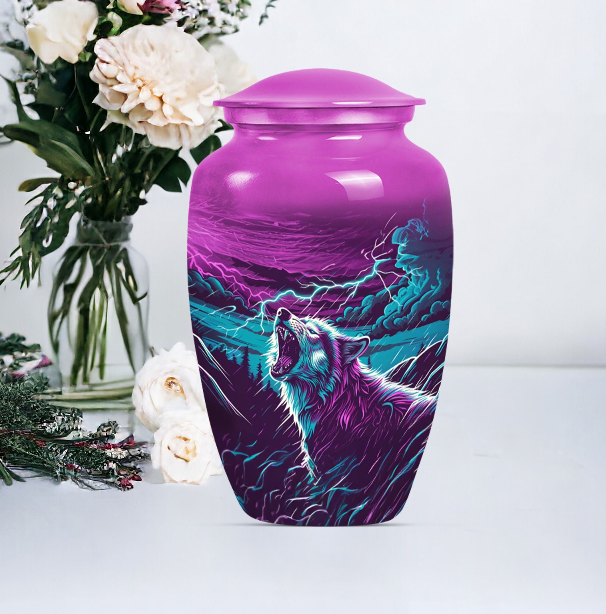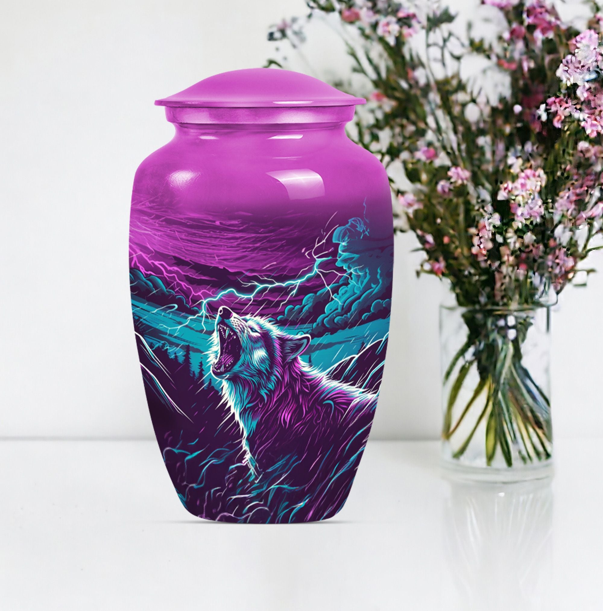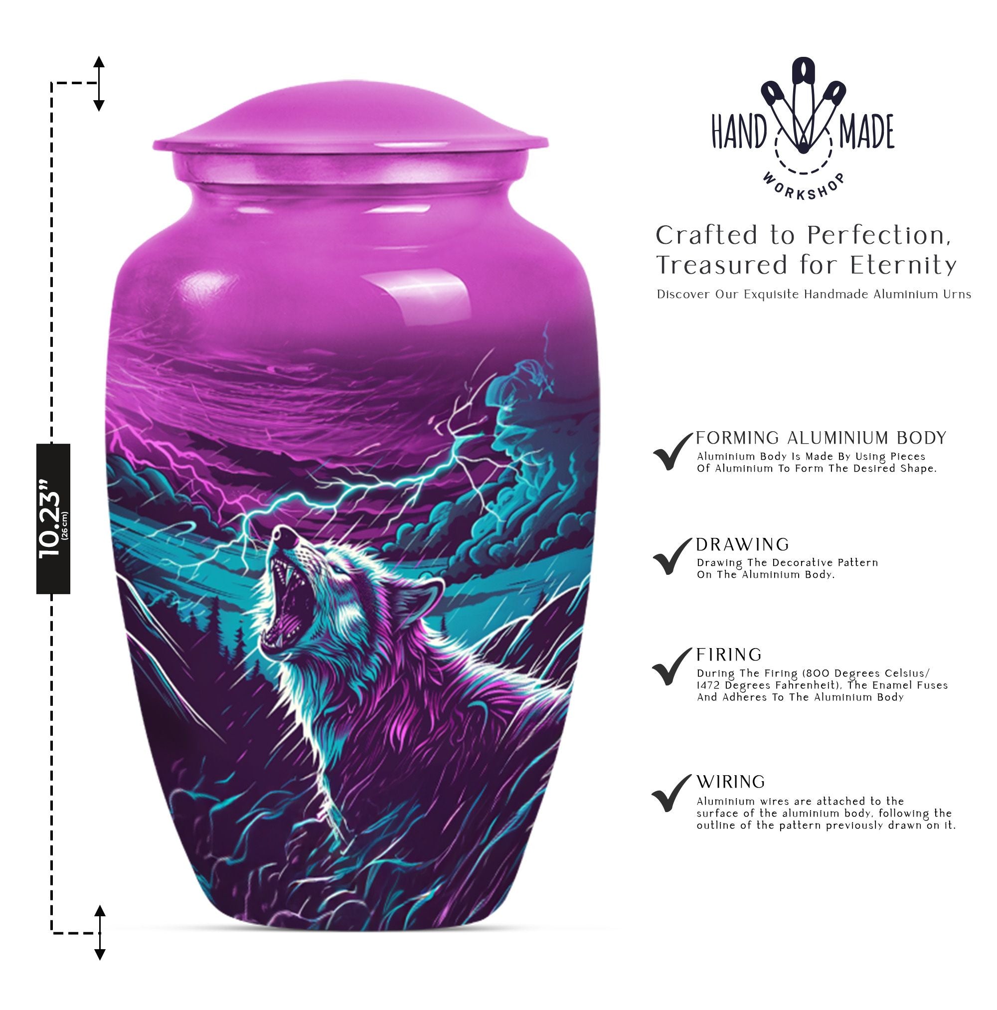 With reverence, honor the life and memory of your loved one with our exceptional 'Wolf Urn.' This large 10-inch burial urn for cremation ashes, exuding the nobleness of aluminium, is a poignant tribute. With a capacity of 200 cubic inches, it stands as a tangible symbol of remembrance that commands respect. It weighs 3.3 pounds and its dimensions trumpet its towering strength. The urn comes with a plush velvet pouch for secure containment of your beloved's ashes, offering an elegant touch to the occasion. Further, personalize this classic urn with engraved names to add a unique sentiment. This abstract-themed urn characterizes a blend of art and emotion. Ingenious for urban homes, it serves as a decor urn for both men and women, fulfilling your need for a compact man or woman metal cremation urn. Highly searched primary and secondary keywords like 'Wolf Urn', 'Burial urns for cremation ashes mother', 'Cremation urn for adult male ashes' are strategically integrated to ensure easy and quick searchability for this poignant possession.