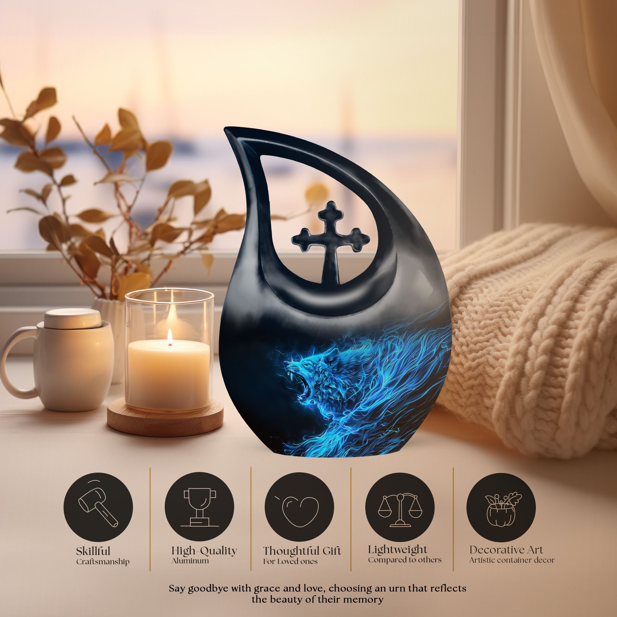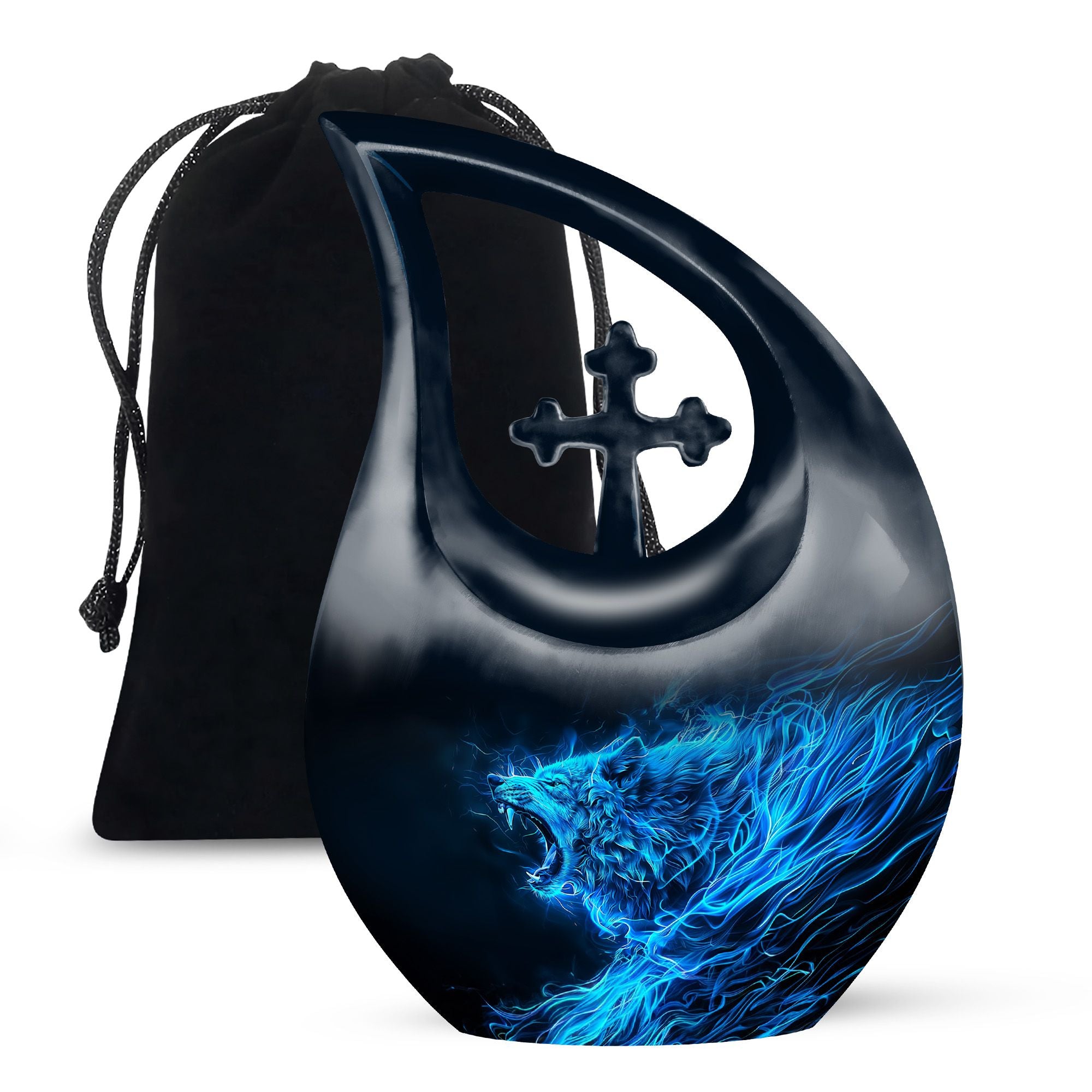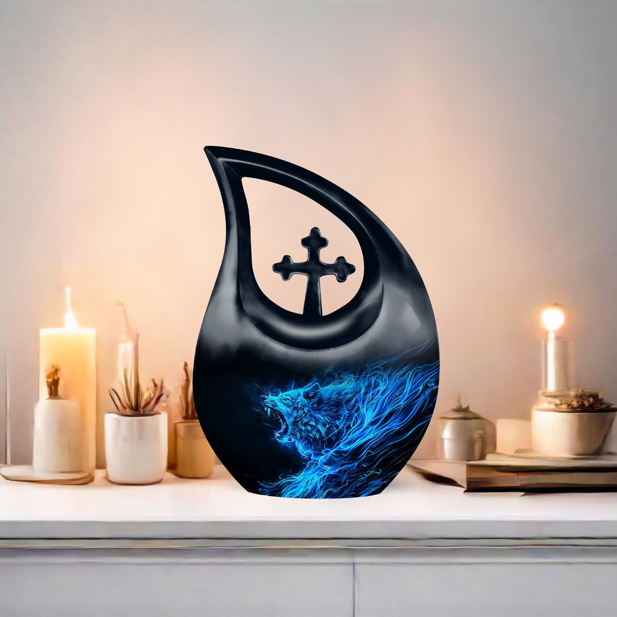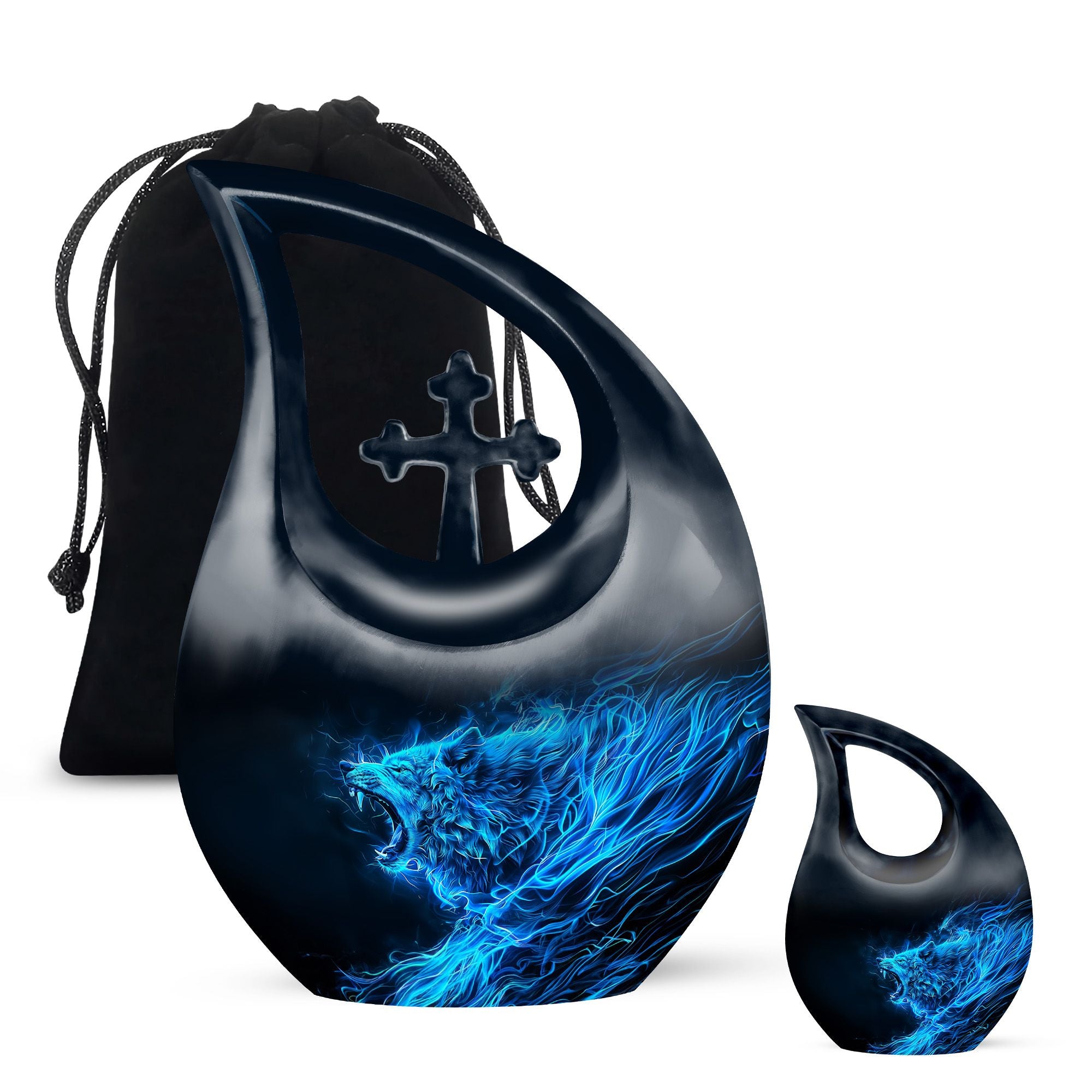 Keep the memory of your loved one alive with our unique 10-inch Wolf Urn. Crafted meticulously with a captivating Cross Drop theme, this Garden Urn for Ashes is more than just a resting place; it’s a monumental tribute. Our urn is constructed from high-grade aluminium for long-term durability and adorned with an exquisite wolf theme that reflects natural beauty. This Large Urn boasts a capacity of 200 cubic inches, adequately sized to hold remains securely. Weighing 3.3 pounds and standing at a full 10 inches in height, this Burial Urn gracefully balances stability and grandeur. Its personalized appeal is reflected in our customized offer, where you can engrave names to further immortalize your beloved’s memory. This tribute comes complete with a velvet pouch for sensitive containment of ashes. Our Wolf Urn showcases the harmony of strength and elegance, making it one among the best memorial urns for endowing a lasting homage. NB: Unique terminology applied to enhance SEO.