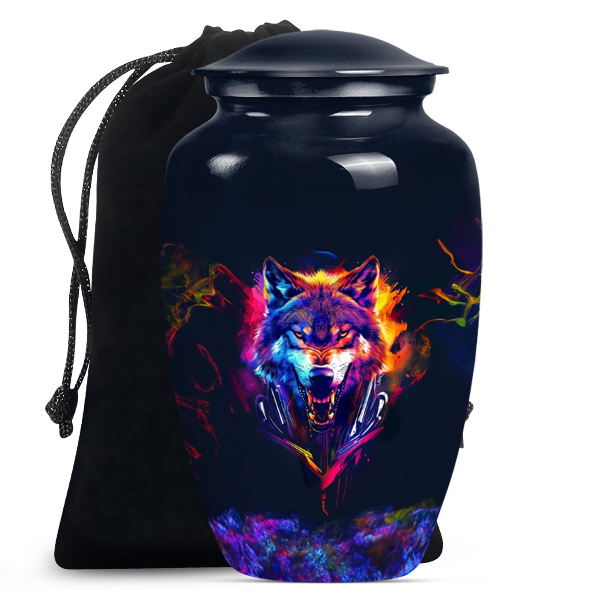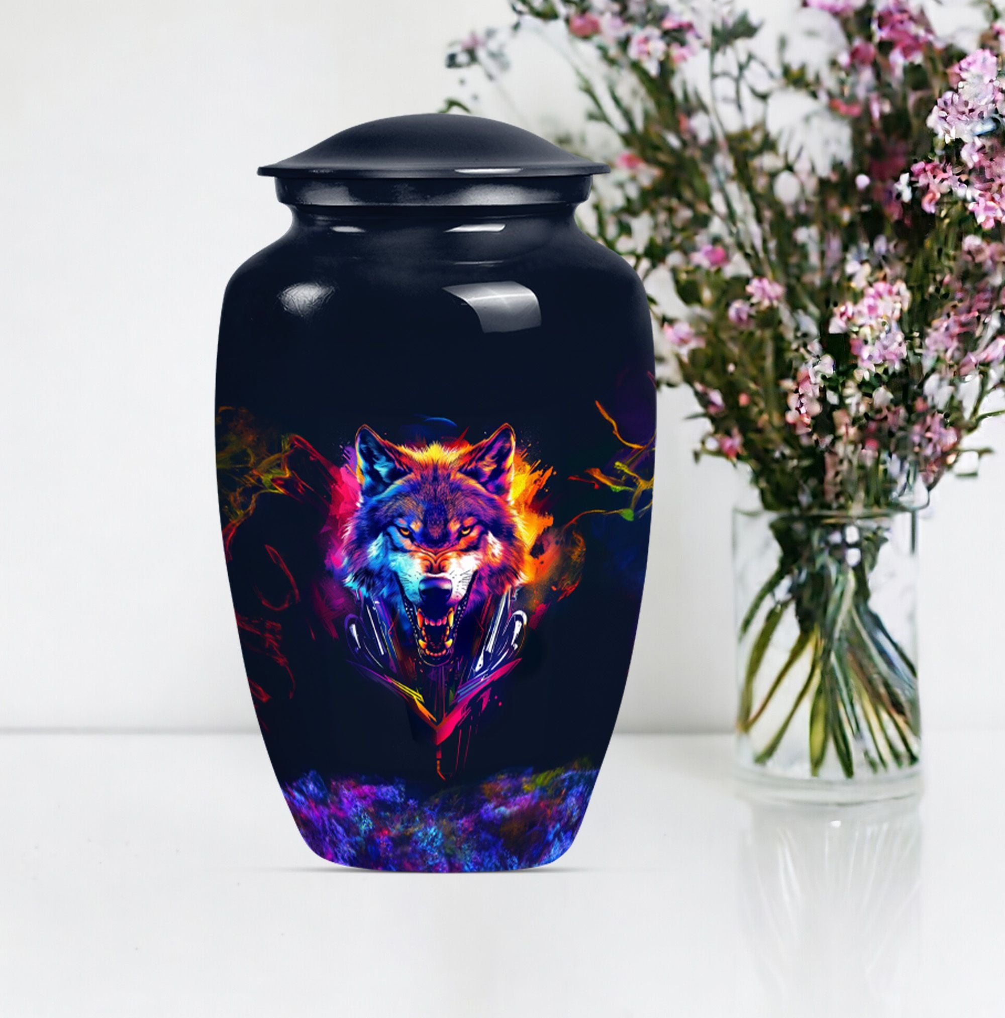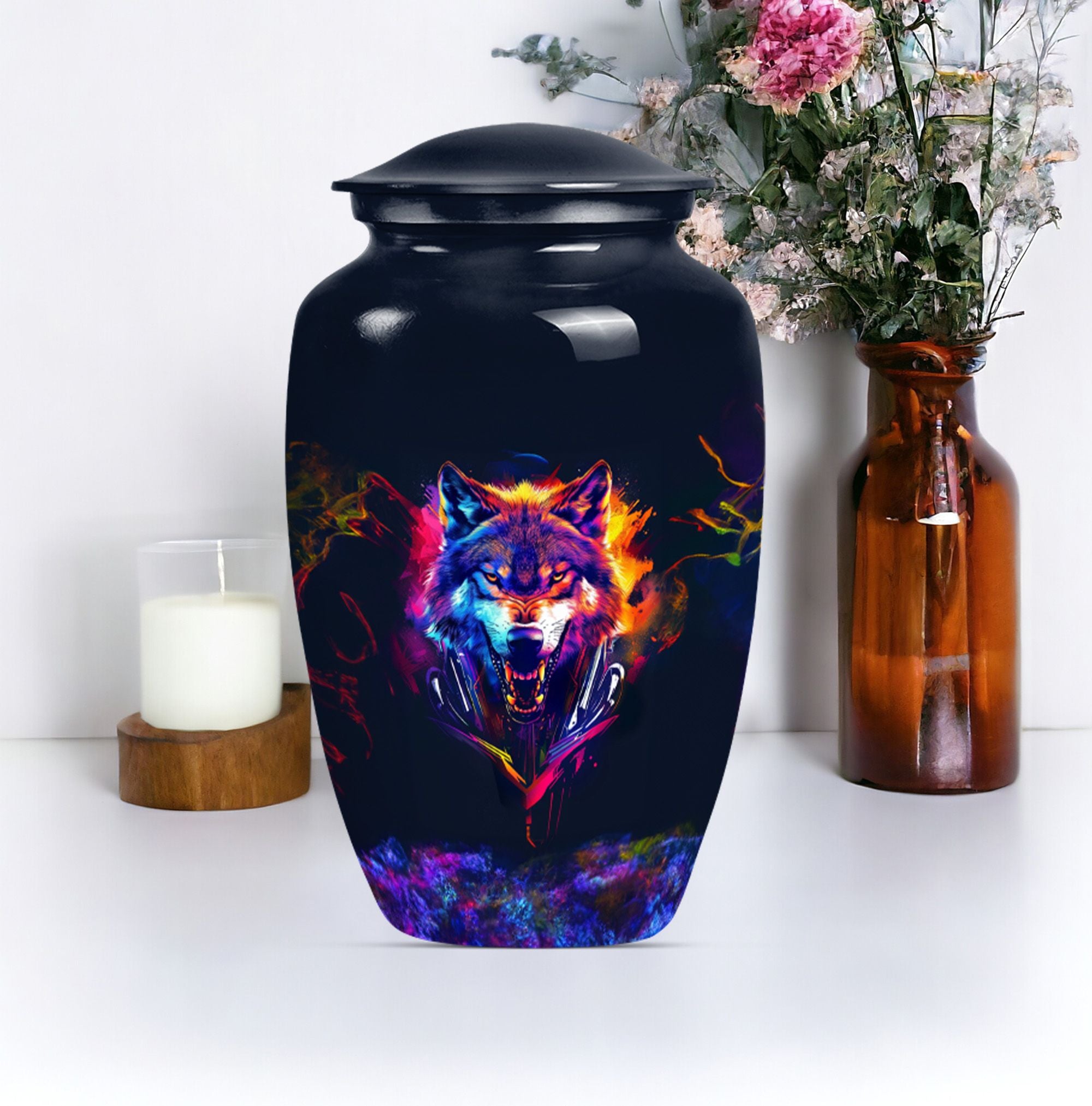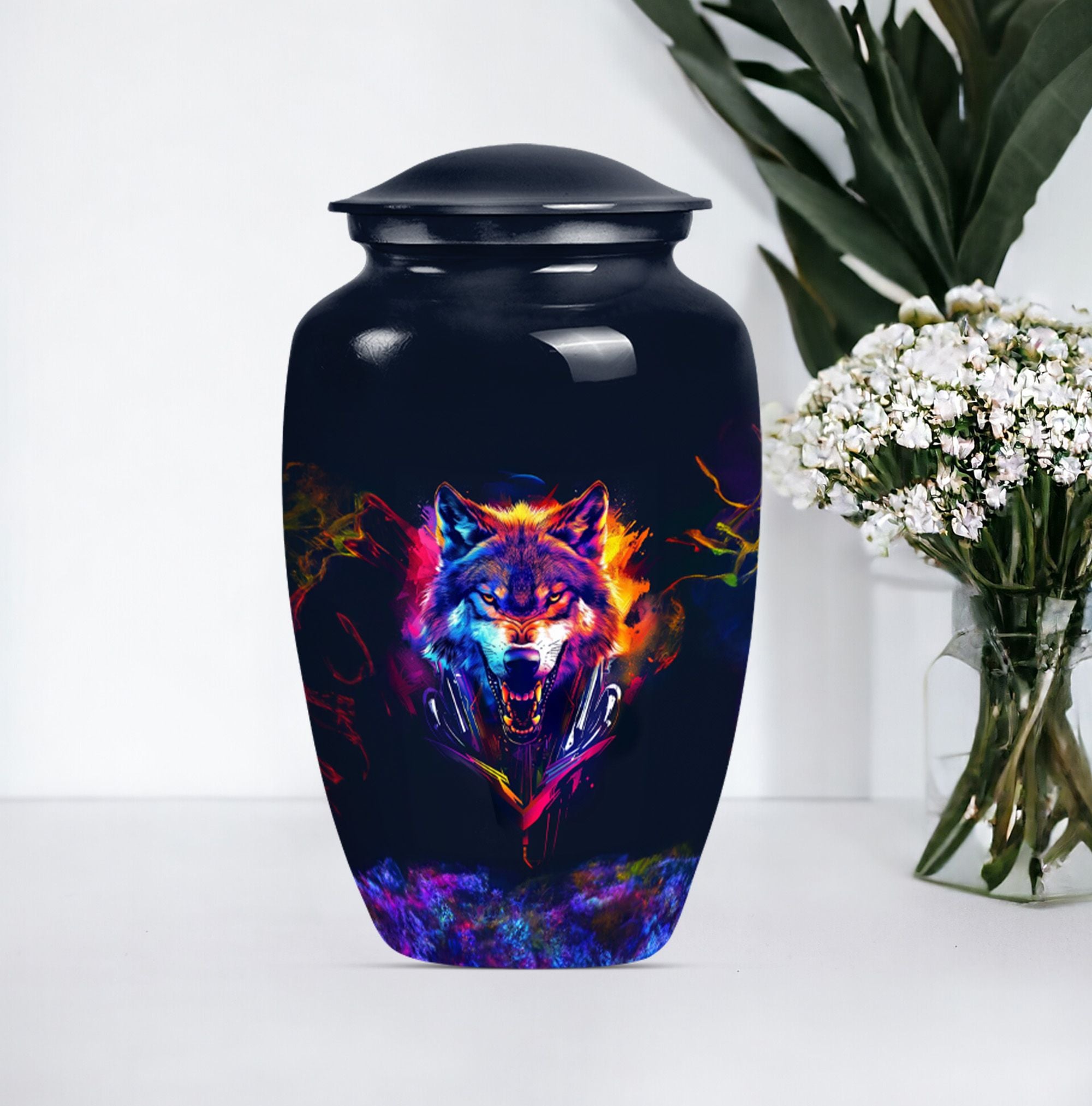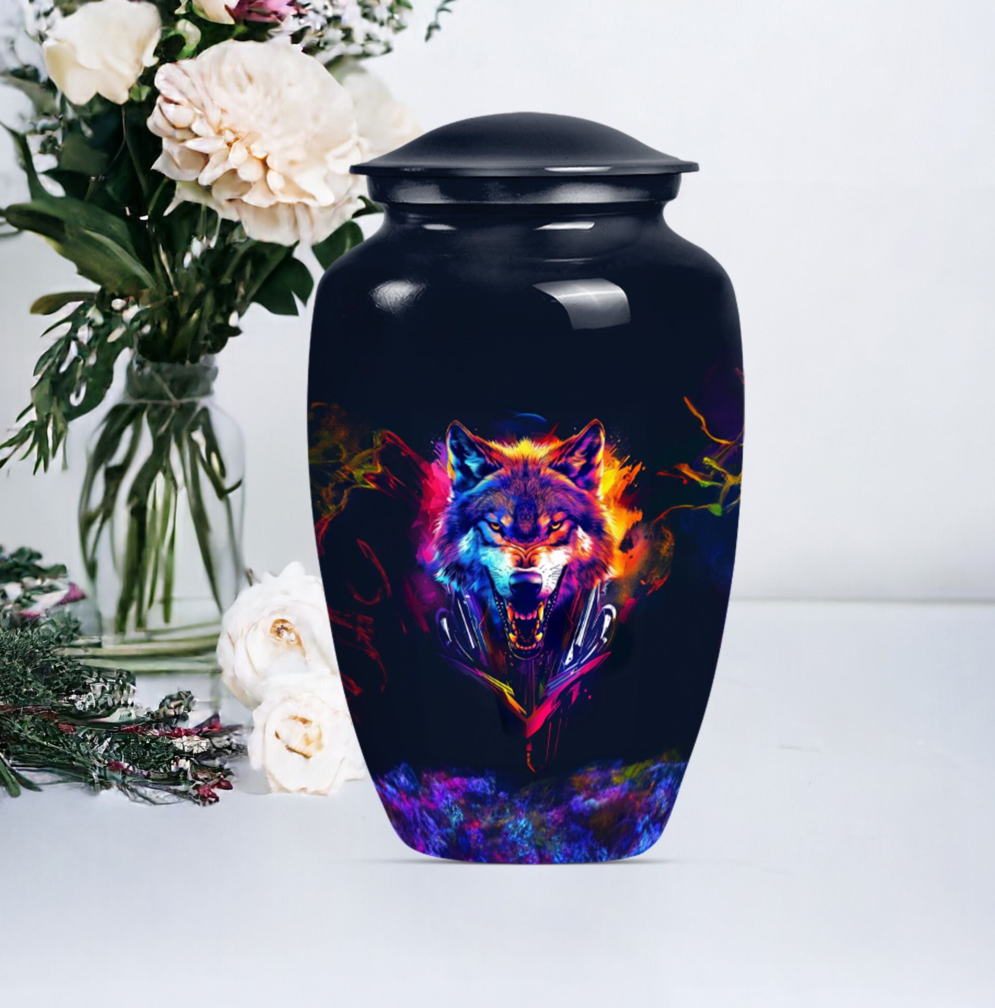 Expertly handcrafted from high-quality aluminum, this large adult urn for human ashes showcases a striking wolf design with vivid, colorful detailing that radiates both strength and serenity. The smooth finish and secure screw-top lid ensure safety and dignity, while the artistic pattern makes it a cherished centerpiece in any memorial setting. Whether placed at home or in a columbarium, this large human urn combines durability, elegance, and heartfelt symbolism.
