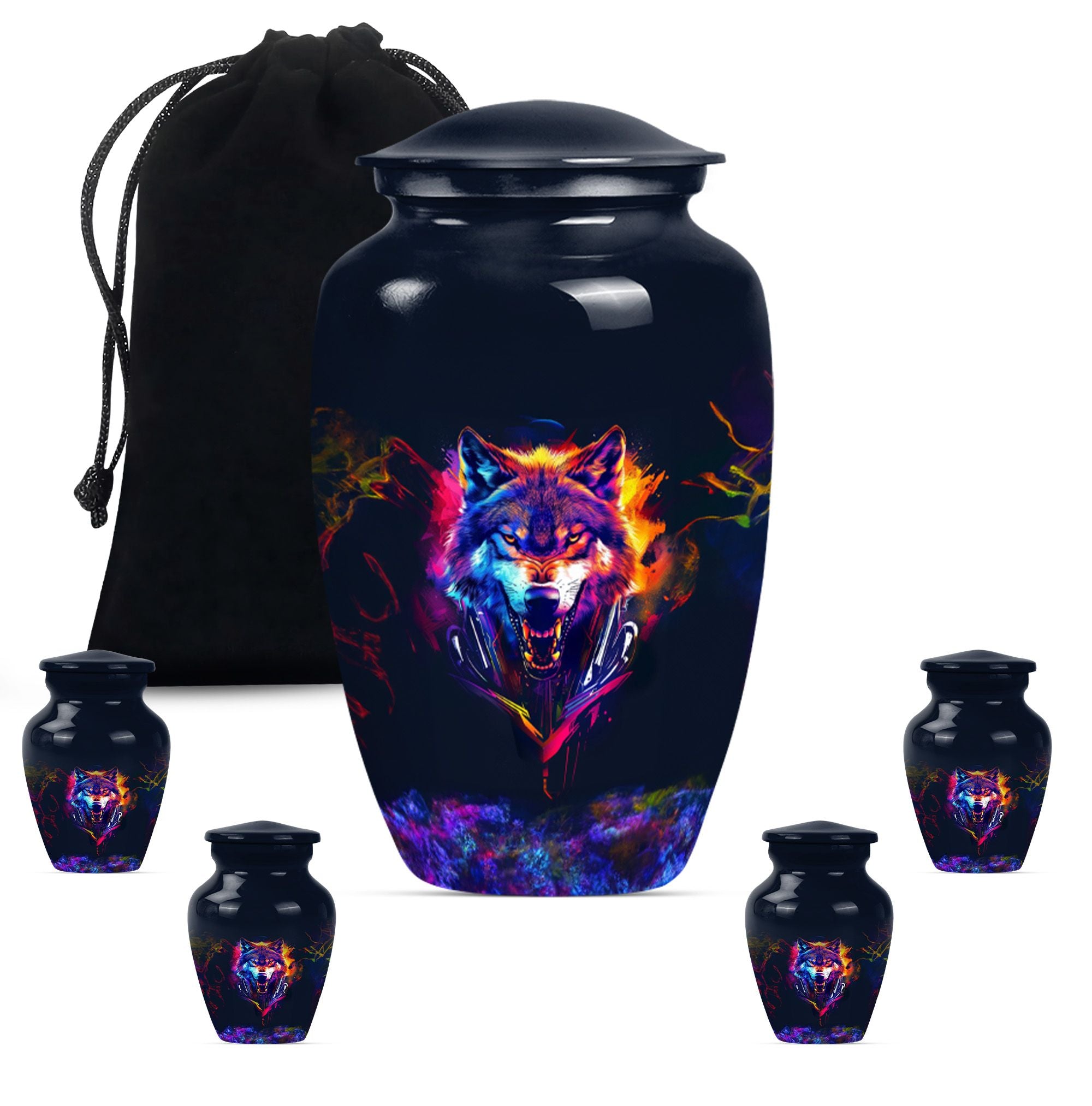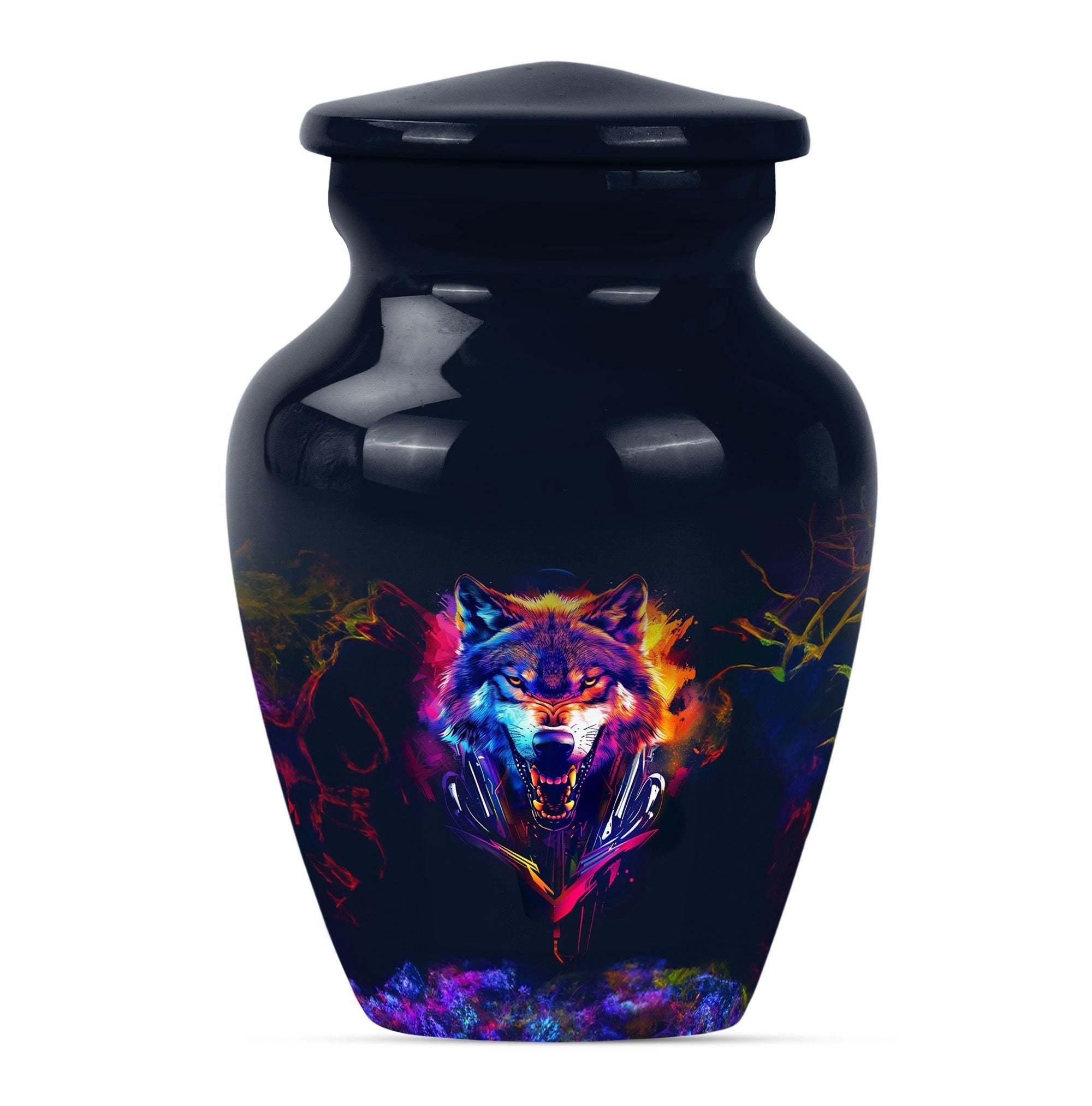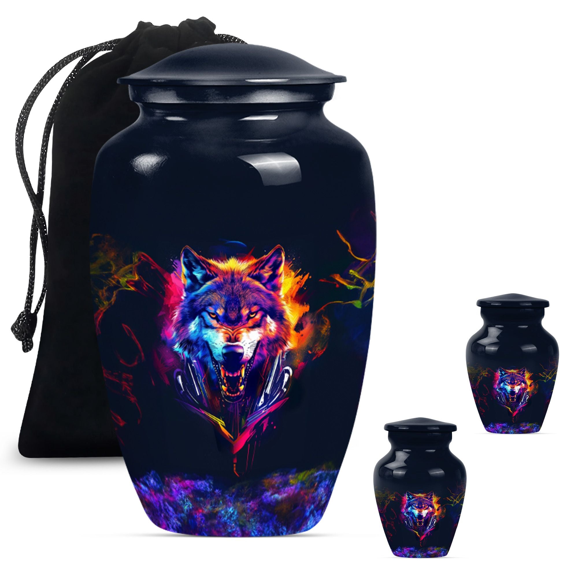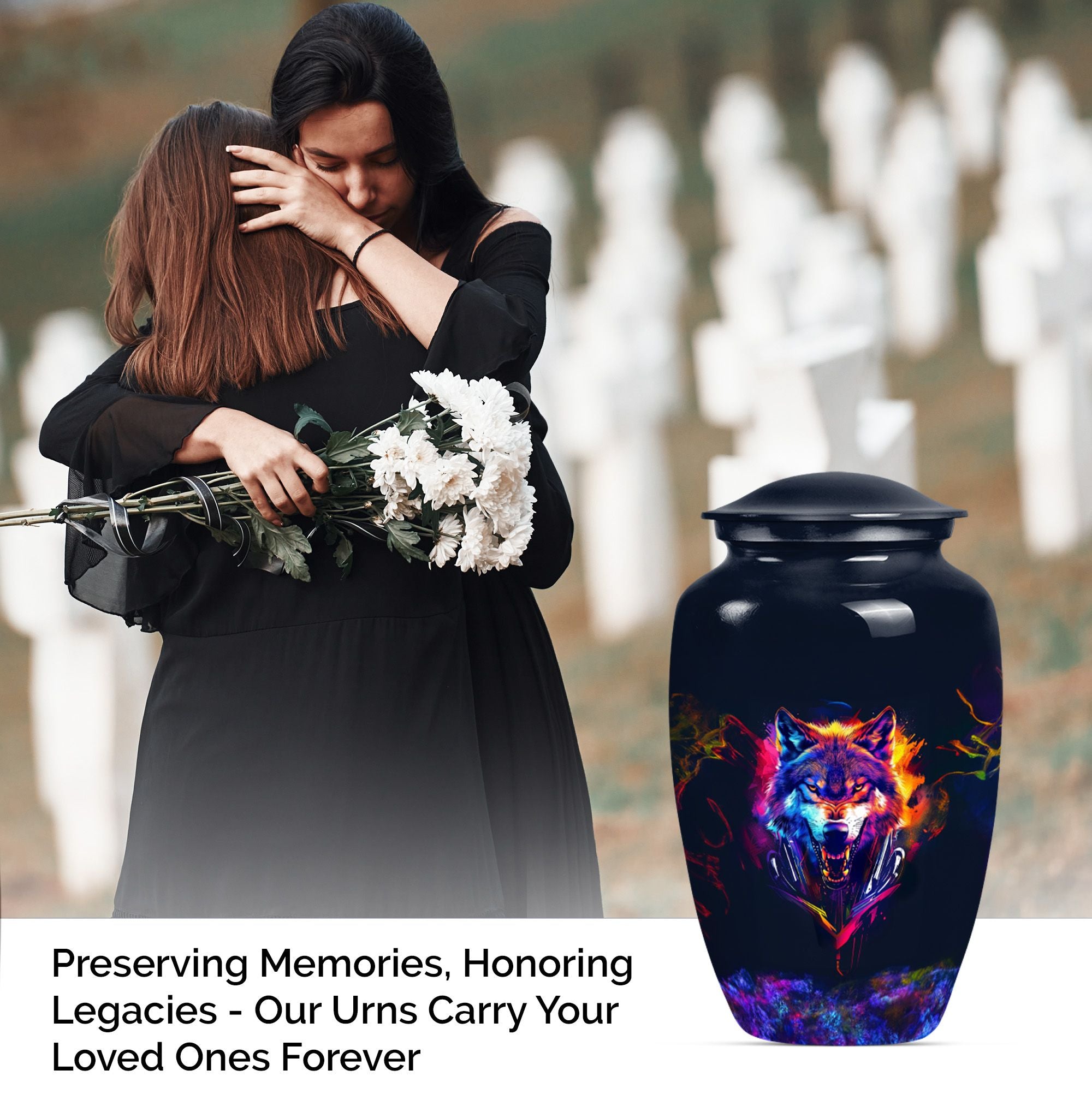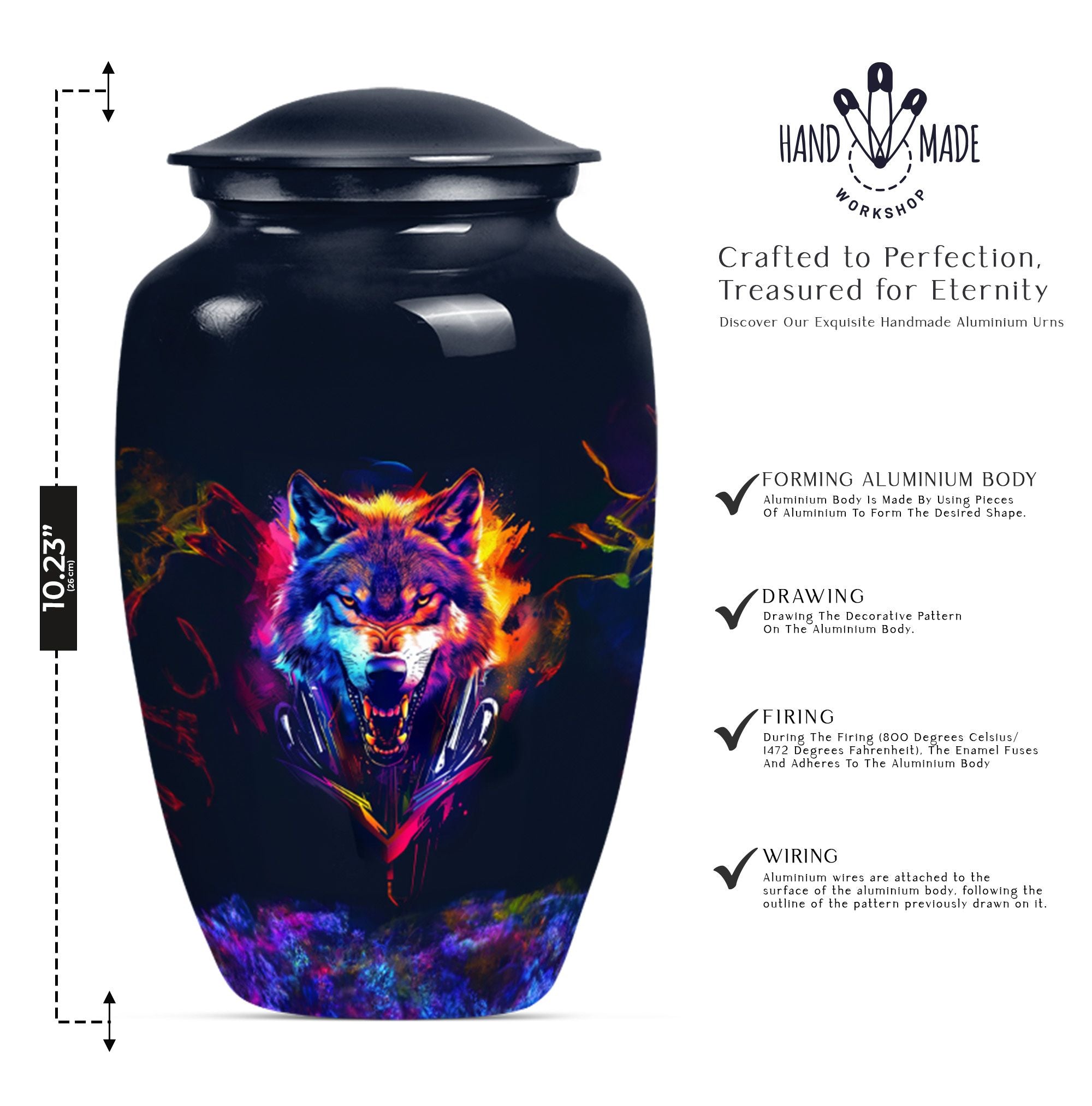 Expertly handcrafted from high-quality aluminum, this large adult urn for human ashes showcases a striking wolf design with vivid, colorful detailing that radiates both strength and serenity. The smooth finish and secure screw-top lid ensure safety and dignity, while the artistic pattern makes it a cherished centerpiece in any memorial setting. Whether placed at home or in a columbarium, this large human urn combines durability, elegance, and heartfelt symbolism.