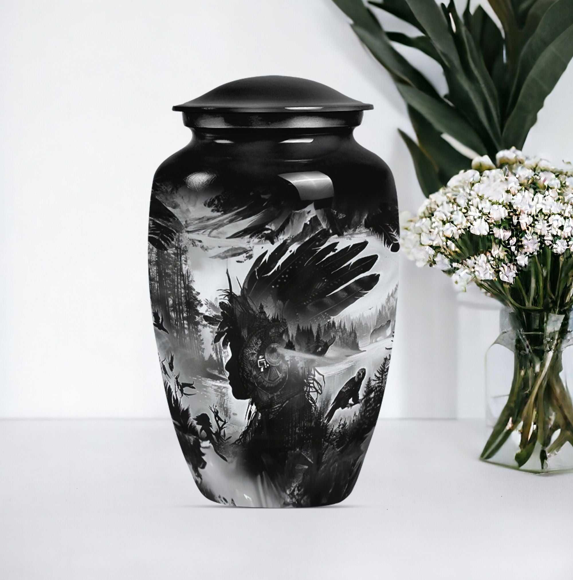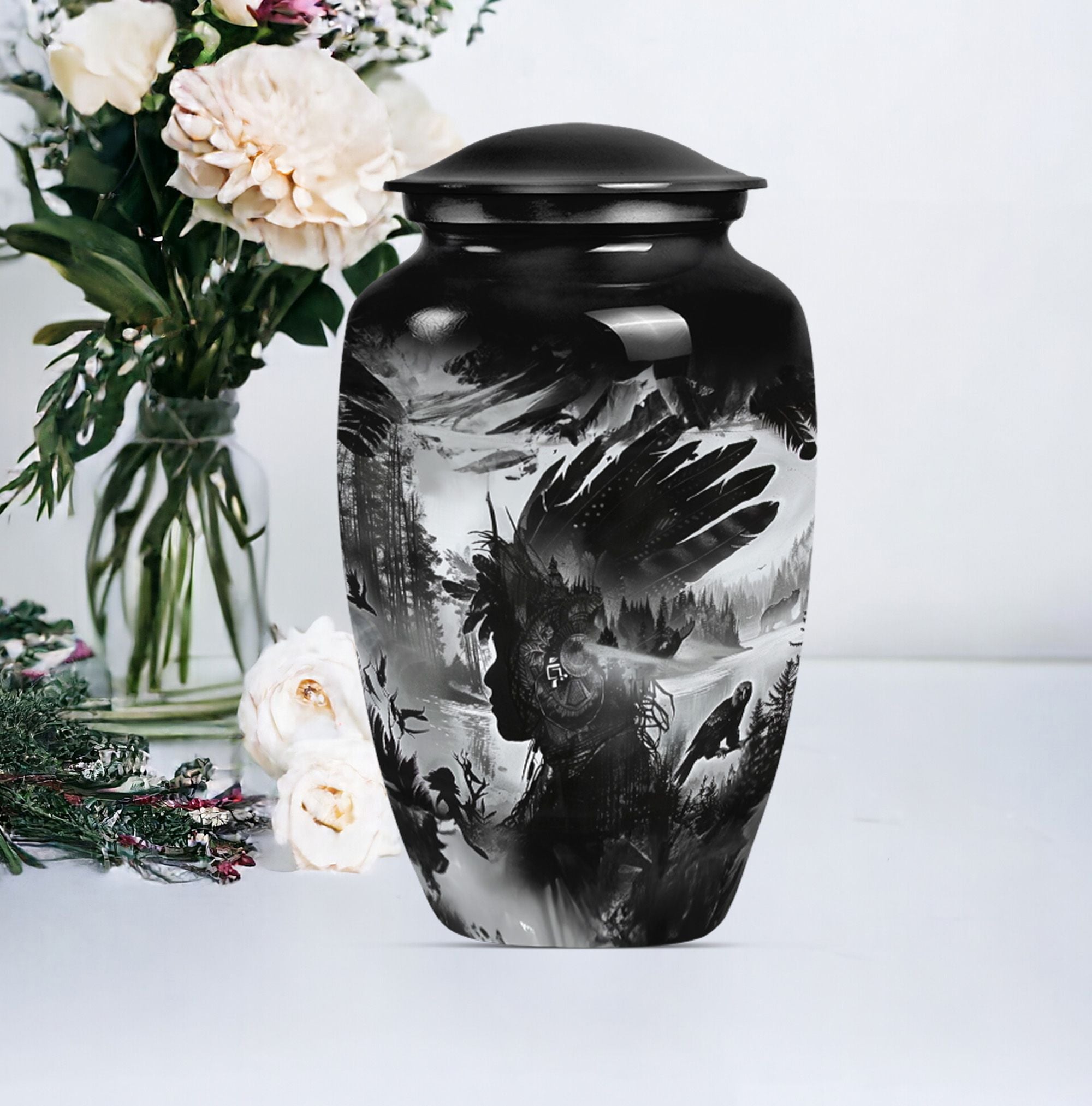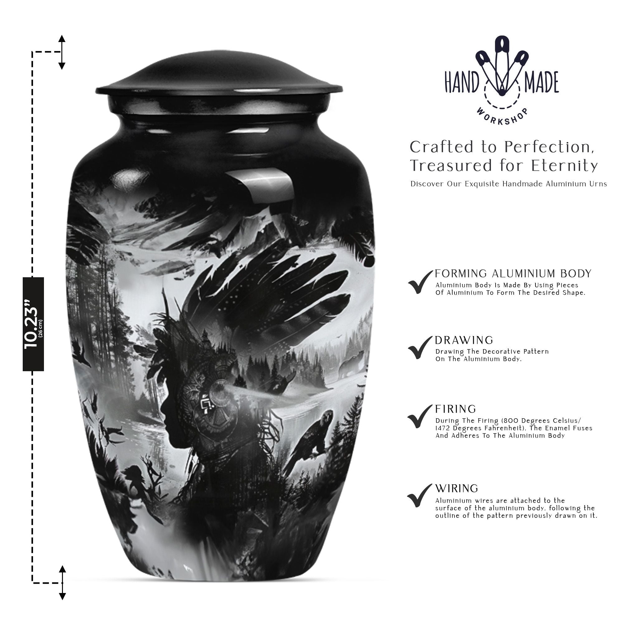 Our Tribe Man Urn is a sophisticated and resilient memorial piece, thoughtfully crafted from premium aluminium. Perfect for seniors and adults who require the security of long-lasting cremation urns for human ashes, this urn boasts an ample capacity of 200 cubic inches. Its dimensions stand at an imposing 10 inches height, and it weighs a sturdy 3.3 pounds, giving it a commanding presence in any remembrance space. The design infuses the raw power of the Wolf Howling theme, engendering a symbol of strength and resilience. Each Classic Urn is large enough to house the ashes of an adult male or female. The 10-inch urn comes with a velvet pouch for the containment and protection of the ashes. It offers an added layer of personalization by allowing for engraving names. Whether both for burial medium size urns or as a striking funeral piece for human ashes, our Tribe Man Urn is an enthralling tribute to loved ones lost. It embodies the essence of memorial urns and stands head and shoulders above regular, adult size urns.