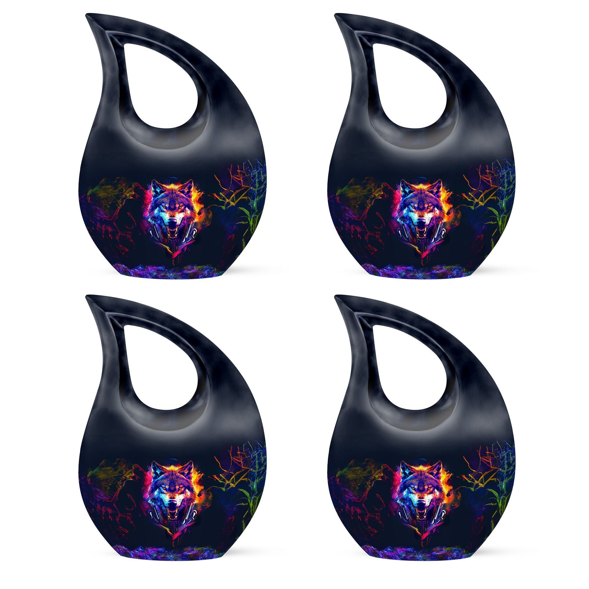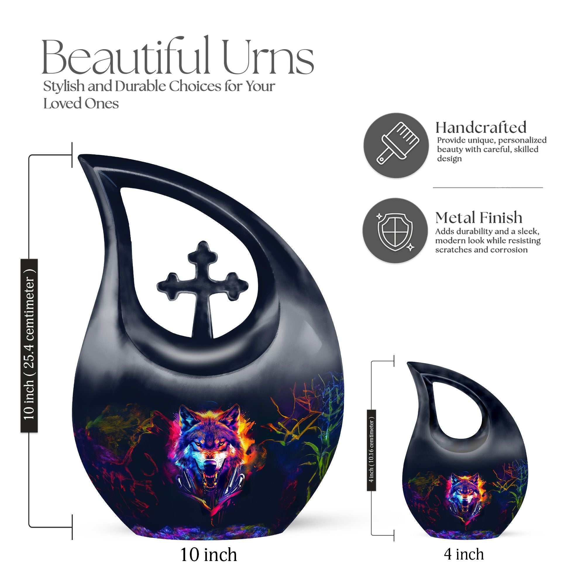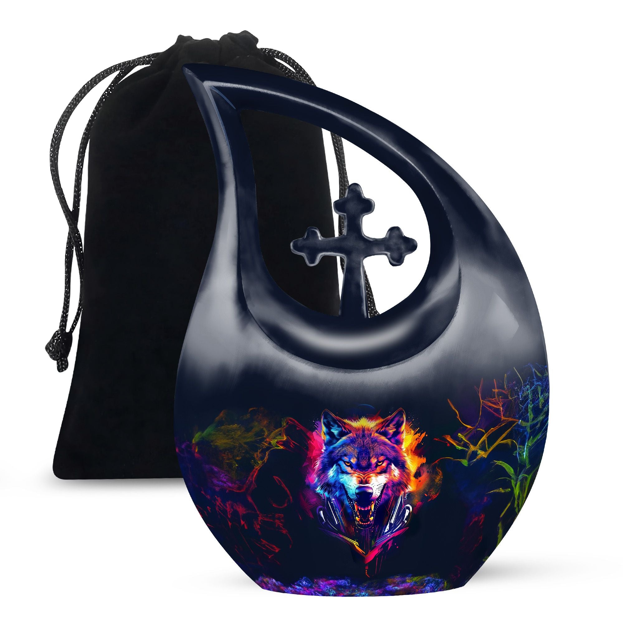 Discover a dignified and respectful way to honor your departed loved one with our 'Wolf Urn'. This 10-inch aluminum-made urn balances simplicity with a subtle touch of artistic interpretation, incorporating a 'Cross Drop' style. Made to preserve the memory of adults and seniors, it uniquely blends with all your memorial ceremony supplies. With its weight of 3.3 pounds and a capacity to hold up to 200 cubic inches, it assuages your concern for the containment of ashes. Each purchase includes a velvet pouch to provide additional protection. For a more personal touch, add engraved names for customization. Affordable yet high quality, this urn serves not just as a low-cost cremation option but as a meaningful tribute as well. Let this 'Wolf Urn' be your go-to for an affordable funeral and cremation service. A note: the urn design stands out because it is not the usual 'Cross Drop' one finds in the market.