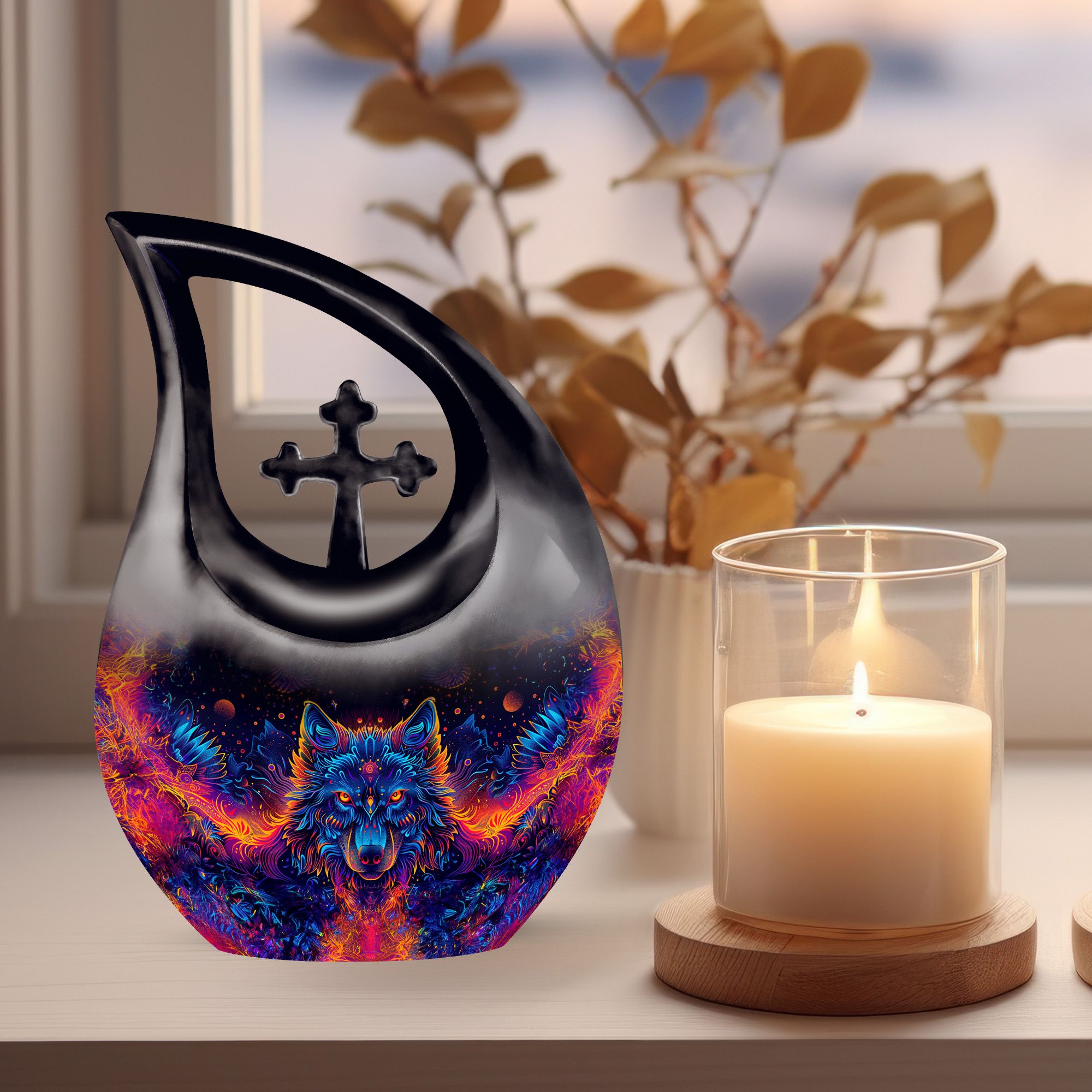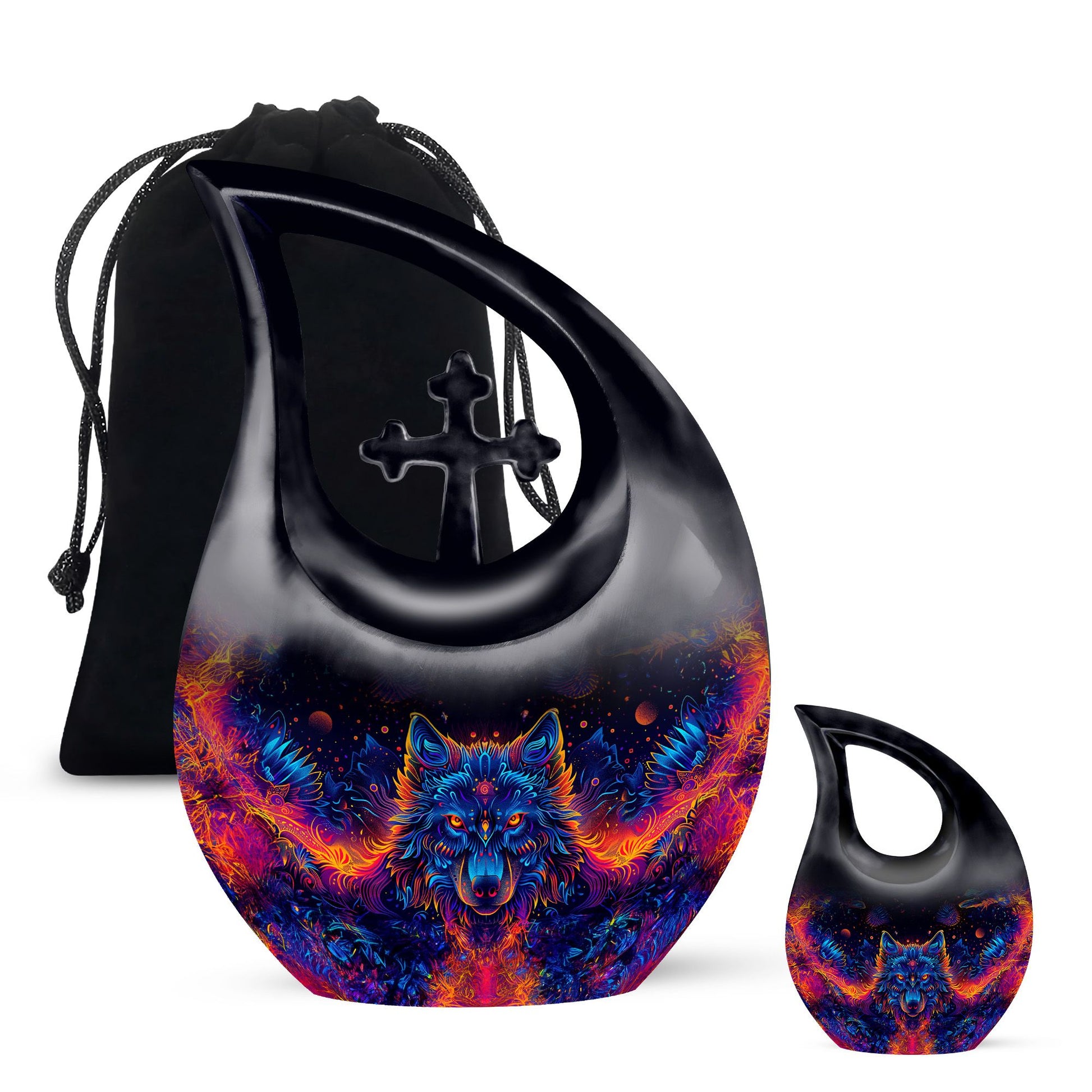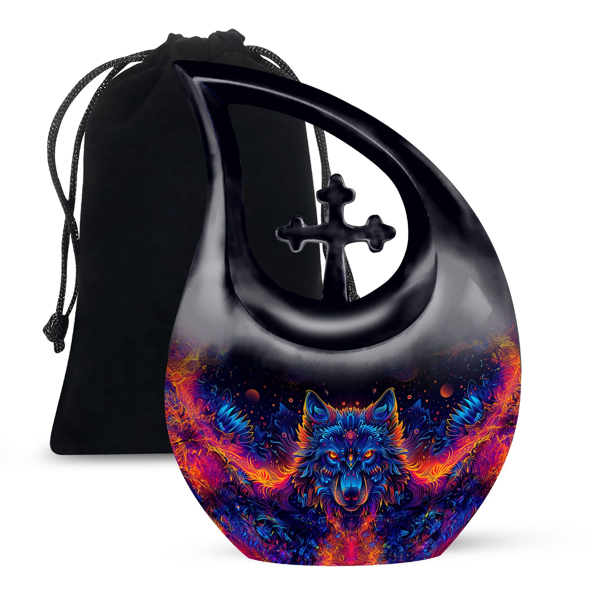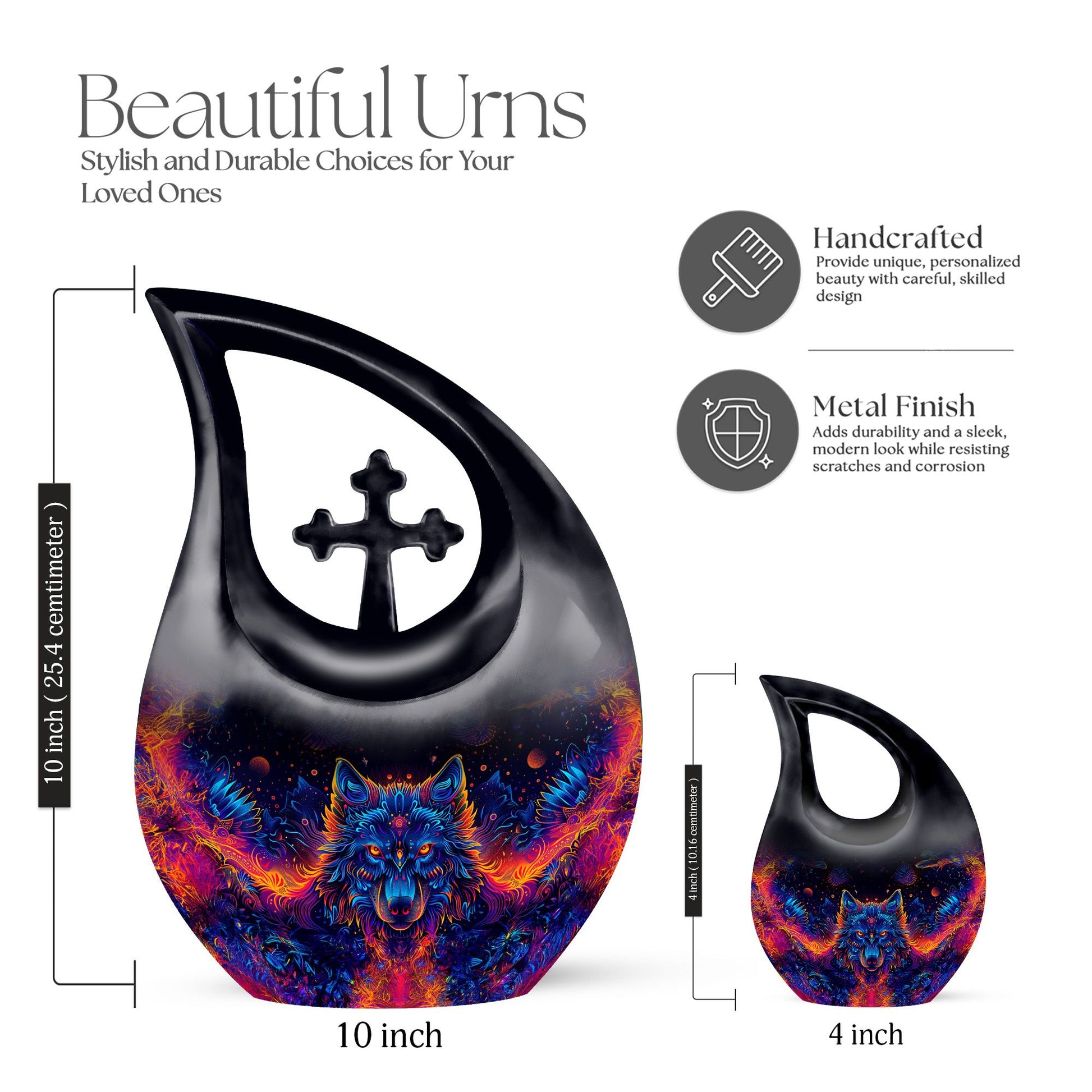 Preserve the memory of your loved one with our Wolf Urn, an exquisite piece of memorial craftsmanship. This Large Urn, sized at a commodious 10 inches, proudly displays a captivating Wolf theme which symbolizes courage, strength, and independence. Made from high-grade Aluminium, it's robust yet lightweight, weighing just 3.3 pounds. Our urns for human ashes offer an impressive capacity of 200 cubic inches to securely house the ashes. This model showcases a unique 'Cross Drop' architecture not commonly found in average urns, providing a special touch to this memorial item. The package contains a velvet pouch for containment of ashes, adding an extra layer of protection. Personalize it with engraved names to make this not just an urn, but a meaningful keepsake. With its affordable price tag, it stands as a significant player in the market of cheap cremation urns and cremation containers. Whether you search for memorial urns, urns for ashes, or cremation urns, our Wolf Urn brings a unique blend of emotional value and practical function.